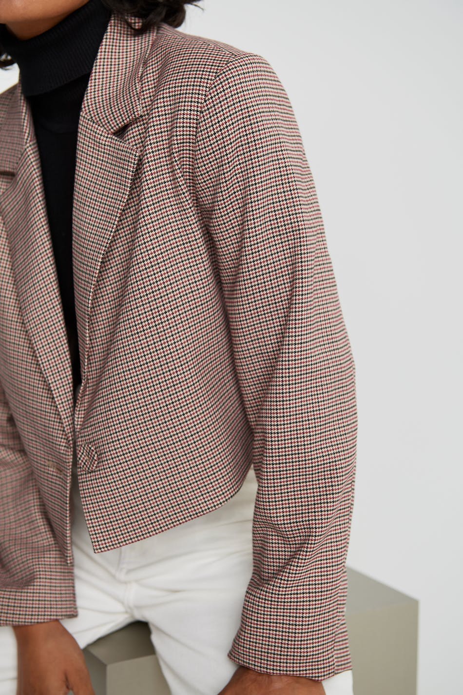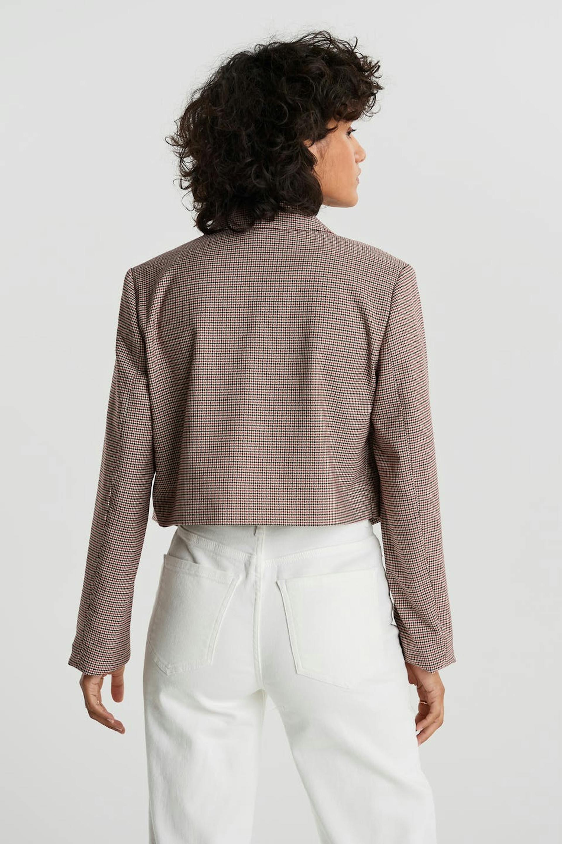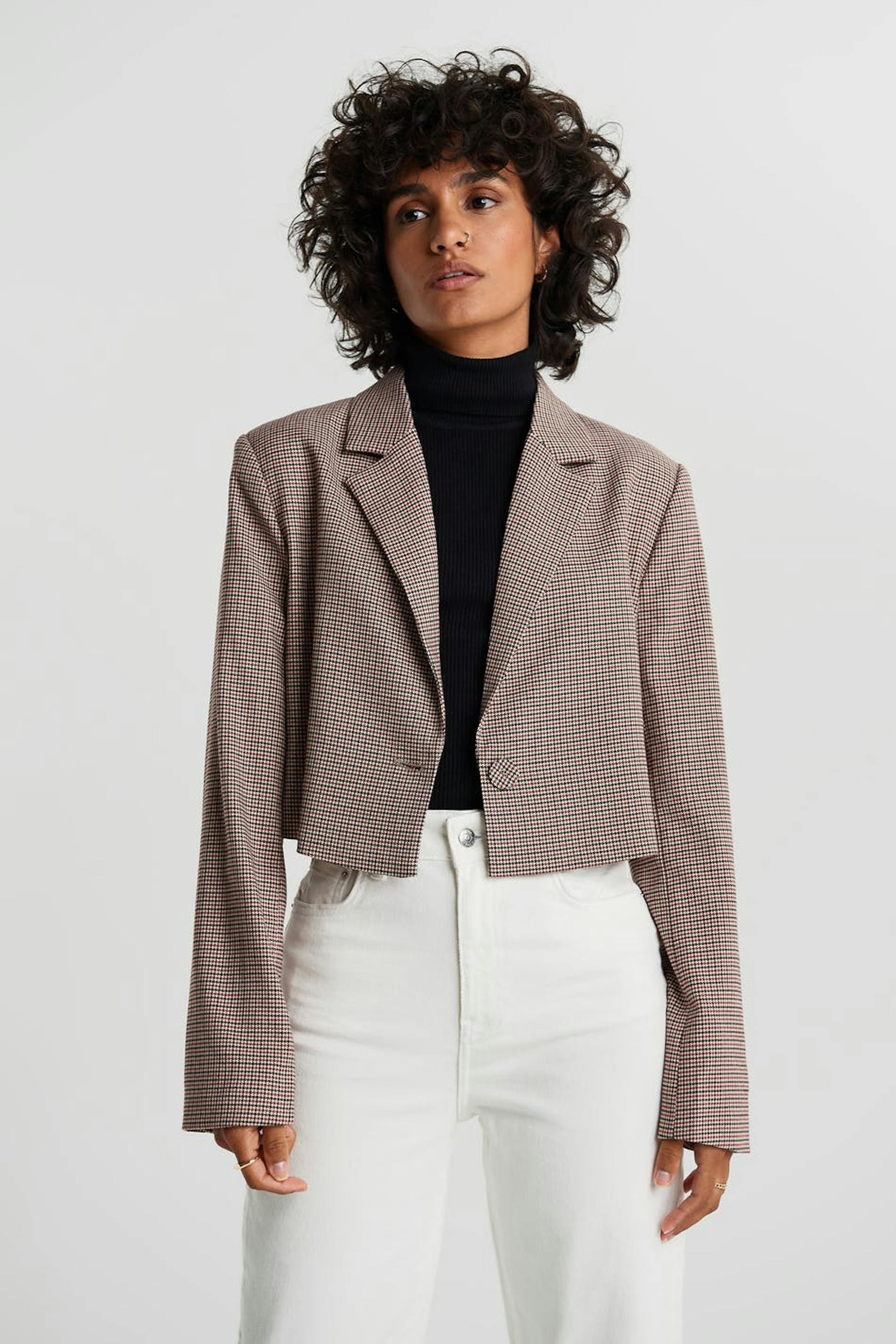Rutig kavaj med en knapp på framsidan. Kavajen är kort.
