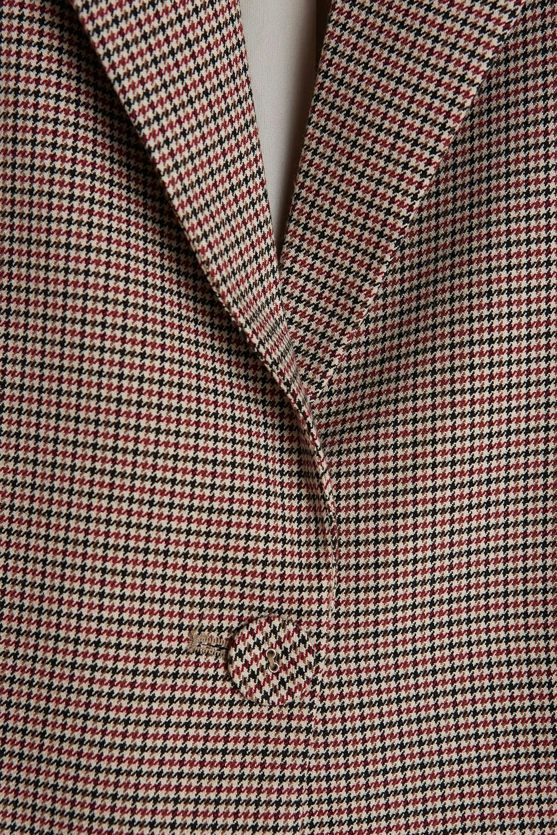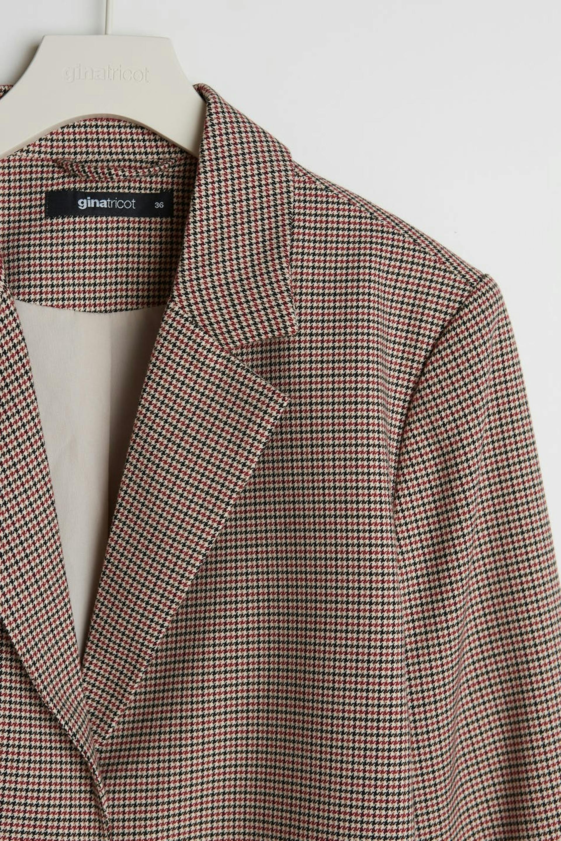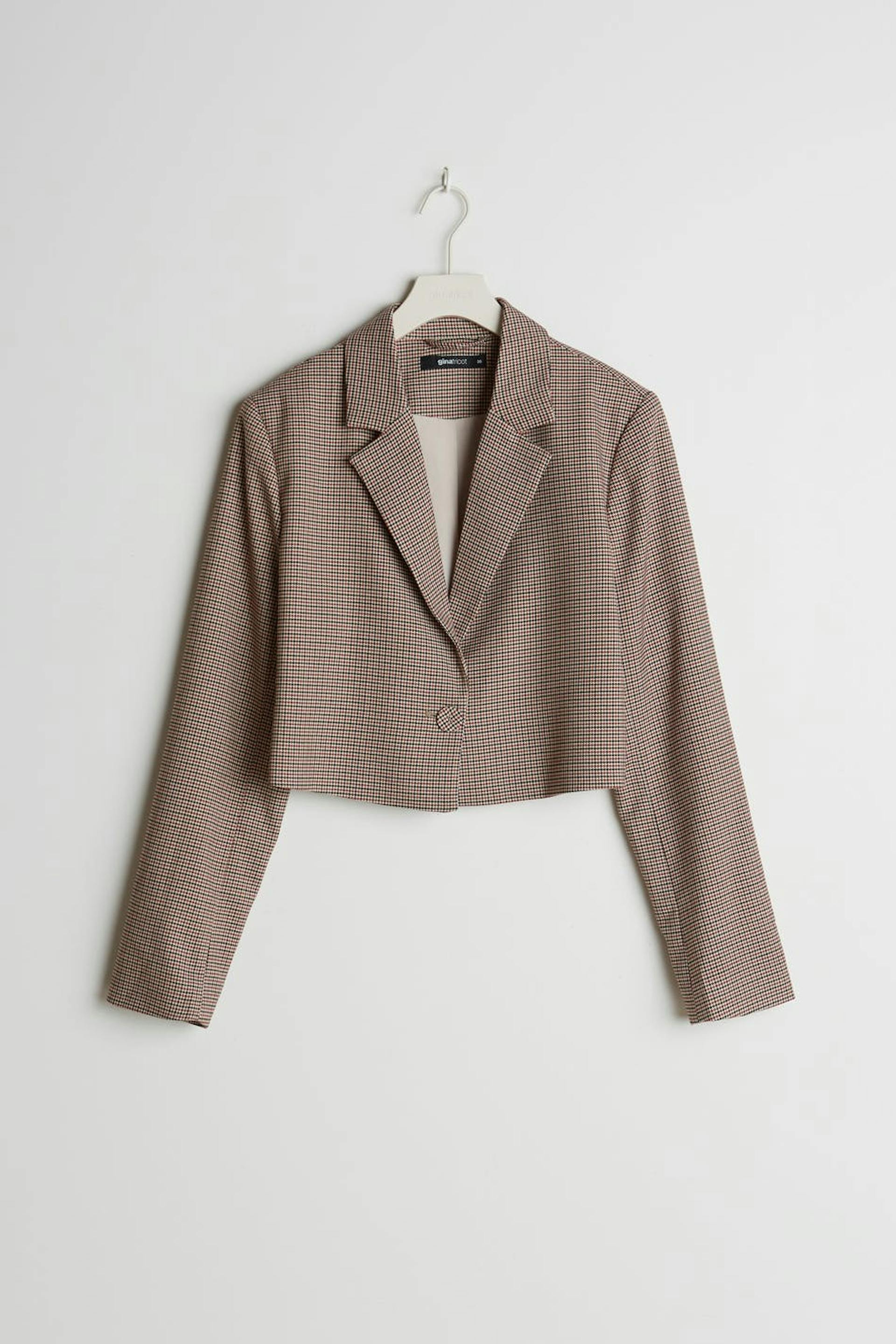 Rutig kavaj med en knapp på framsidan. Kavajen är kort.