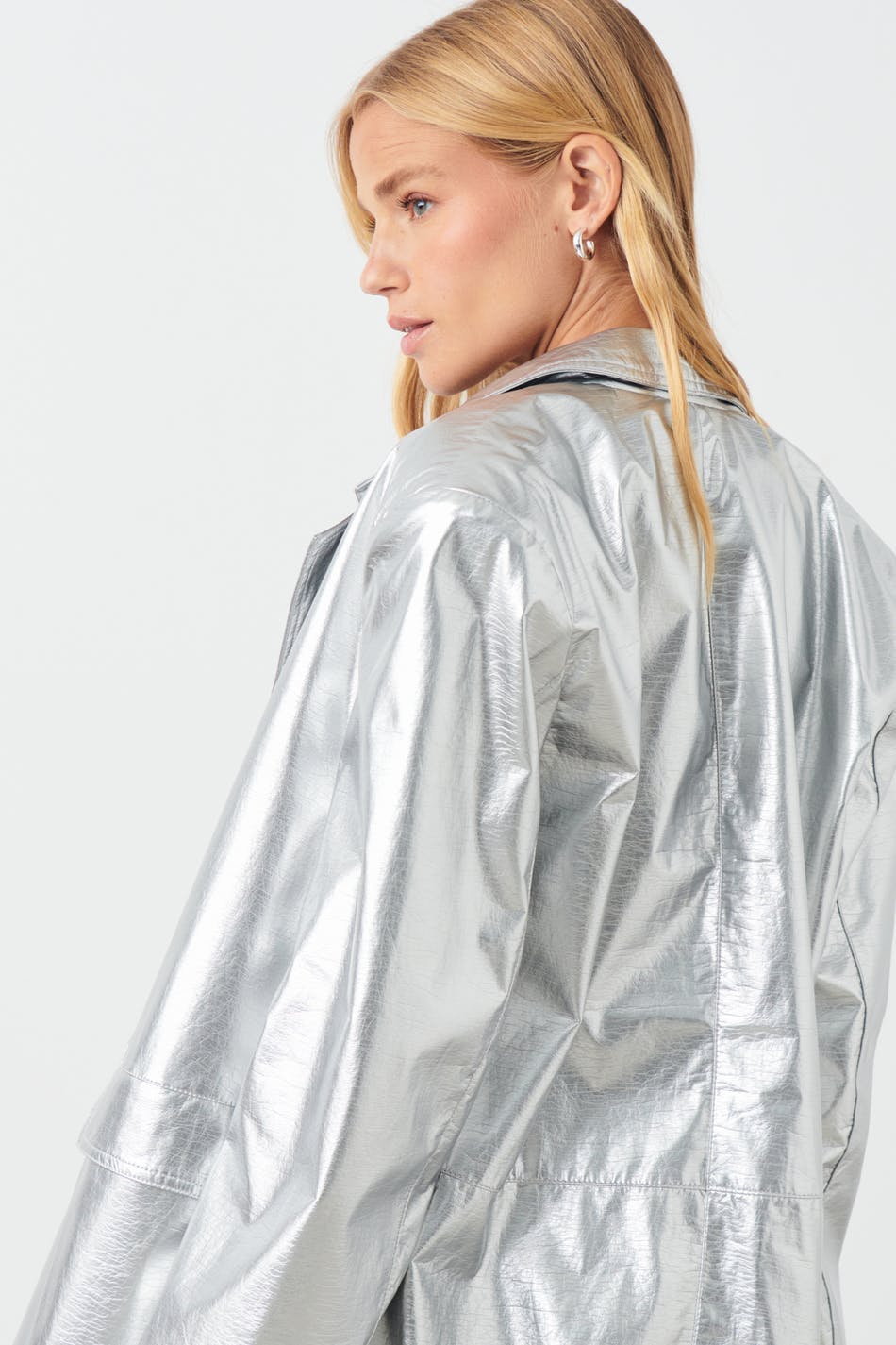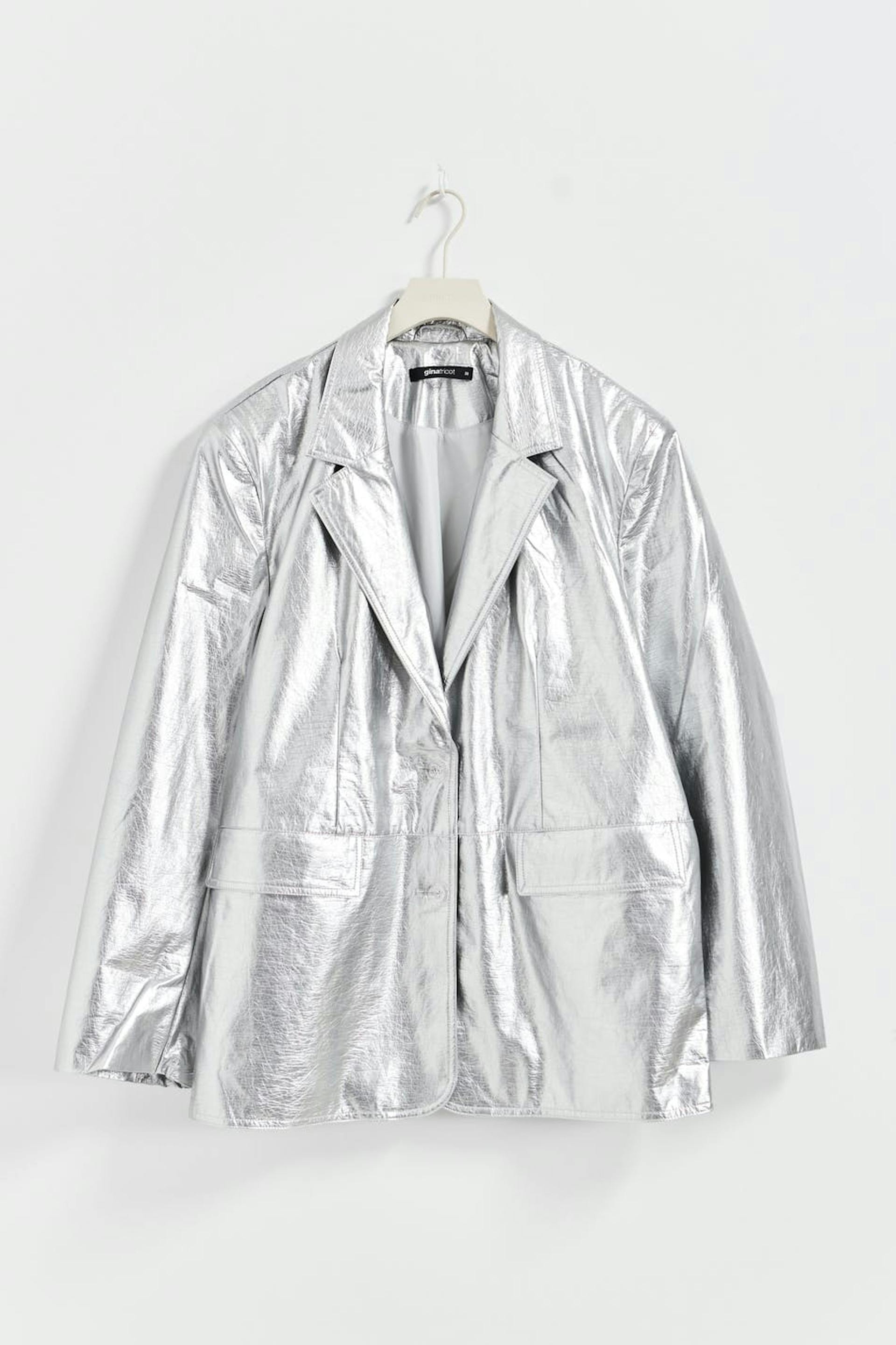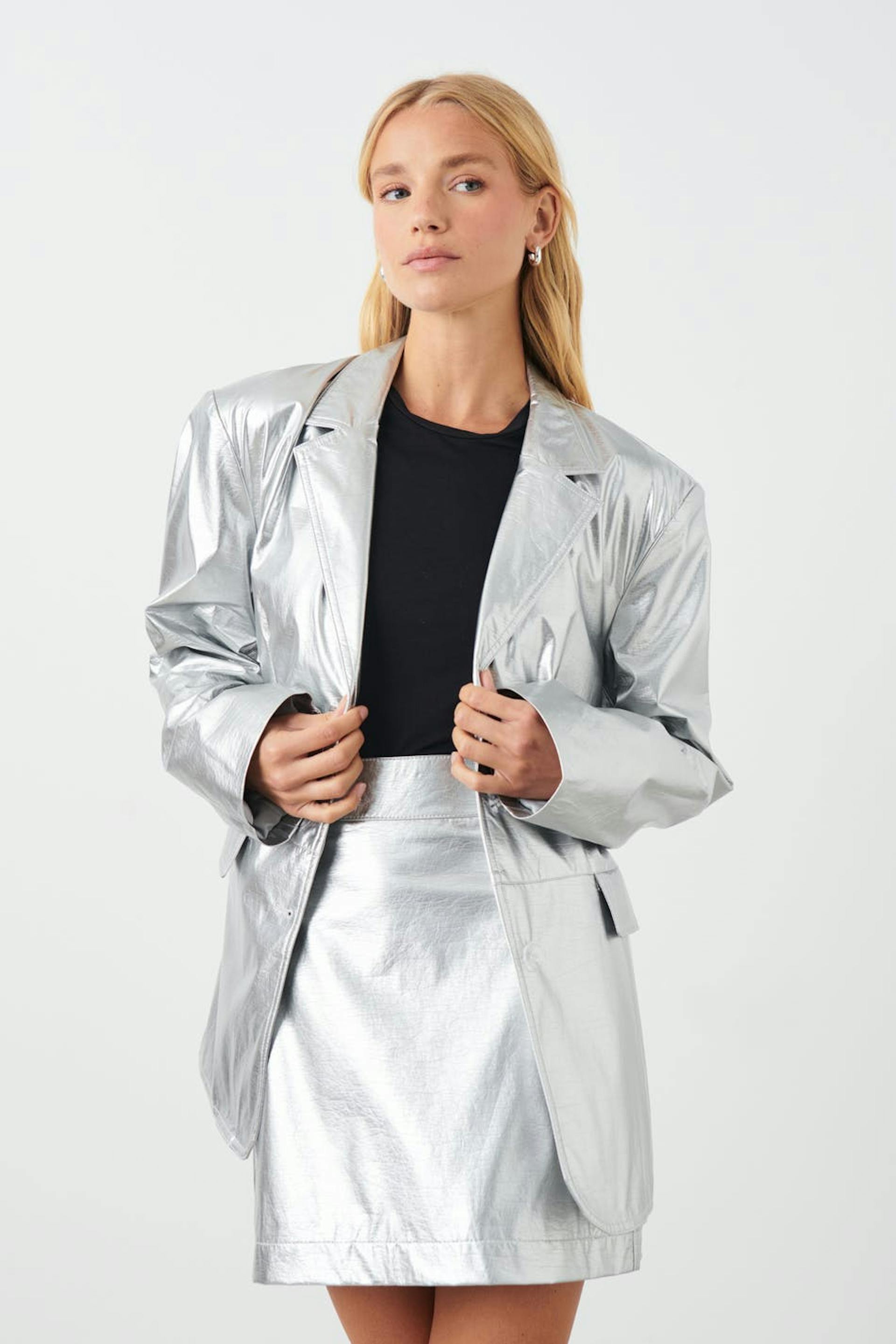 Silvrig kavaj i skinnimitation med knäppning fram. Kavajen är oversized och har fickor med lock framtill. Den har krage med trubbigt slag och axelvaddar.