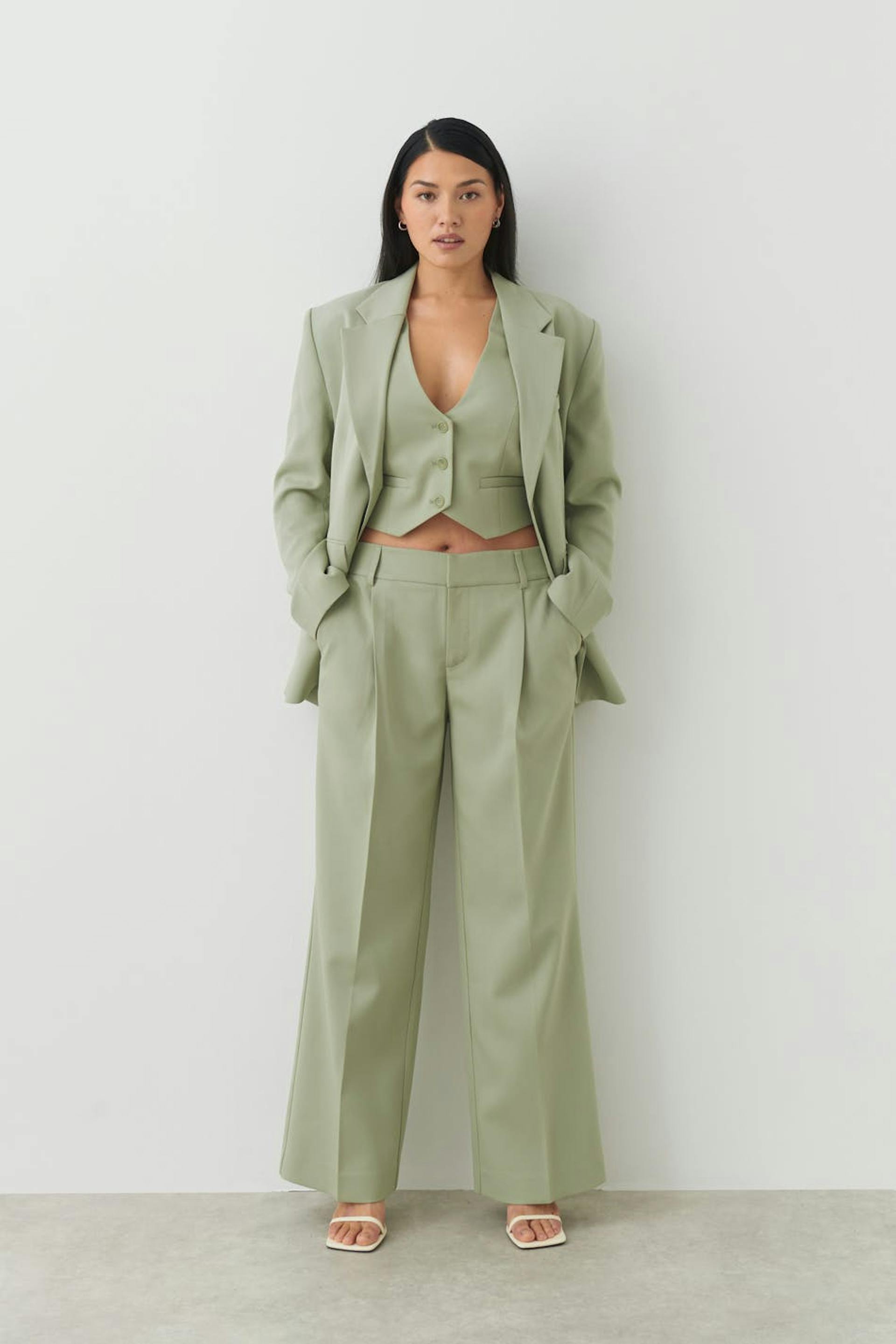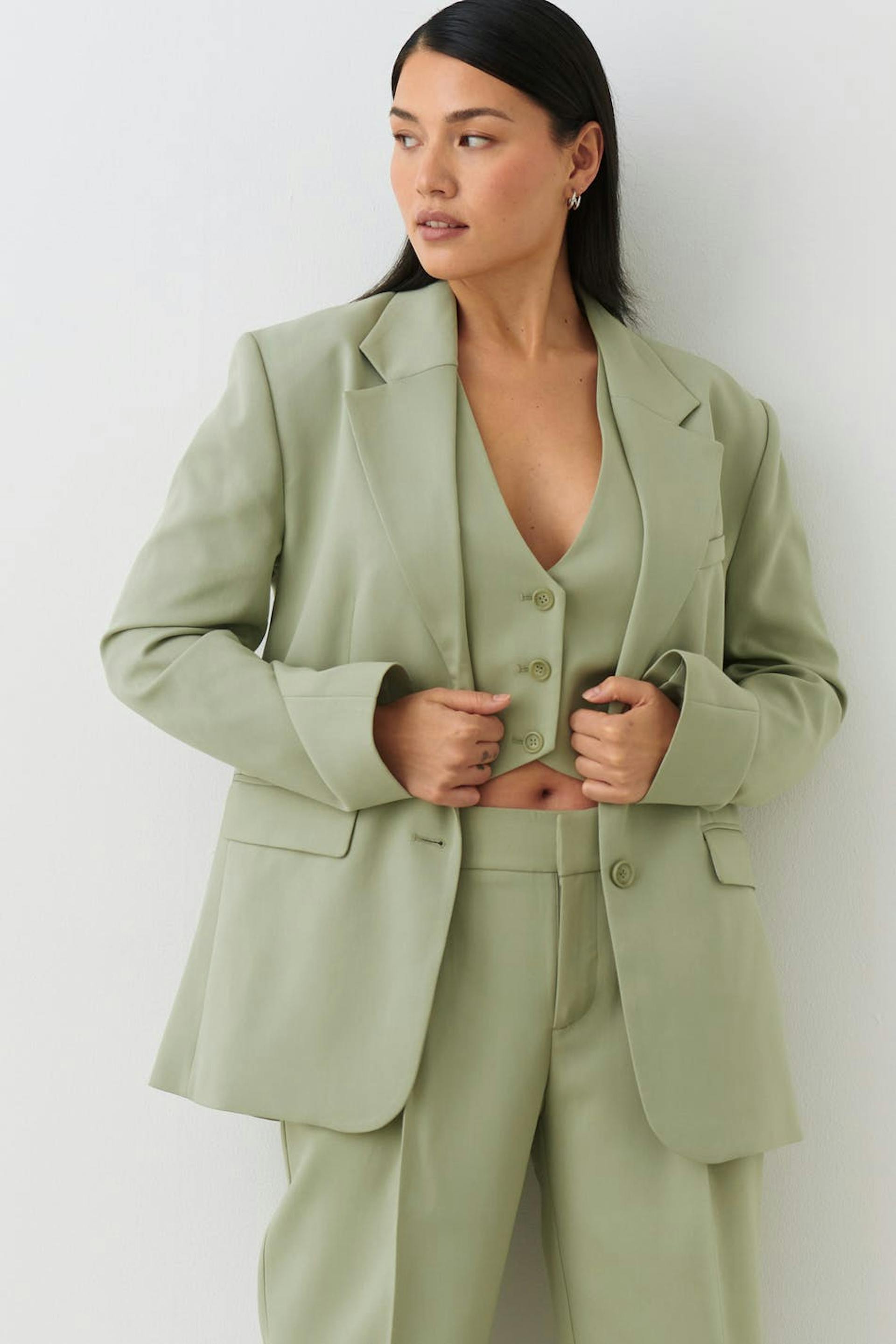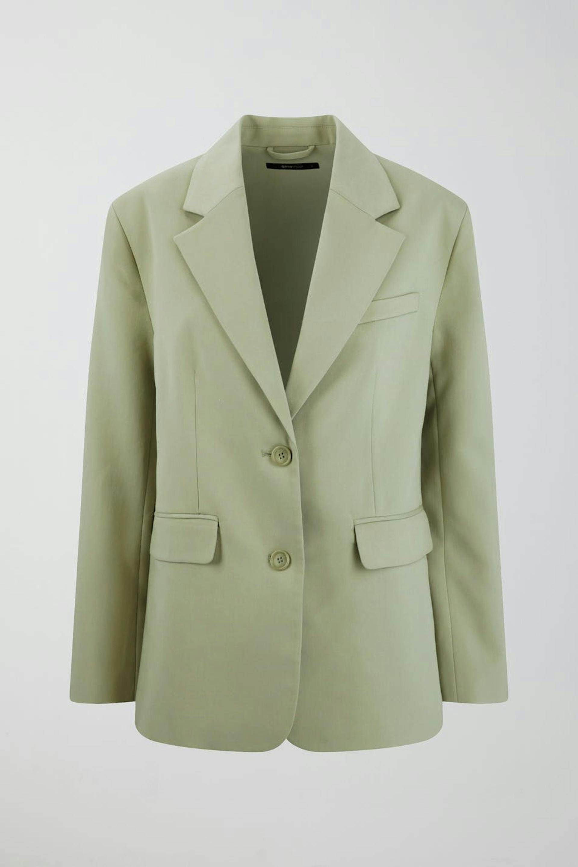 Oversized kavaj med knäppning fram. Kavajen är grön, vävd och enkelknäppt. Den har krage med skårat kavajslag, bröstficka på vänster sida och passpolerade fickor med lock framtill.