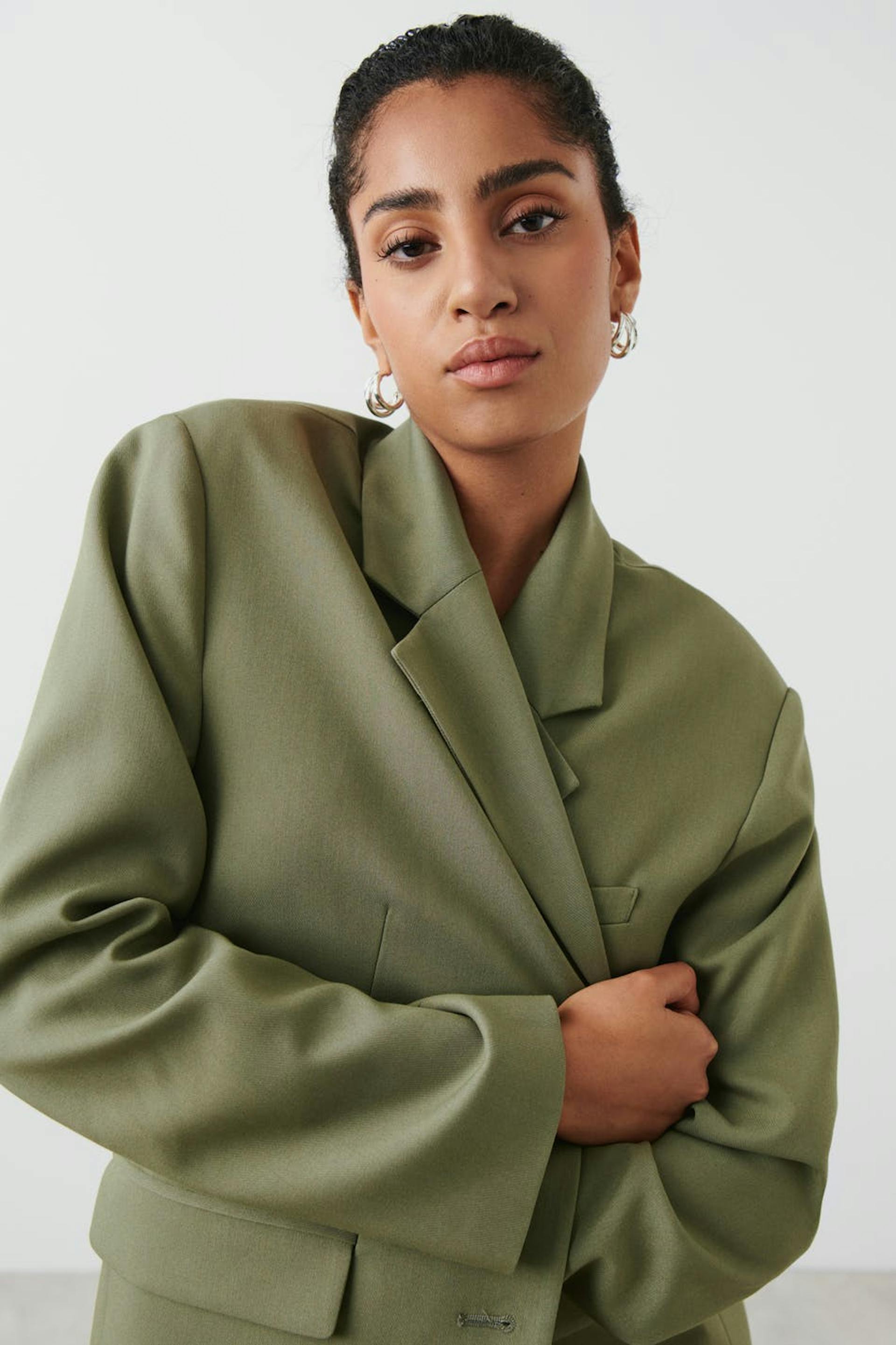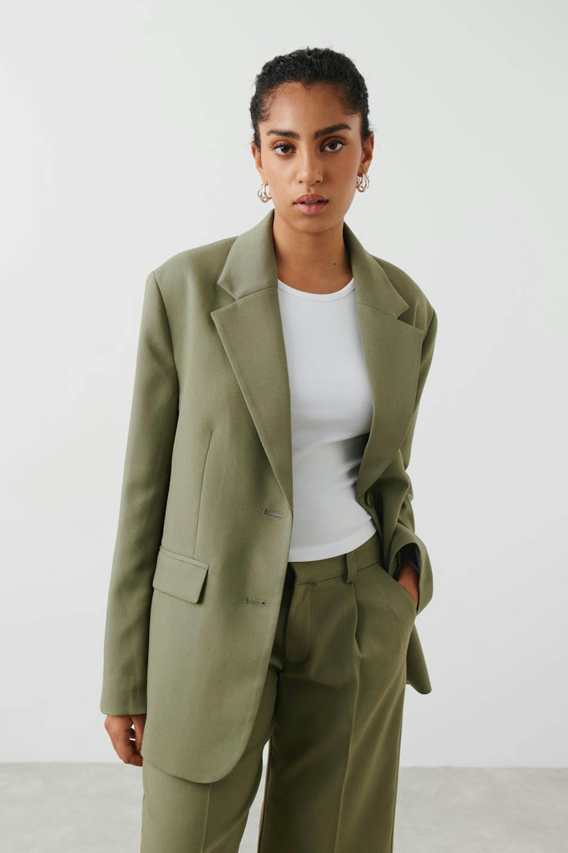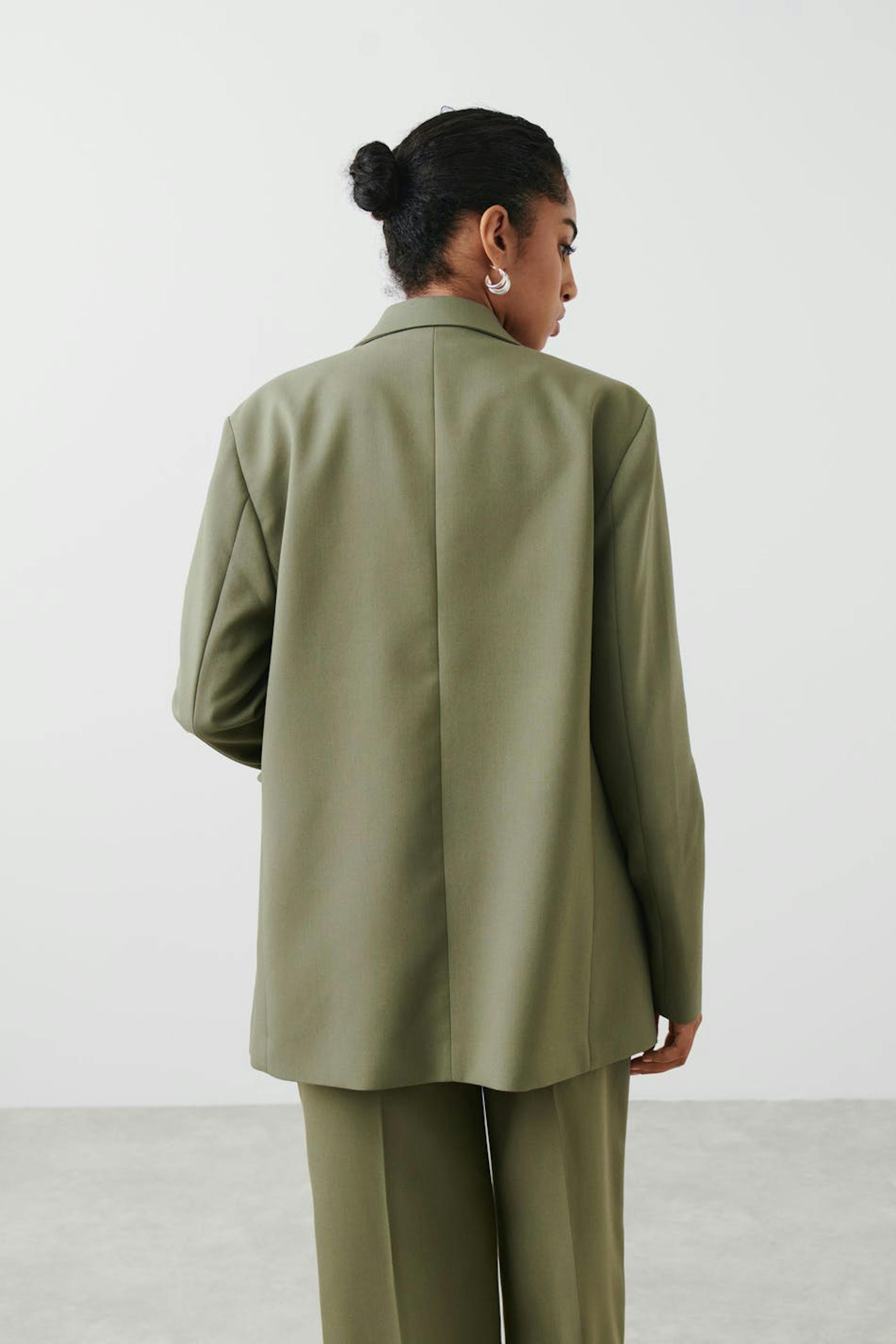 Oversized kavaj med knäppning fram. Kavajen är grön, vävd och enkelknäppt. Den har krage med skårat kavajslag, bröstficka på vänster sida och passpolerade fickor med lock framtill.