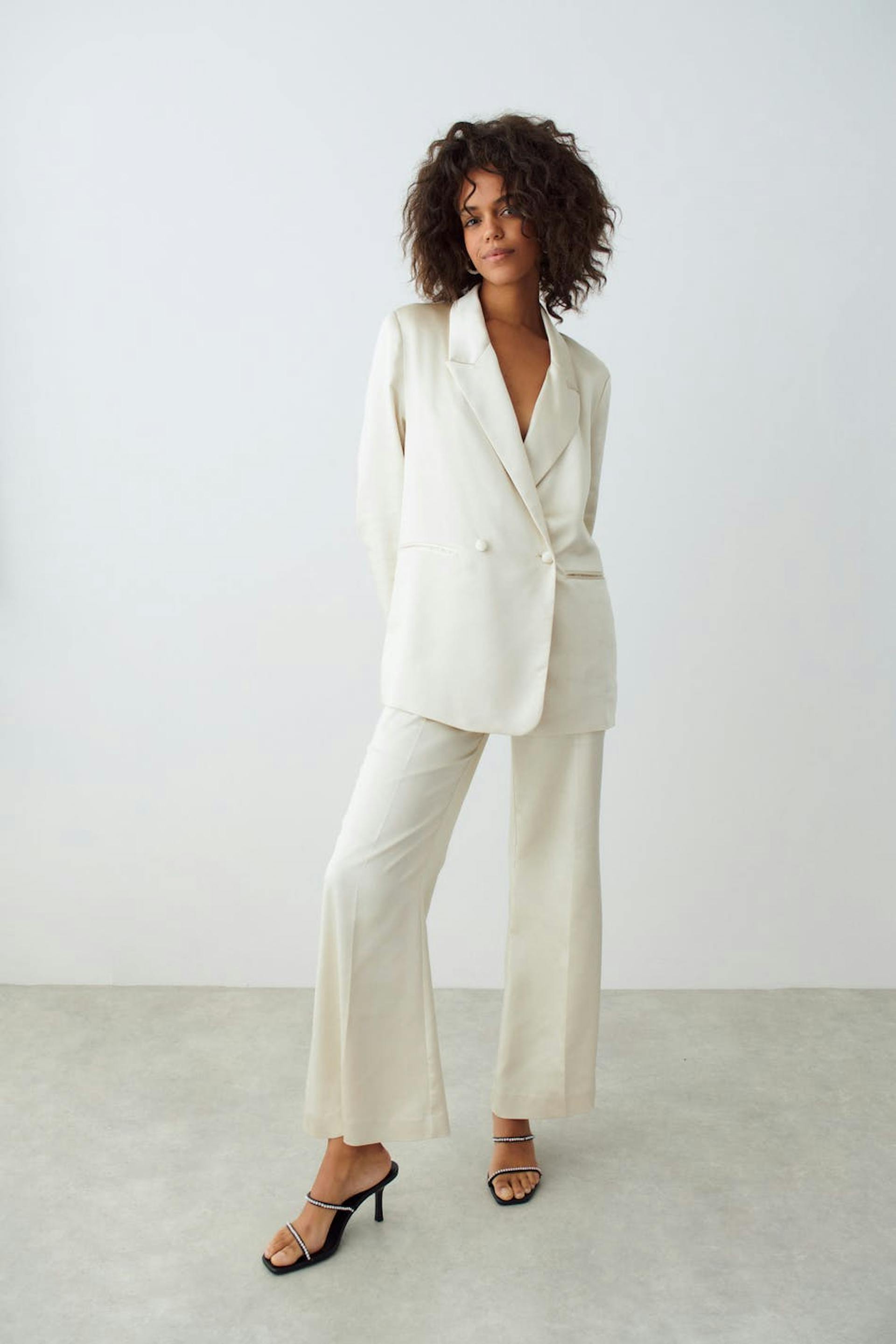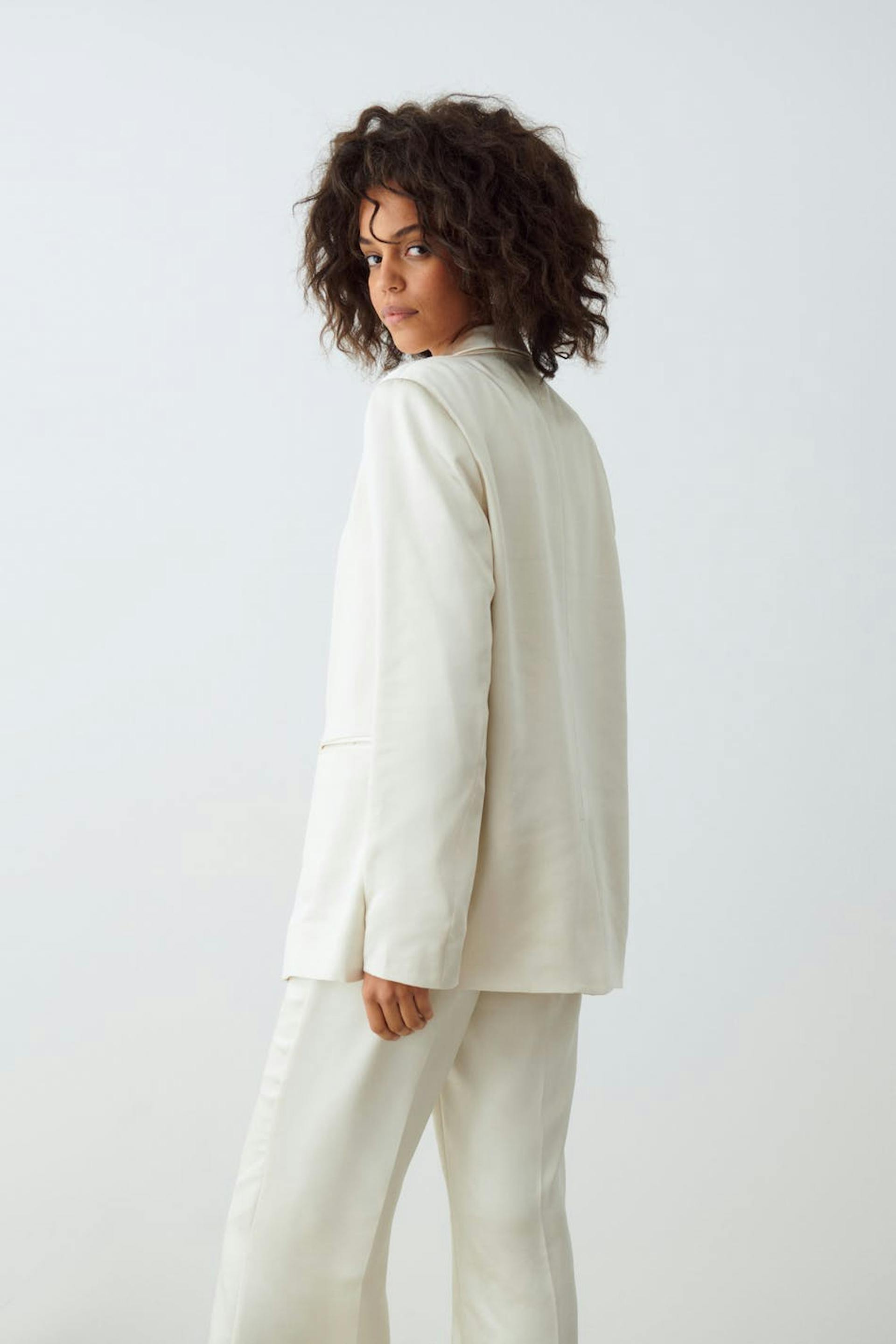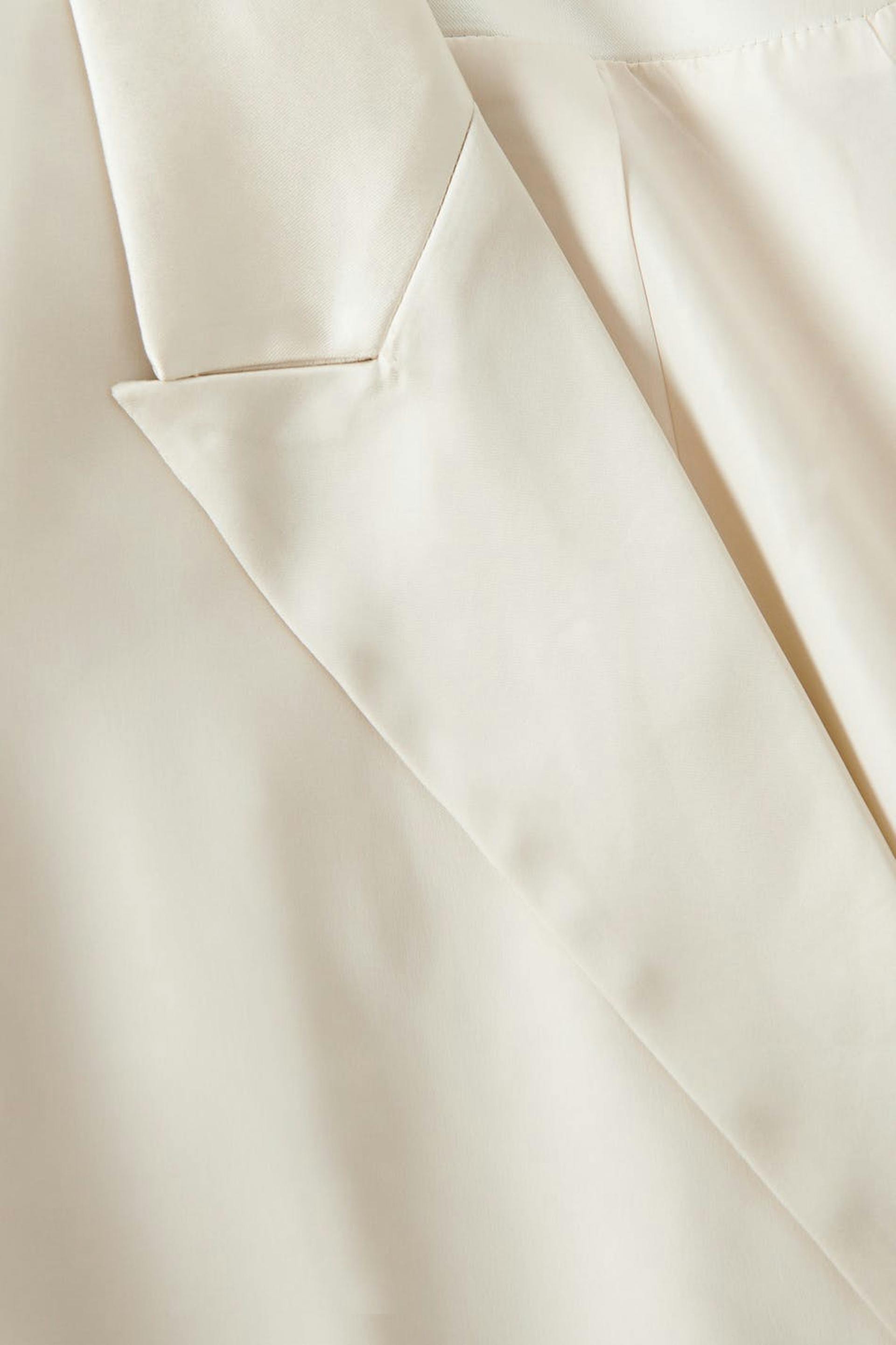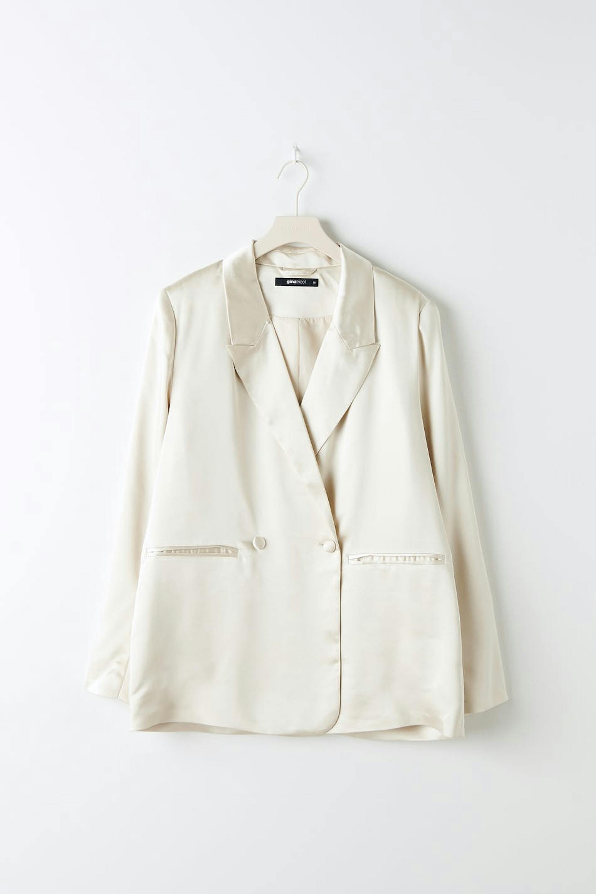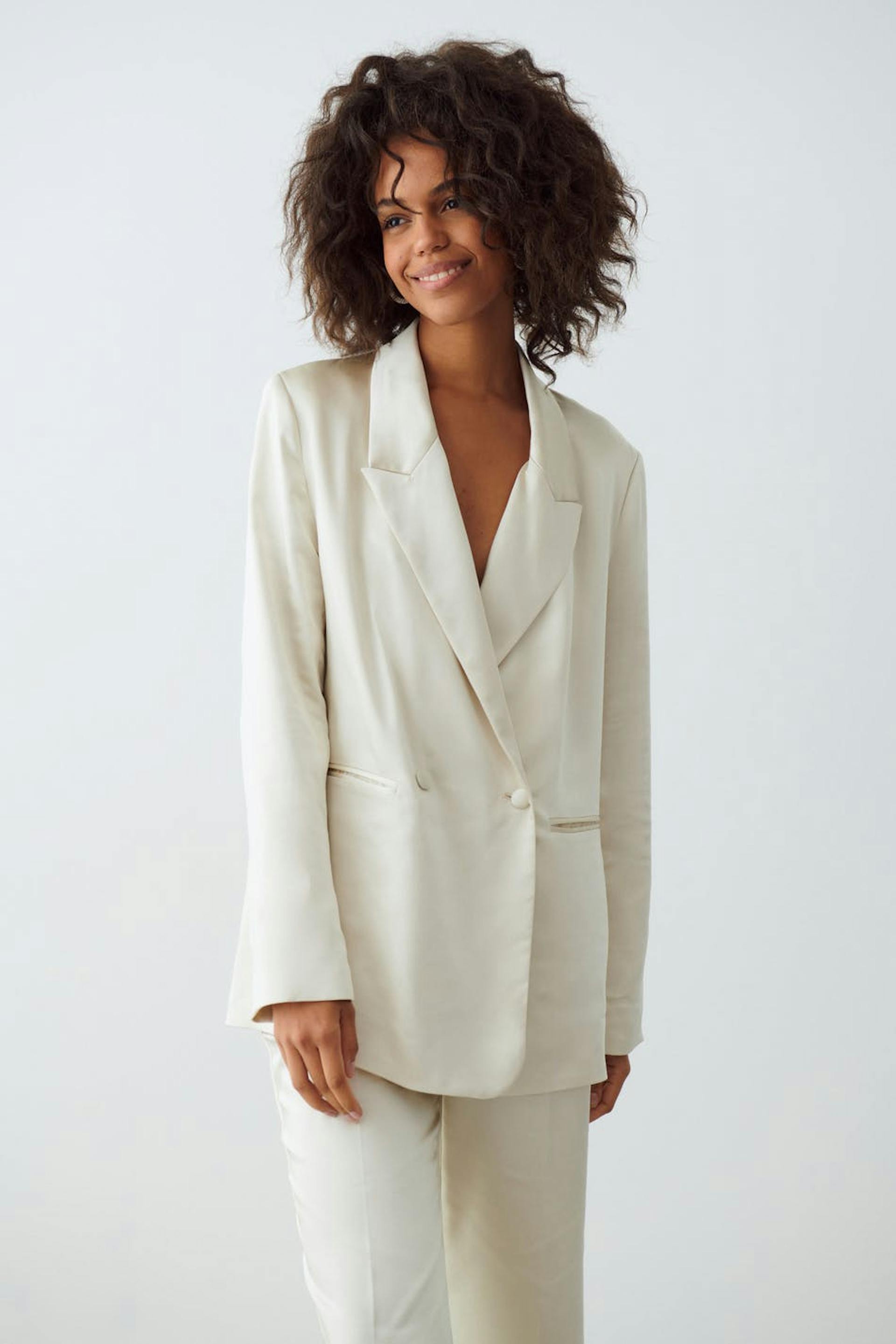 Dubbelknäppt kavaj i satin med avslappnad passform. Kavajen är beige och har knäppning fram. Den har passpoalfickor i sidorna, krage med slag och sprund bak.