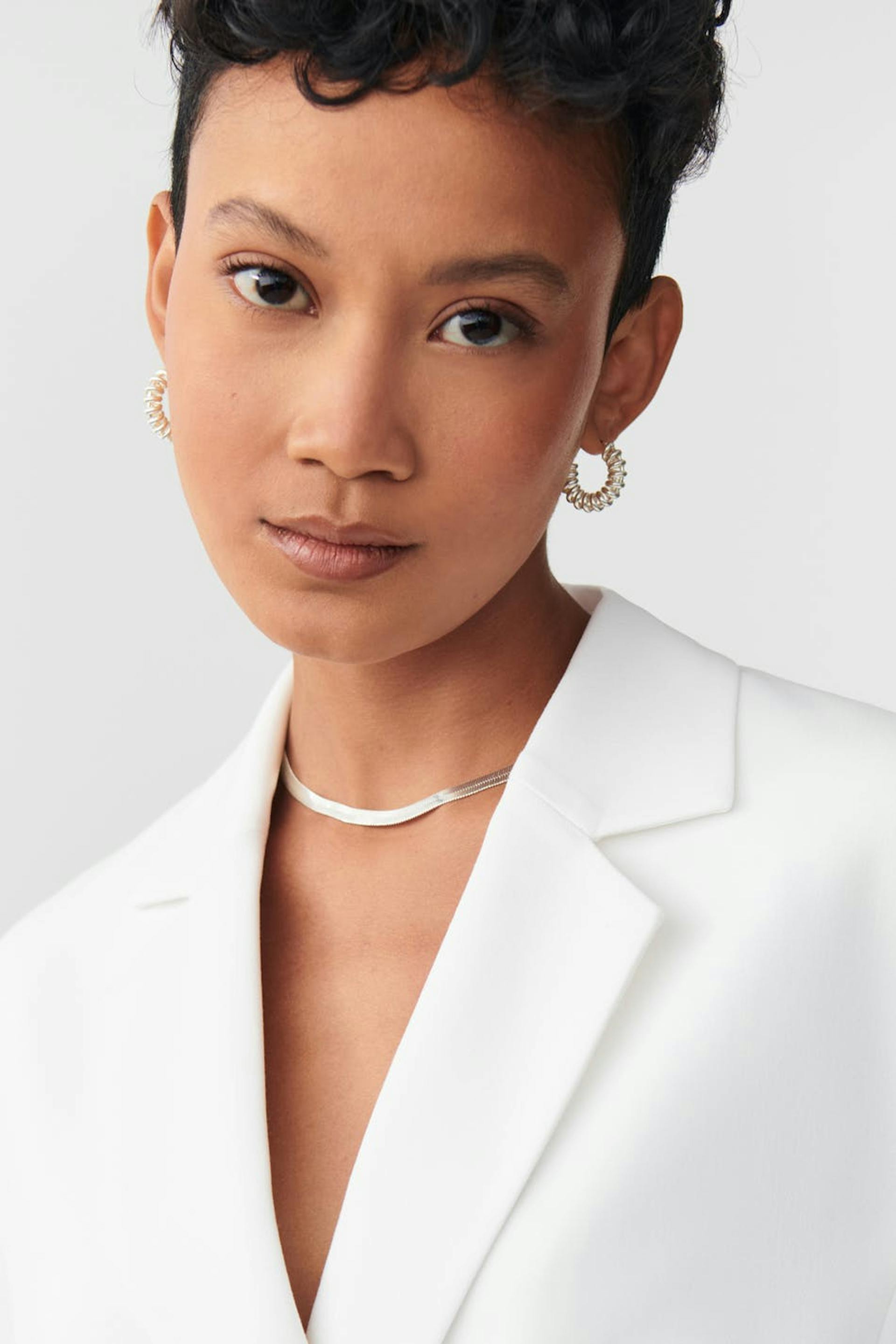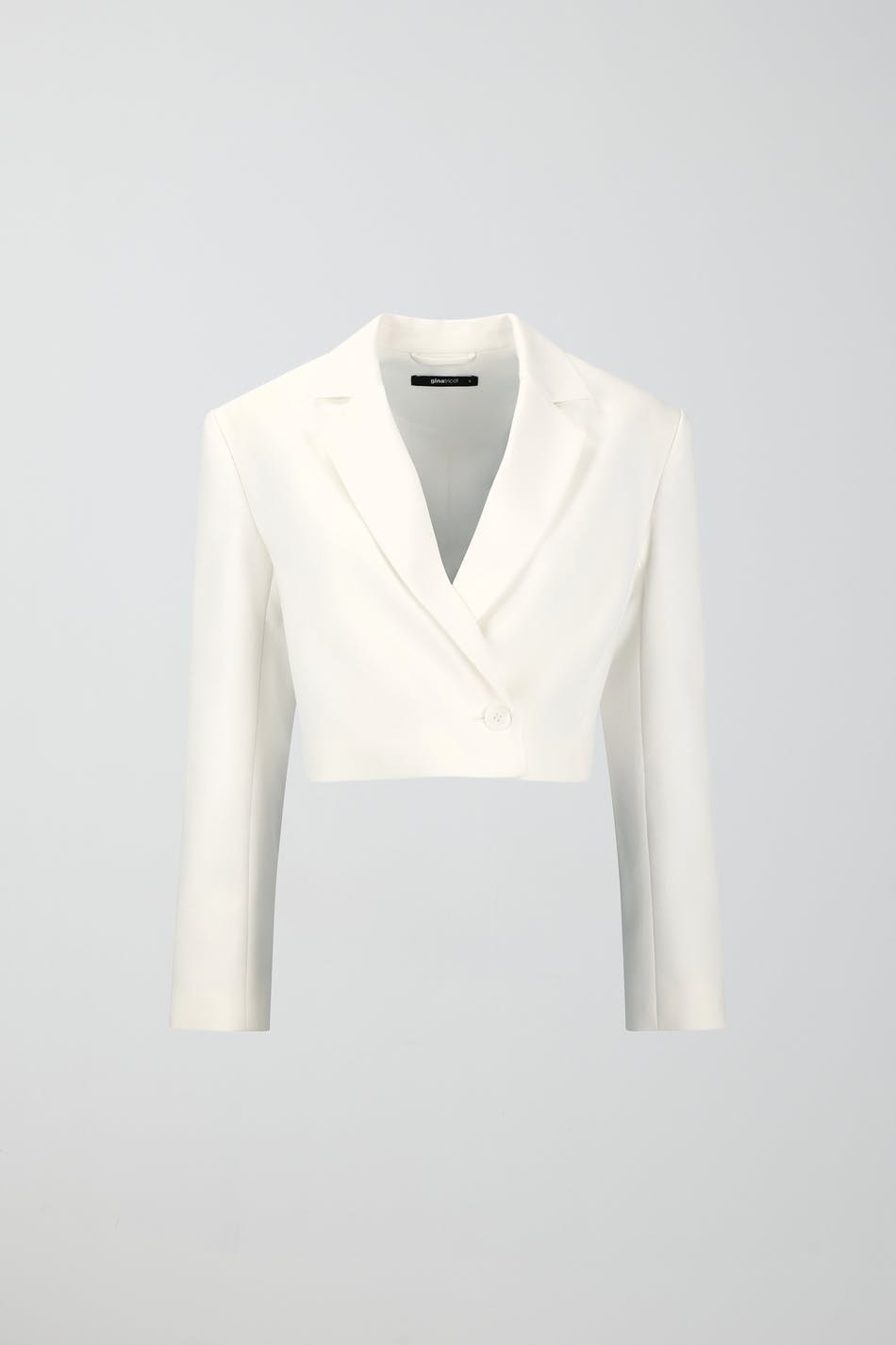 Croppad blazer med knäppning fram. Blazern är vit och har krage med slag.
