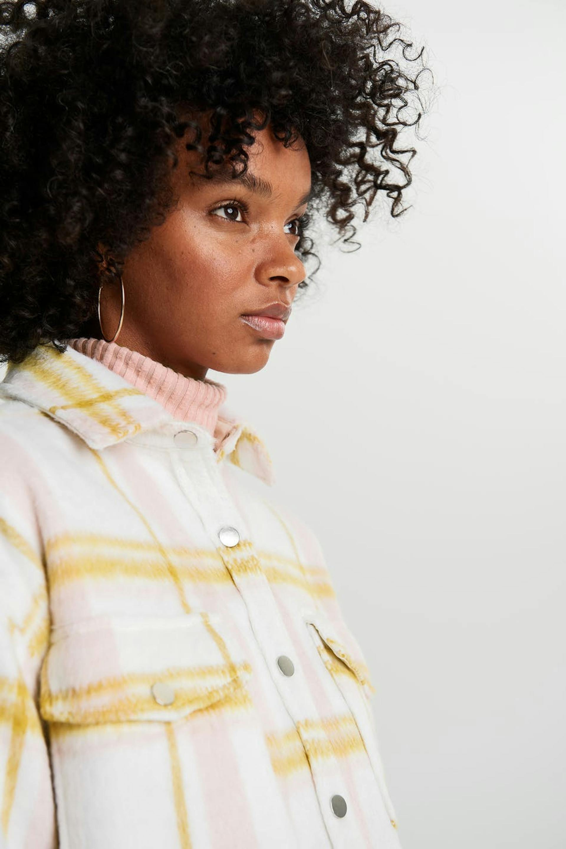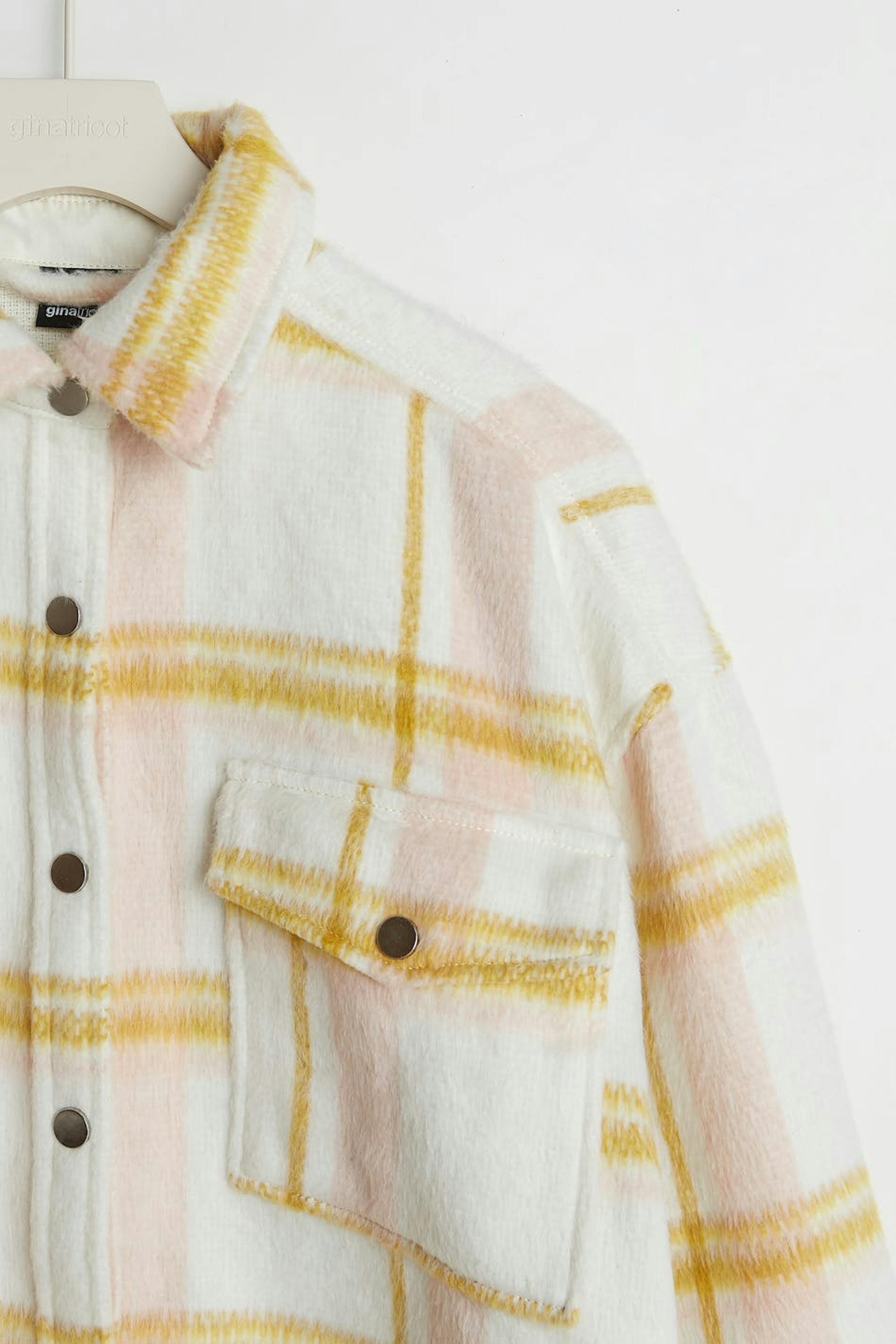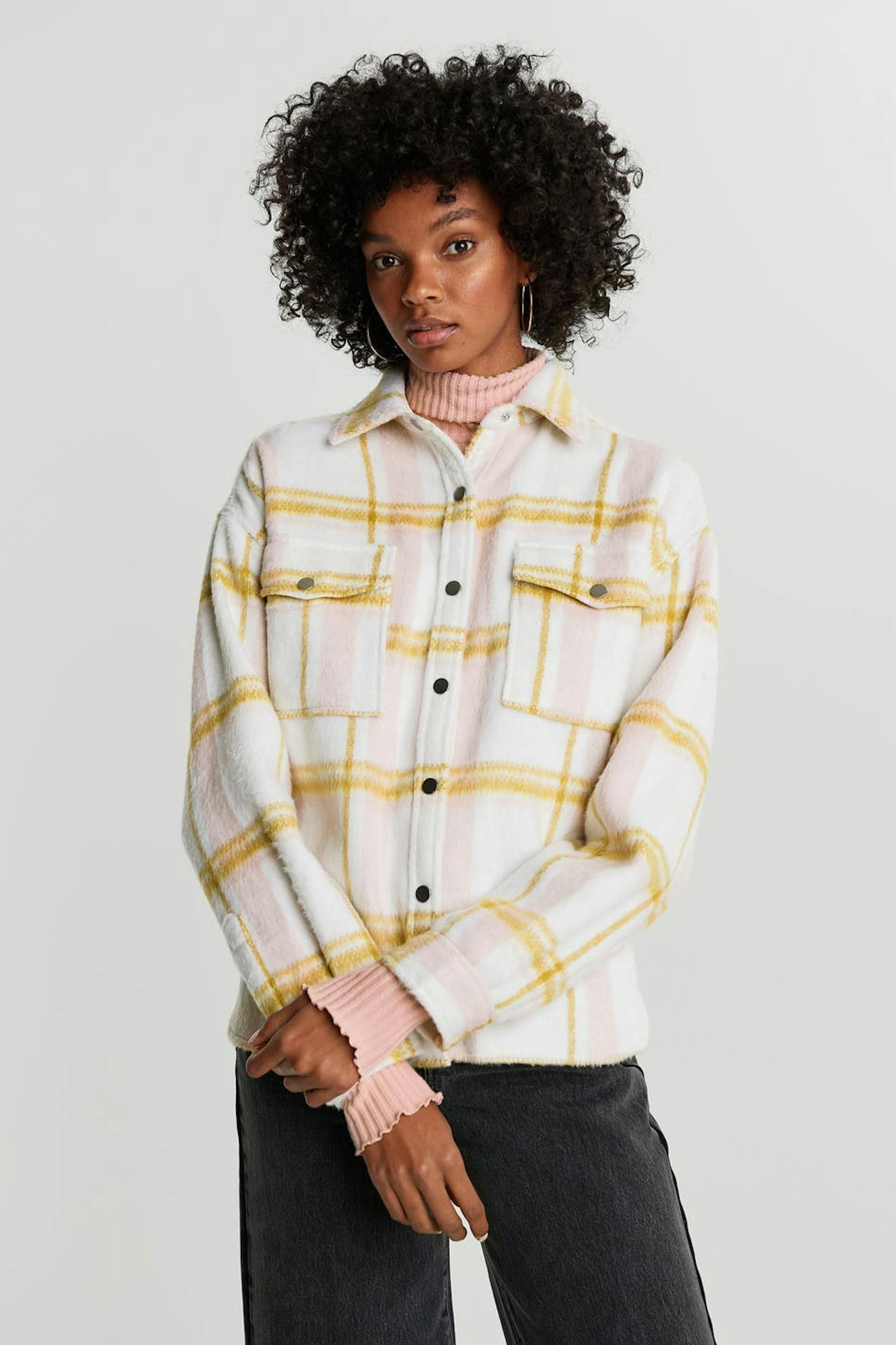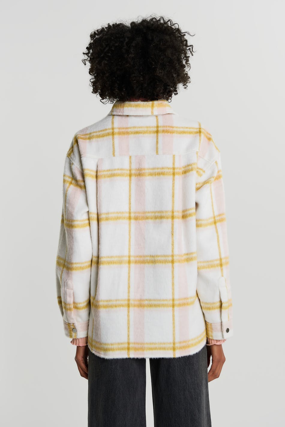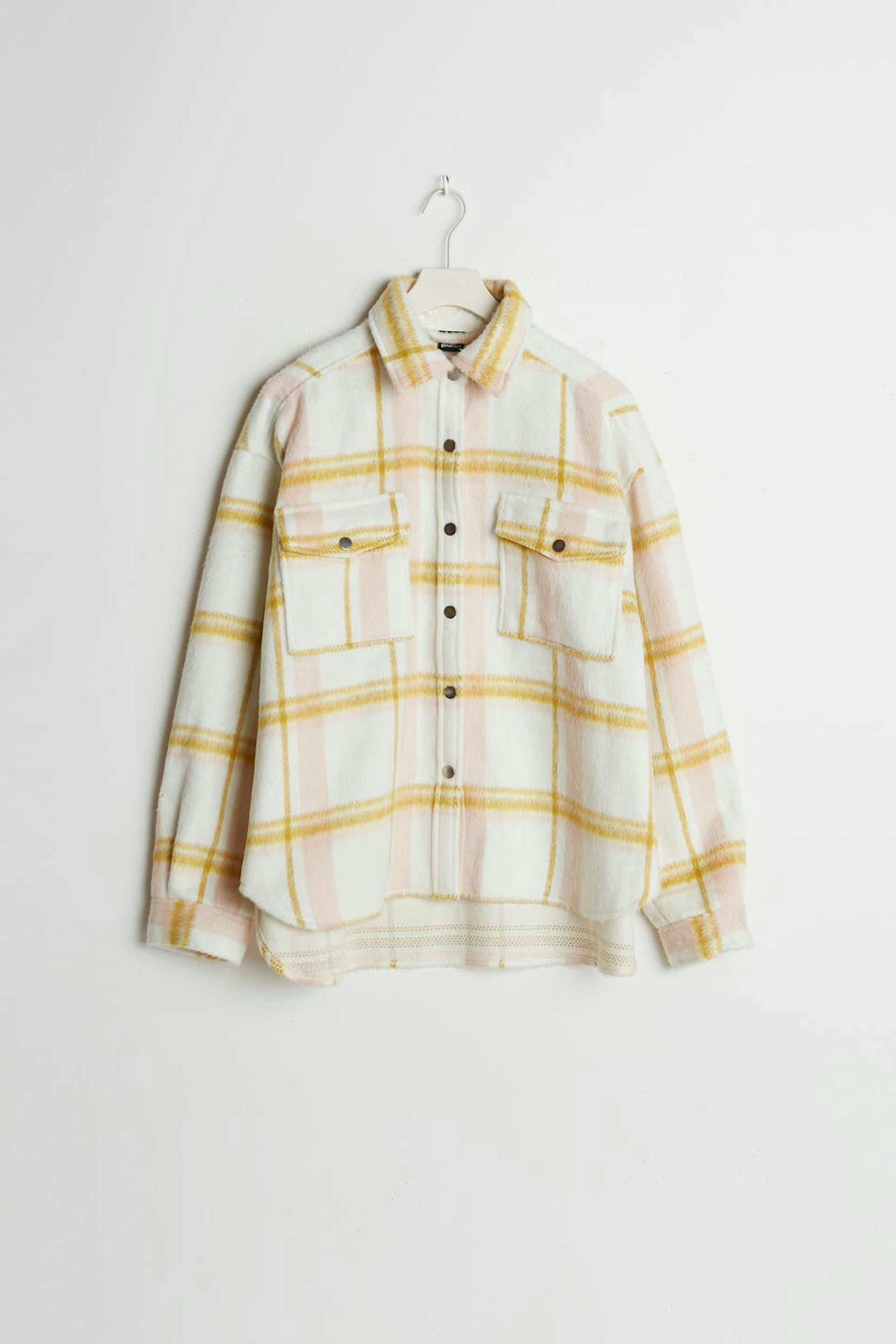 Rutig skjorta med oversize fit. Skjortan är vit och har bröstfickor. Den har knappar framtill, en krage och en borstad material.