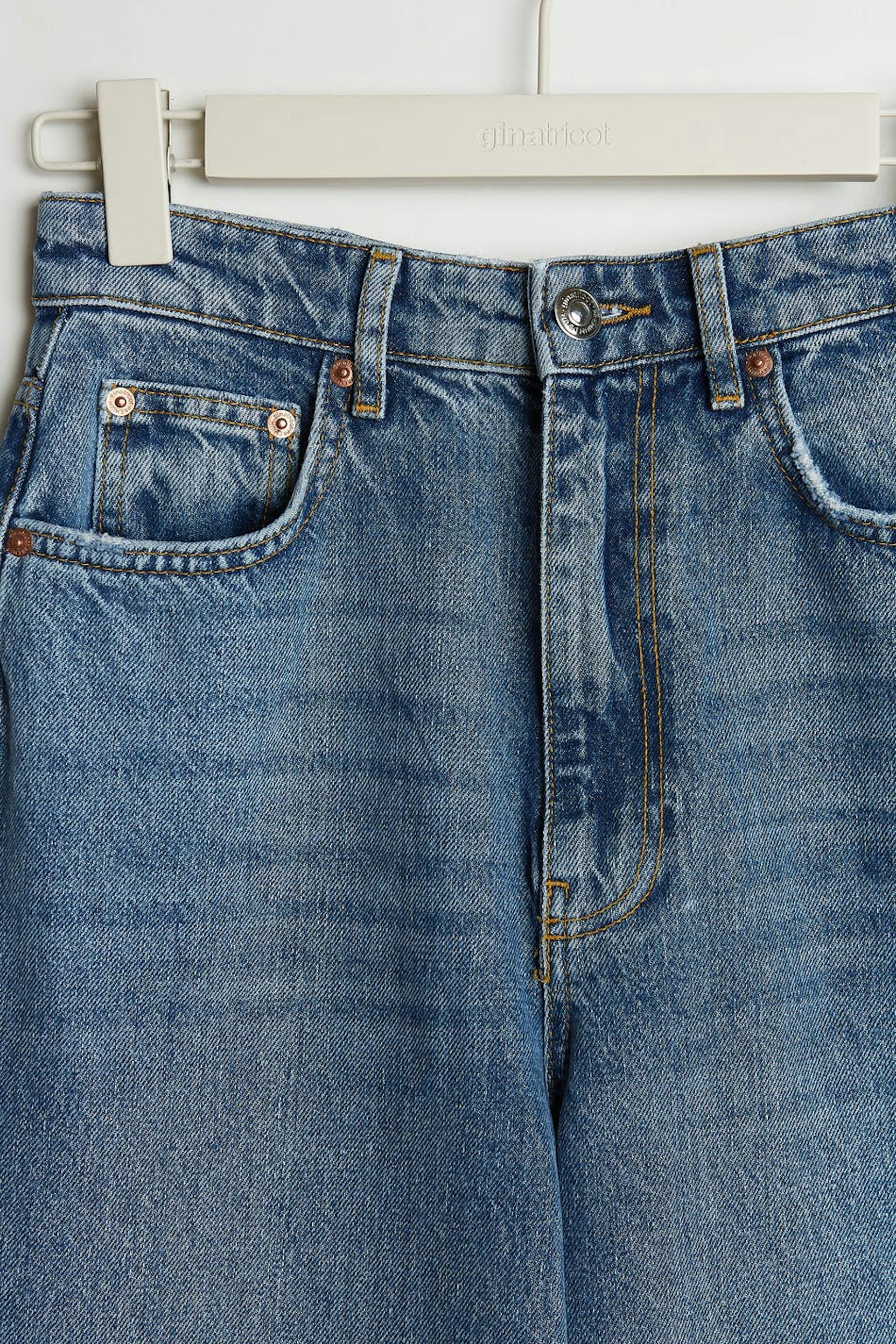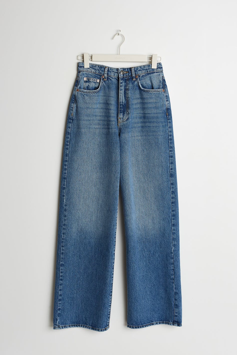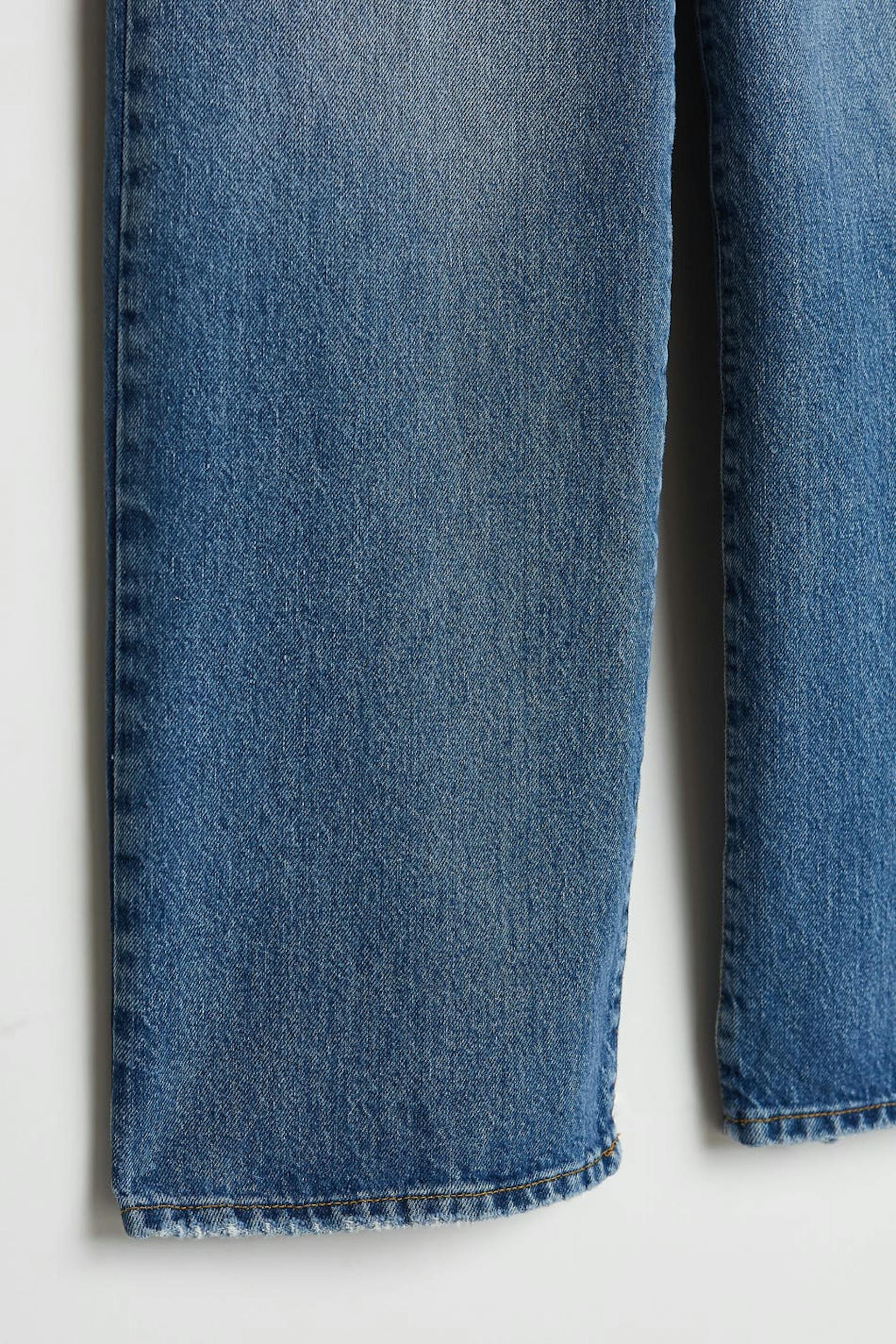Jeans utan stretch med en normal passform. Jeansen är blåa och har en hög midja. De har vida ben och en fullängd.