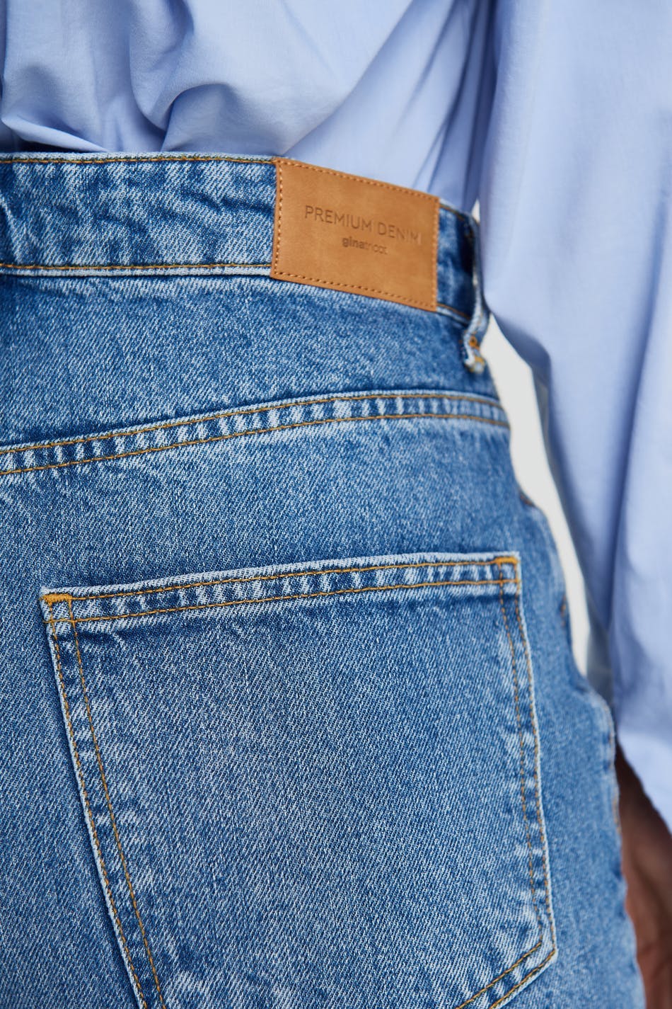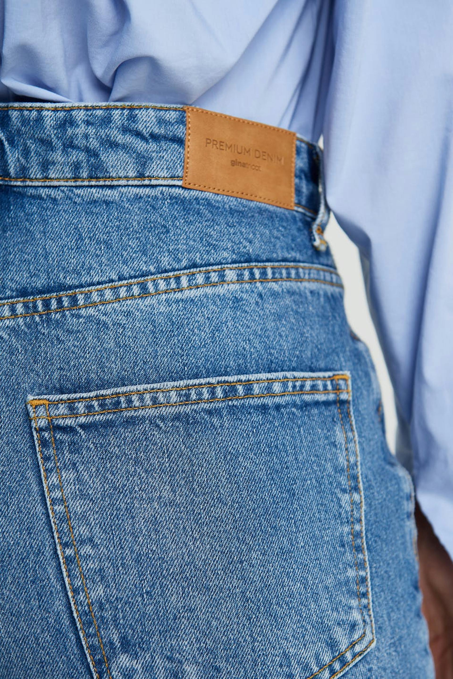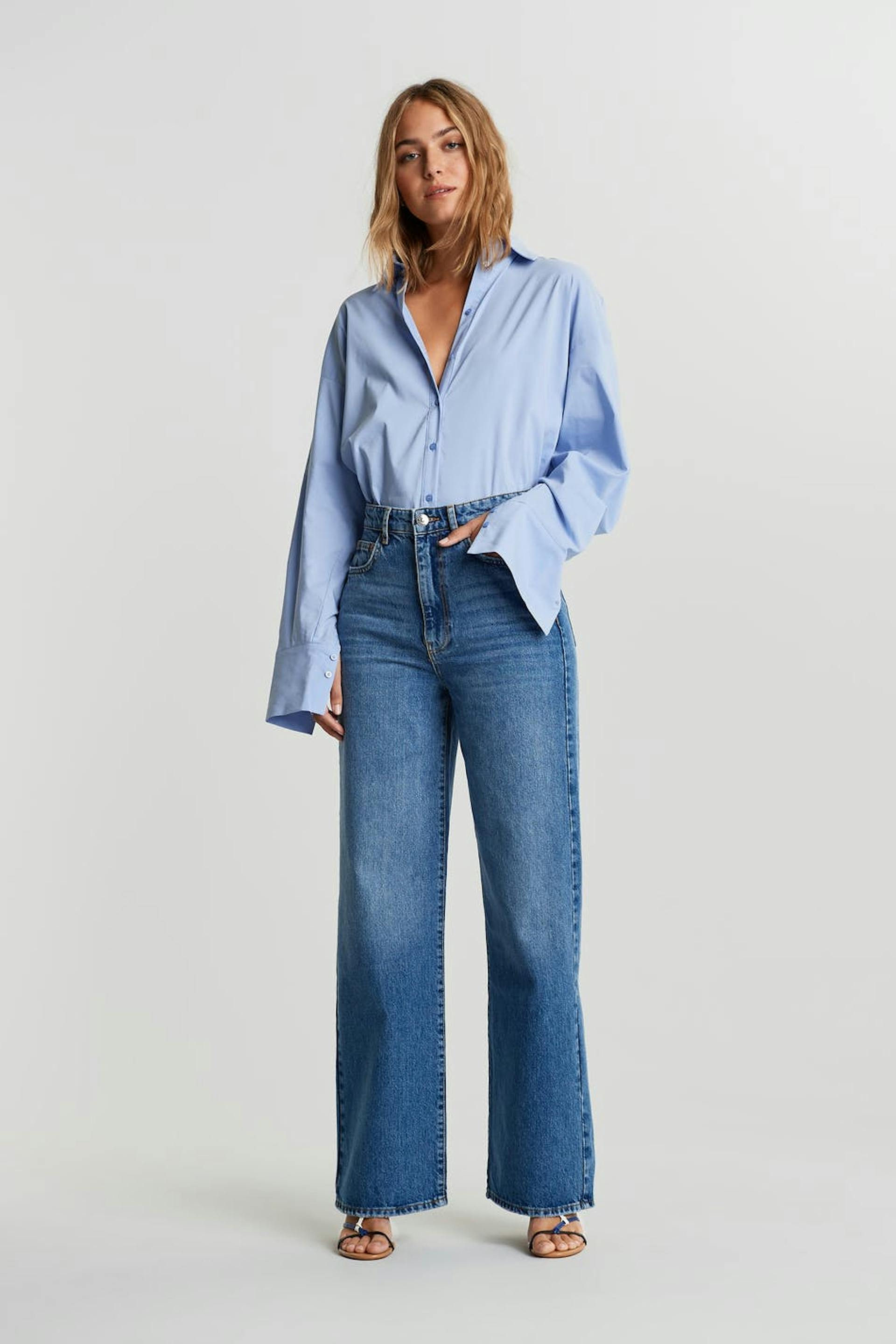 Jeans utan stretch med en normal passform. Jeansen är blåa och har en hög midja. De har vida ben och en fullängd.