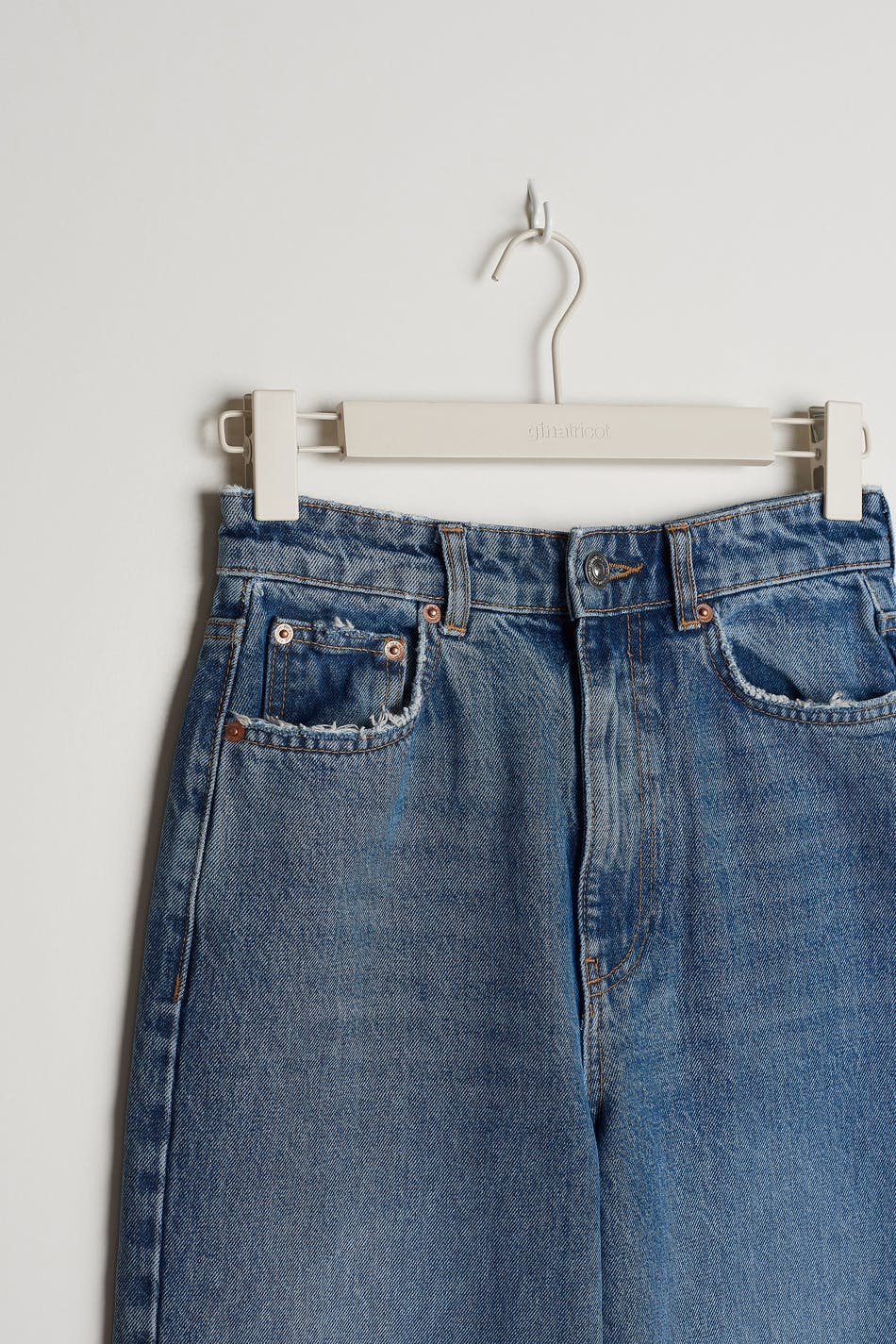 Vida jeans utan stretch med hög midja. Jeansen är blåa och har dragkedjegylf. De har vida ben med normal längd och fickor fram och bak. Se gärna vår storleksguide för att hitta din storlek.