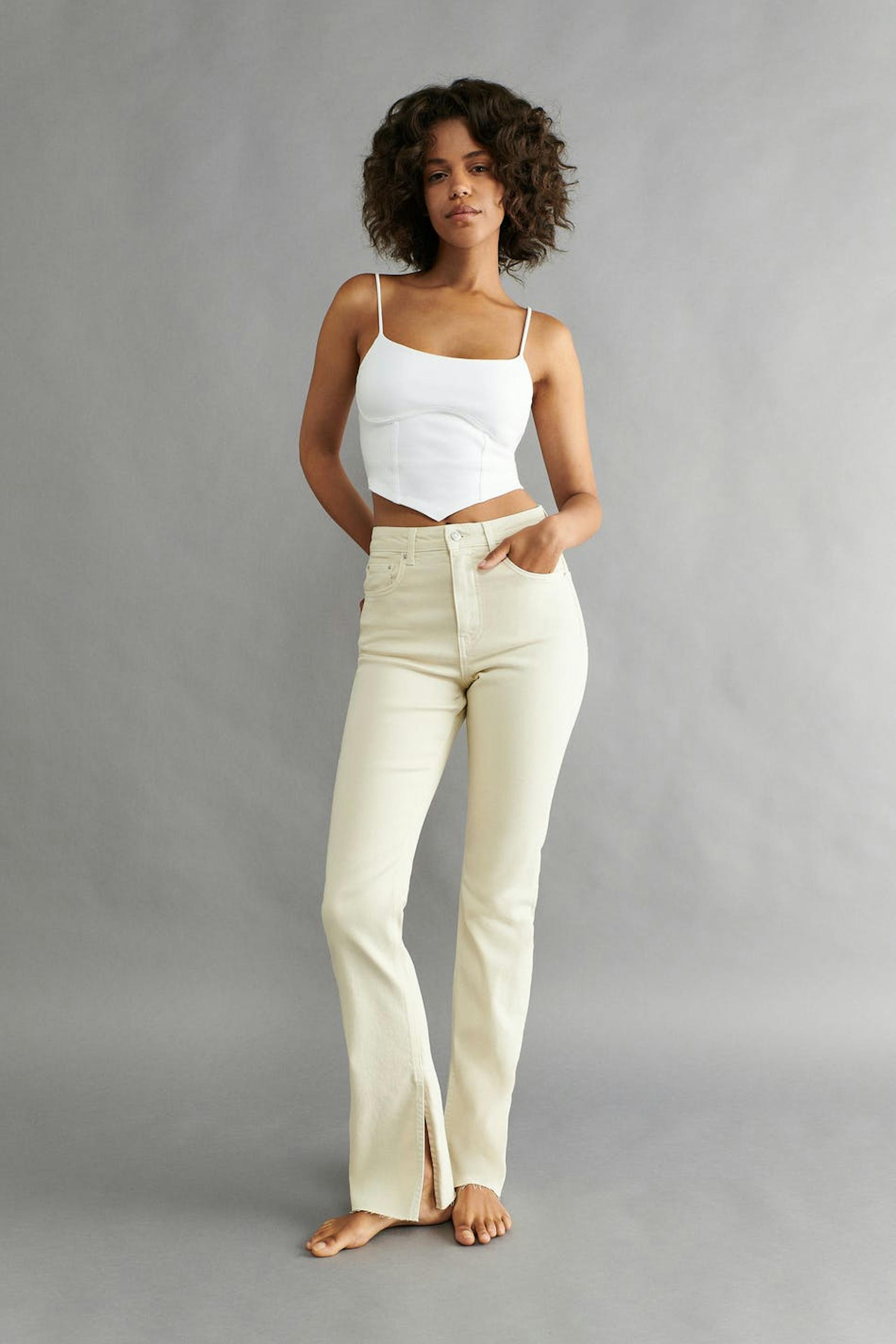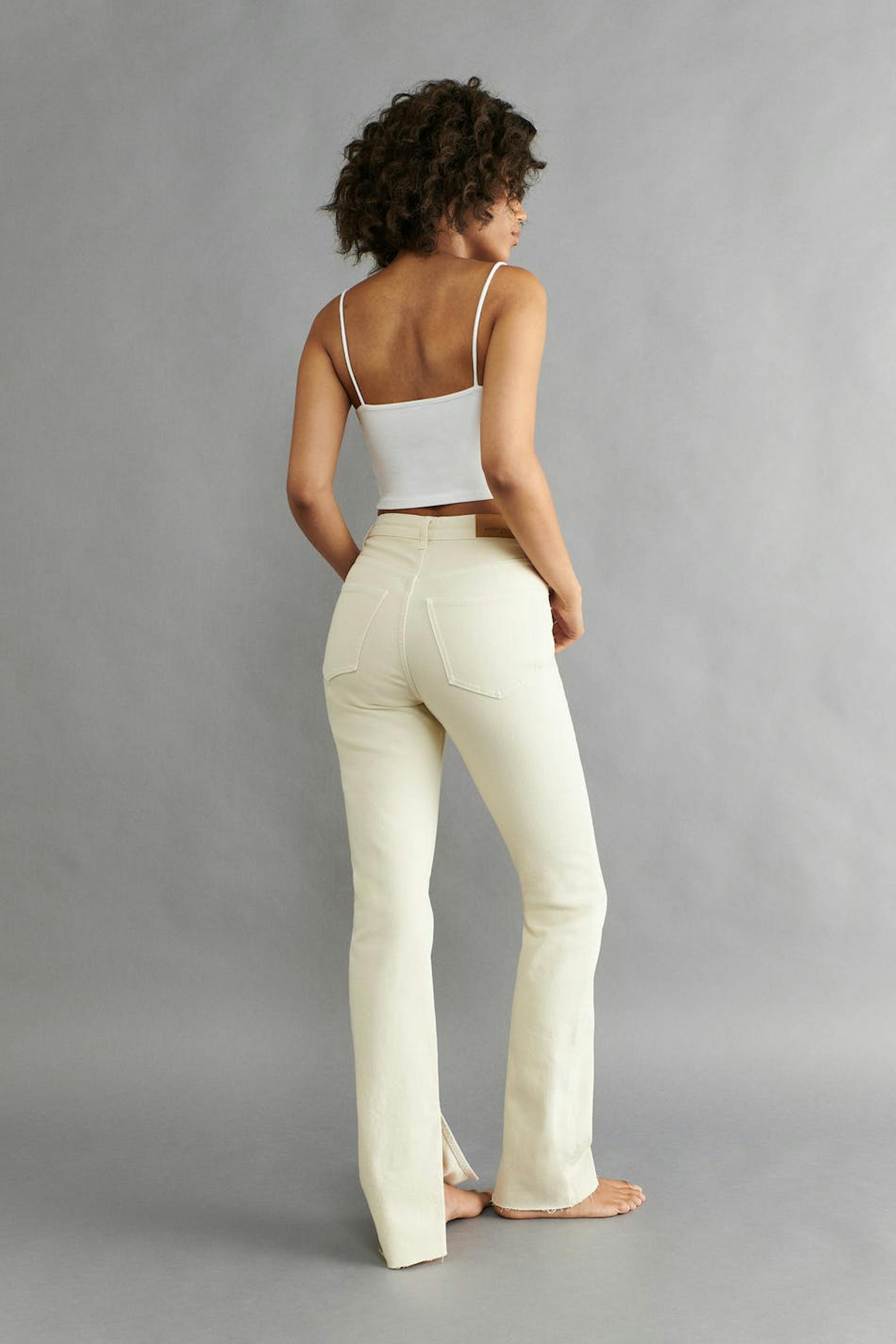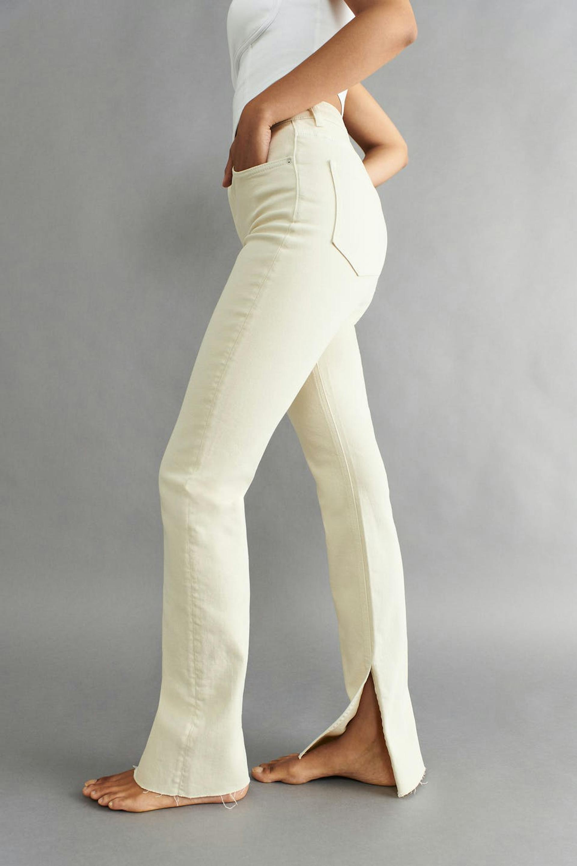 Slim jeans med hög midja i denim med låg stretch. Jeansen är beigea och har raka ben med fullängd. De har slits vid bensluten, dragkedjegylf och fickor fram och bak. Se gärna vår storleksguide för att hitta din storlek.