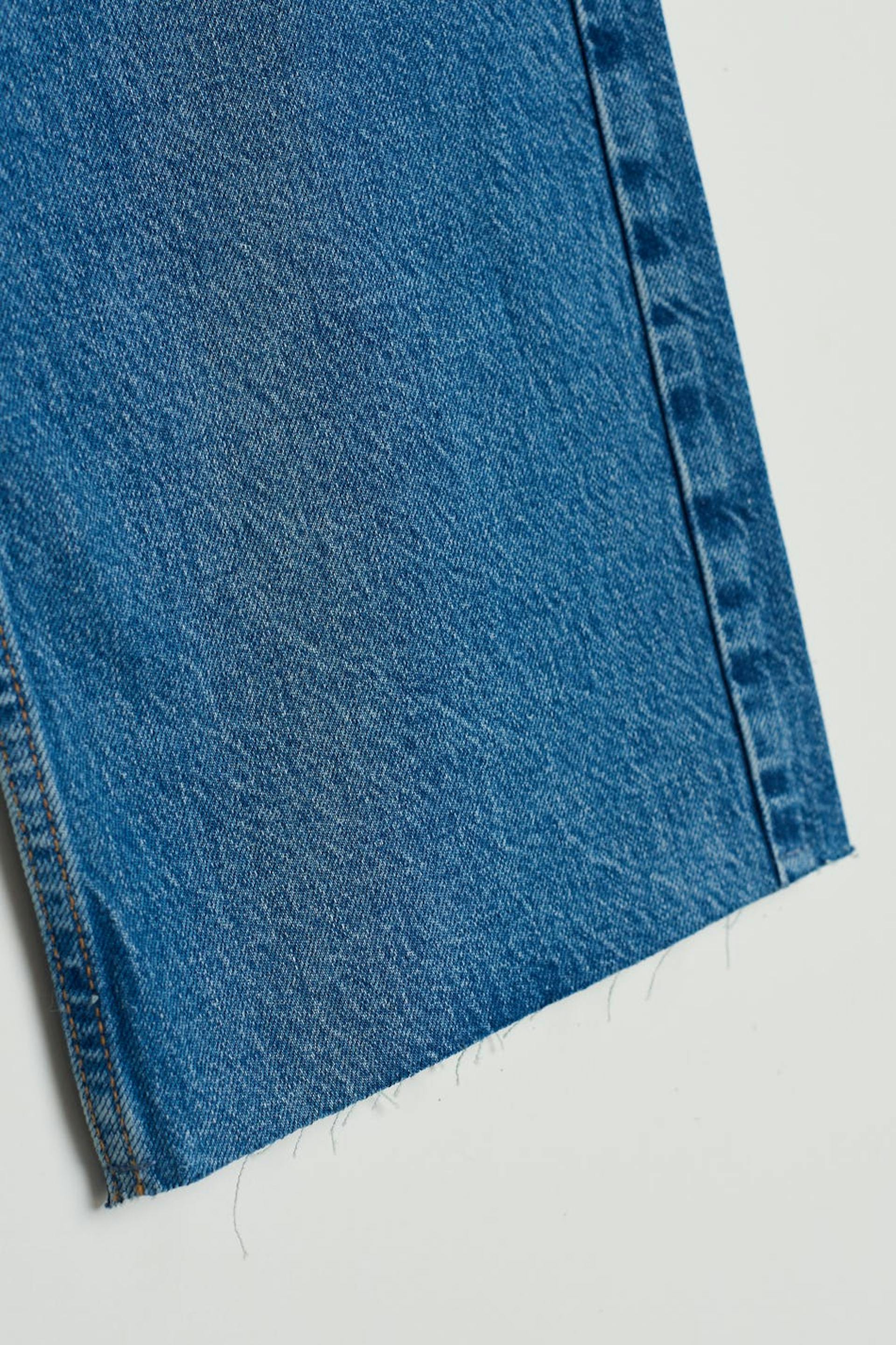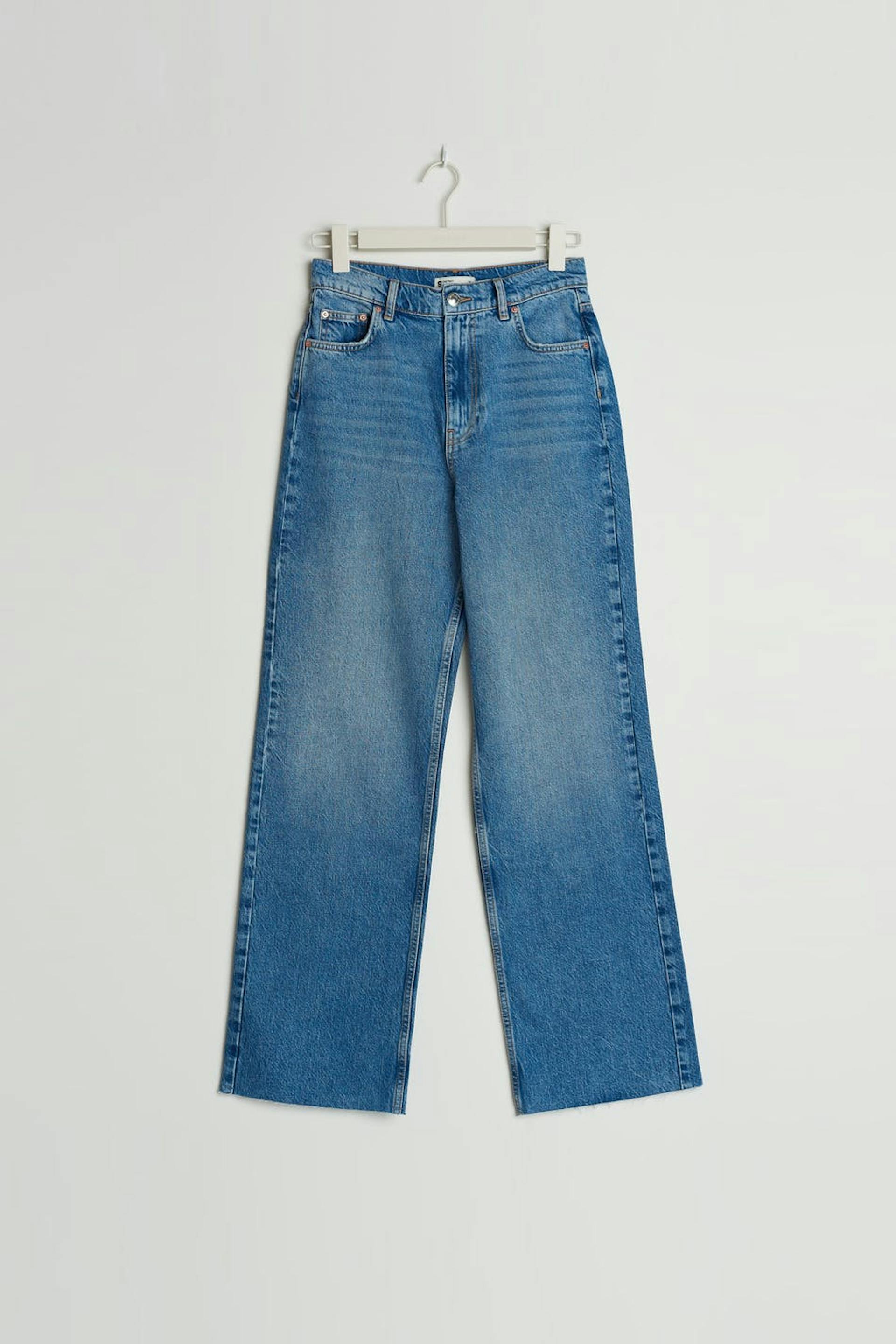 Petite jeans med superhög midja. Jeansen är blåa och utan stretch och har raka, vida byxben med fullängd. De har dragkedjegylf och rå kant vid bensluten. Passar för dig som är 160 cm eller kortare. Se gärna vår storleksguide för att hitta din storlek.