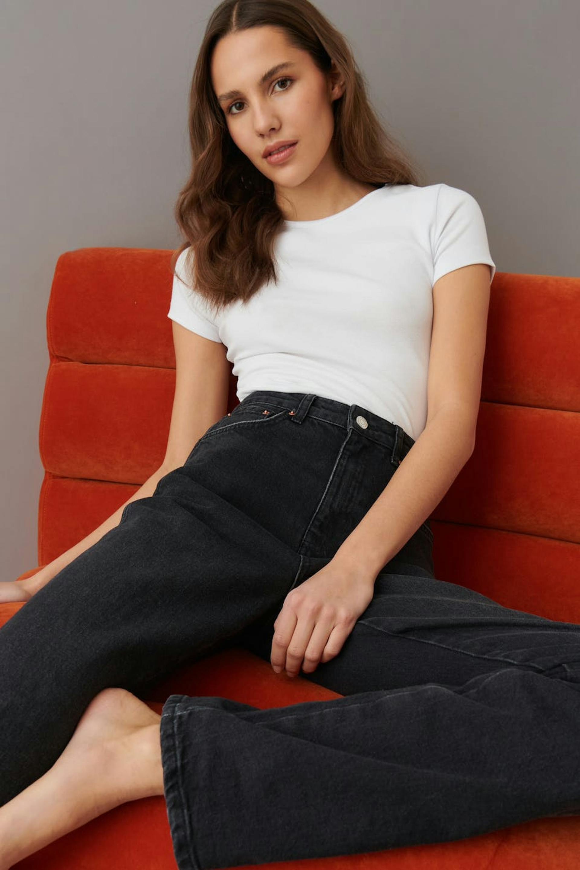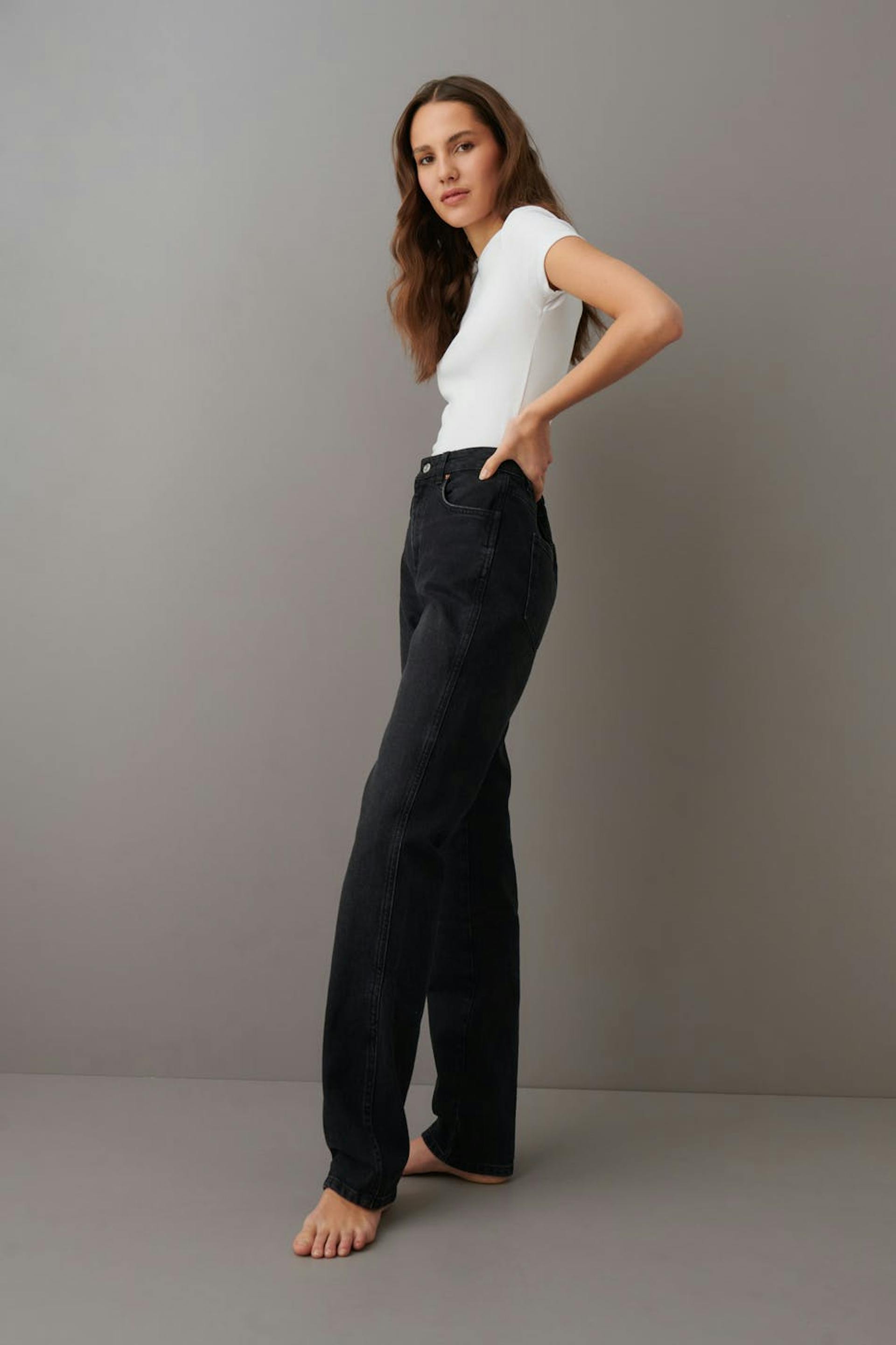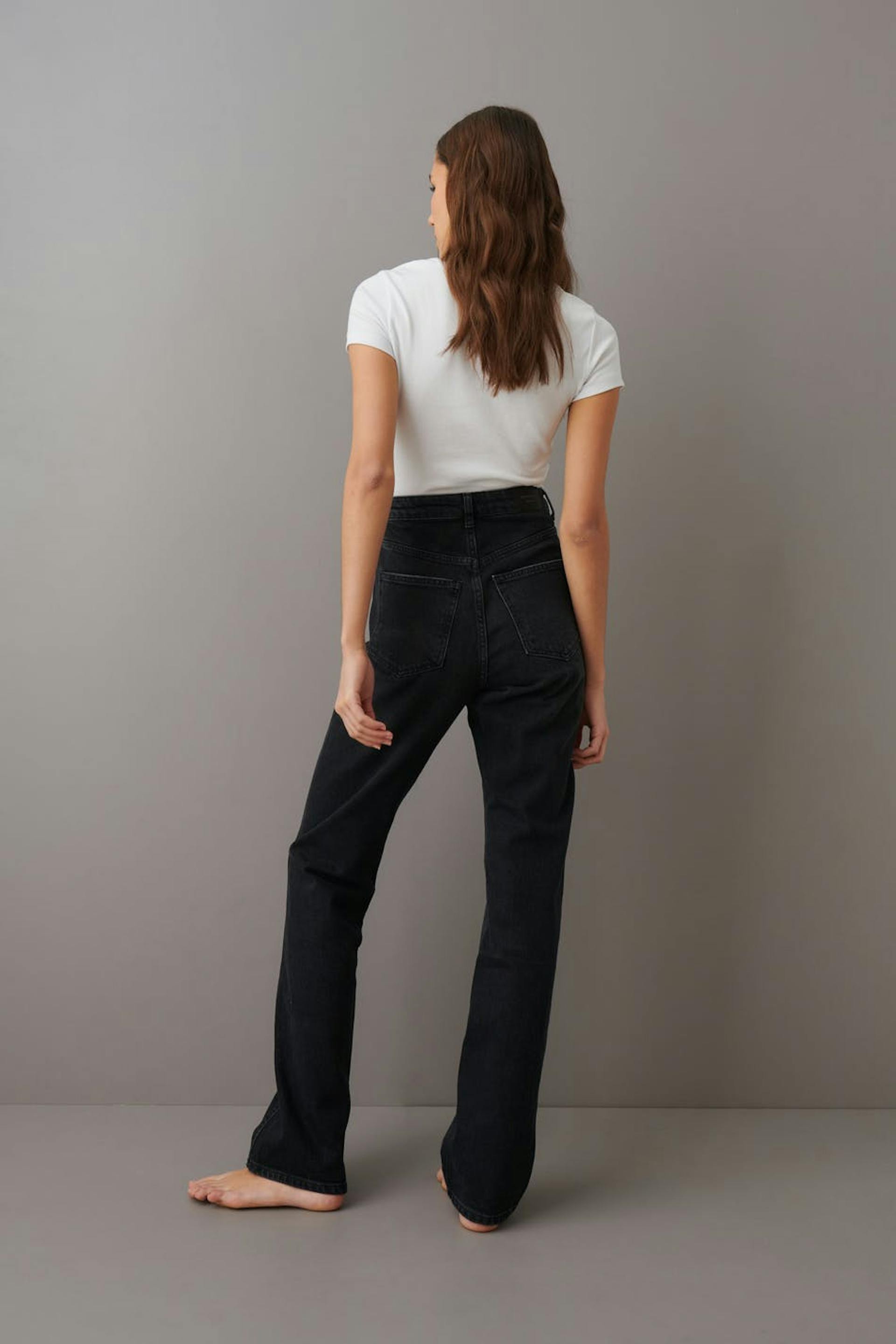 Slim jeans med hög midja i denim med stretch. Jeansen är svartgråa och har raka ben med fullängd. De har dragkedjegylf och fickor fram och bak. Se gärna vår storleksguide för att hitta din storlek.