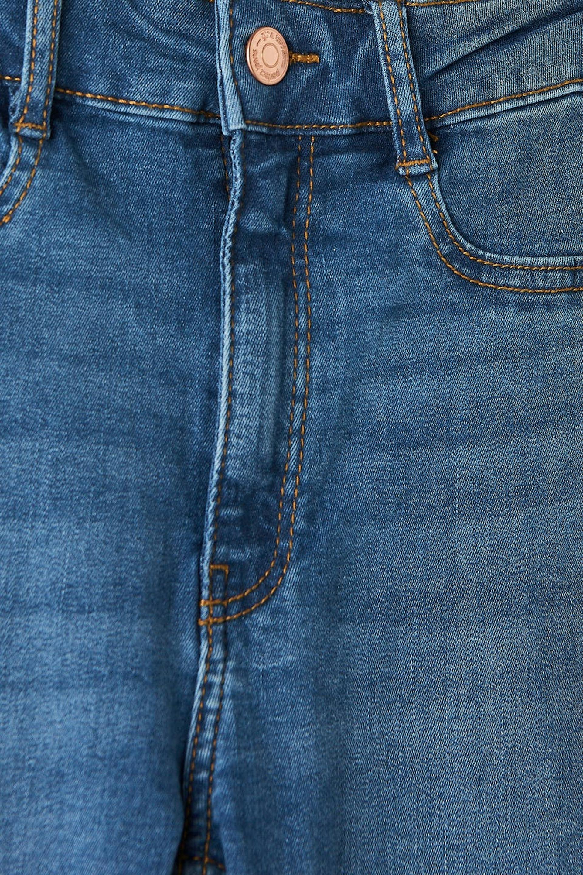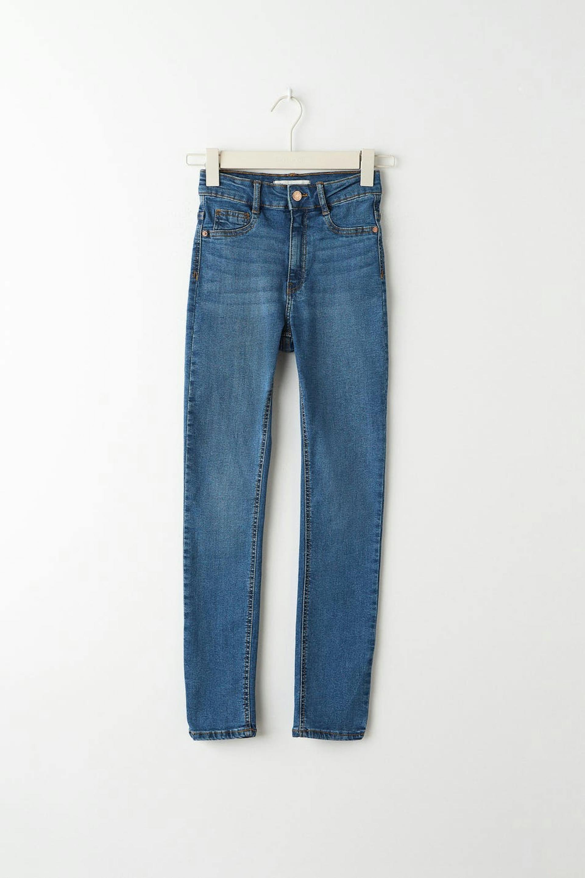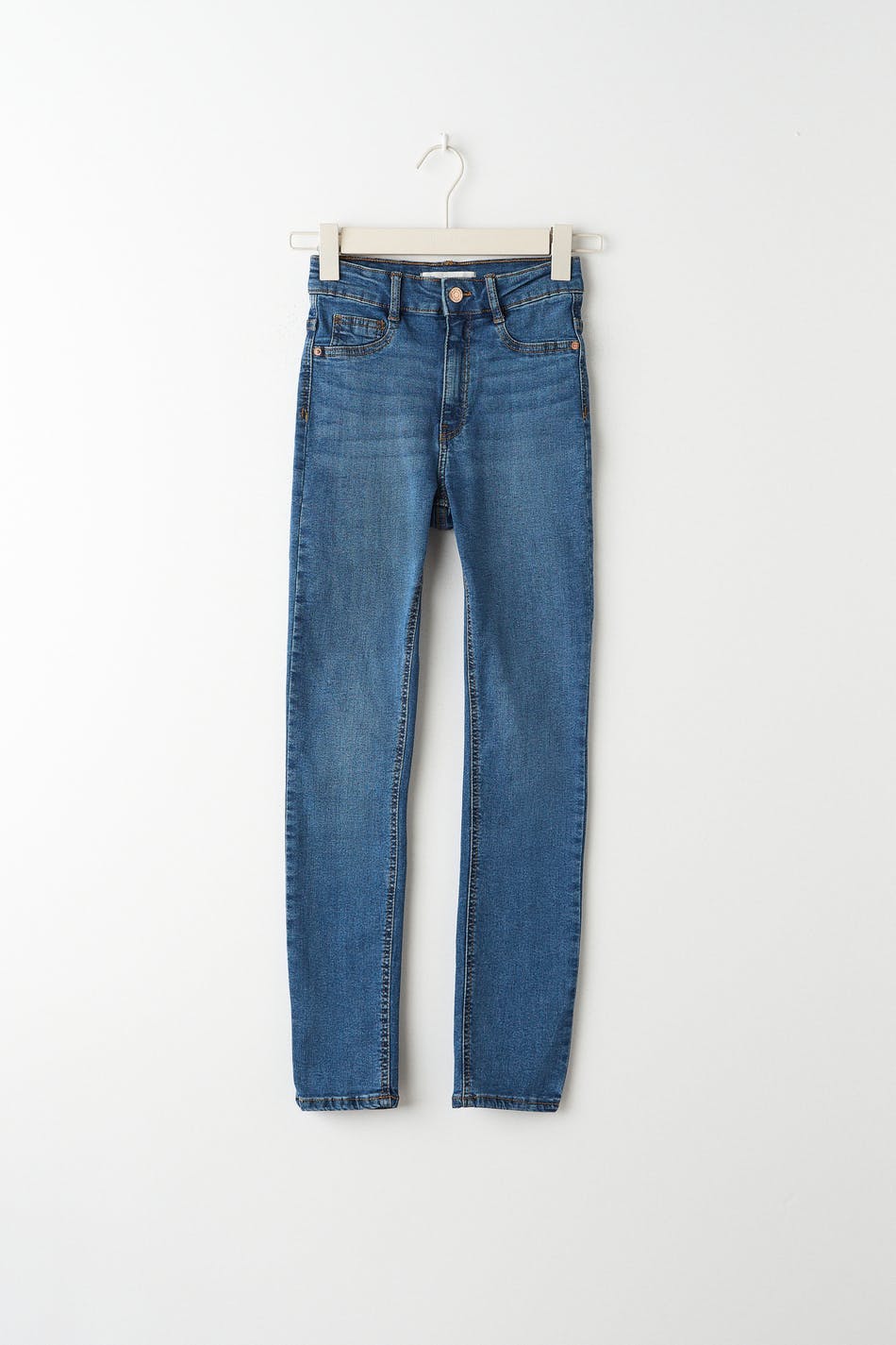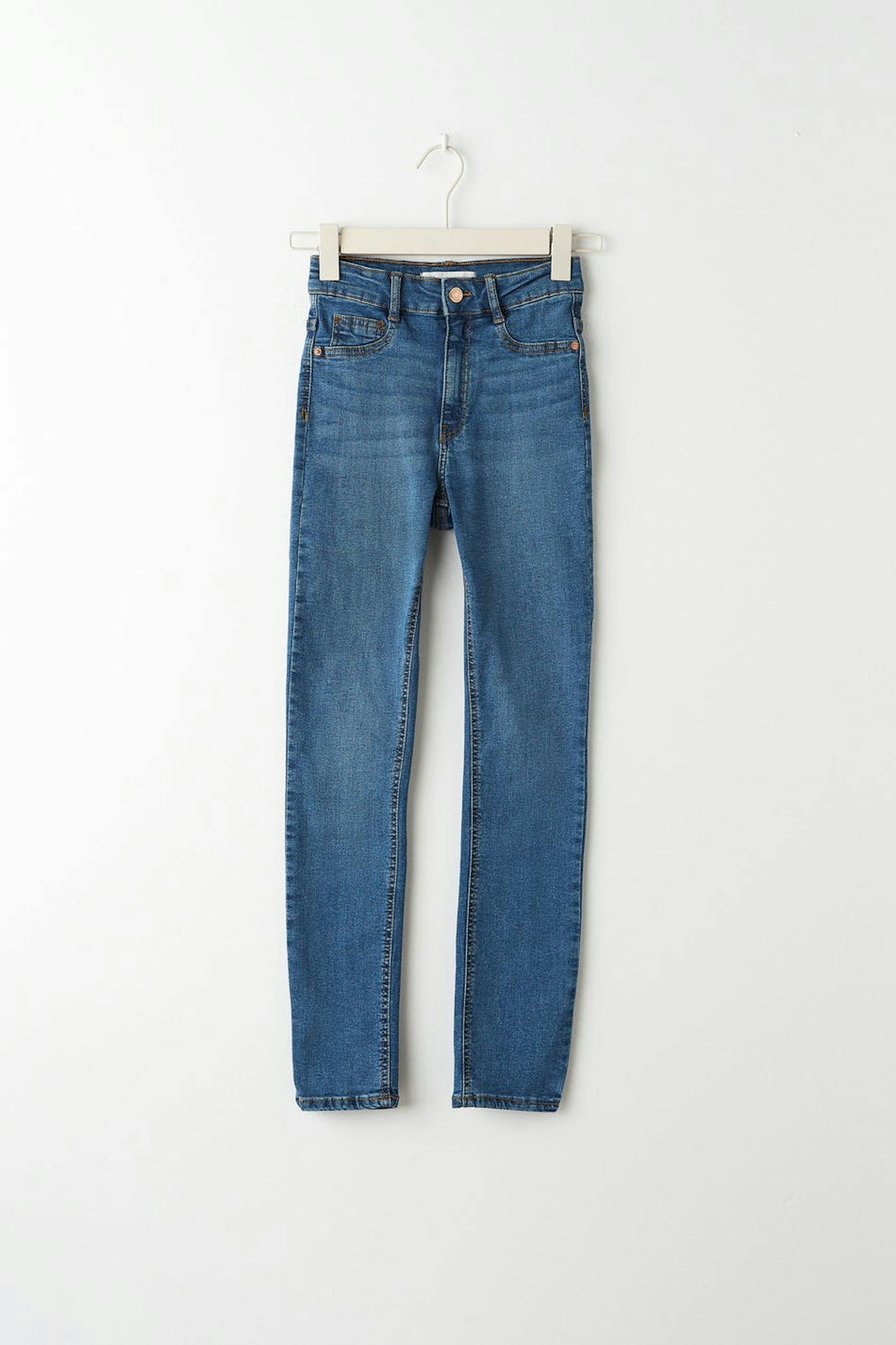Petite jeans med hög midja. Jeansen är blåa, superstretchiga och mjuka. De har en figurnära, bekväm passform med smala byxben, dragkedjegylf, fuskfickor framtill och riktiga bakfickor. Passar för dig som är 160 cm eller kortare. Se gärna vår storleksguide för att hitta din storlek.