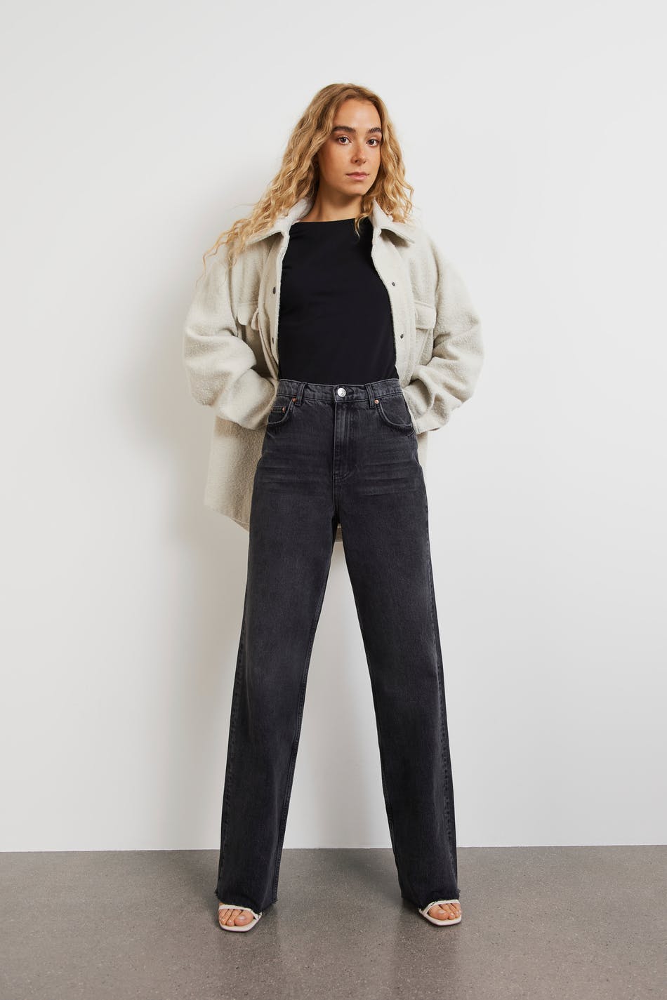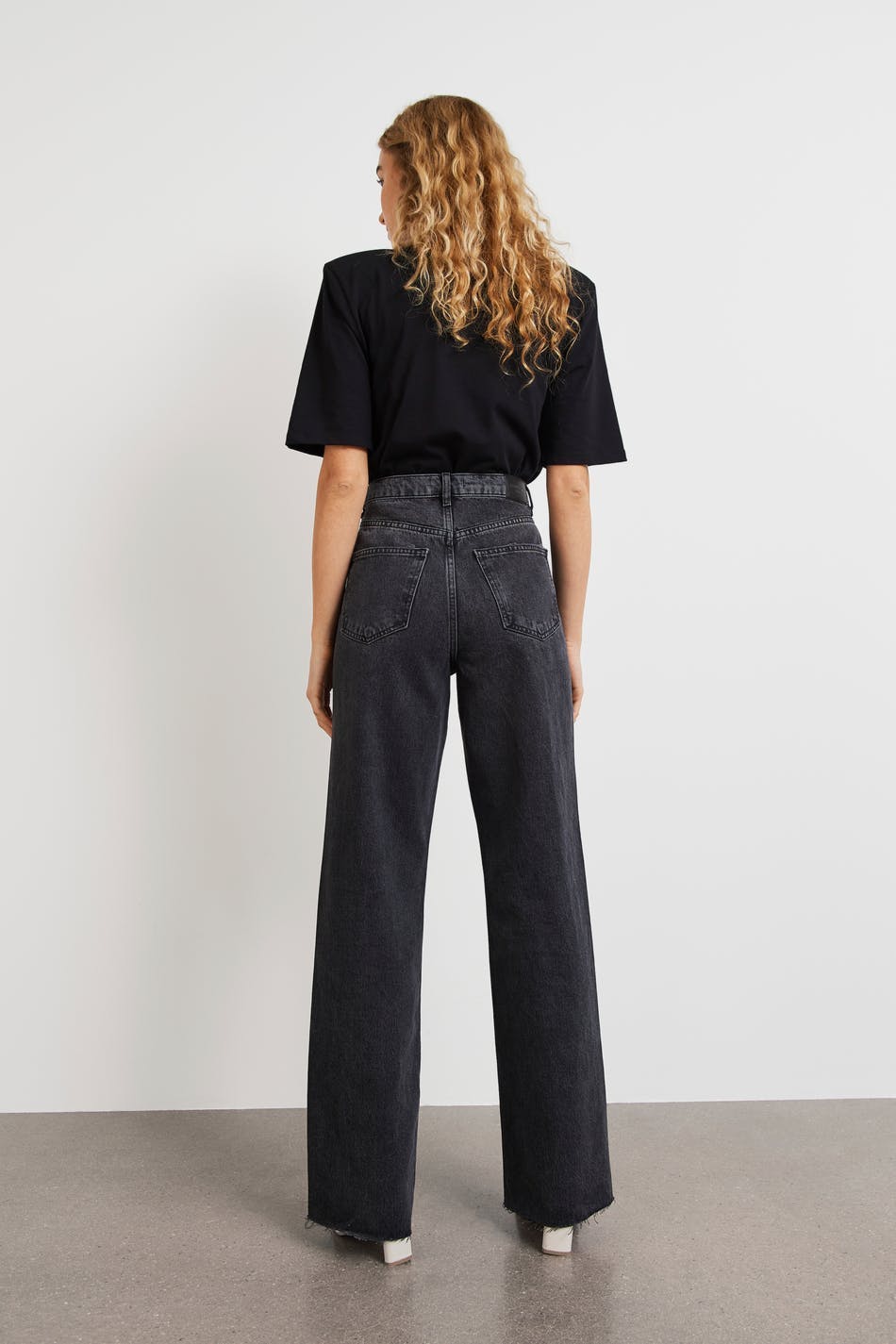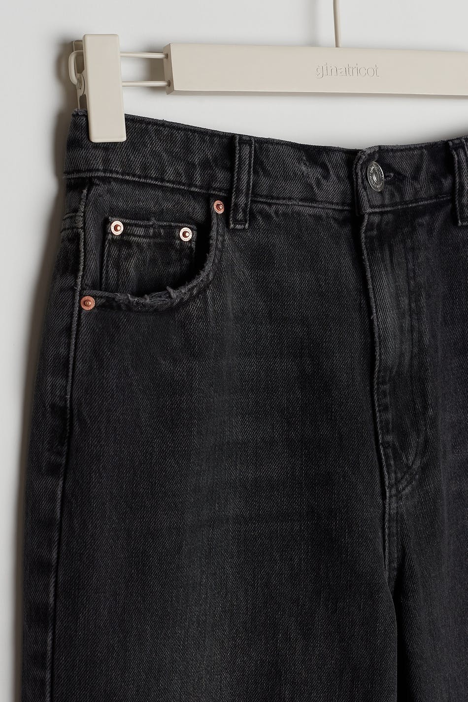 Straight jeans utan stretch med superhög midja. Jeansen är svarta och har raka, vida byxben med fullängd. De har dragkedjegylf och rå kant vid bensluten. Jeansen kan enkelt klippas av till önskad längd. Se gärna vår storleksguide för att hitta din storlek.