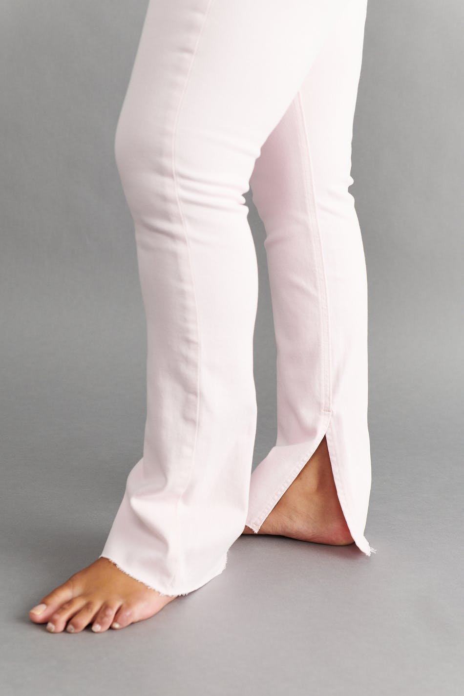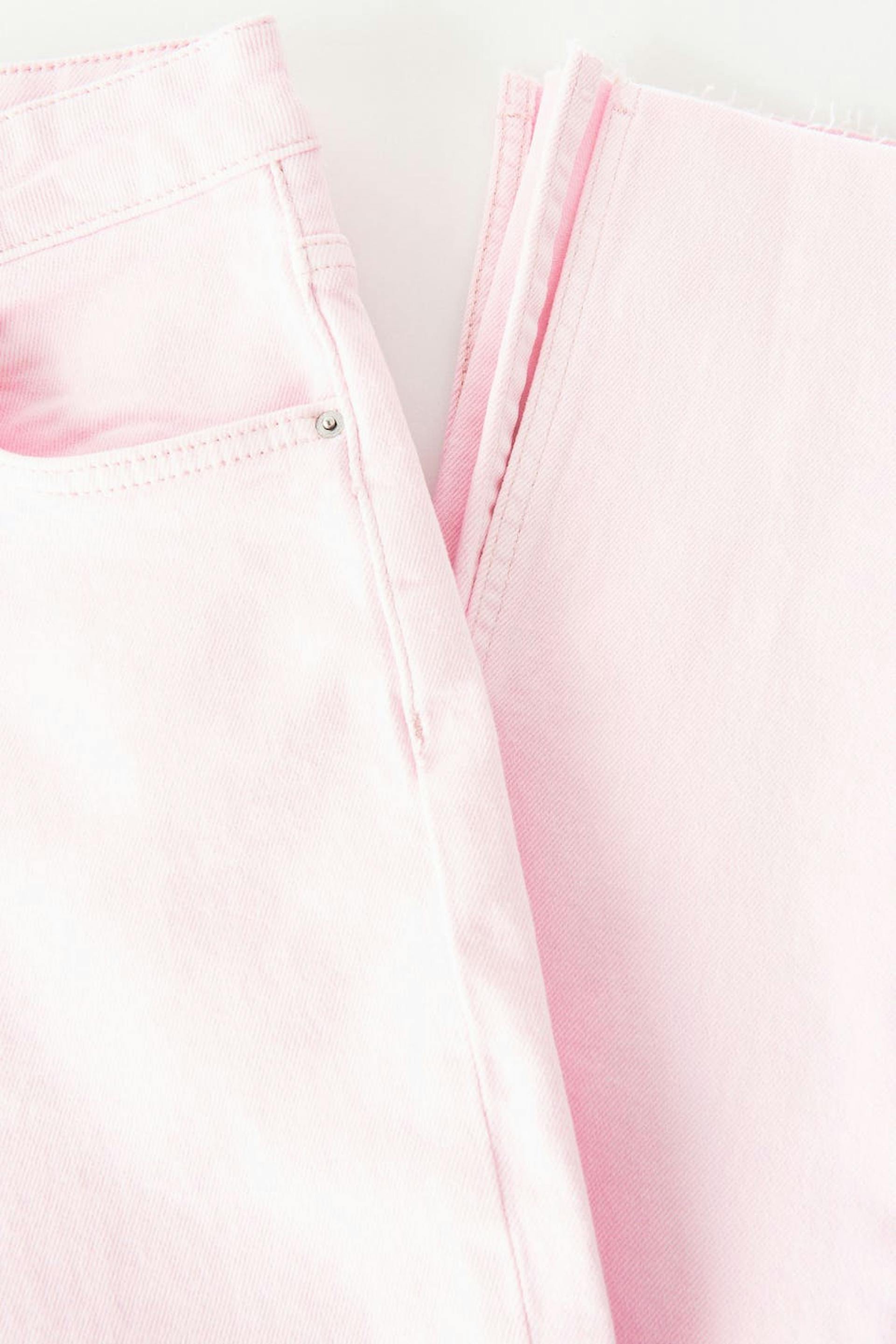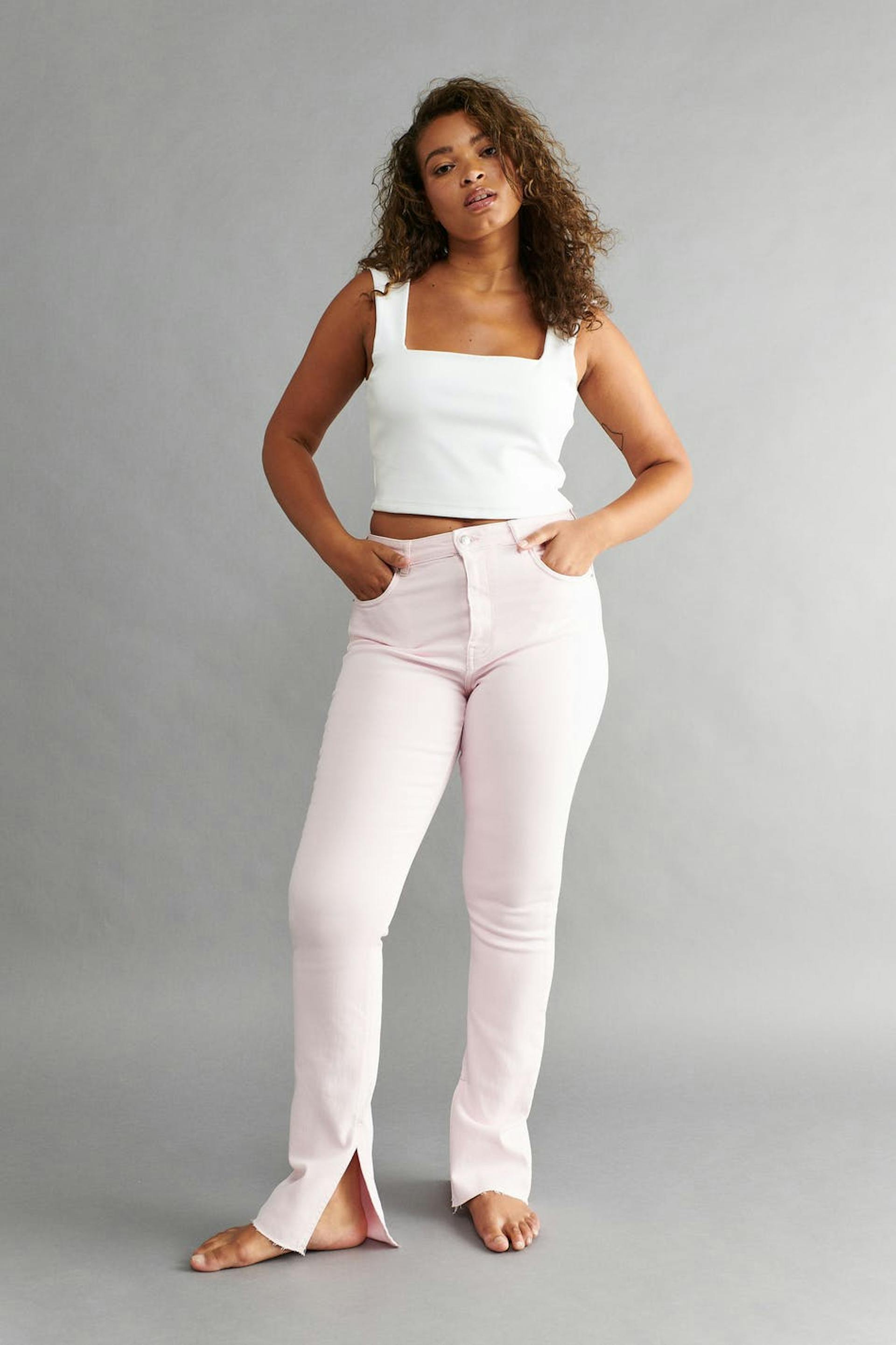 Slim jeans med hög midja i denim med låg stretch. Jeansen är rosa och har raka ben med fullängd. De har slits vid bensluten, dragkedjegylf och fickor fram och bak. Se gärna vår storleksguide för att hitta din storlek.
