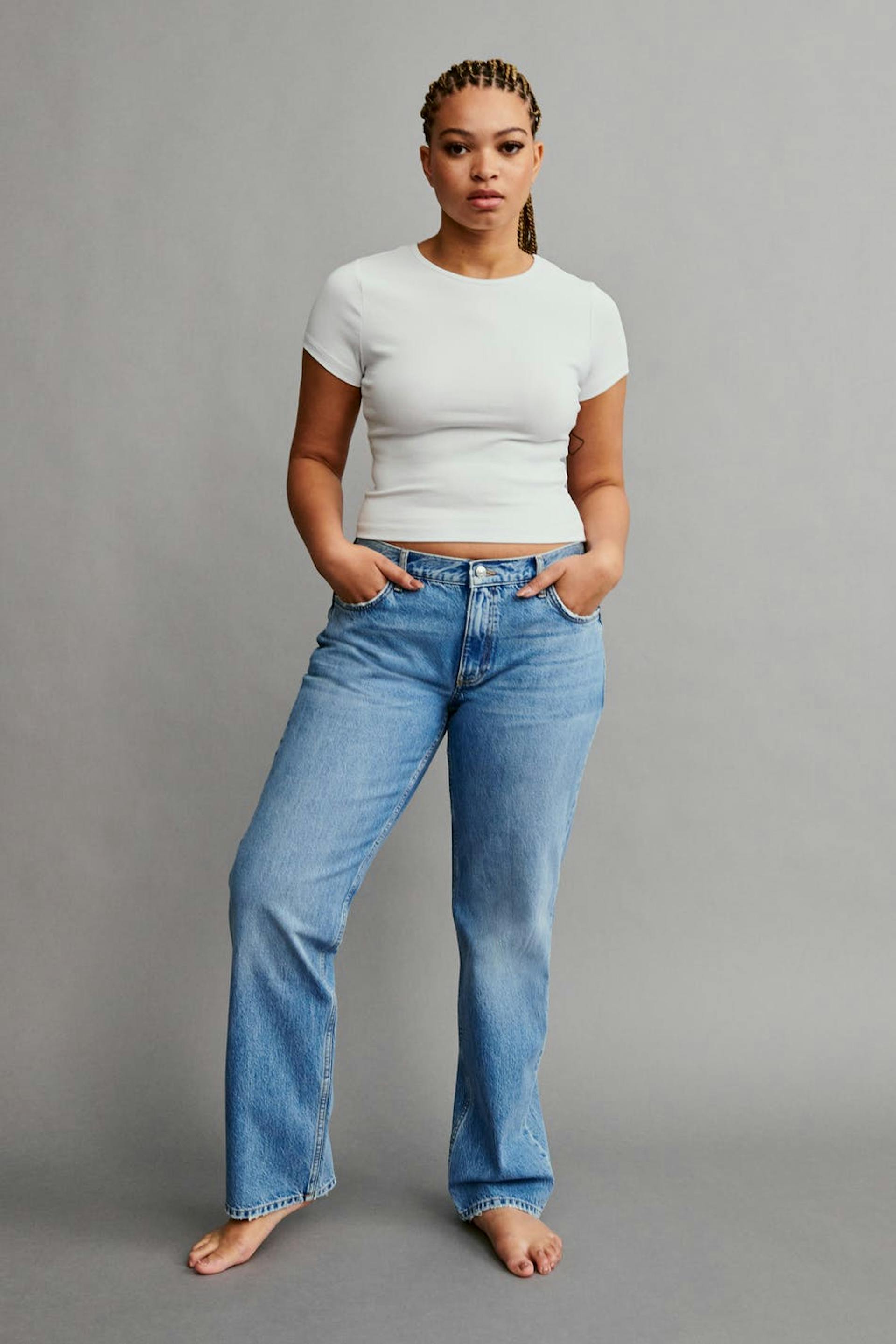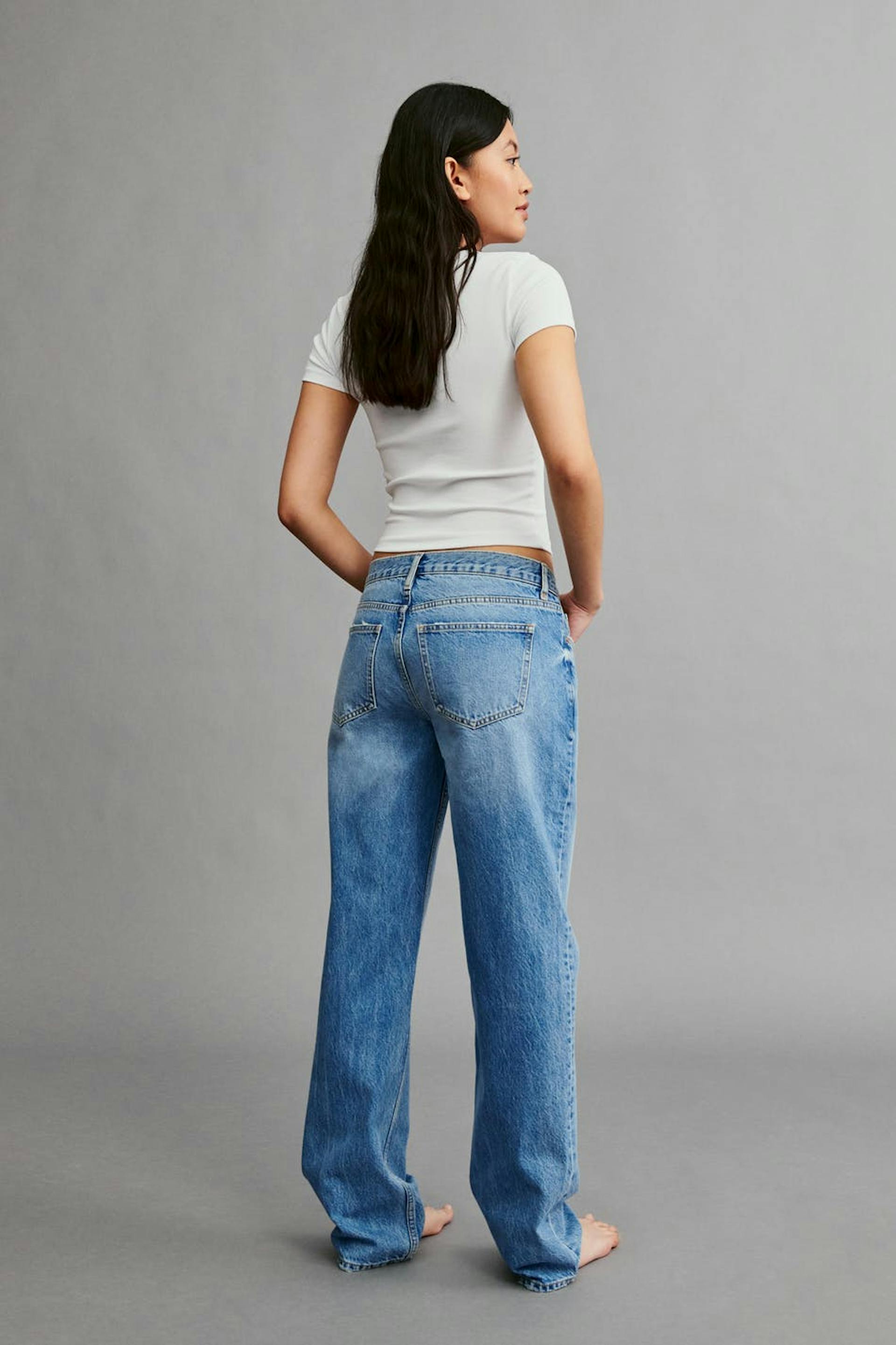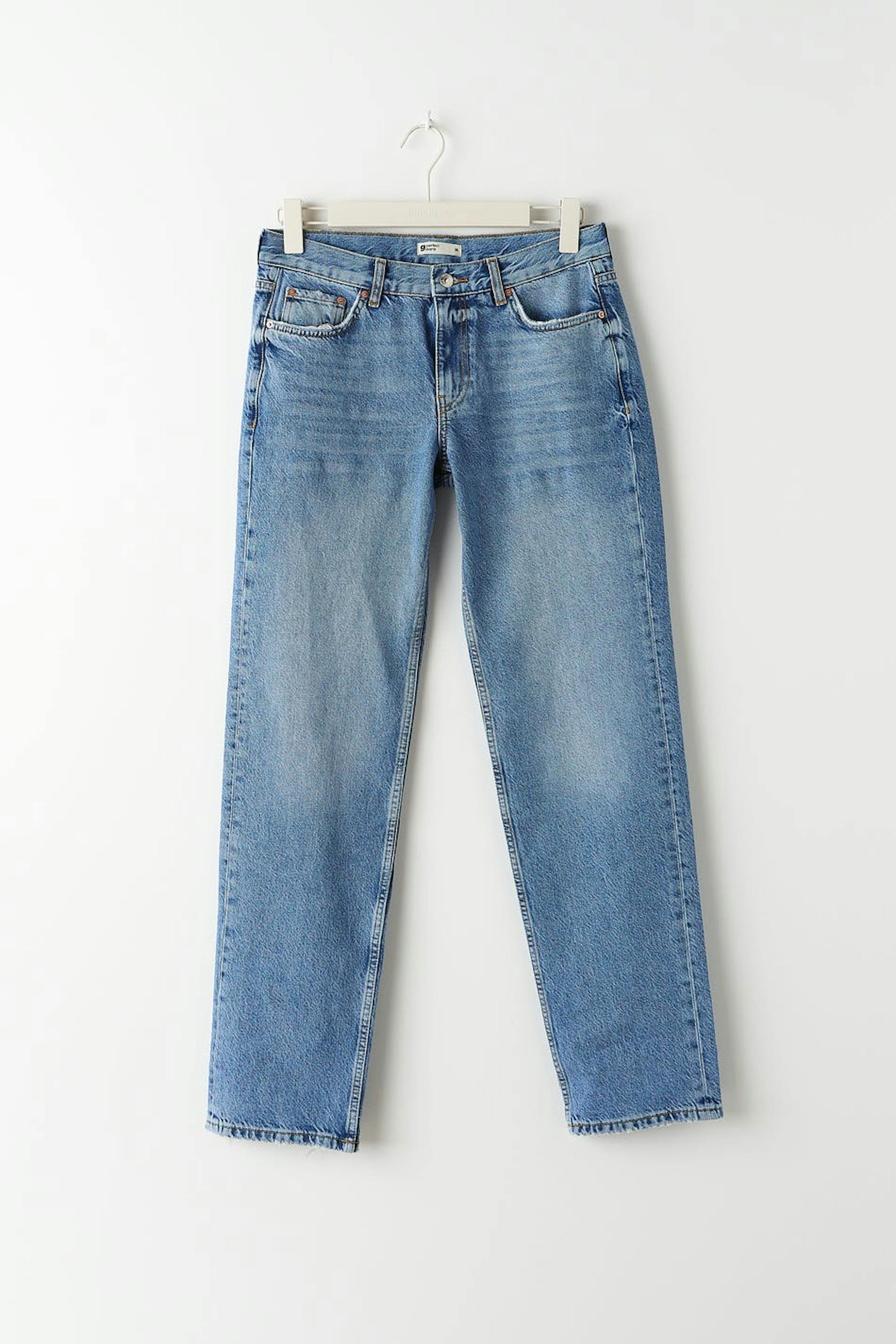 Straight jeans med en normal passform. Jeansen är blåa och har låg midja. De har en boyfriend passform i denim utan stretch, dragkedjegylf och raka ben med normal längd. Se gärna vår storleksguide för att hitta din storlek.