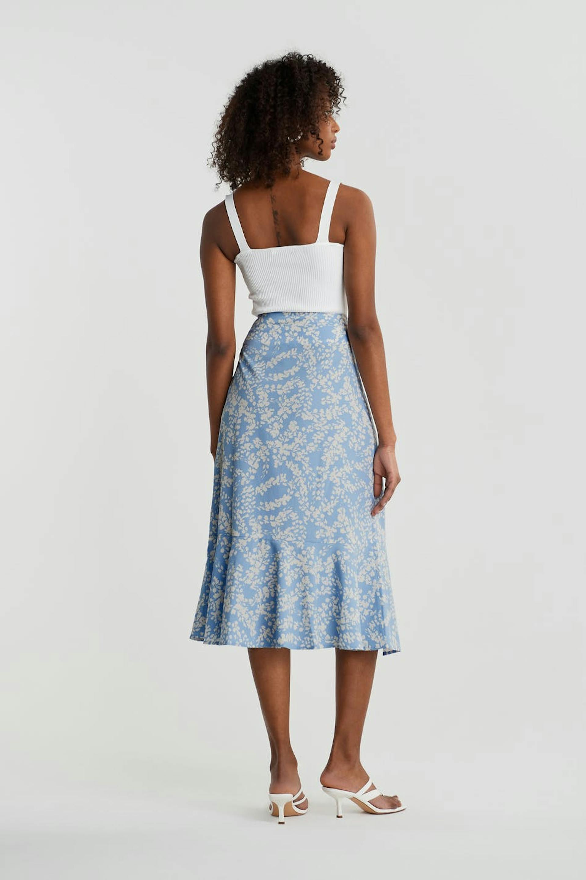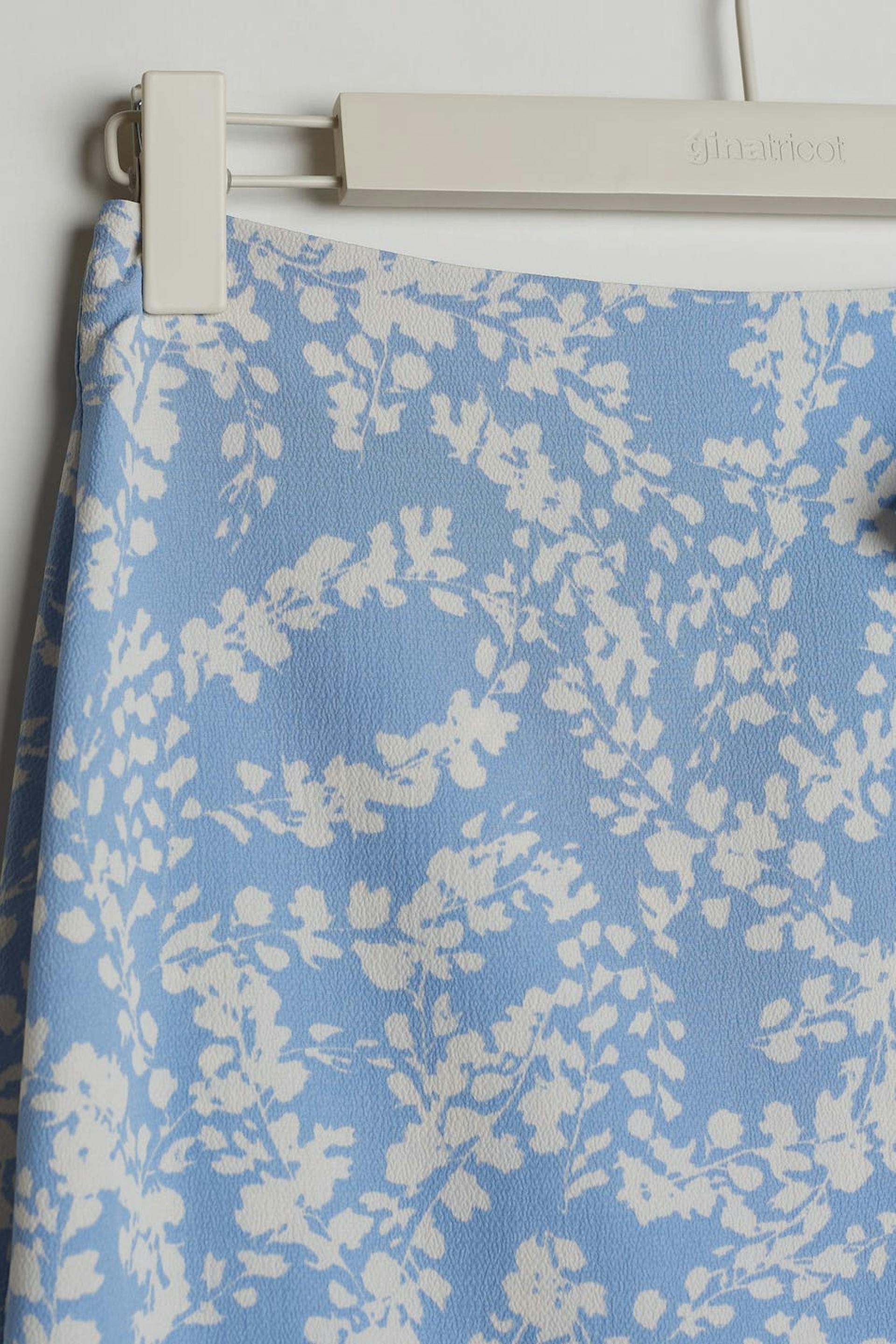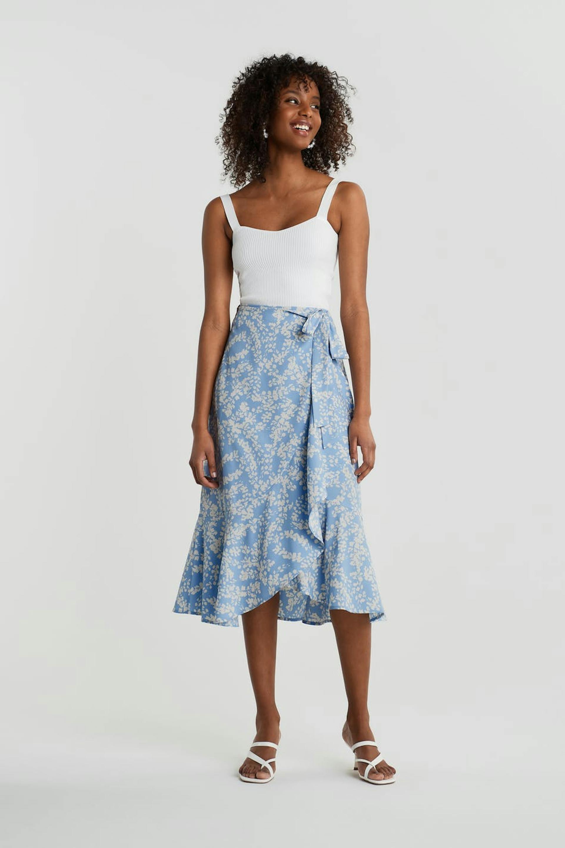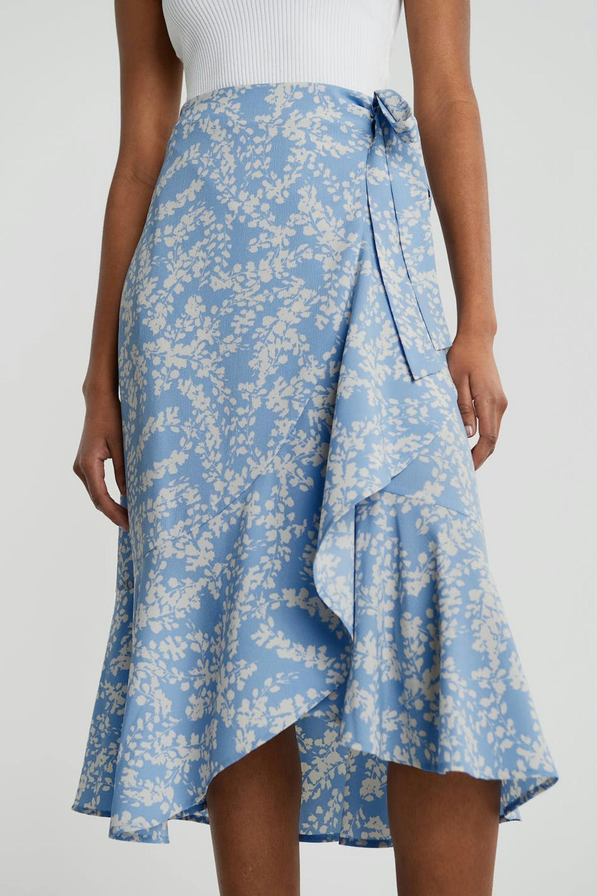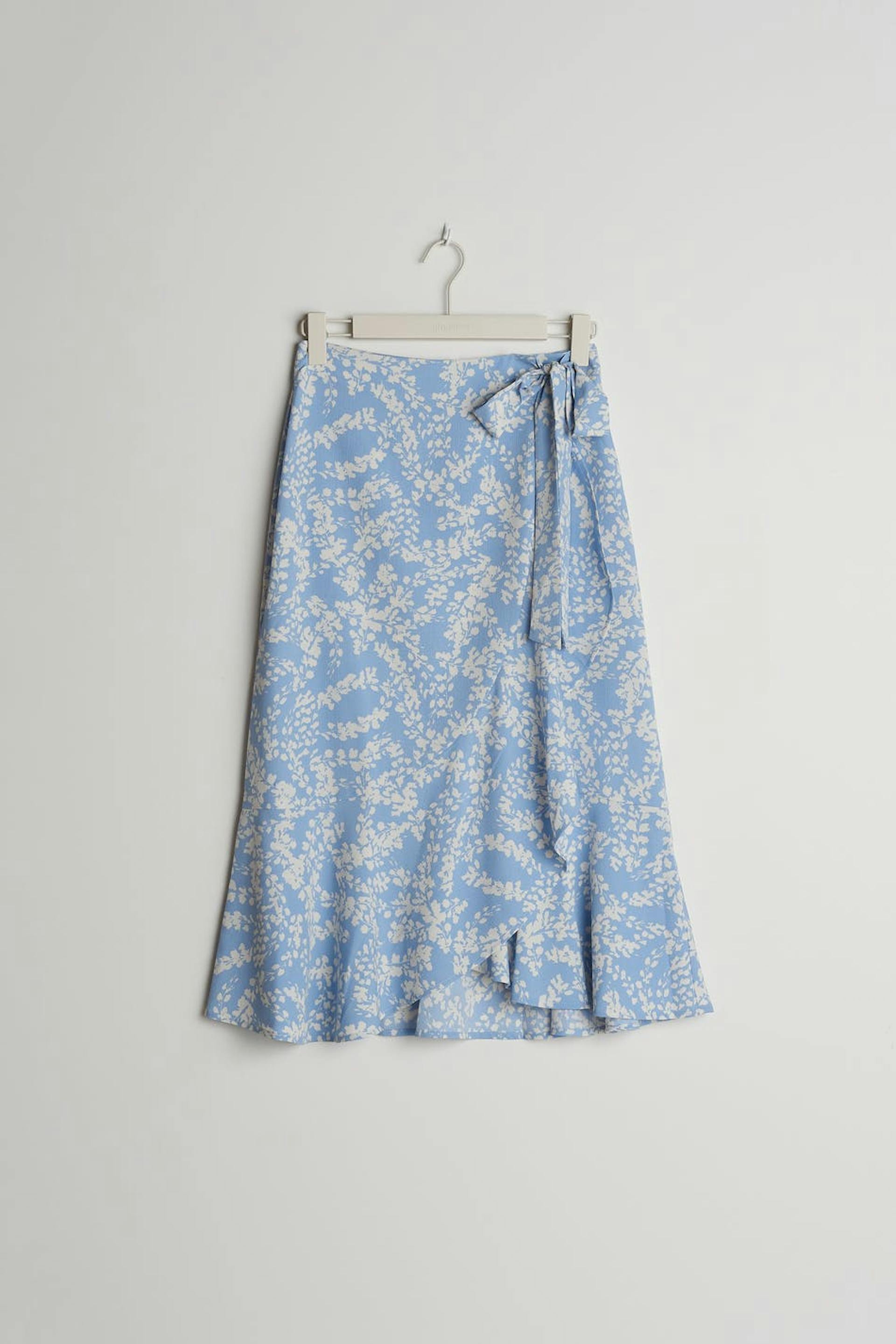 Blommönstrad omlottkjol med en knytning på ena sidan. Kjolen är ljusblå och vit och har volanger vid fållen. Den har en midilängd och en satinliknande material.
