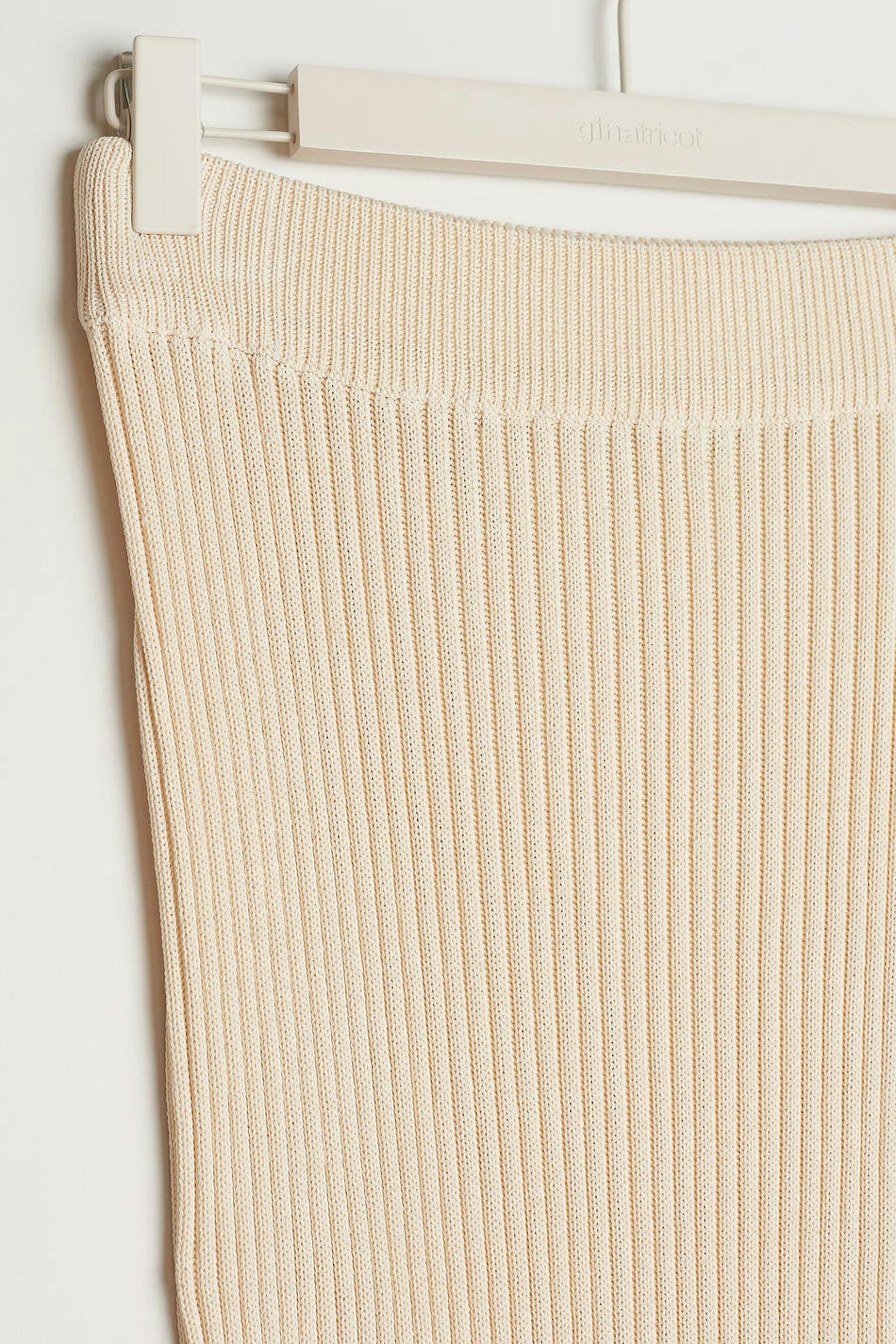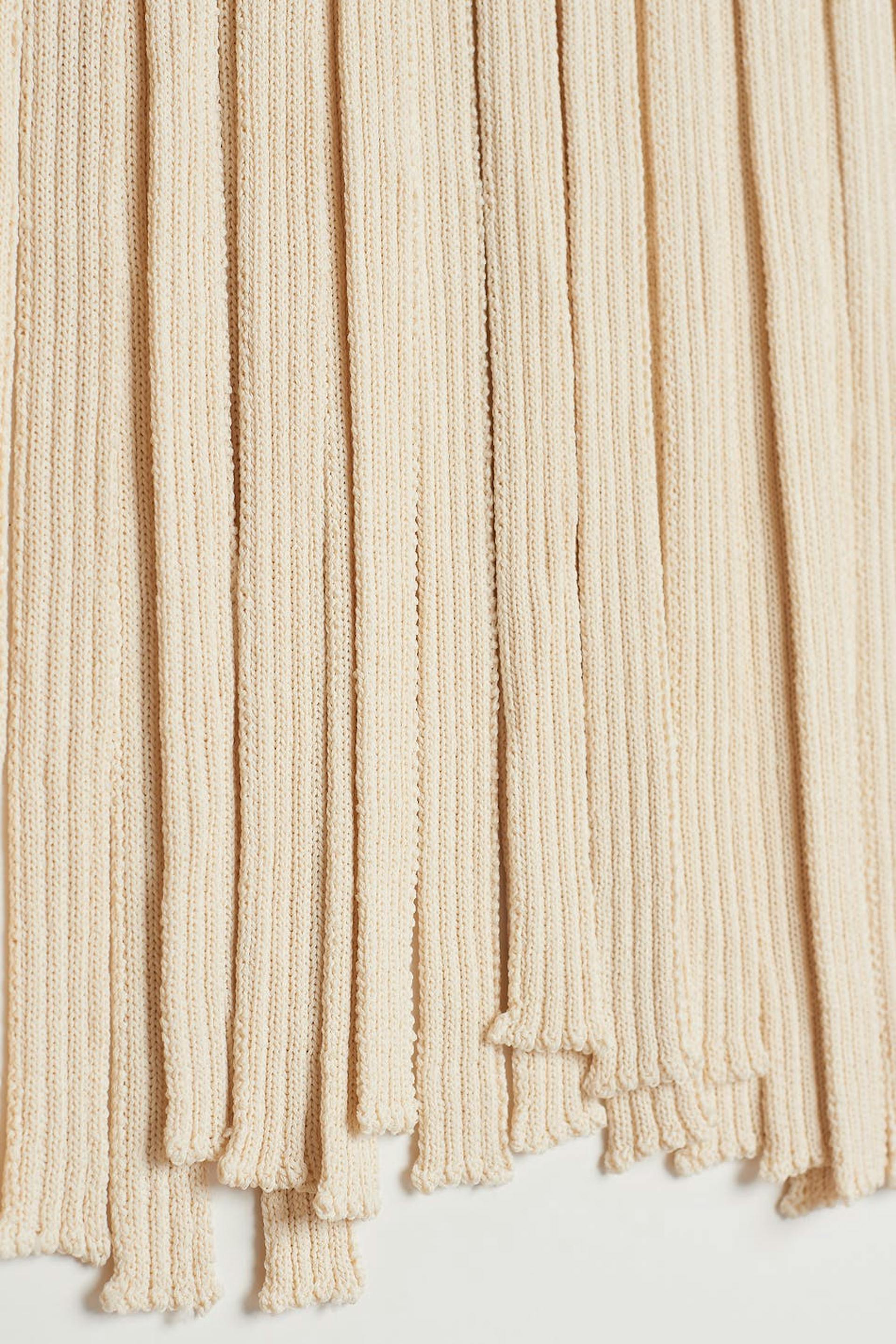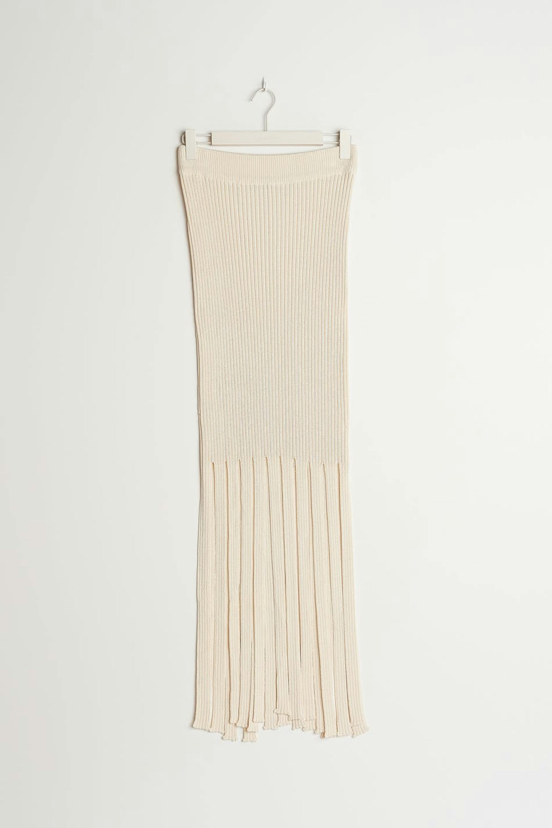 Stickad kjol med figurnära passform. Kjolen är beige, lång och ribbad. Den har långa fransar på nederfållen och en mjuk resår i midjan.