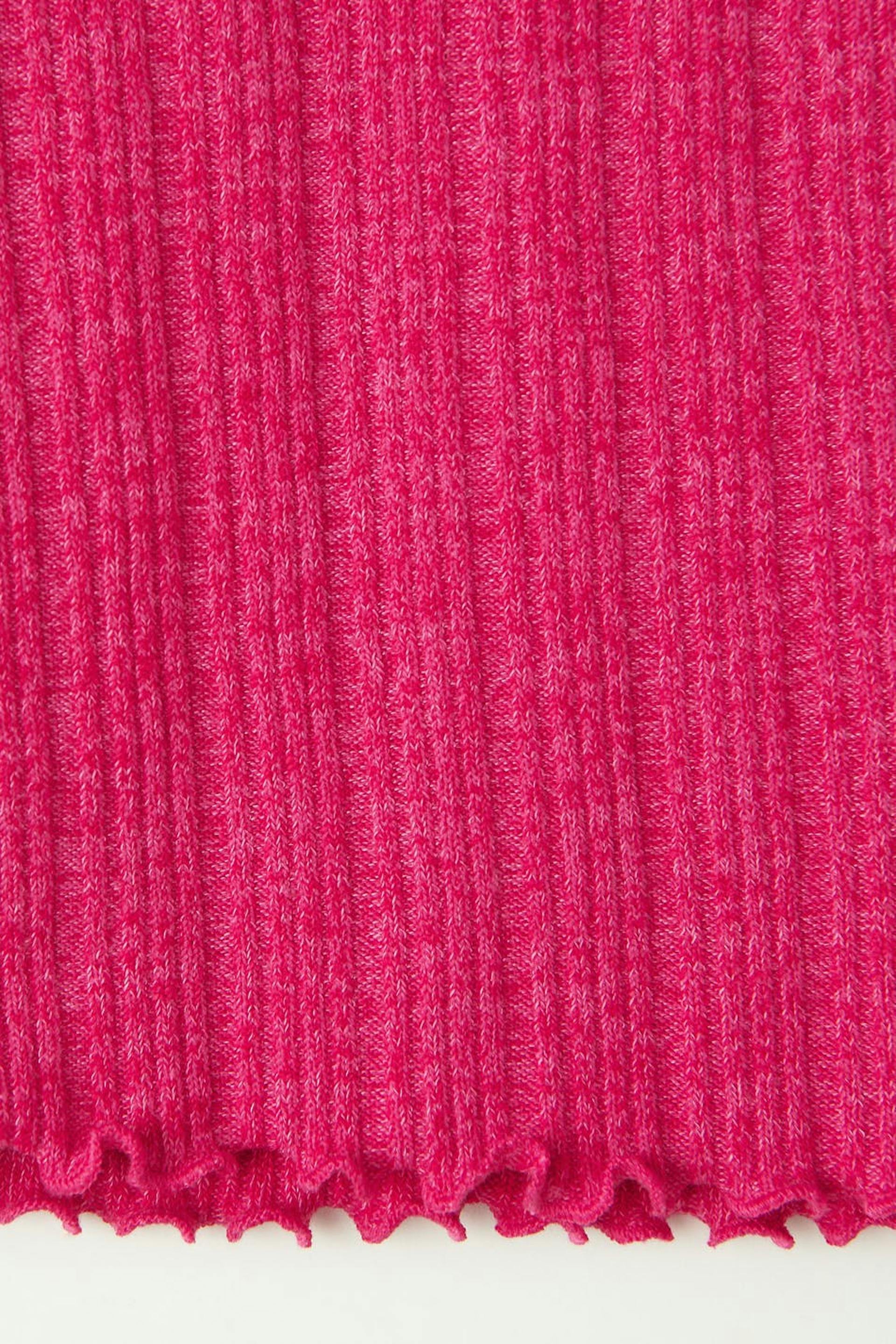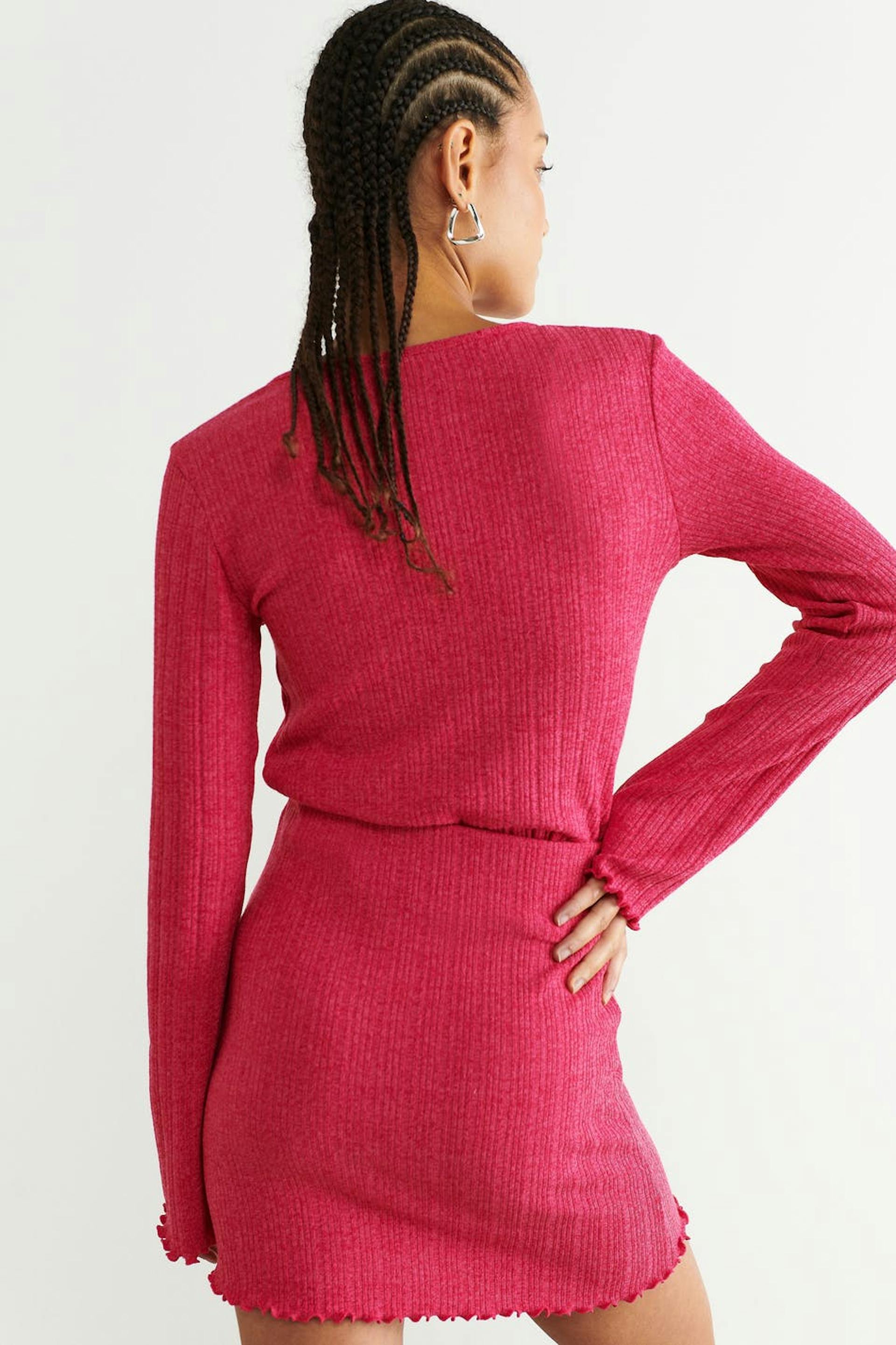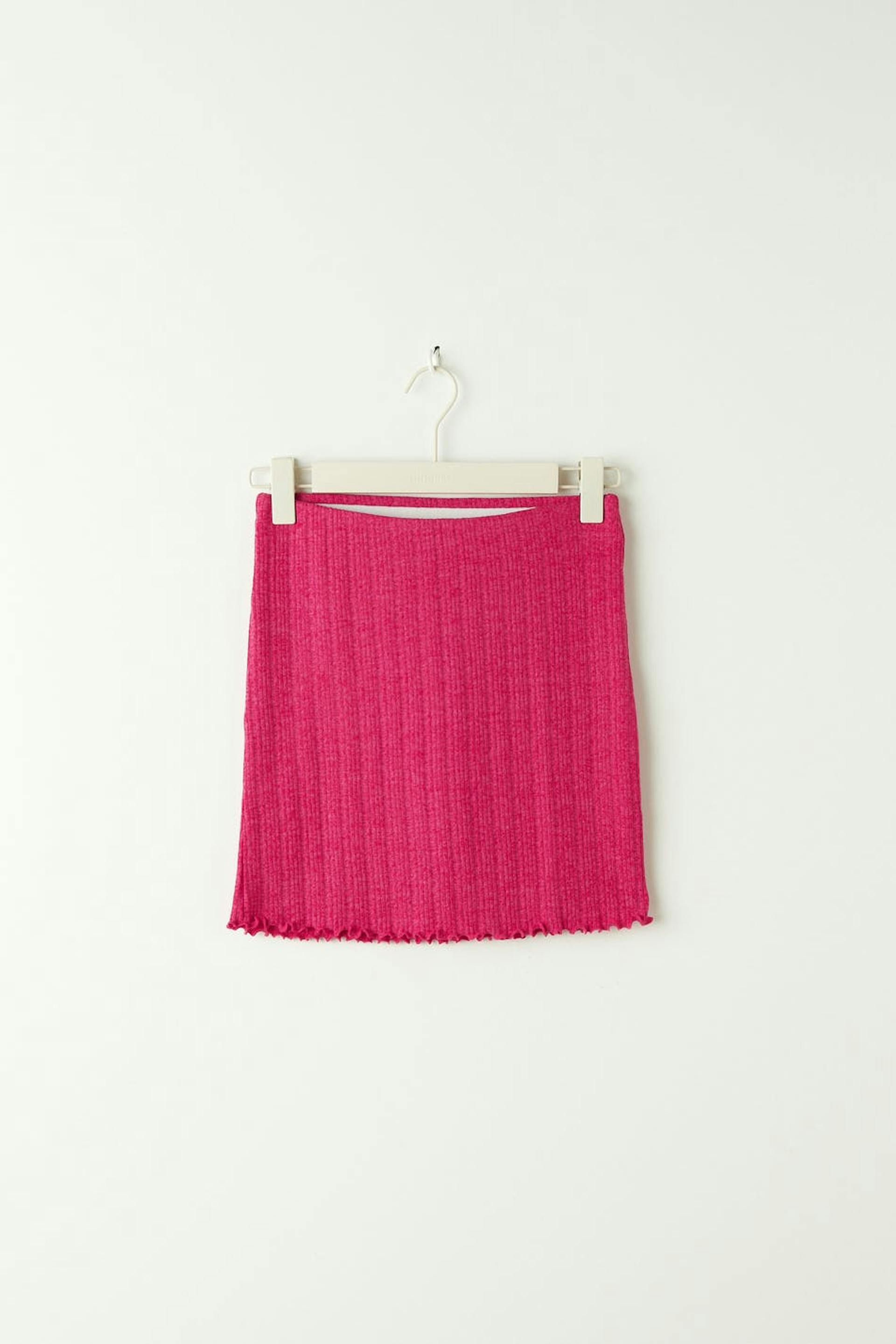 Minikjol i trikå med figurnära passform. Kjolen är rosa och har en lockad fåll nedtill.