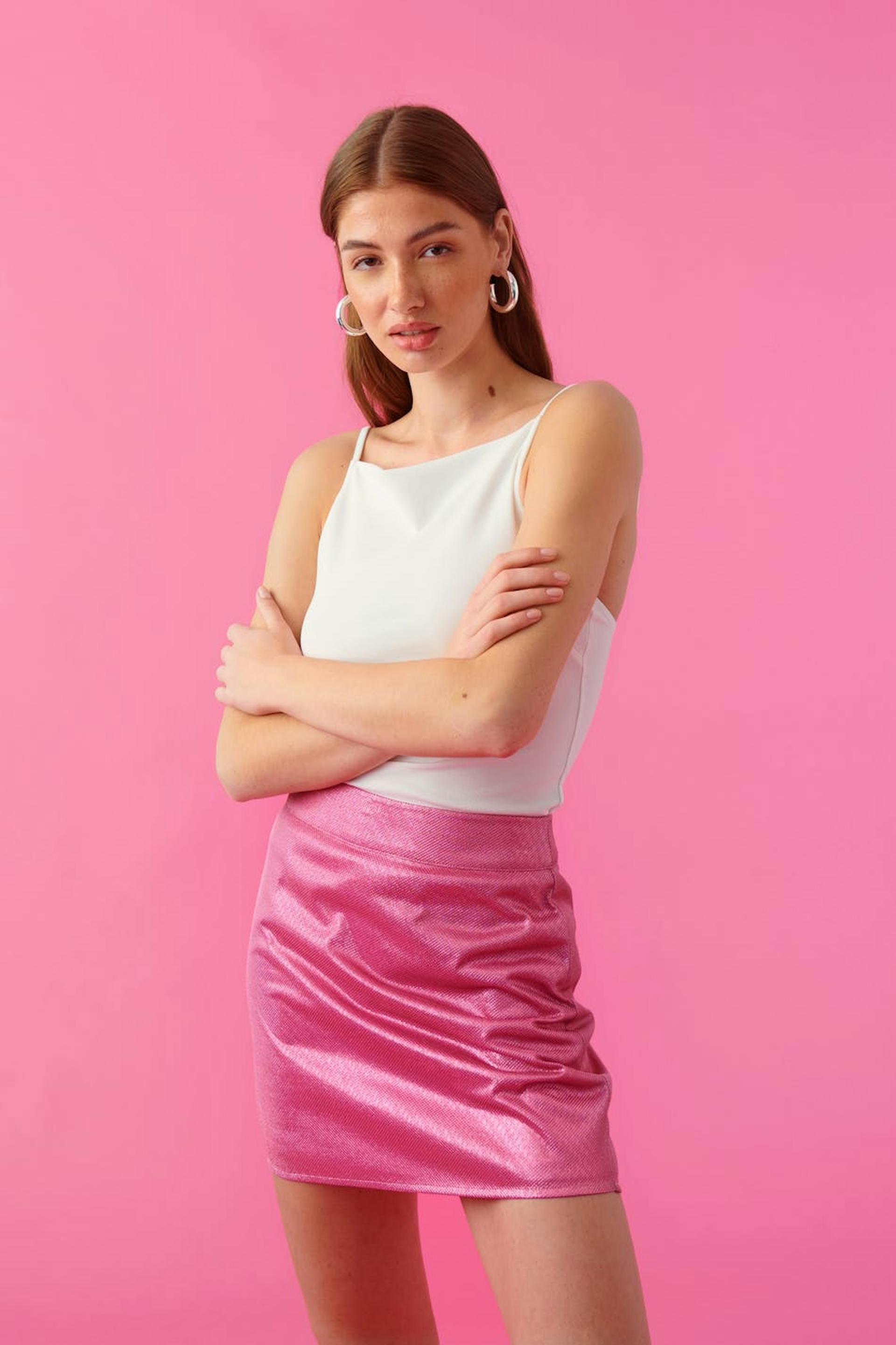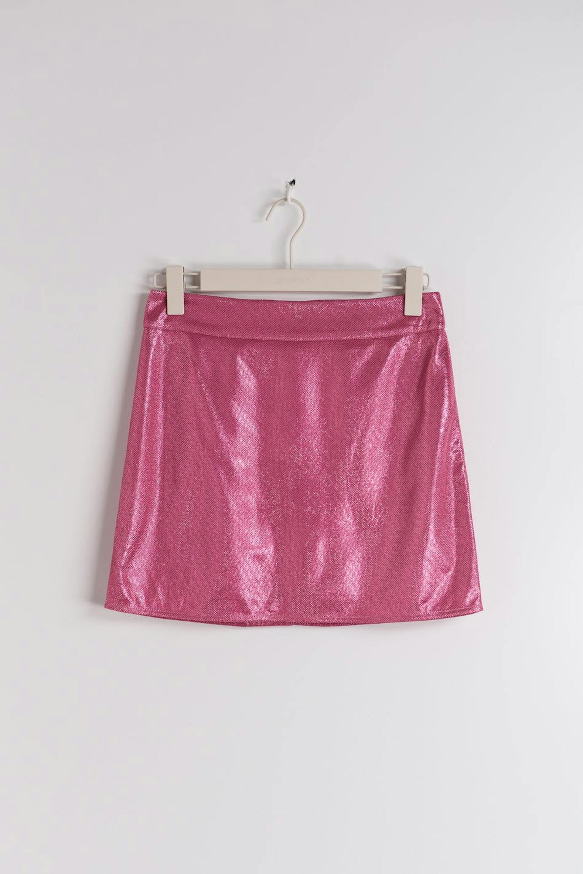 Kort kjol med dragkedja bak. Kjolen är rosa och har ett glansigt material.