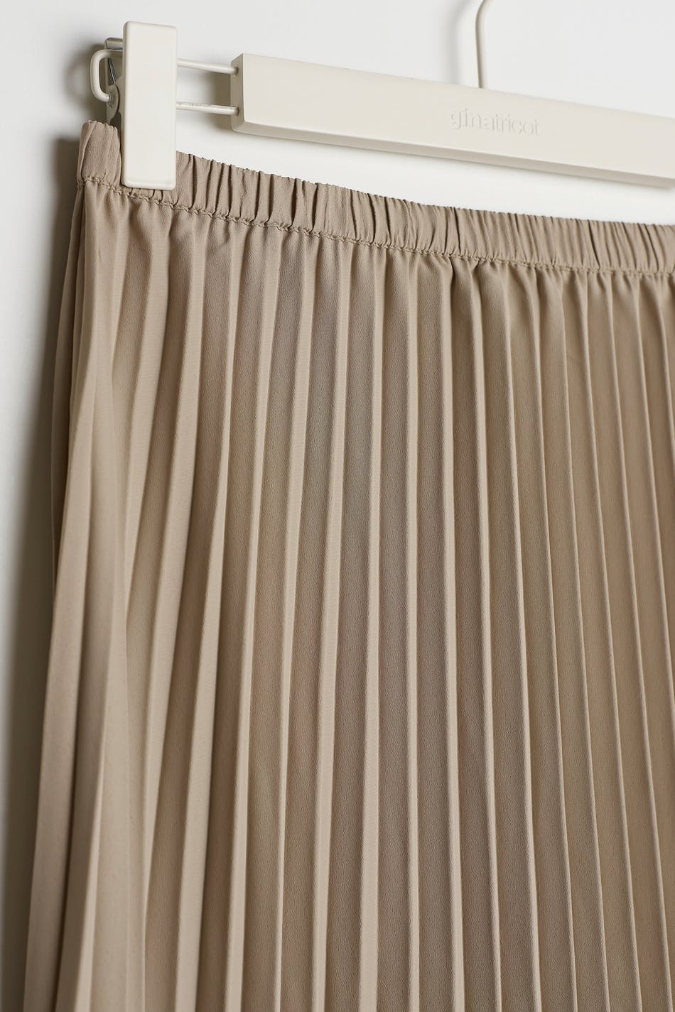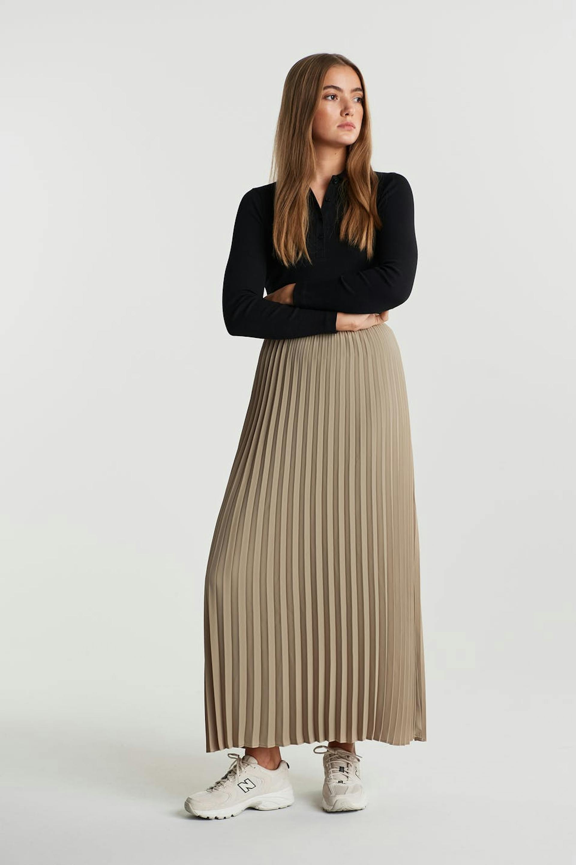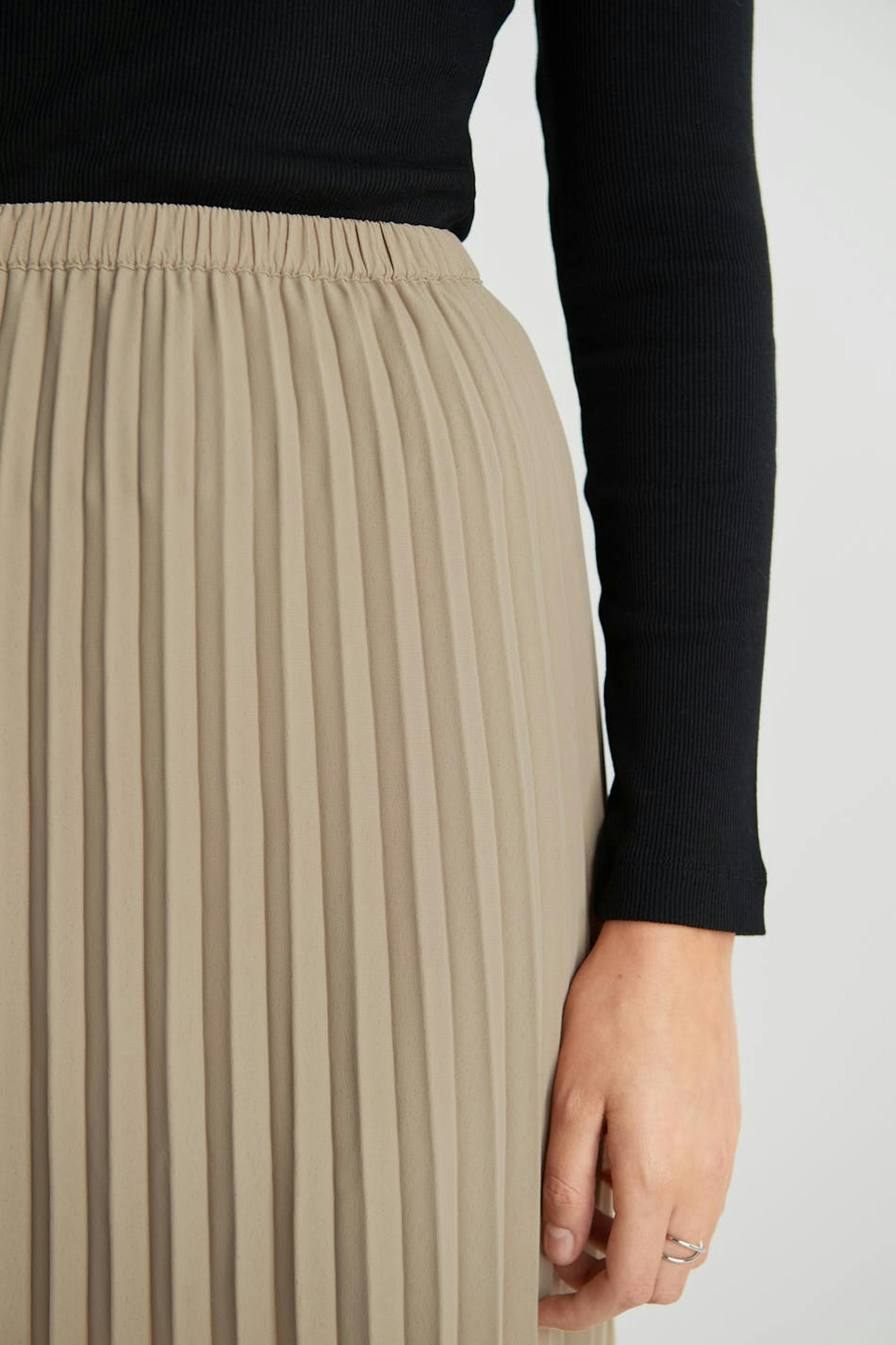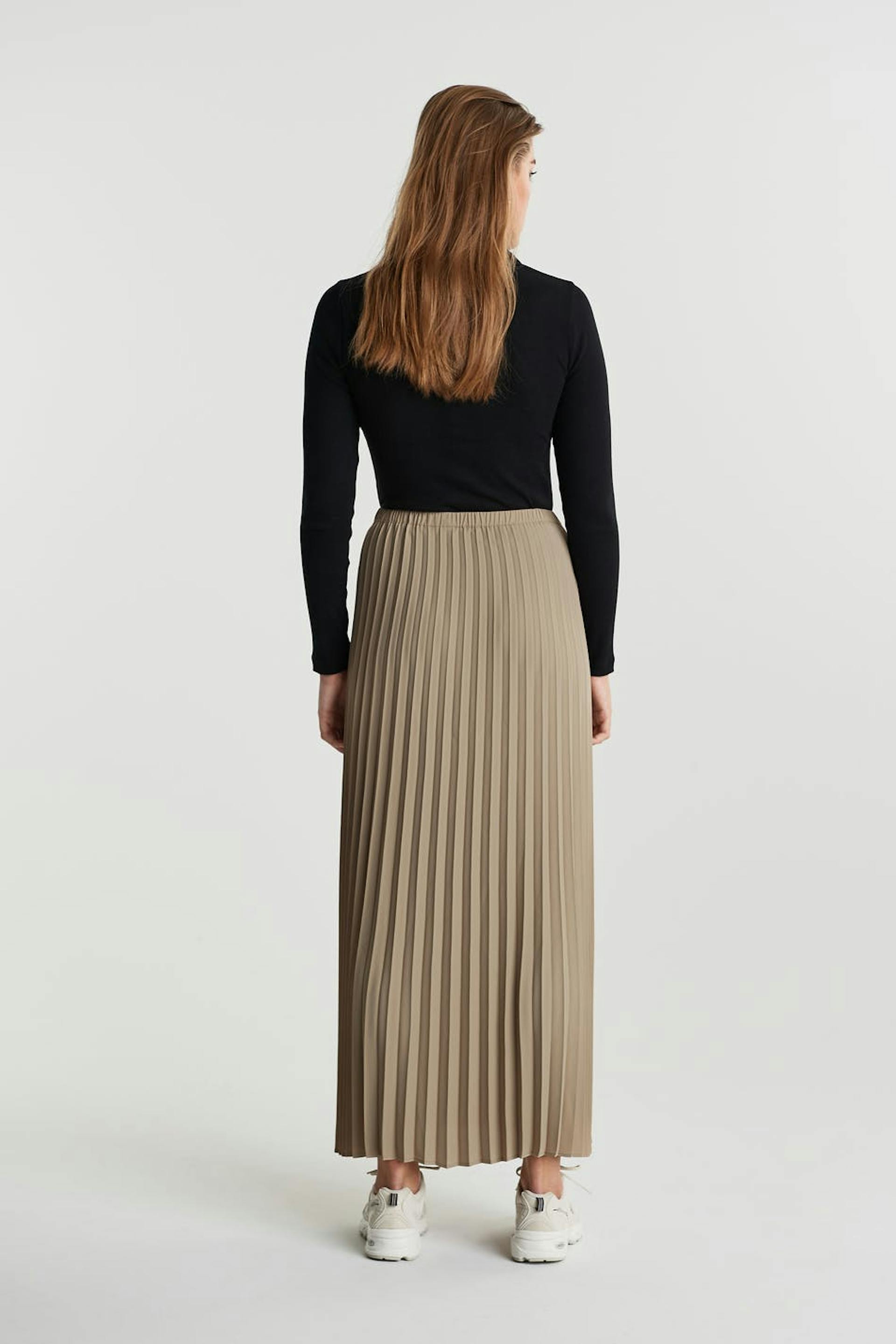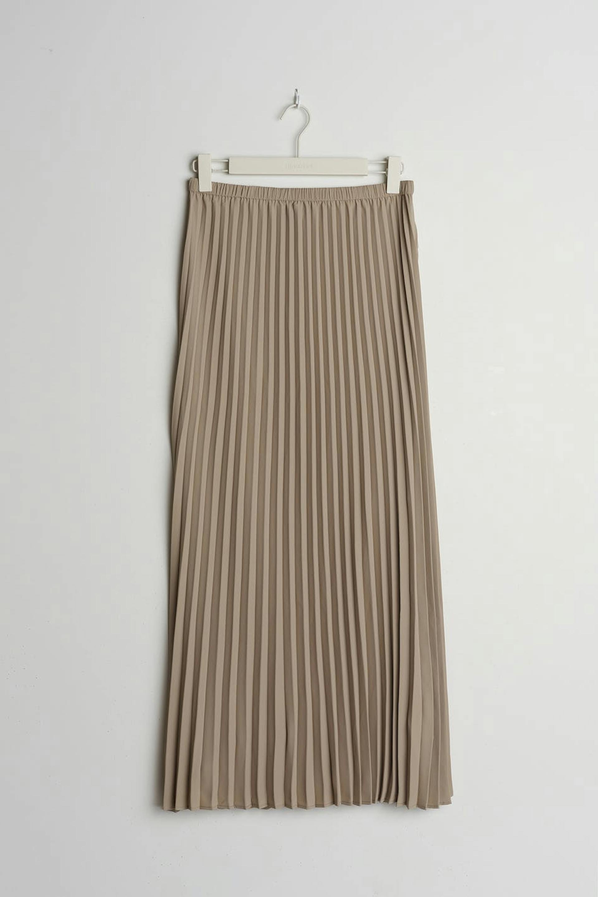 Plisserad kjol med en maxi-längd. Kjolen är beige och har en resår i midjan.