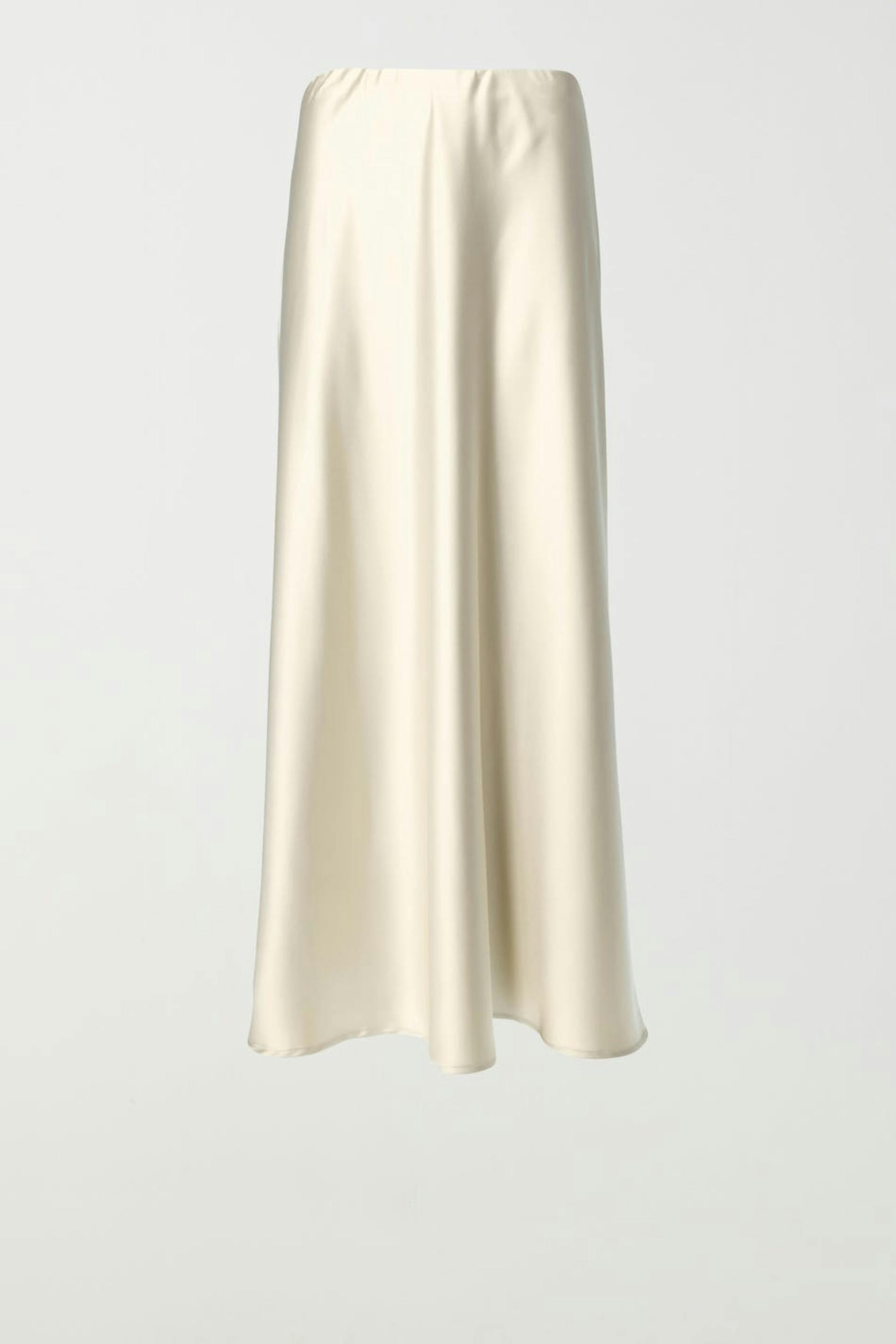 Långkjol i satin med resår i midjan. Kjolen är beige och har en mjuk, glansig kvalitet.