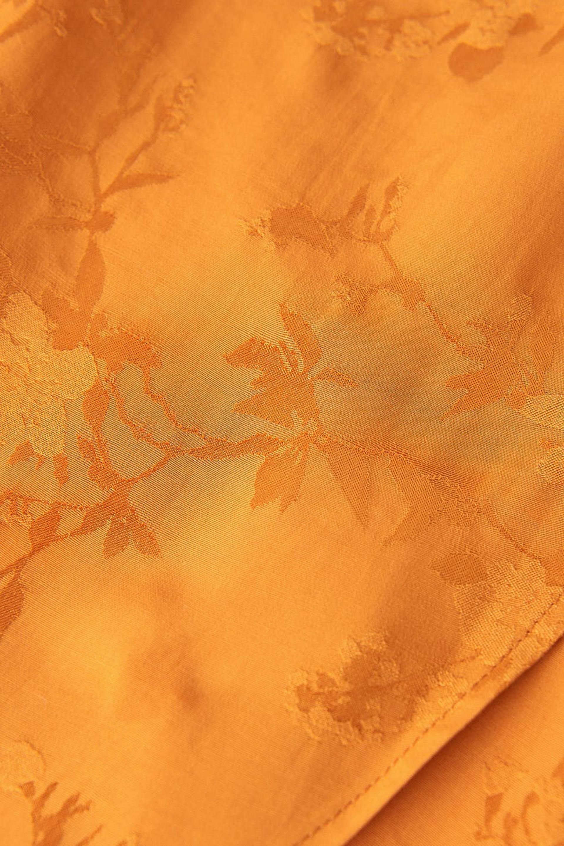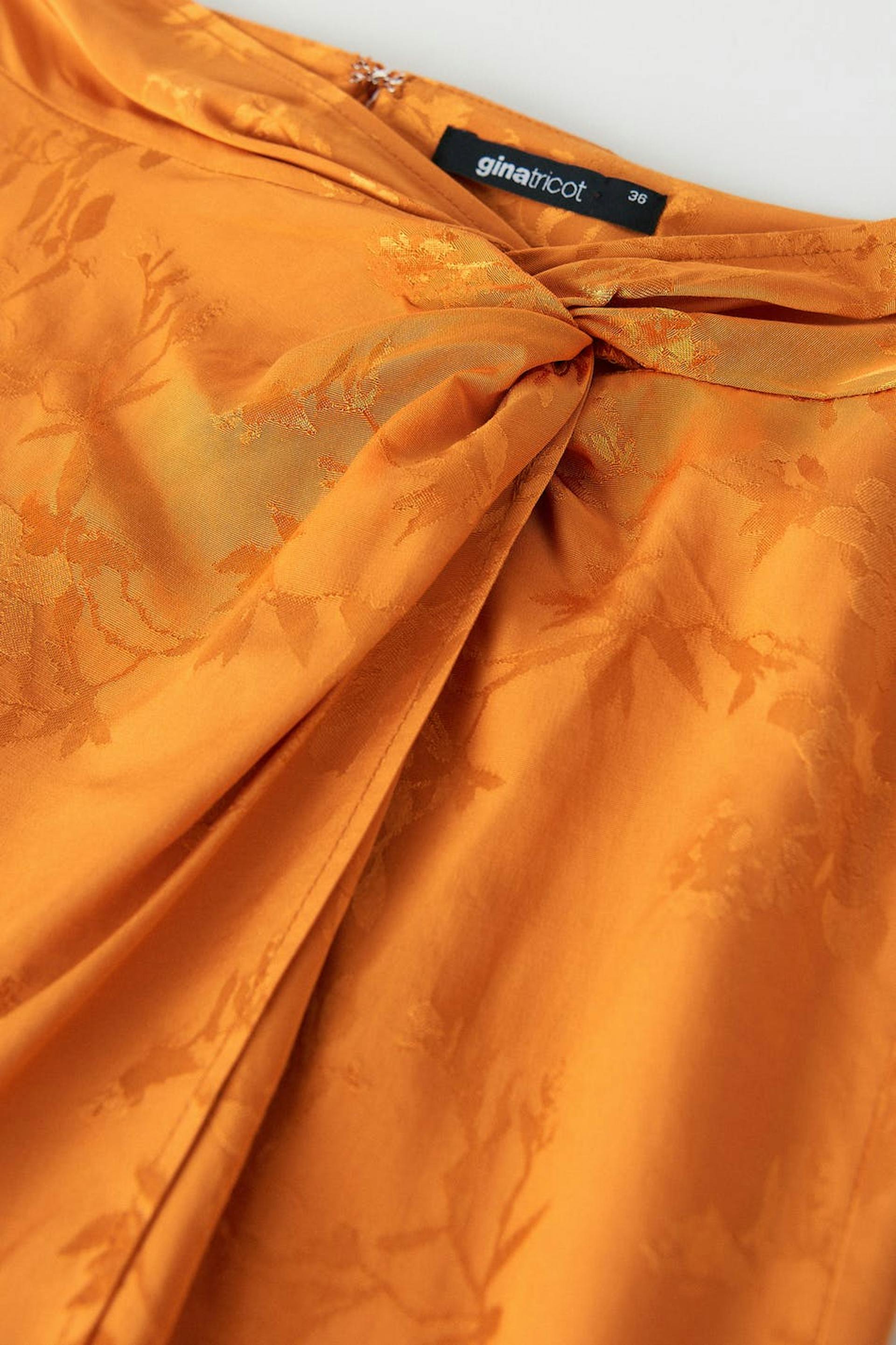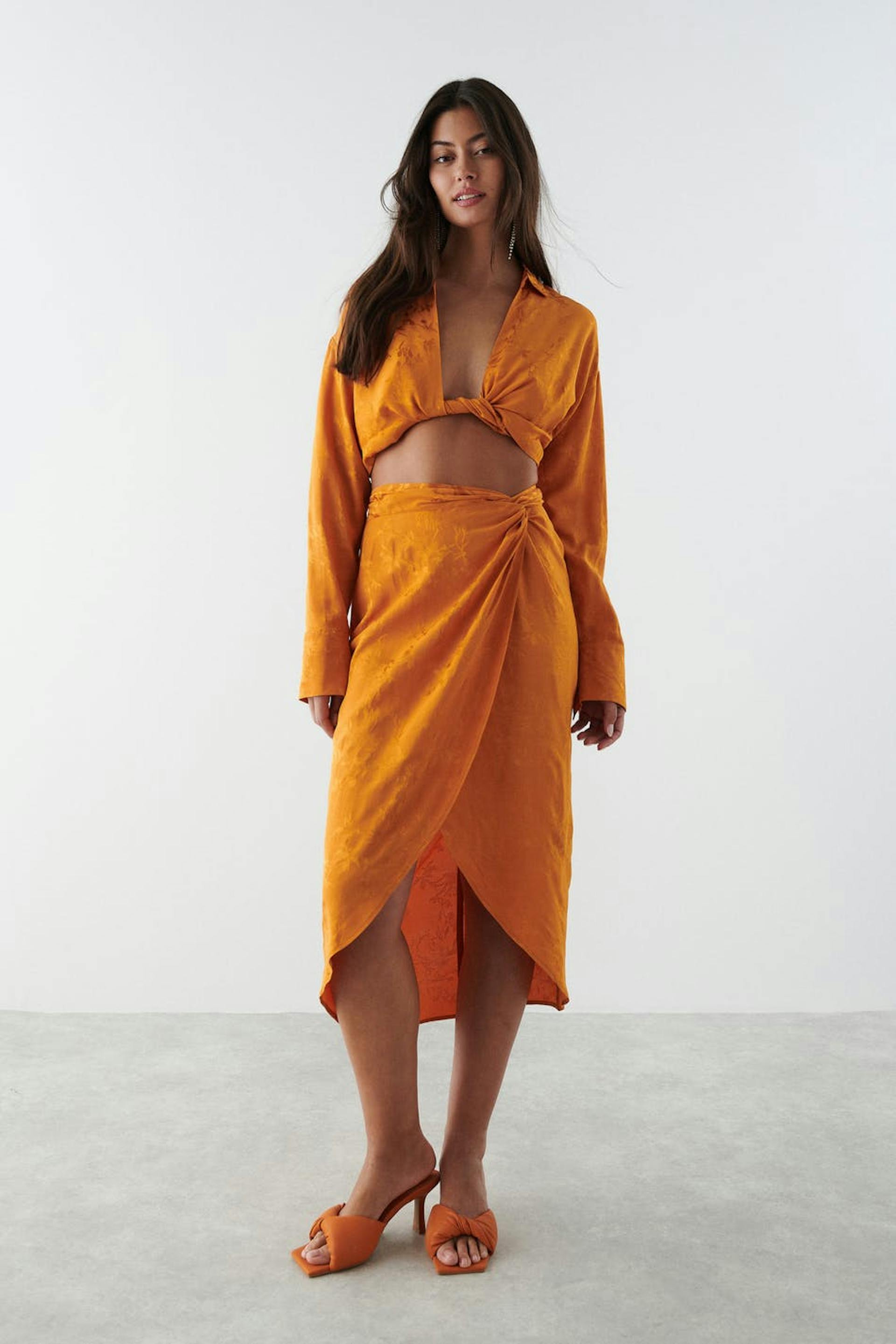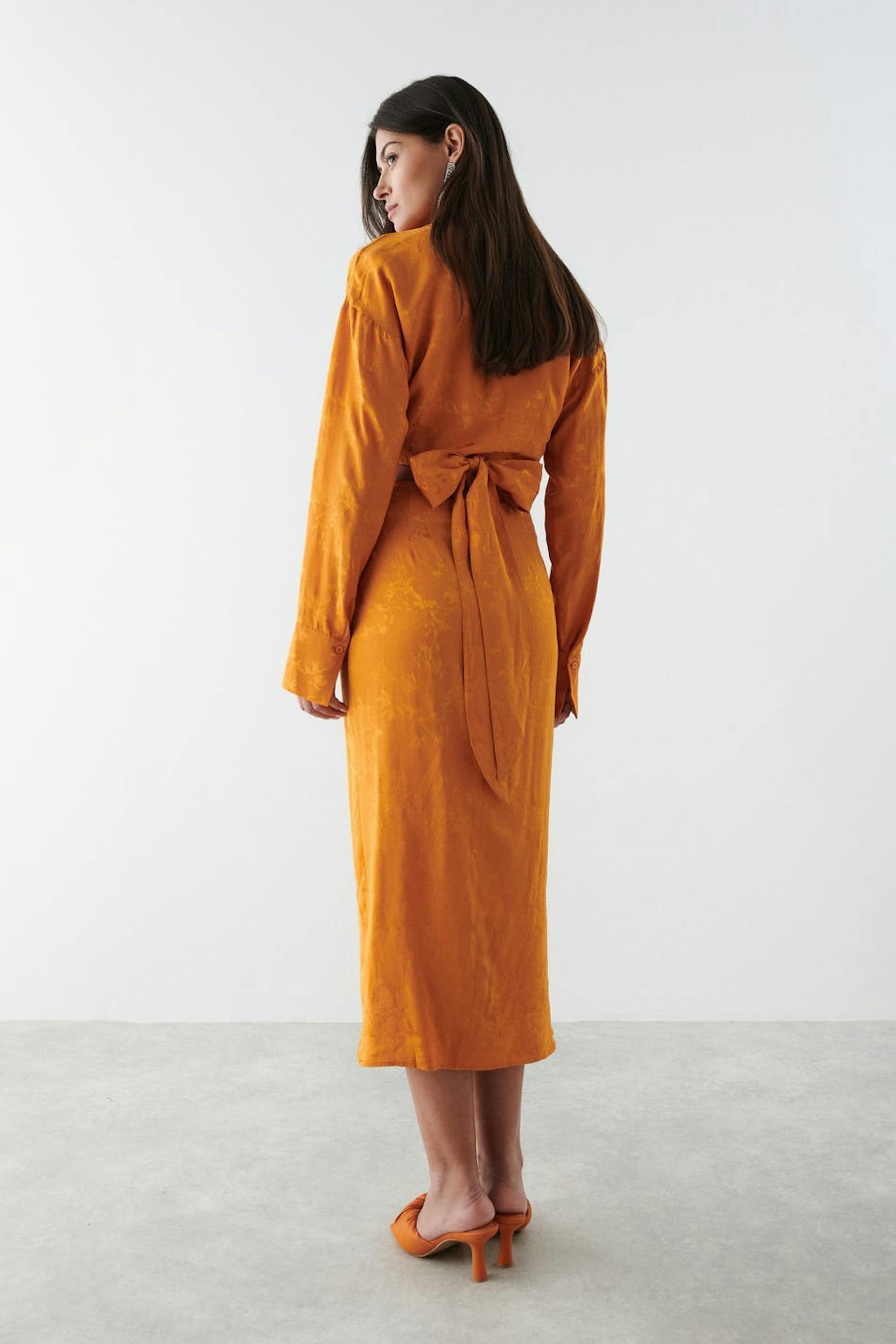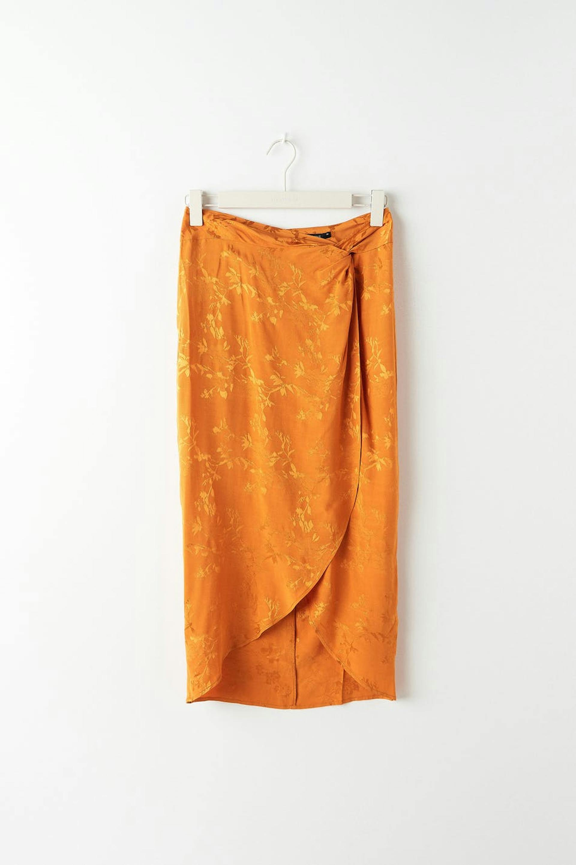Omlottkjol med en knytdetalj i midjan. Kjolen är orange och har en mjuk kvalitet. Den har en dragkedjestängning baktill, ett glänsande mönster och en midilängd.