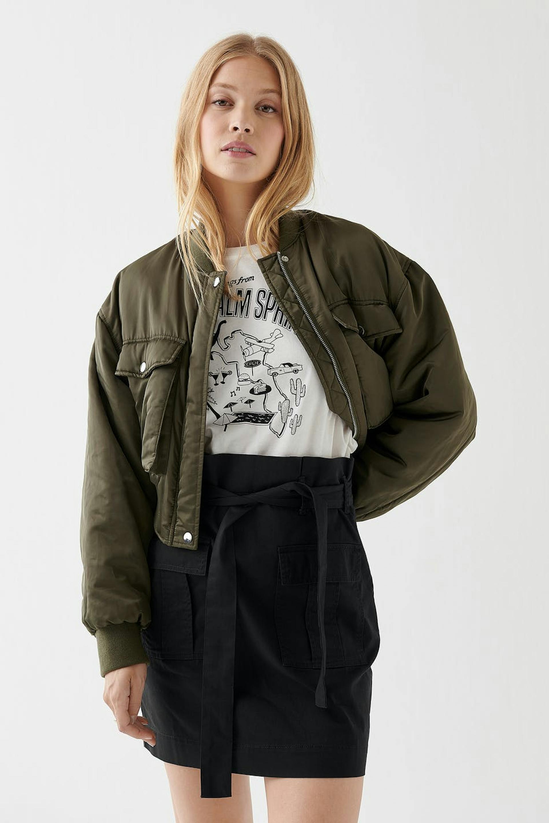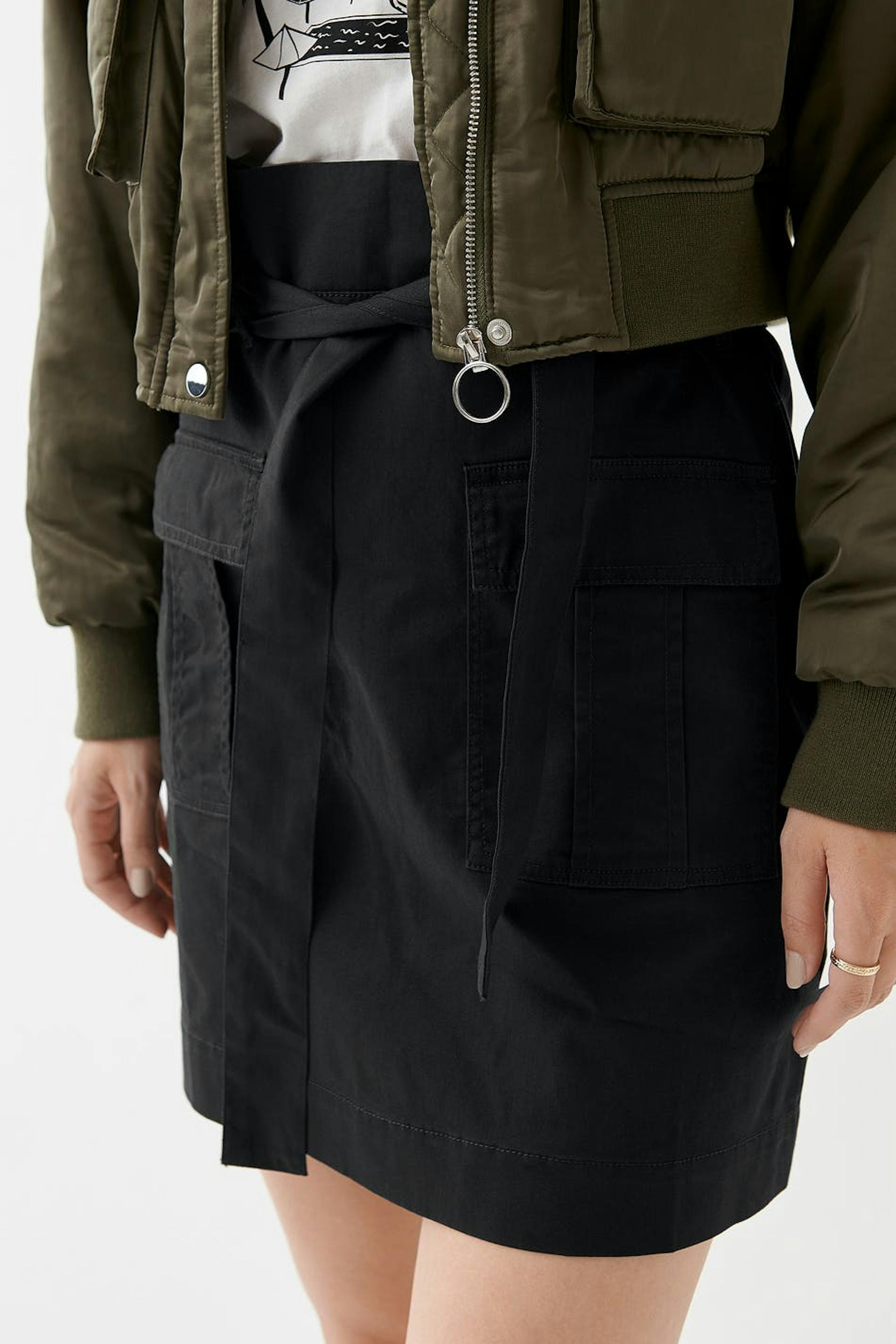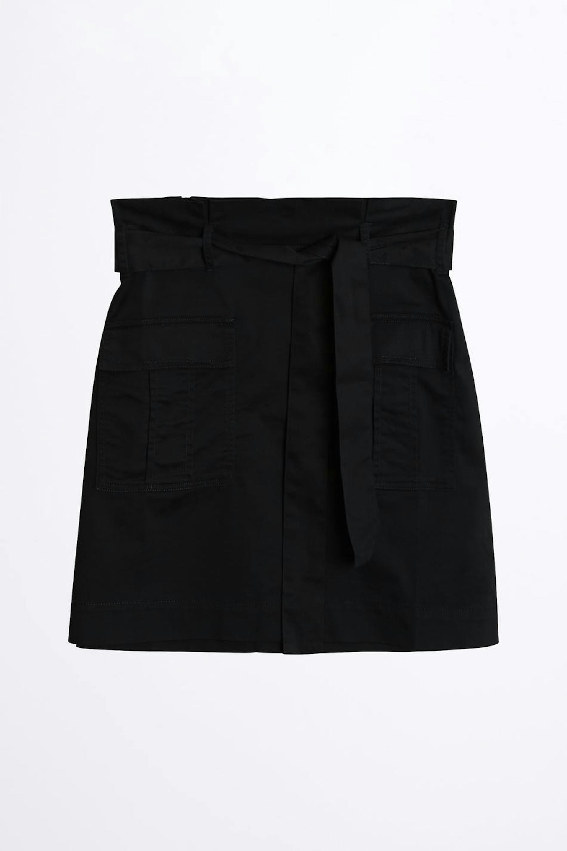 Kort kjol med en figurnära passform. Kjolen är svart och har ett knytband i midjan. Den har fickor utility framtill och ett osynligt blixtlås baktill.