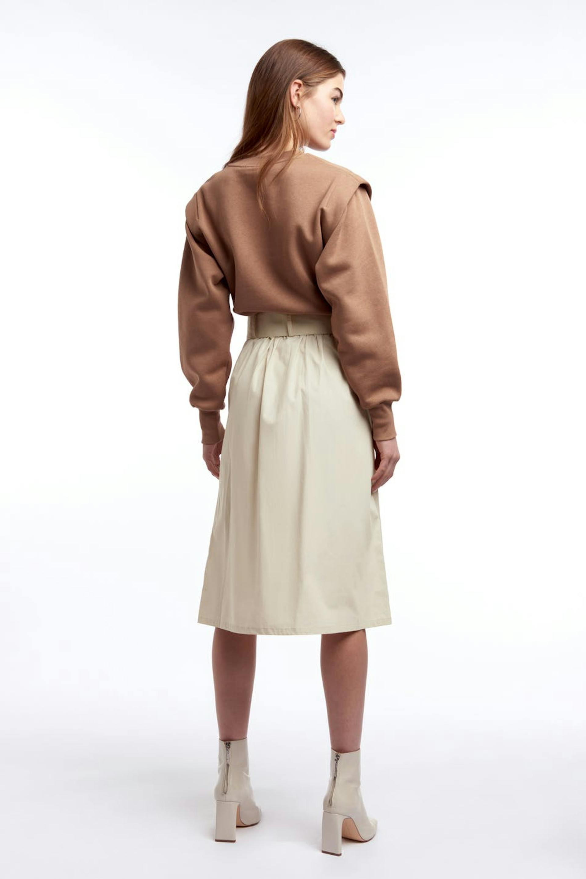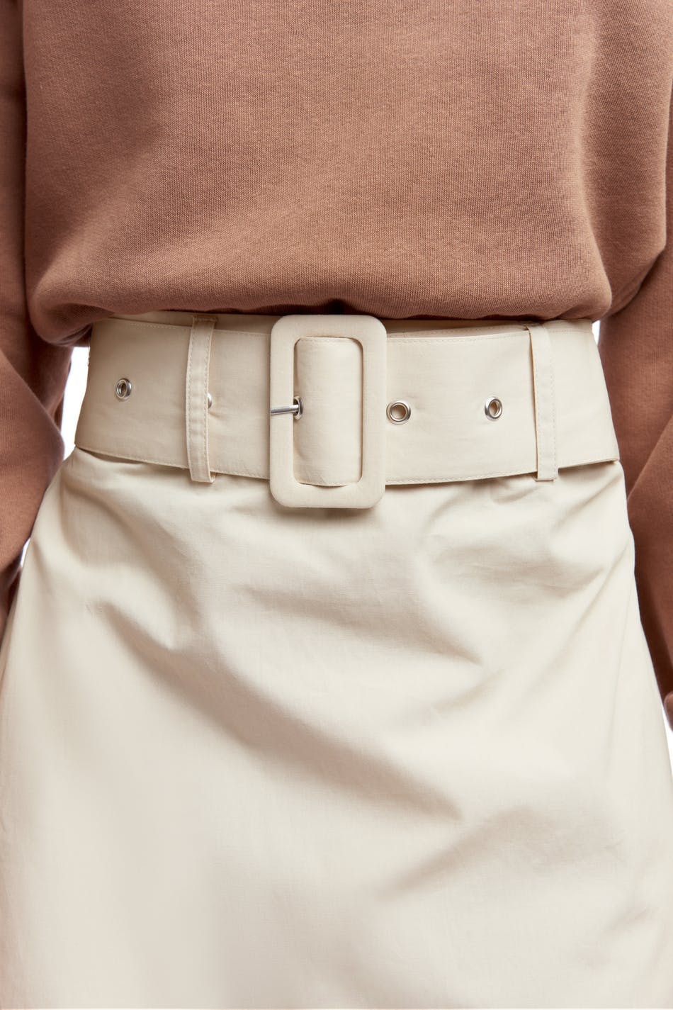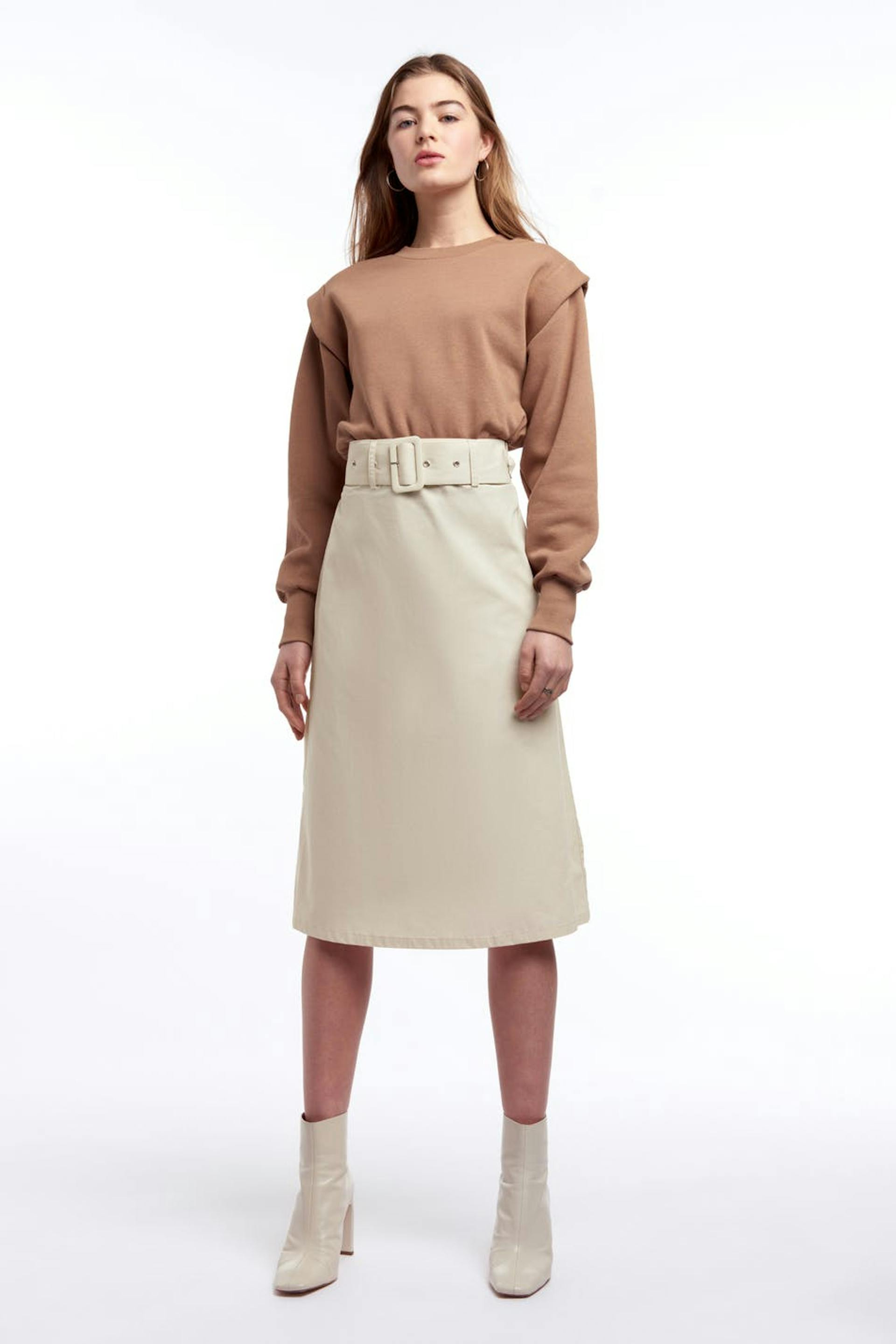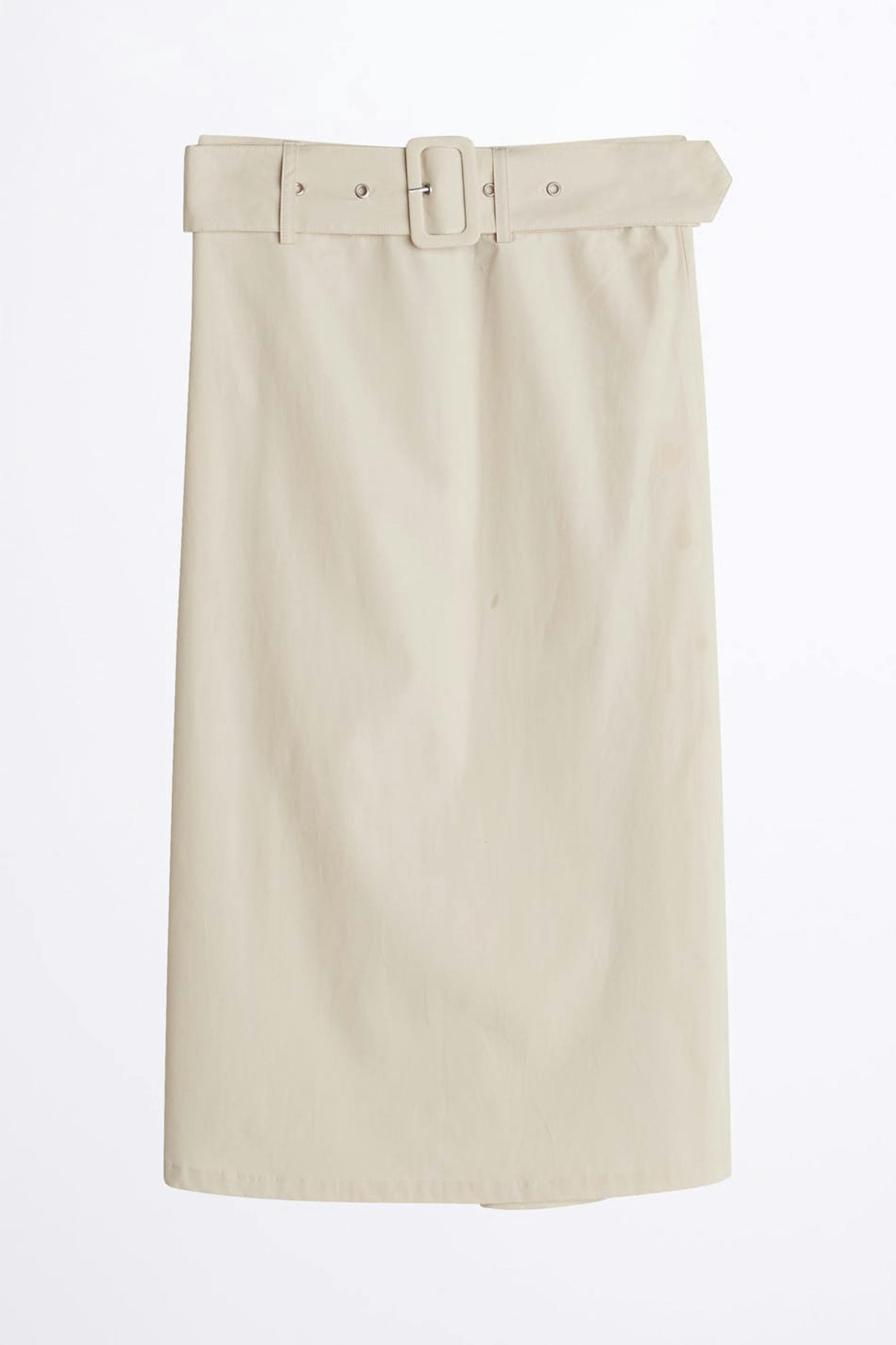 Vadlång kjol med ett bälte i midjan med ett metallspänne. Kjolen är beige.