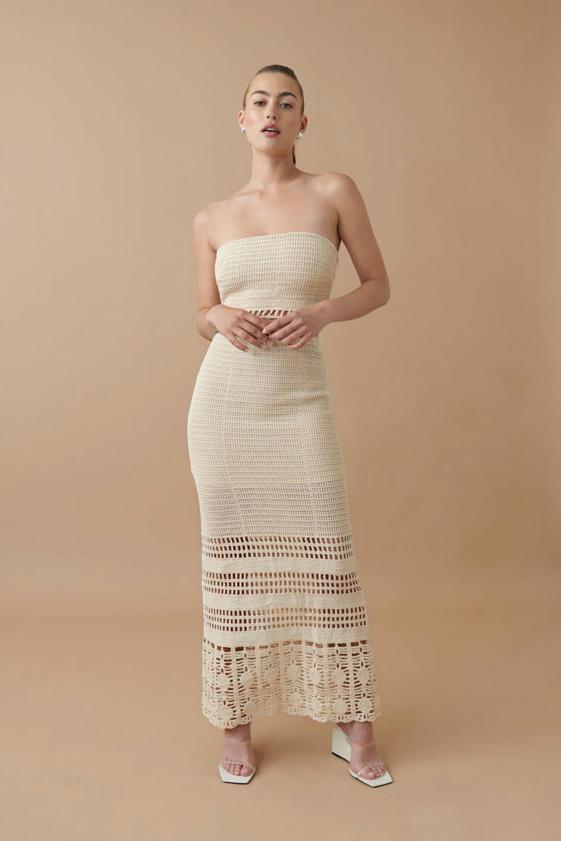 Virkad långkjol med resår i midjan. Kjolen är beige och har håldetaljer i nederkant.