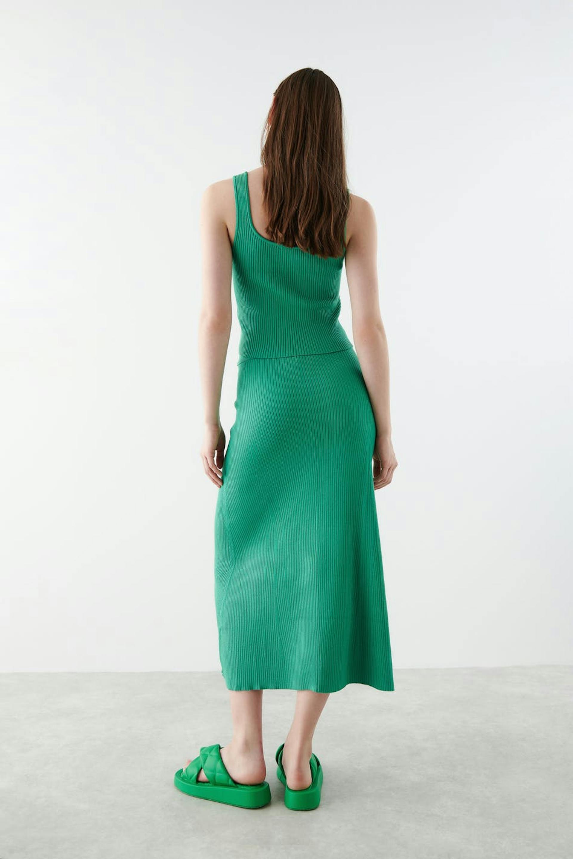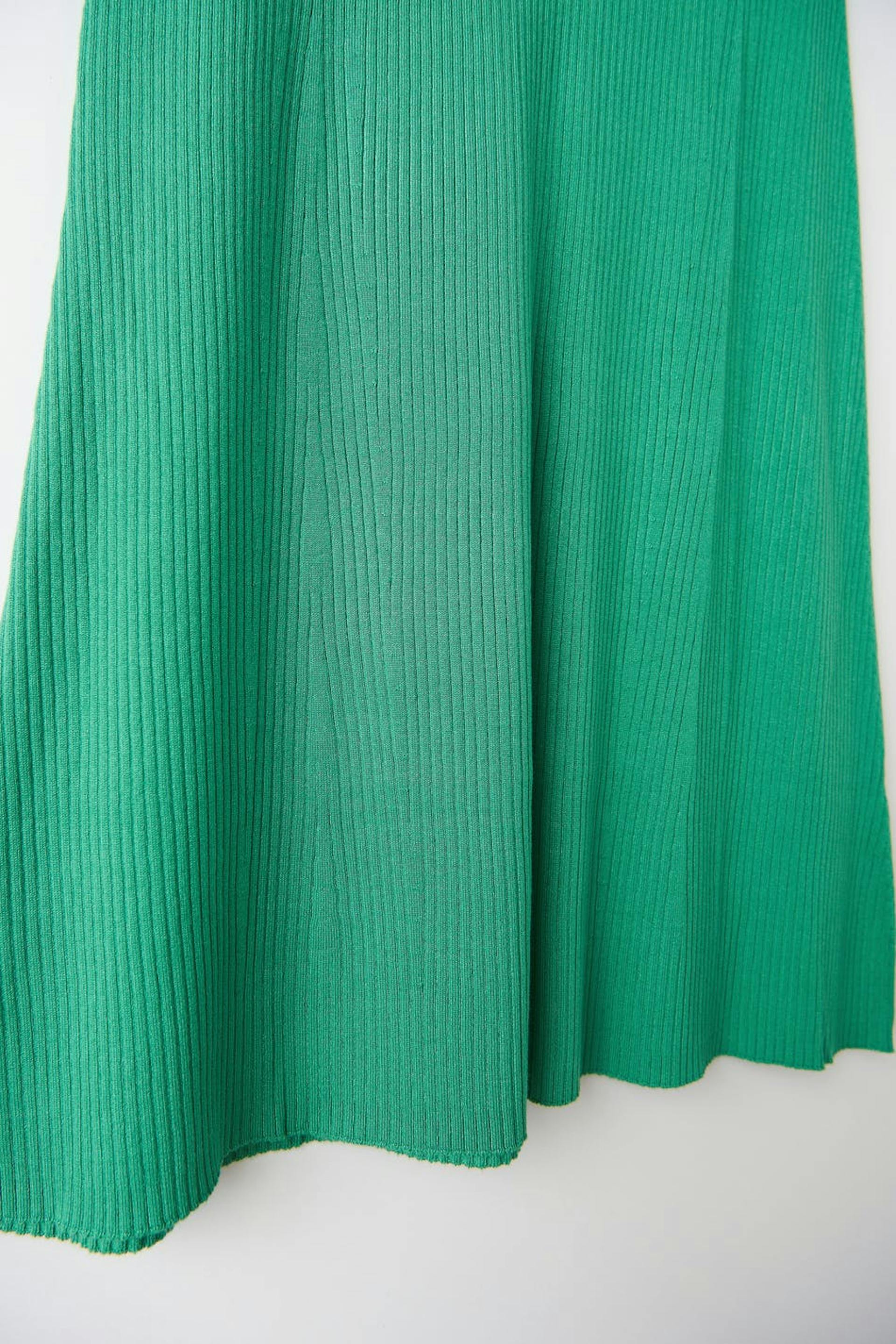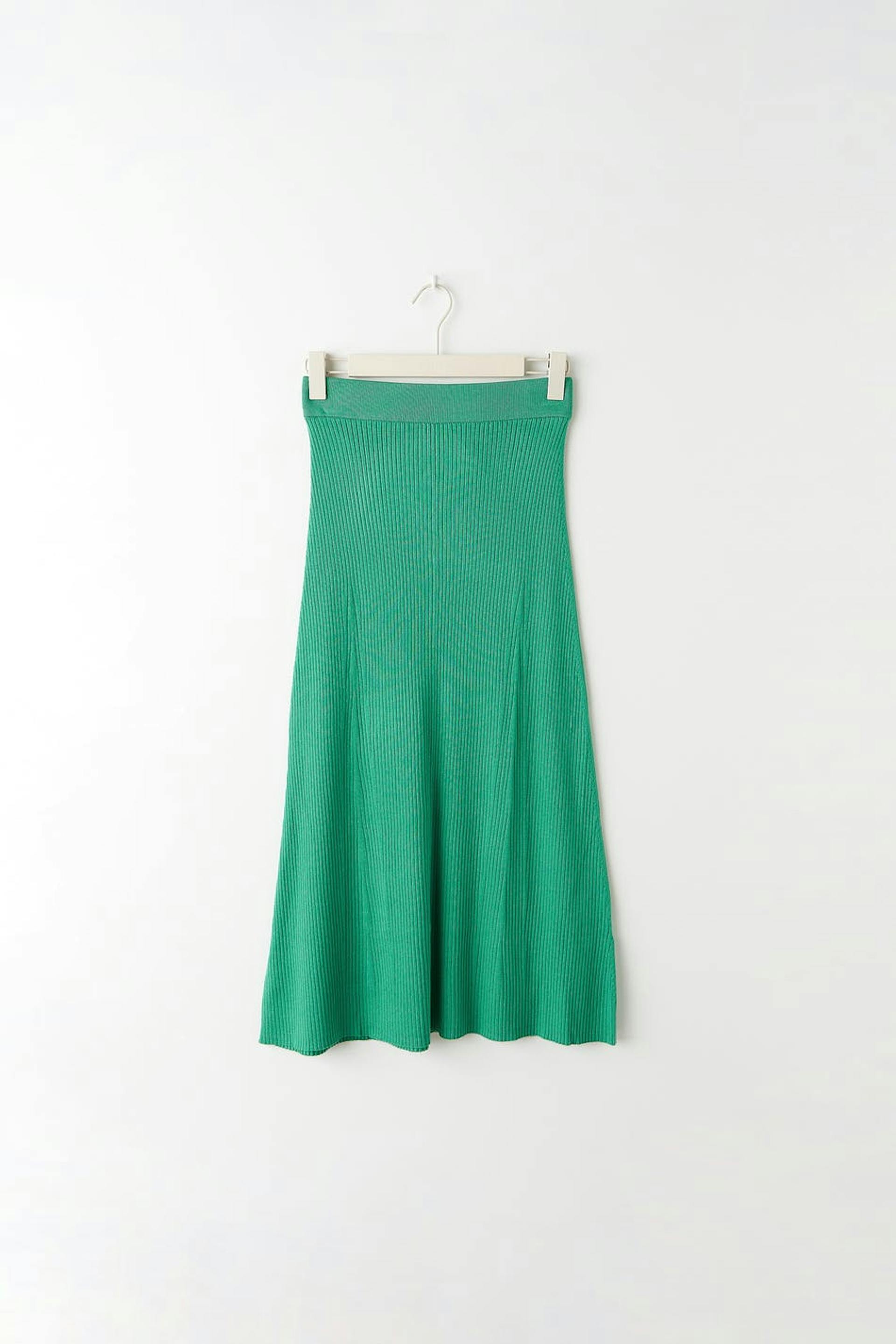 Lång kjol i viskos från EcoVero™ med en ribbad kvalitet. Kjolen är grön, utsvängd och stickad. Den har en resår i midjan och en midilängd.