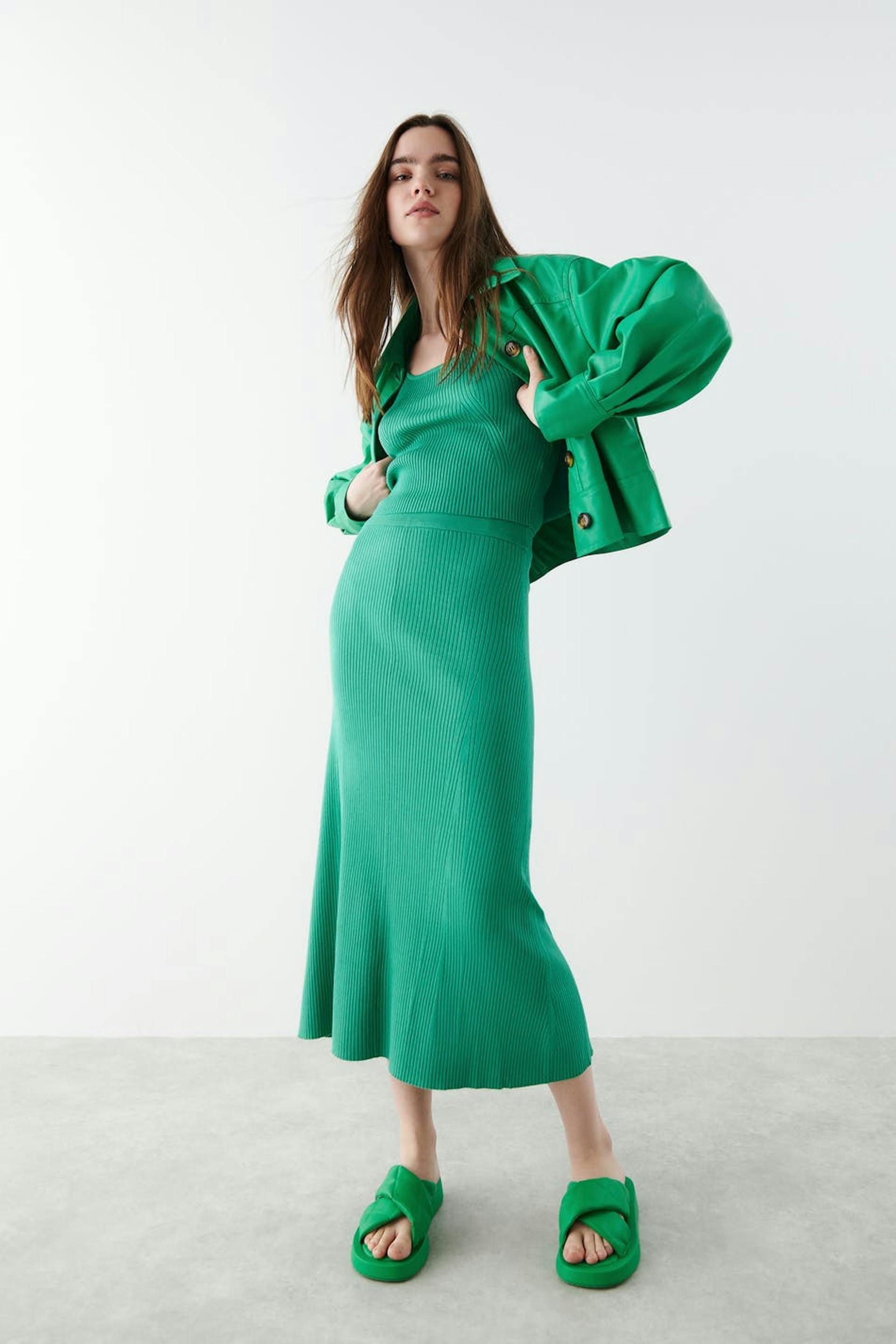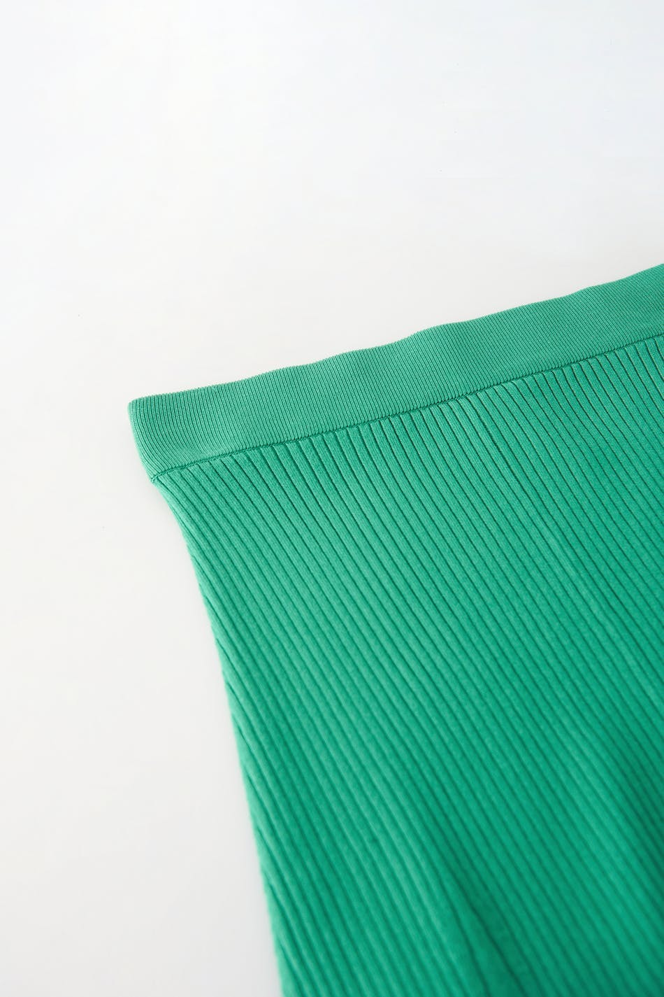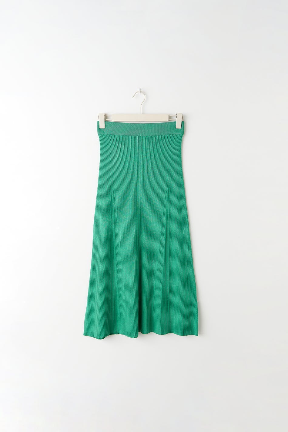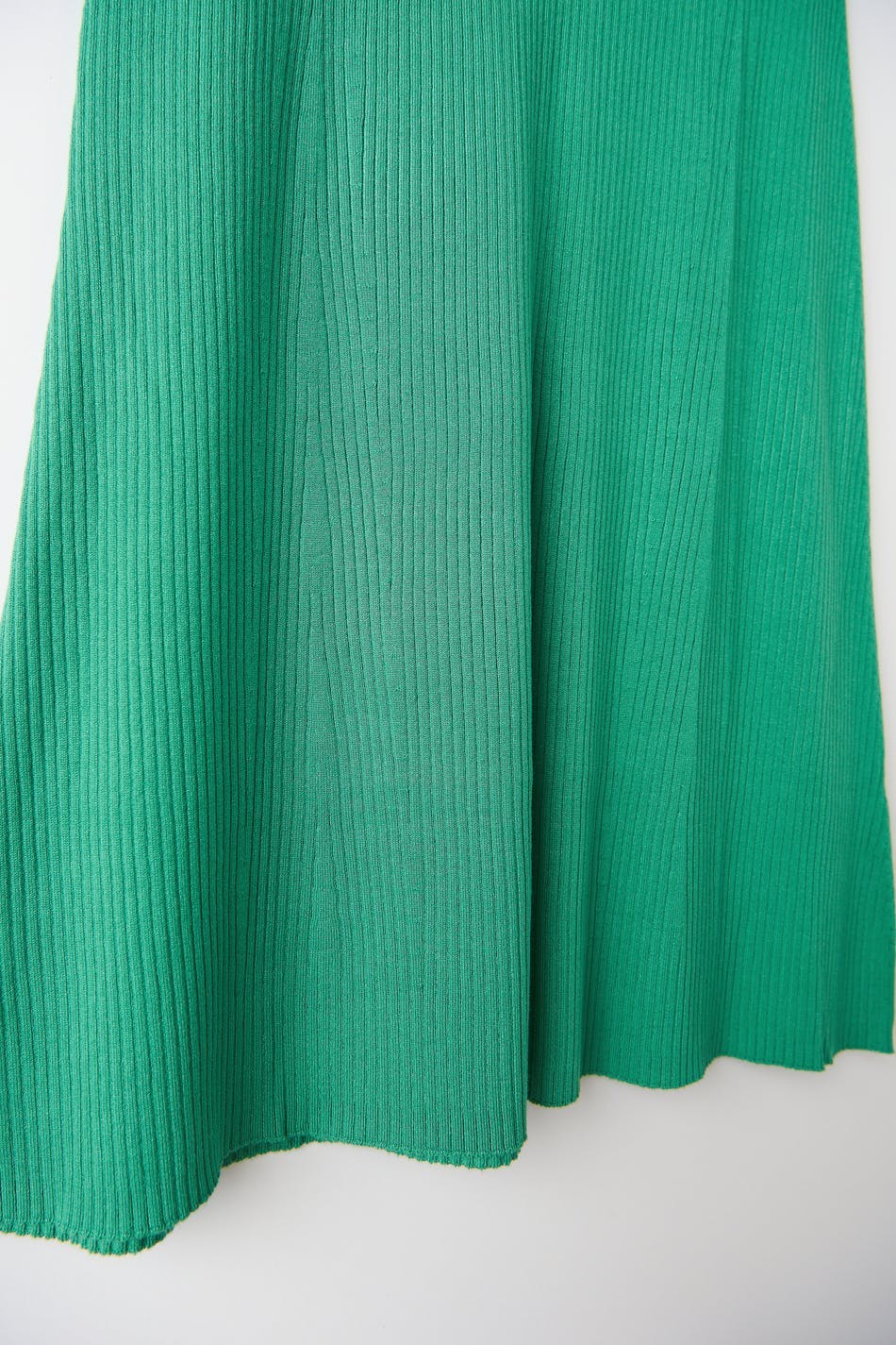 Lång kjol i viskos från EcoVero™ med en ribbad kvalitet. Kjolen är grön, utsvängd och stickad. Den har en resår i midjan och en midilängd.
