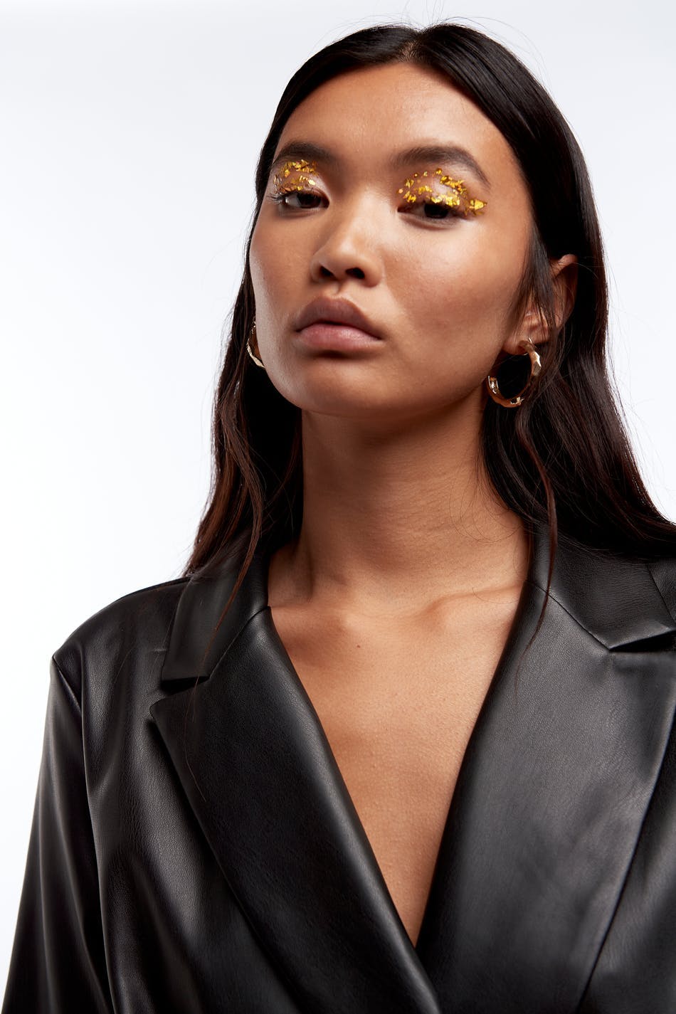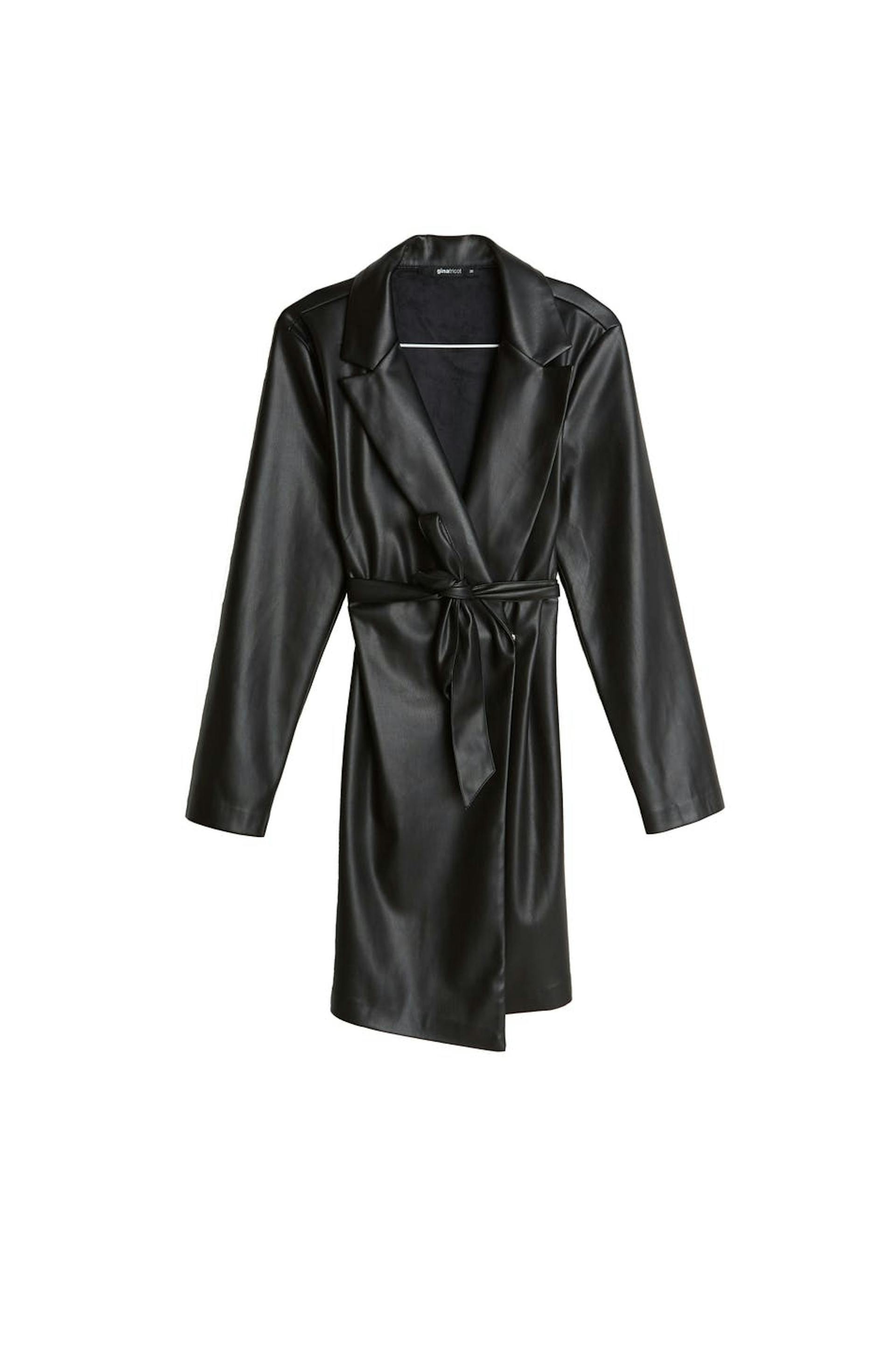 En kort, omlottklänning i skinneffekt kvalitet. Klänningen är v-ringad med slag. Lång ärm med knytband i midjan. Leverantör: Hangzhou Rui-ning Trading Co. Ltd Produktionsenhet: Hangzhou Xiaoshan hengli garment factory