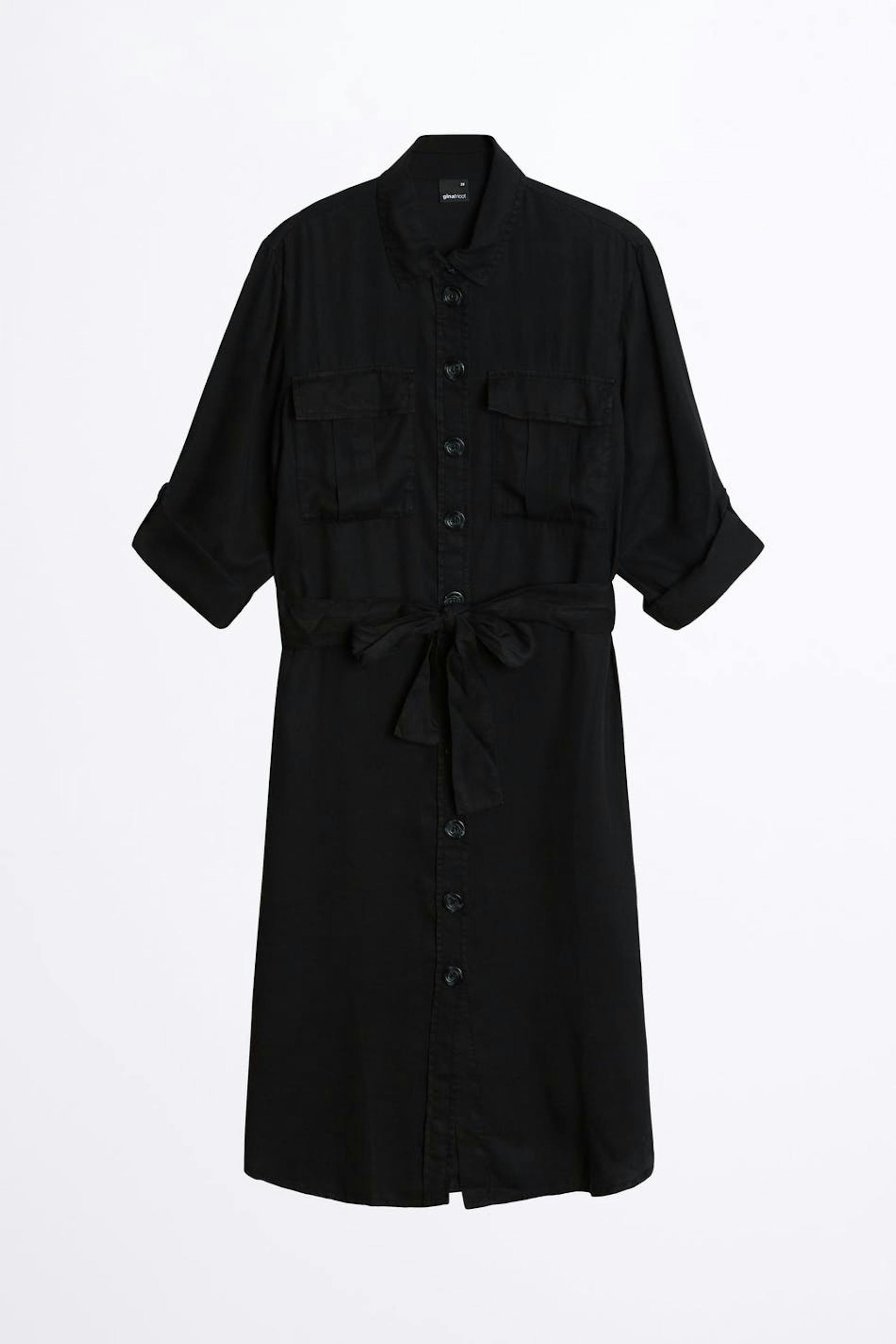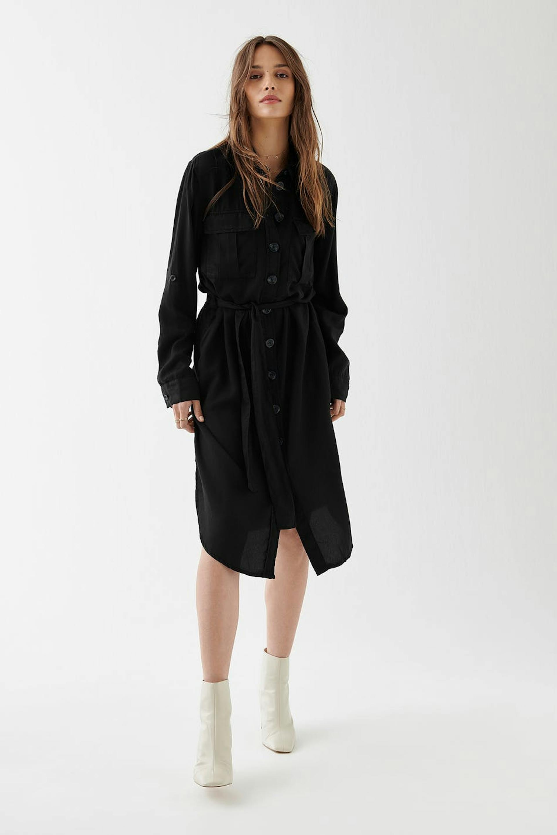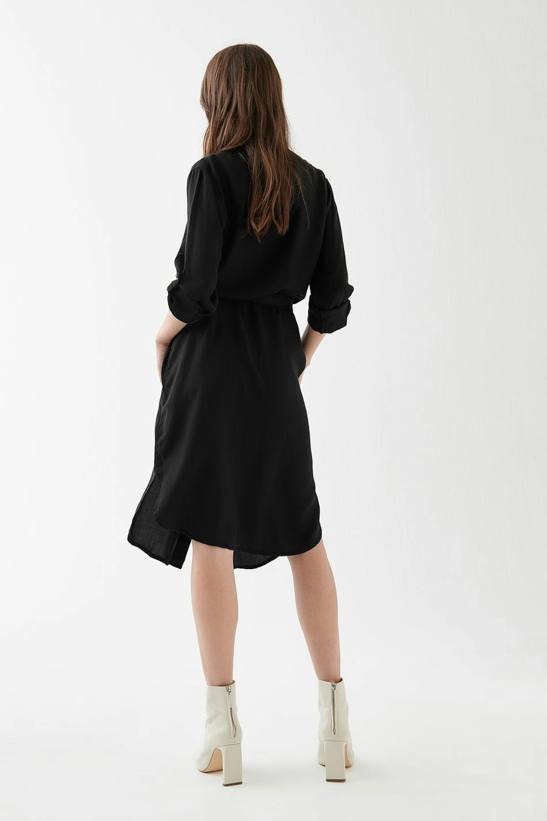Skjortklänning med en normal passform. Klänningen är svart och har en midilängd. Den har ett knytskärp i midjan och utility fickor.