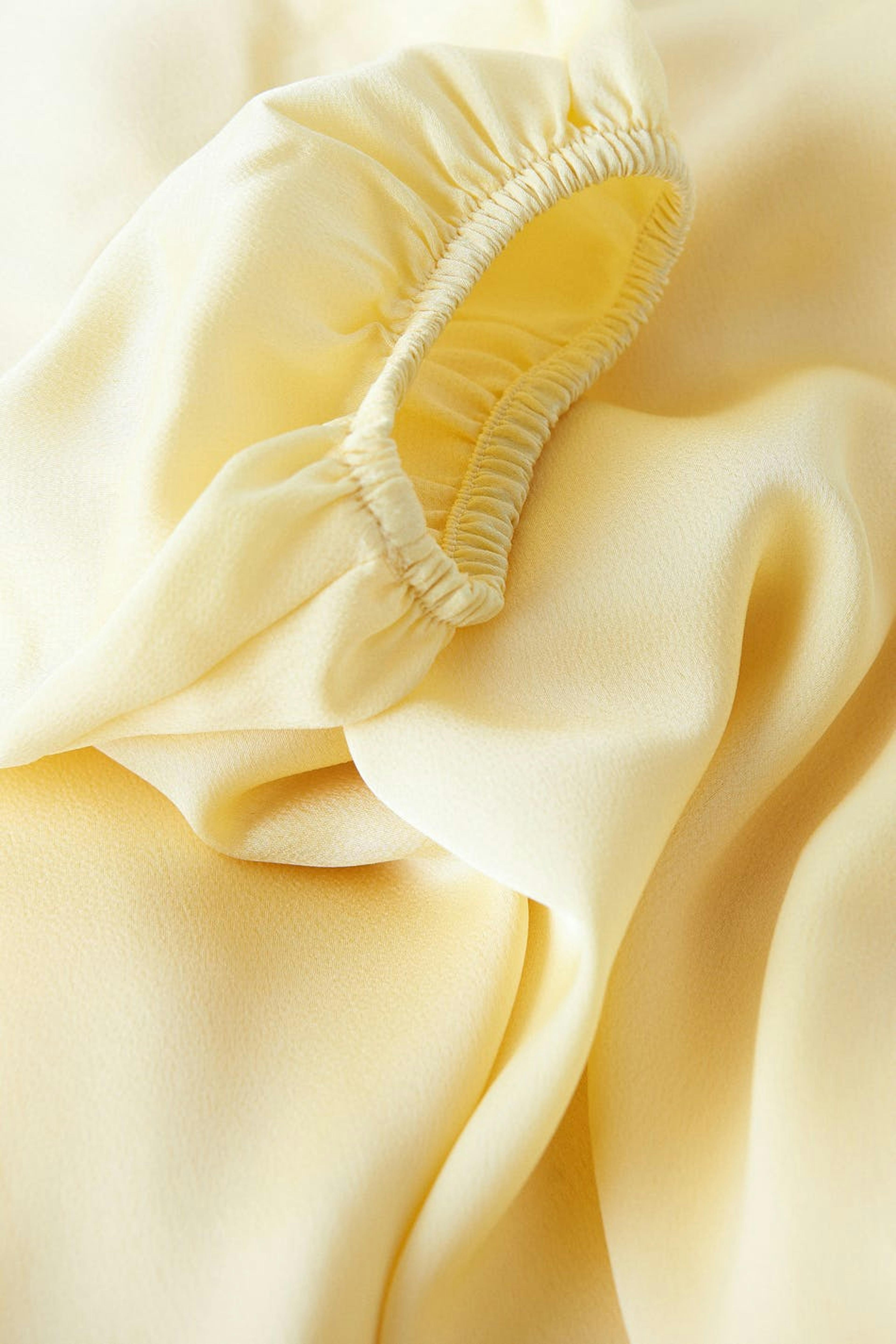 Långärmad midiklänning i satin med knytdetalj framtill. Klänningen är gul och har v-ringning. Den har ett glansigt tyg, en cut out-detalj framtill, dragkedja i ryggen, resårärmslut och slits bak.