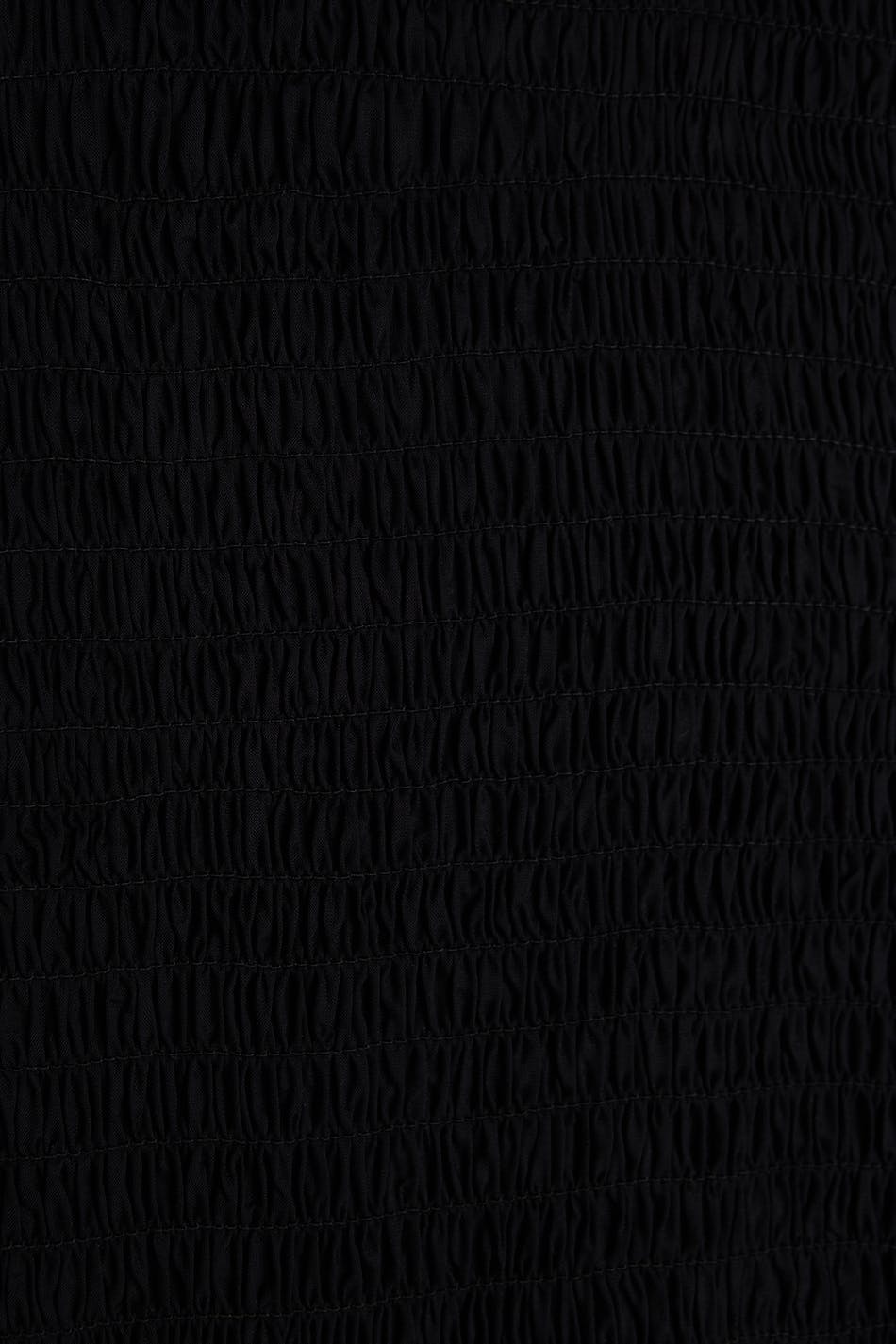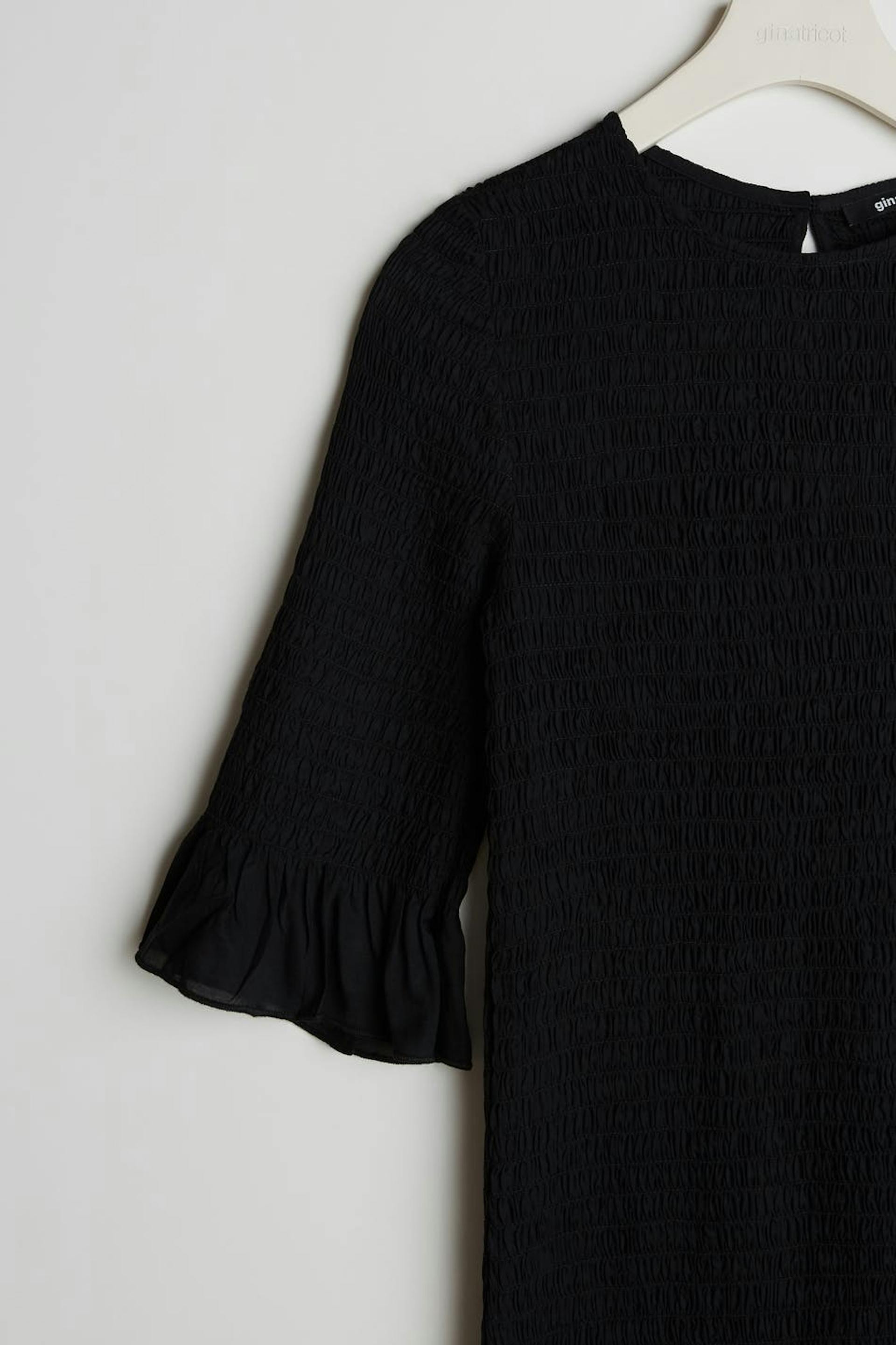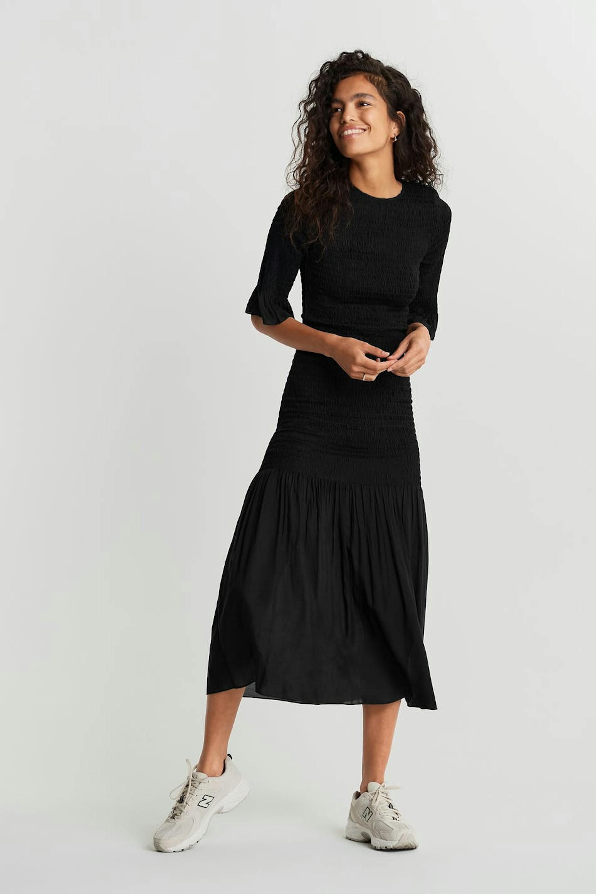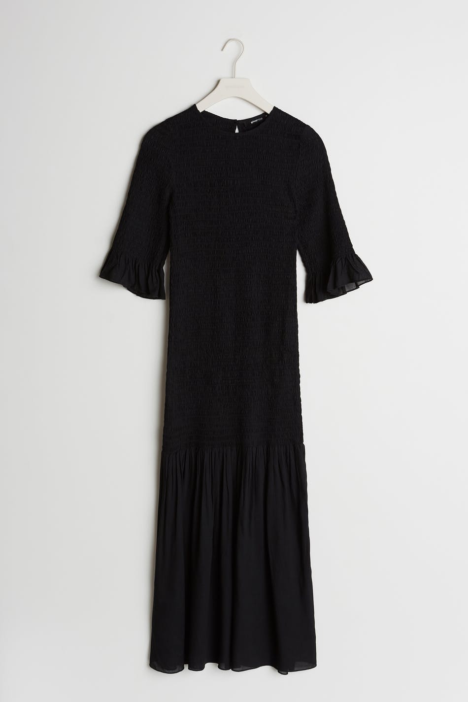 Smockad klänning med en volang i nederkant och vid ärmsluten. Klänningen är svart och vadlång och har 3/4-långa ärmar.