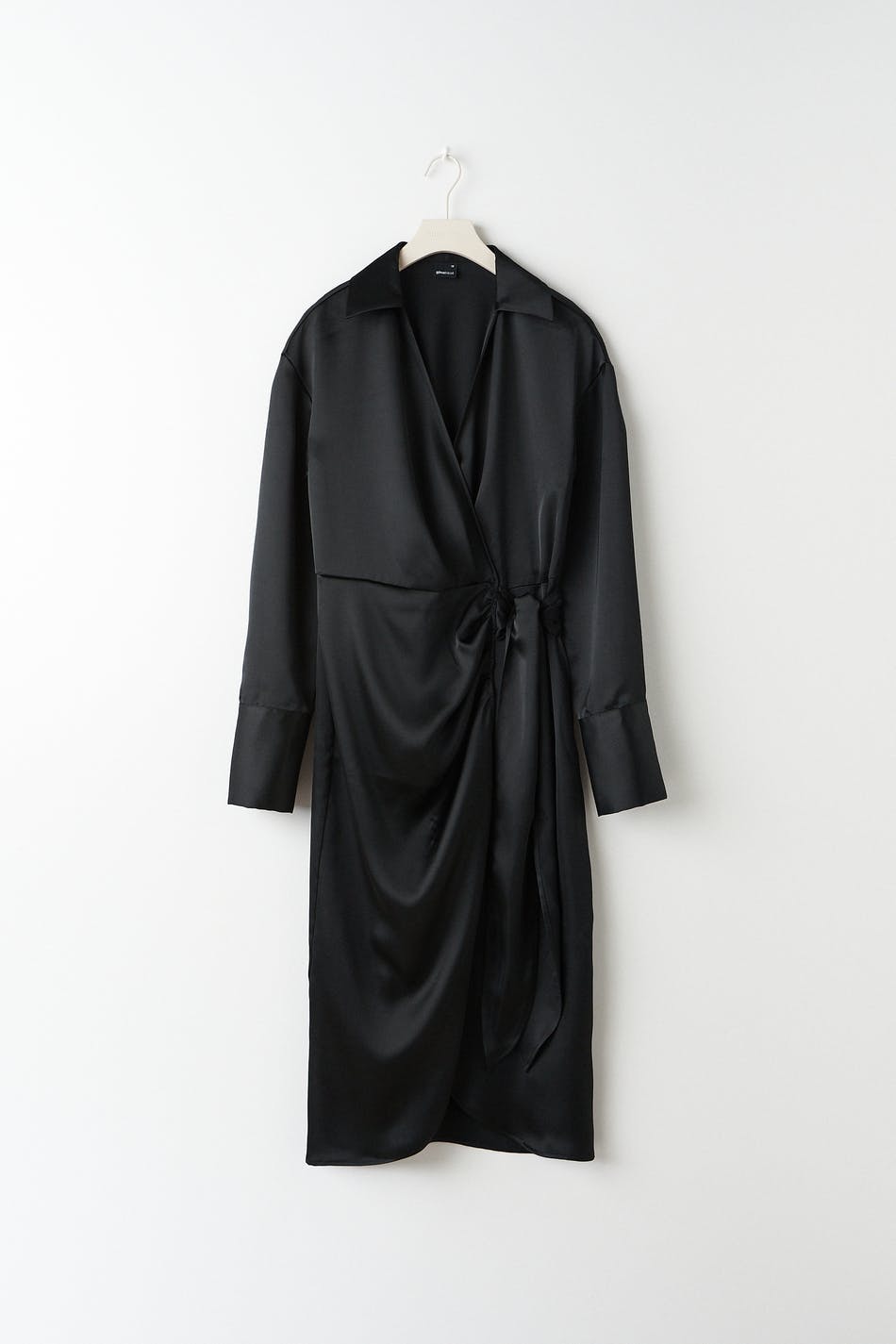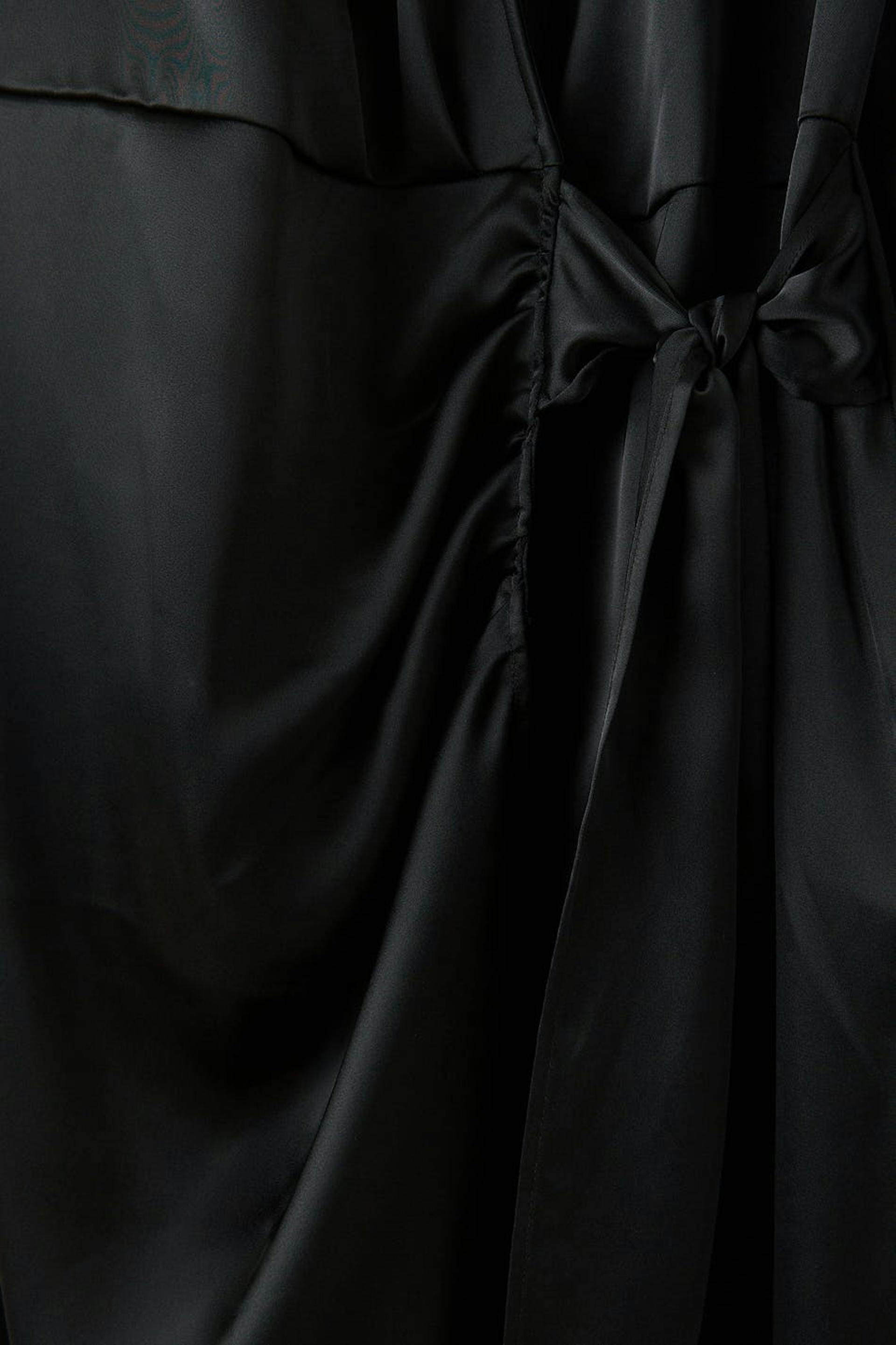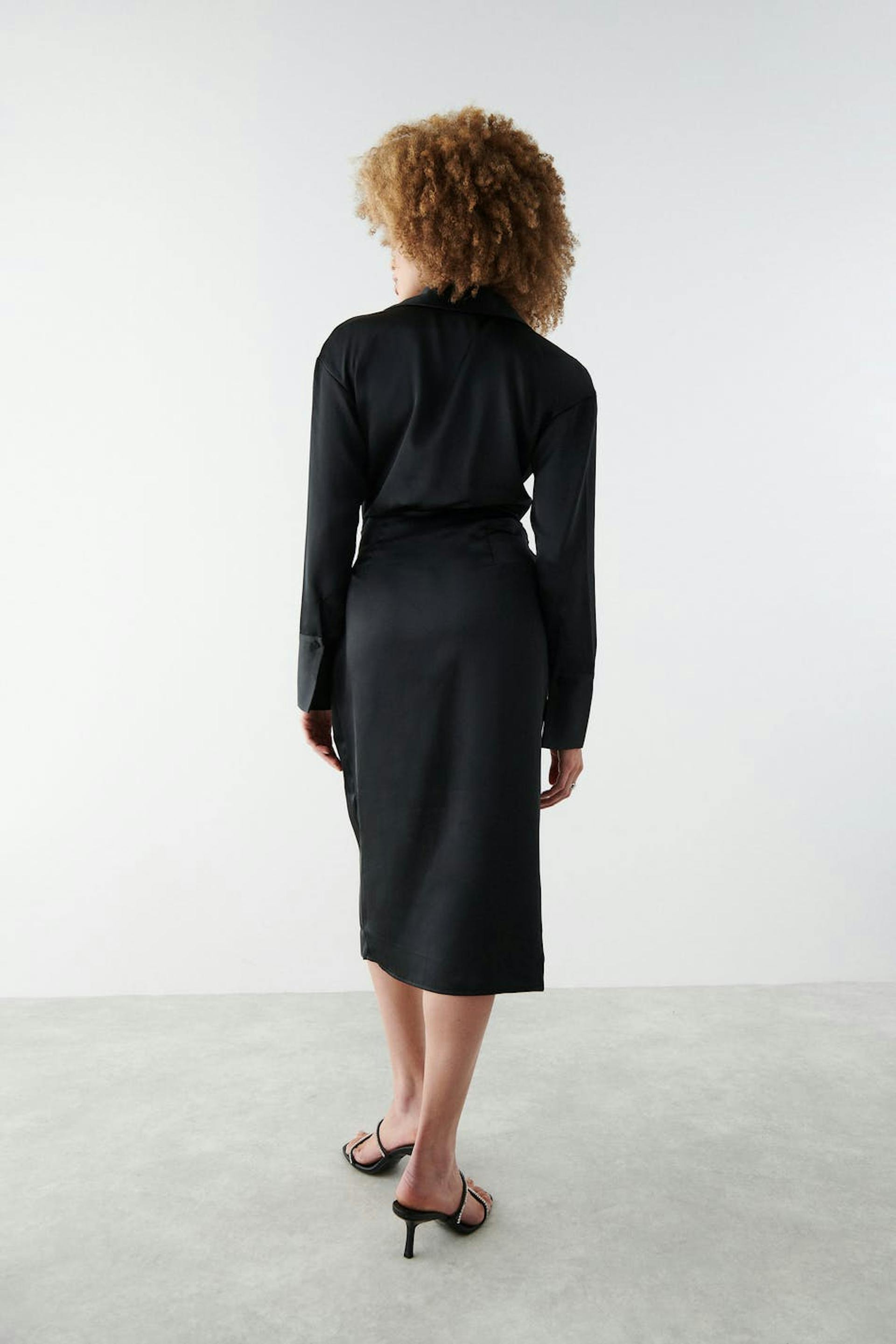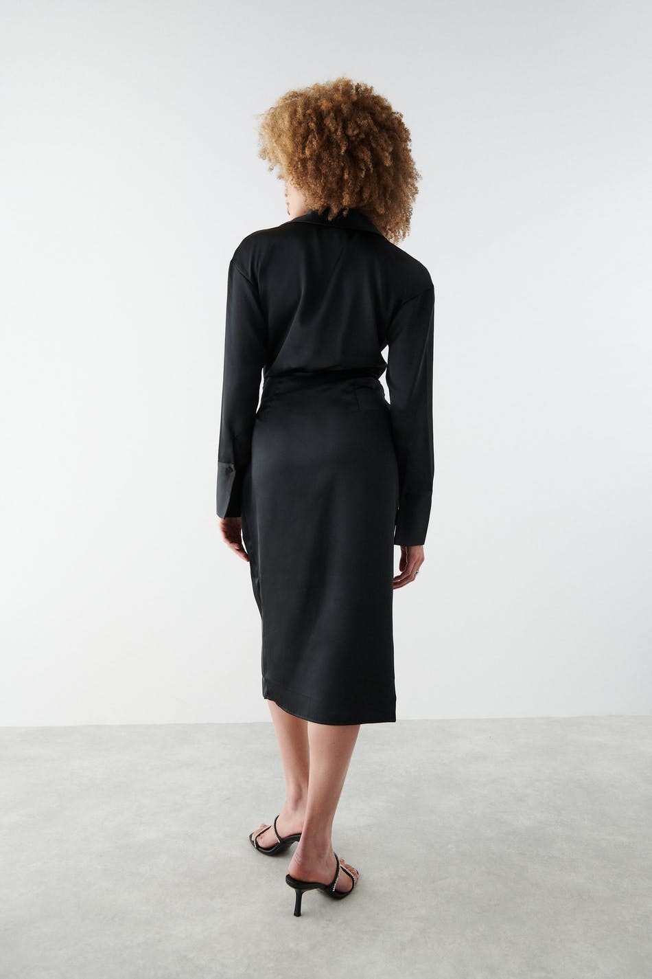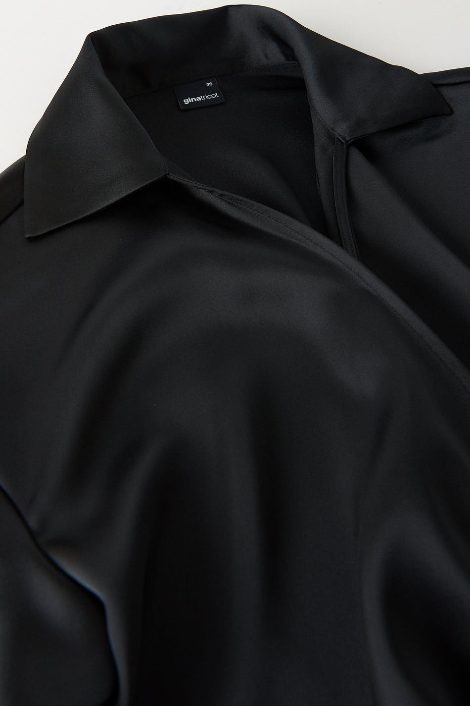 Skjortklänning i satin med omlottdesign. Klänningen är perfekt för festen och svart och har v-ringning. Den har en krage och knytband i midjan.