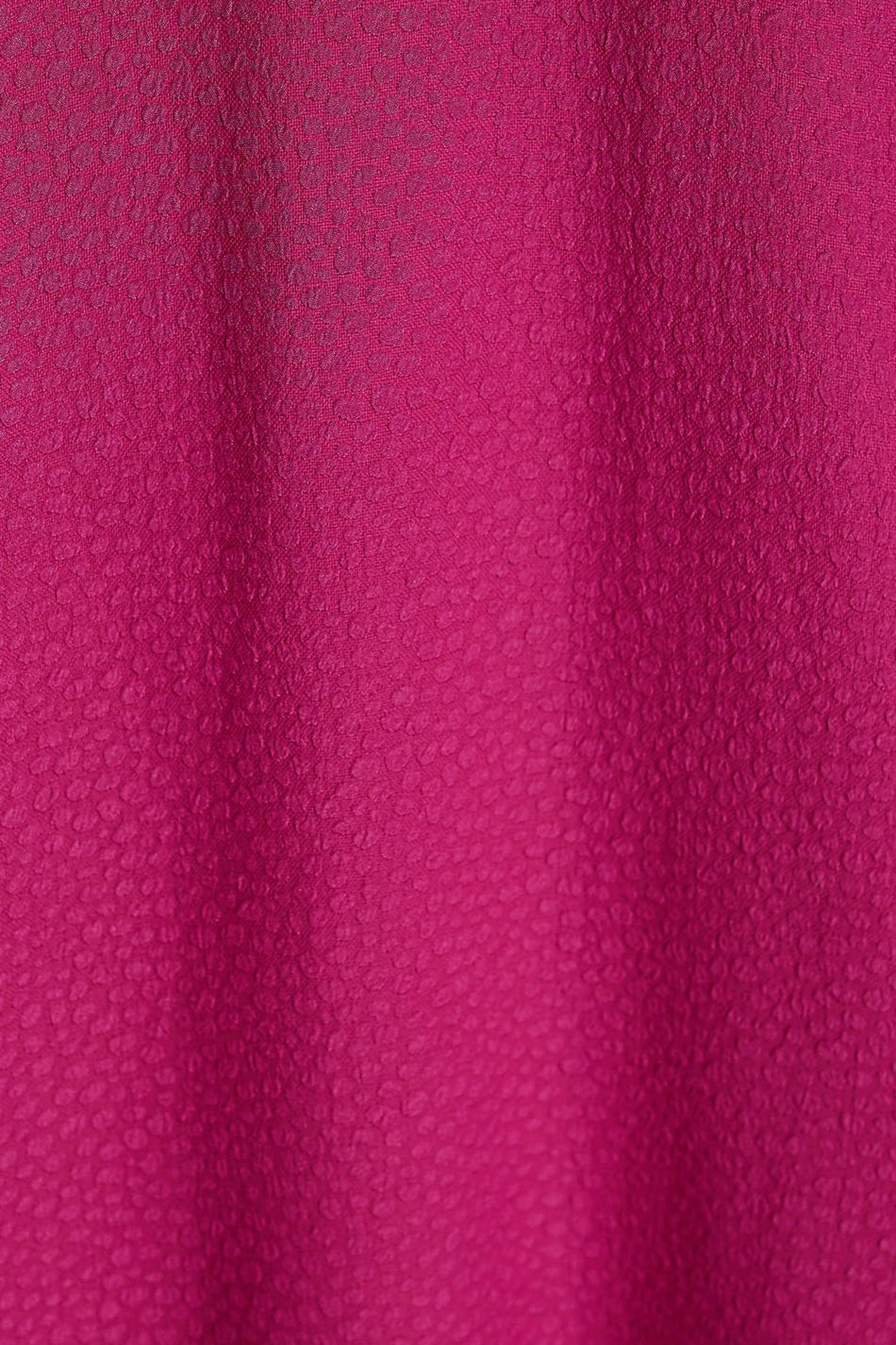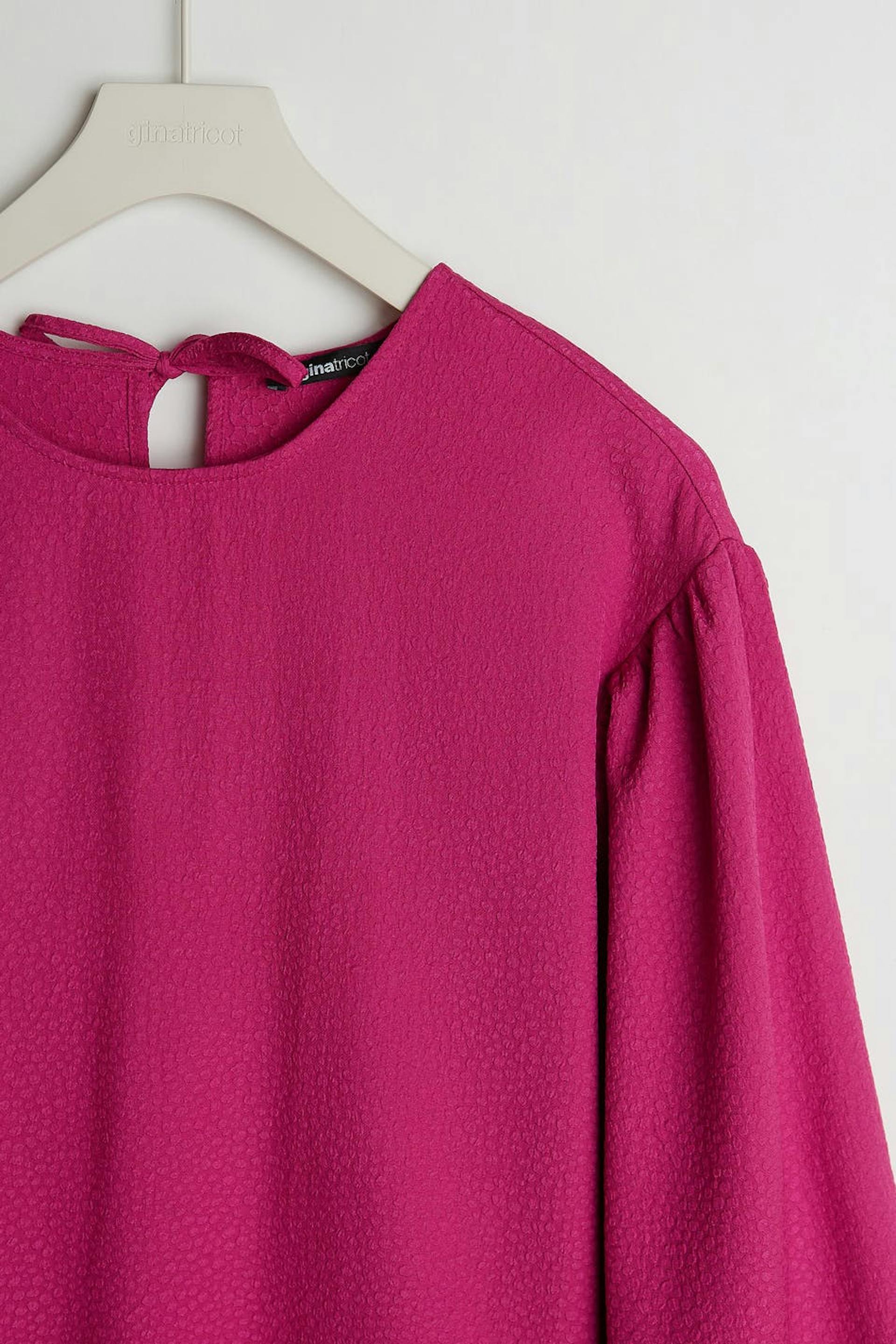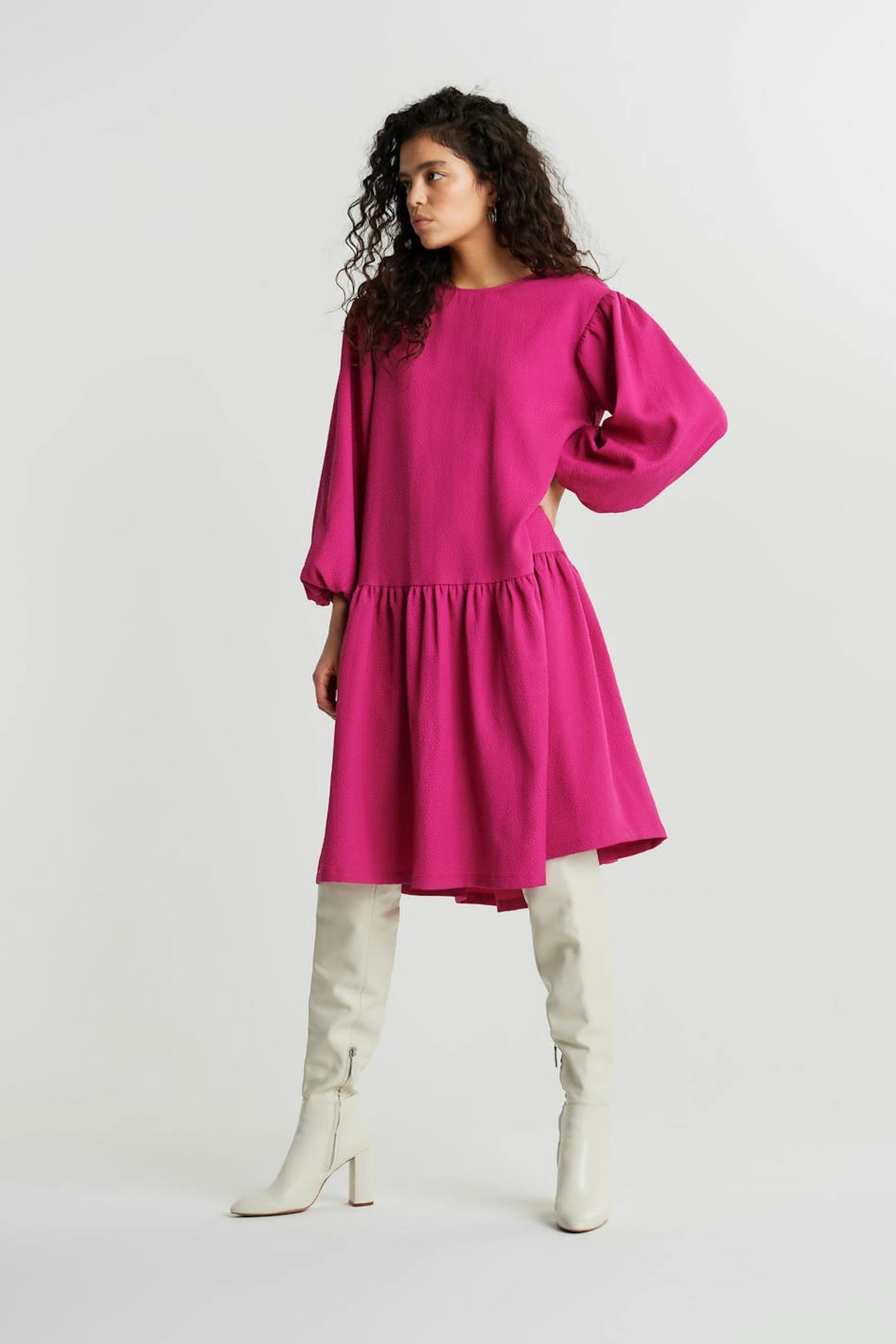 Strukturerad klänning med stora, 3/4-långa puffärmar. Klänningen är rosa och har en rynkning på kjolen. Den har en knytning vid nacken och en midilängd.