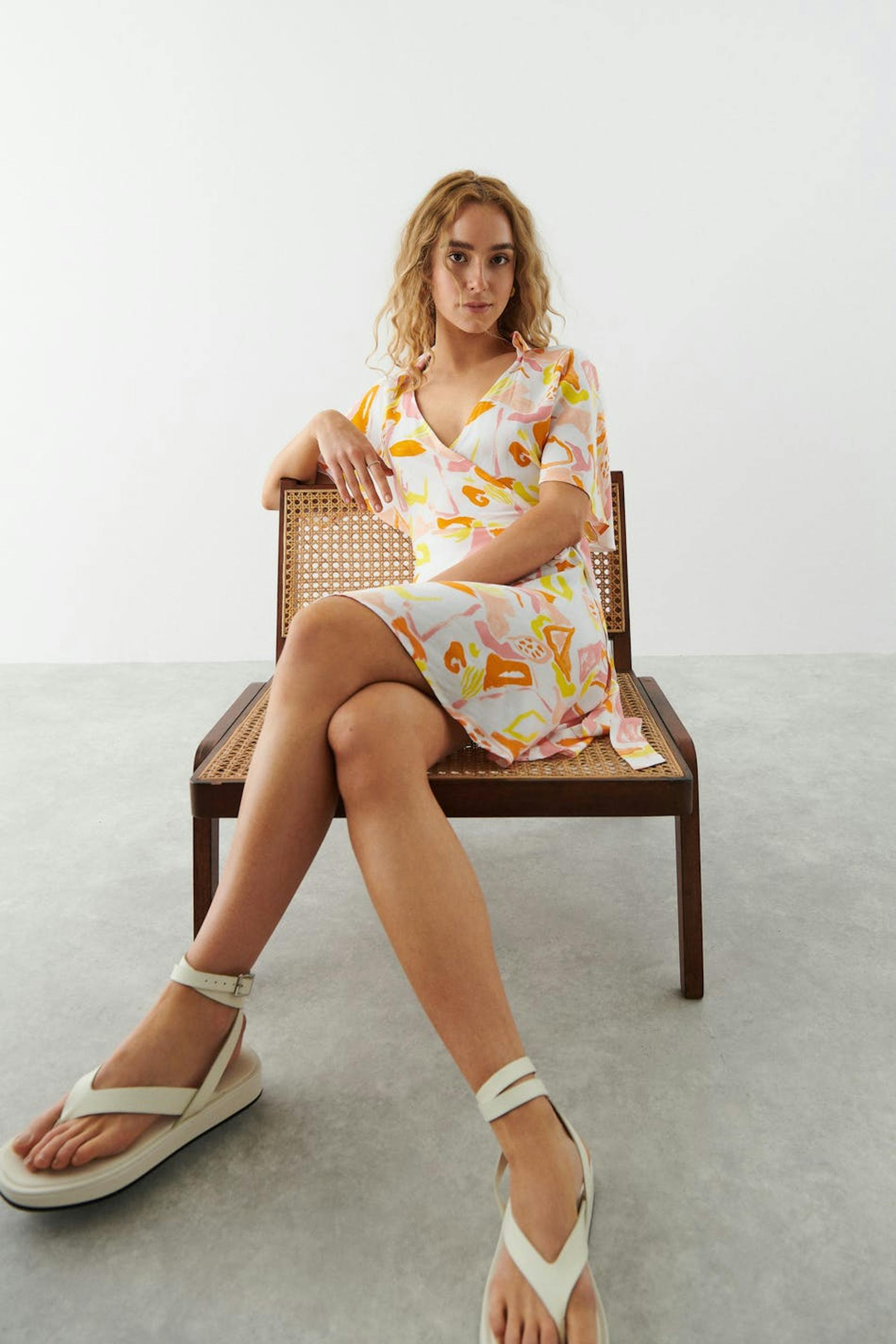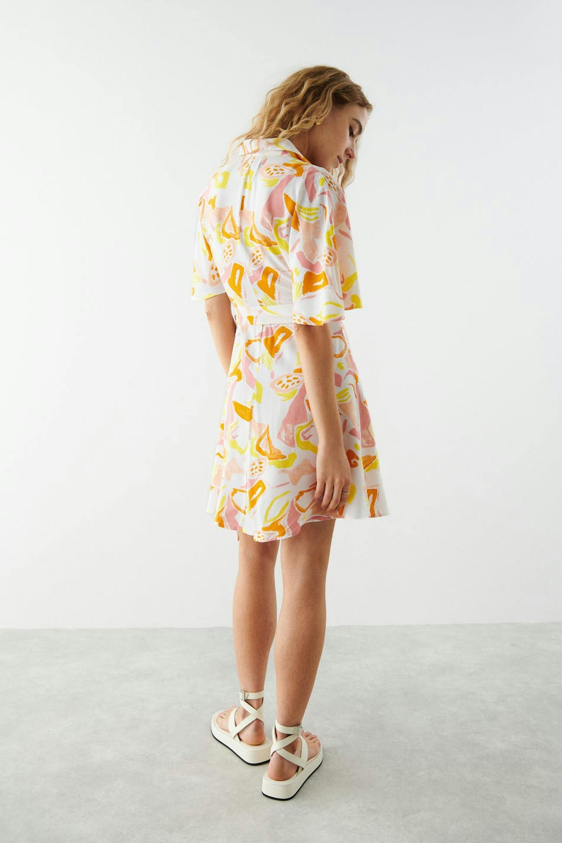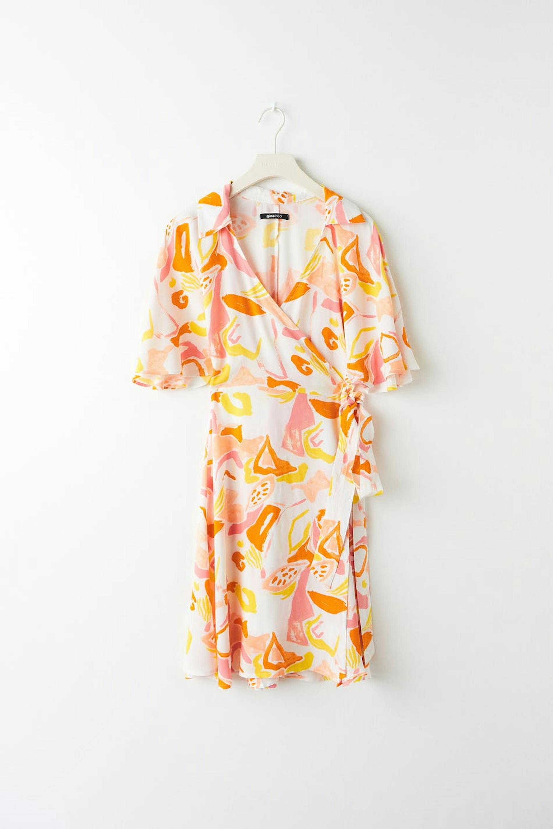 Kort omlottklänning med knytning i sidan. Klänningen är gul, vit och kortärmad. Den har en krage och v-ringning.