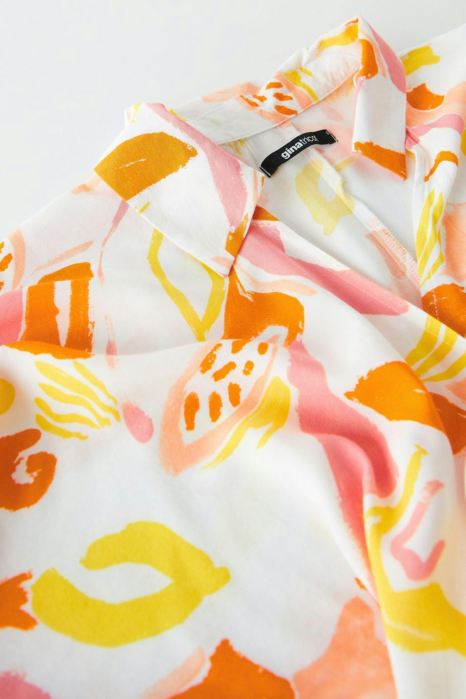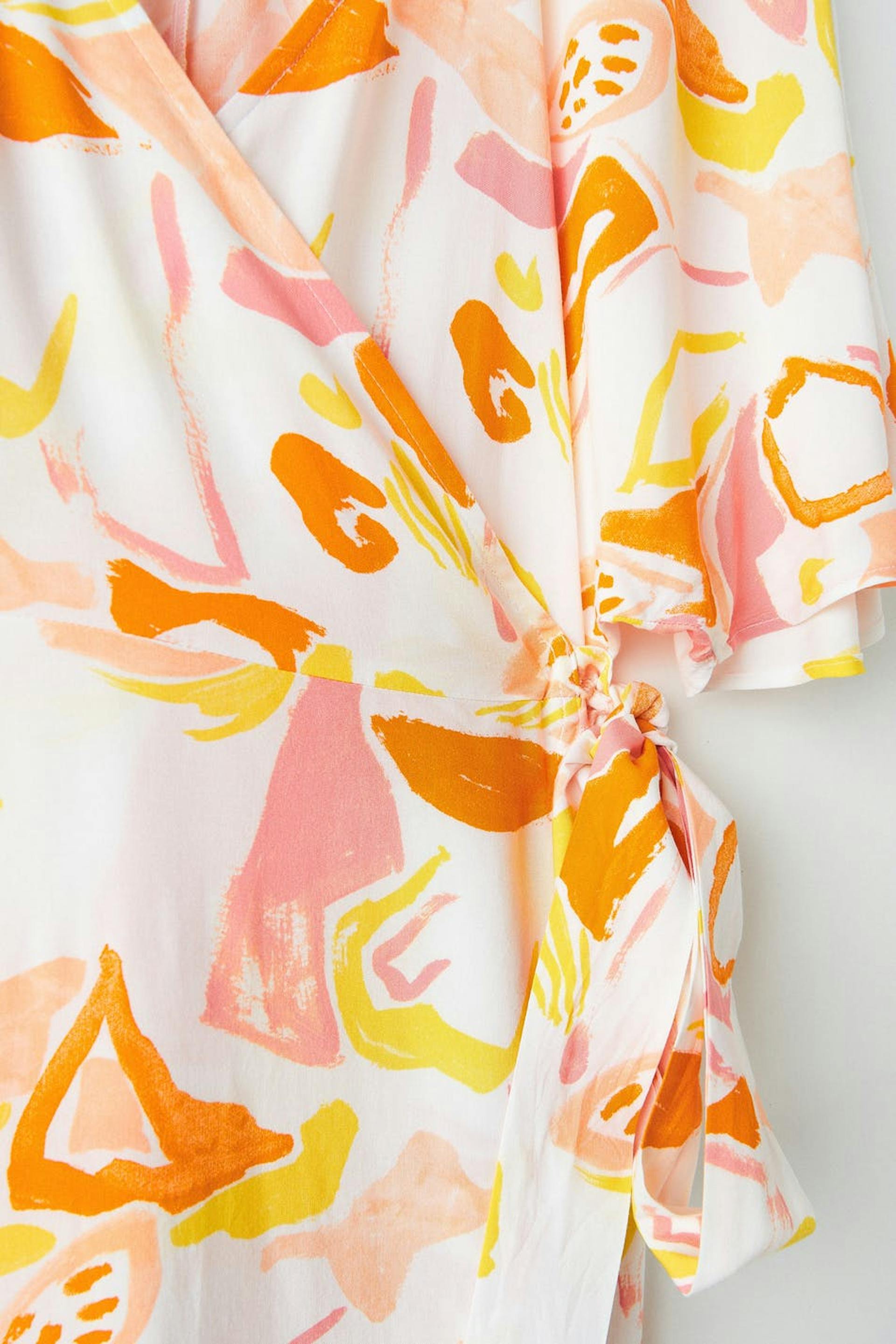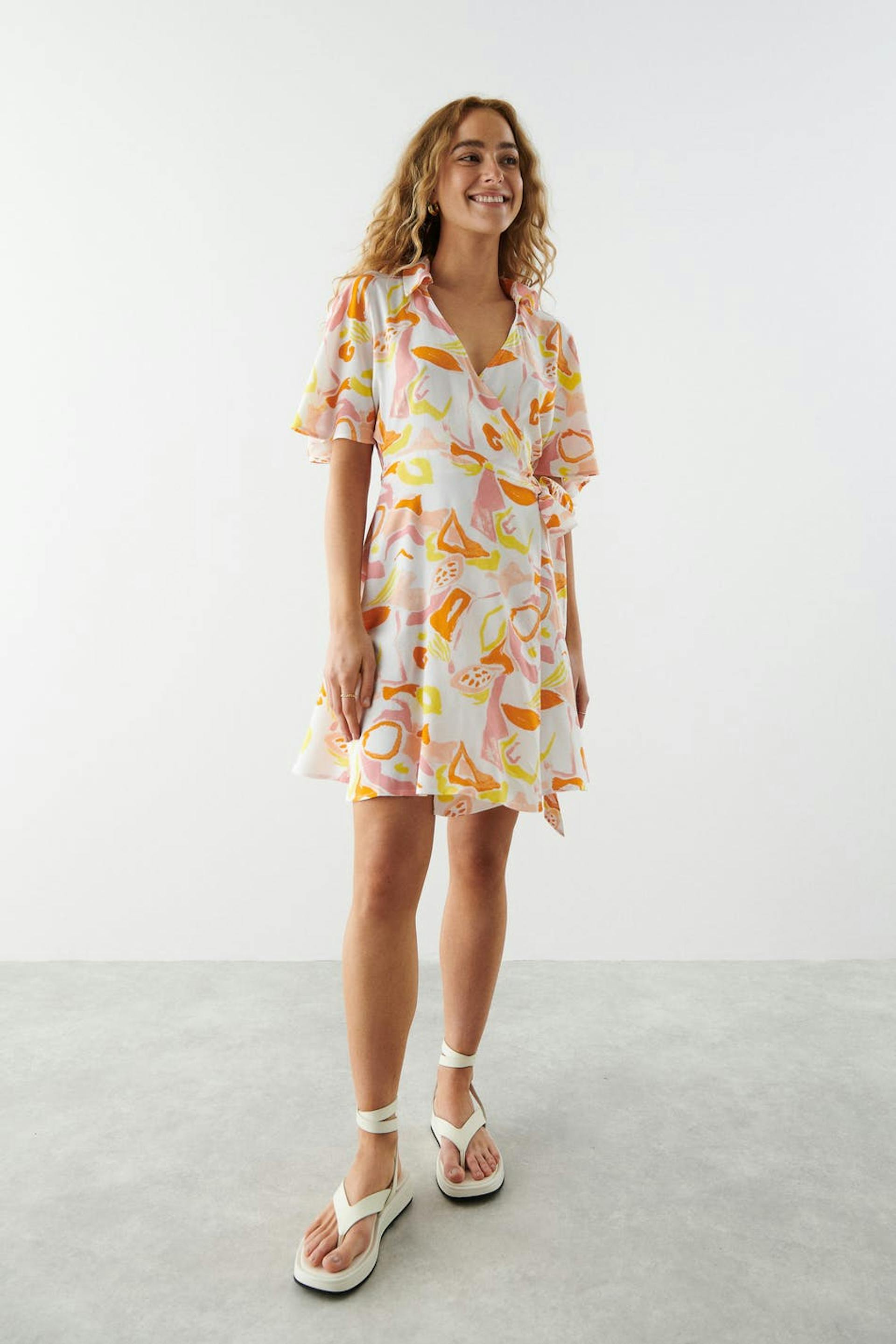 Kort omlottklänning med knytning i sidan. Klänningen är gul, vit och kortärmad. Den har en krage och v-ringning.