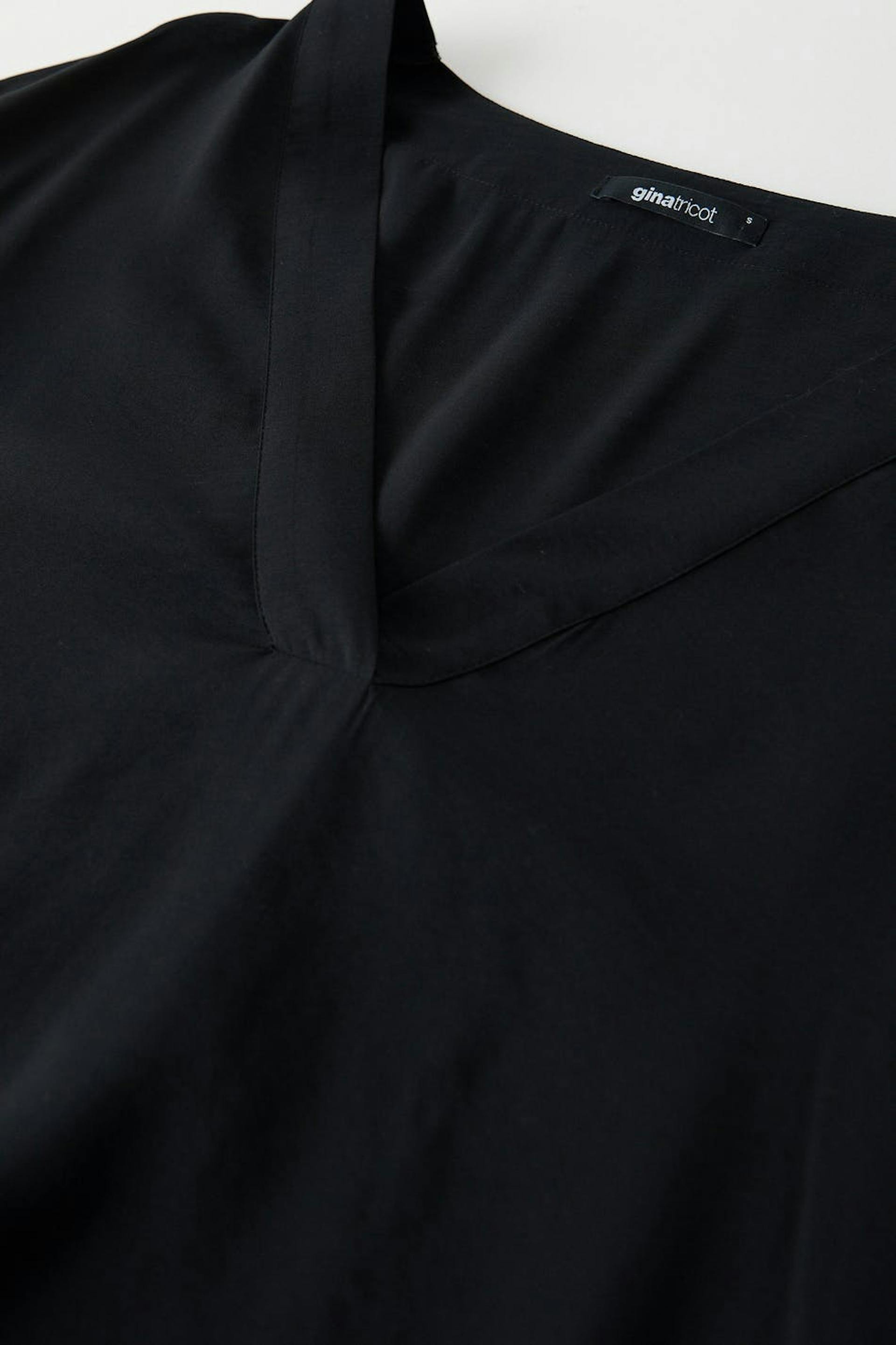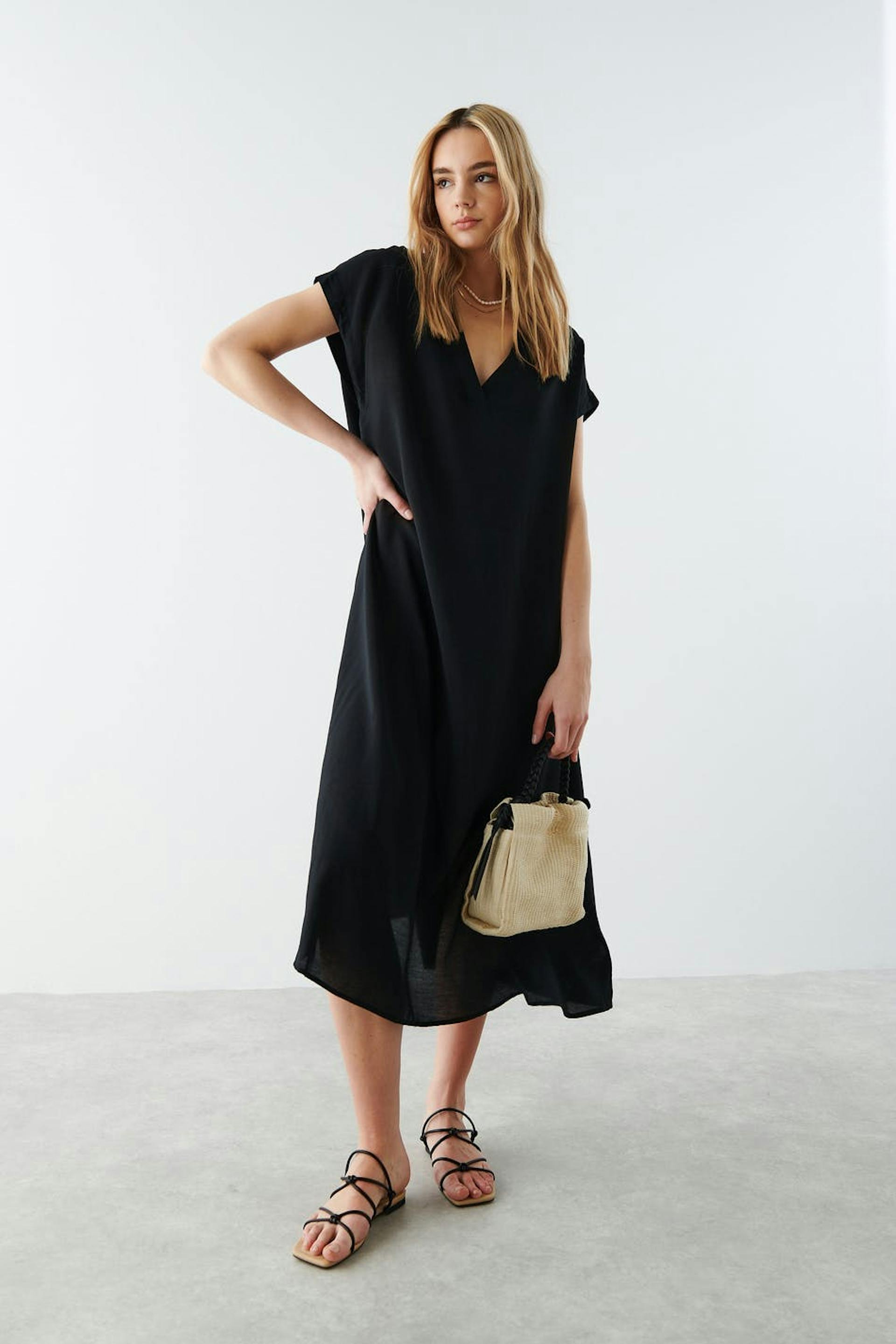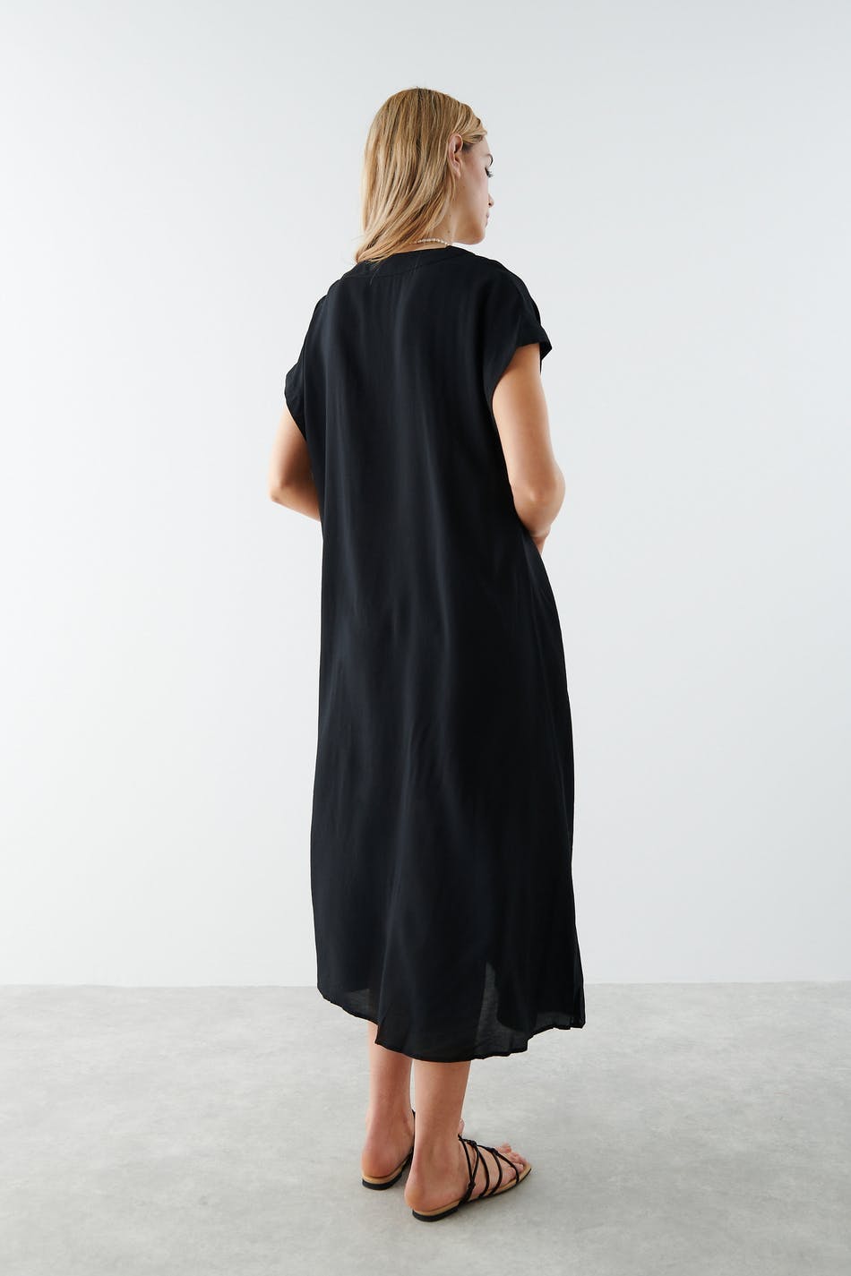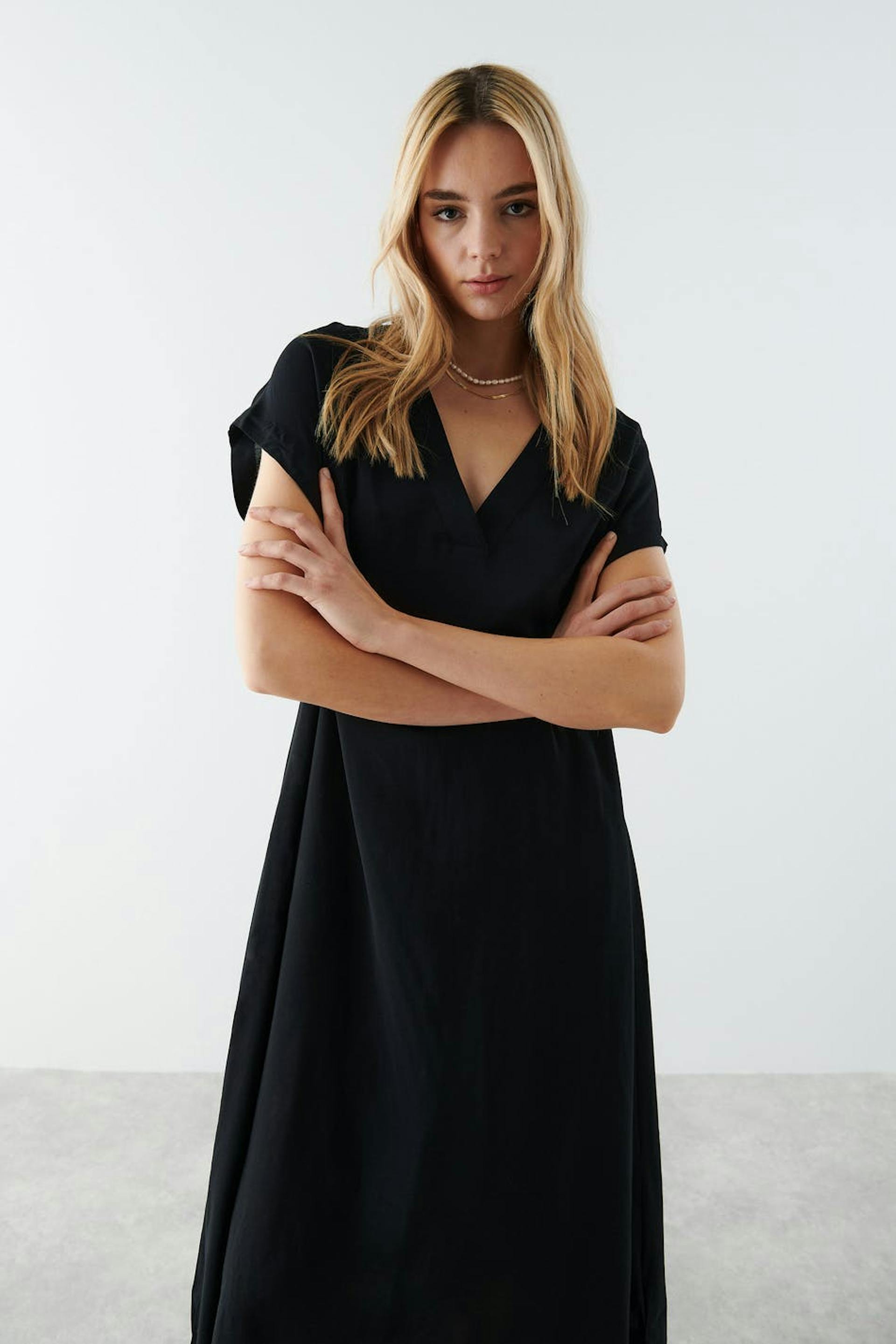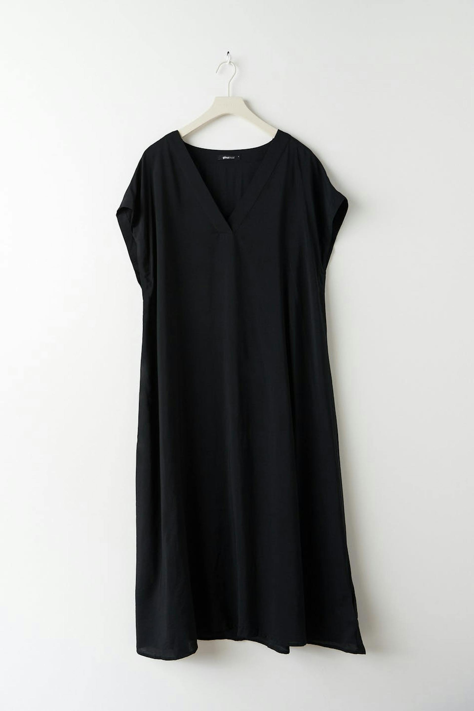 Kortärmad kaftanklänning med en djup v-ringning. Klänningen är svart och oversized.