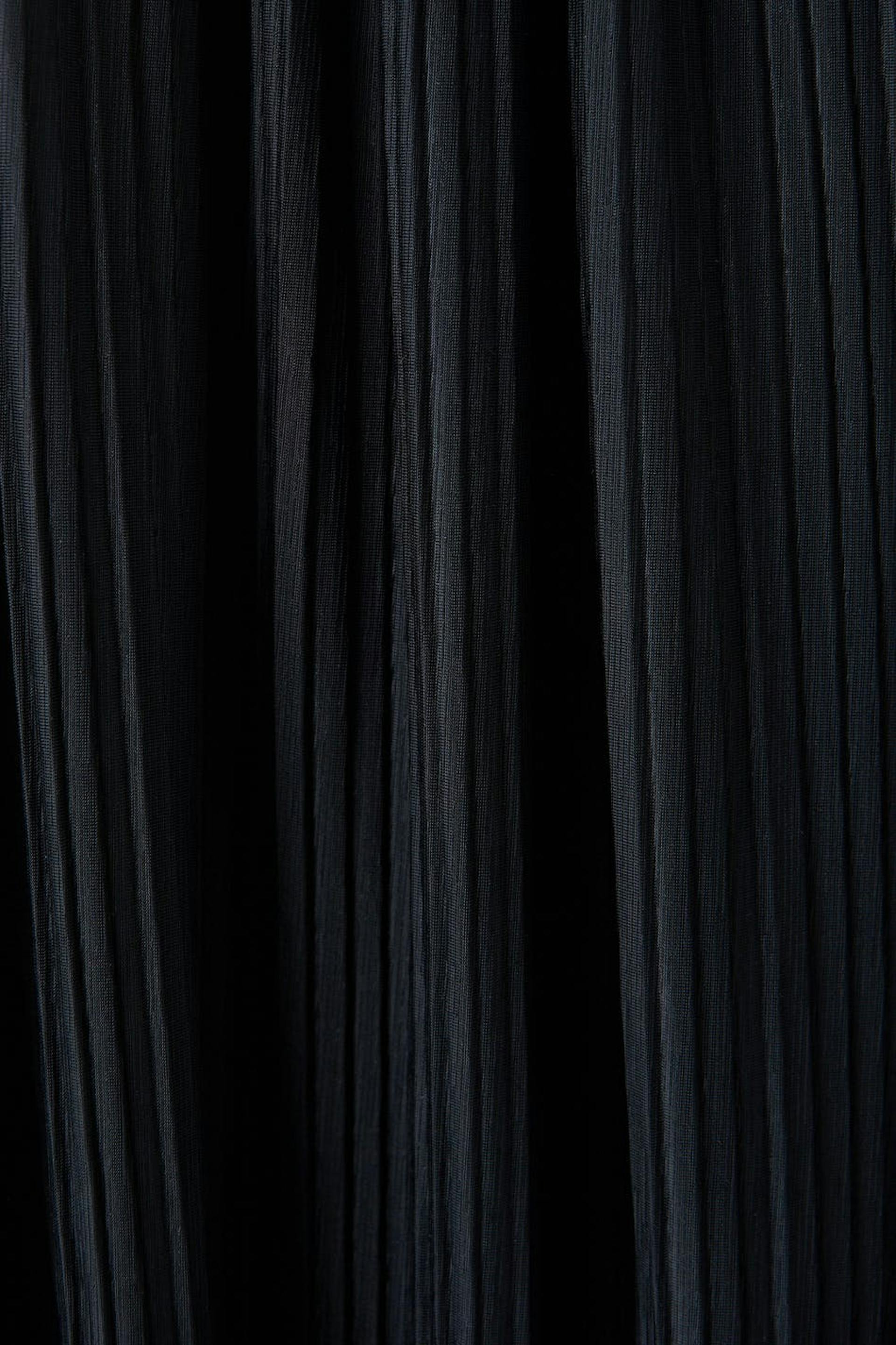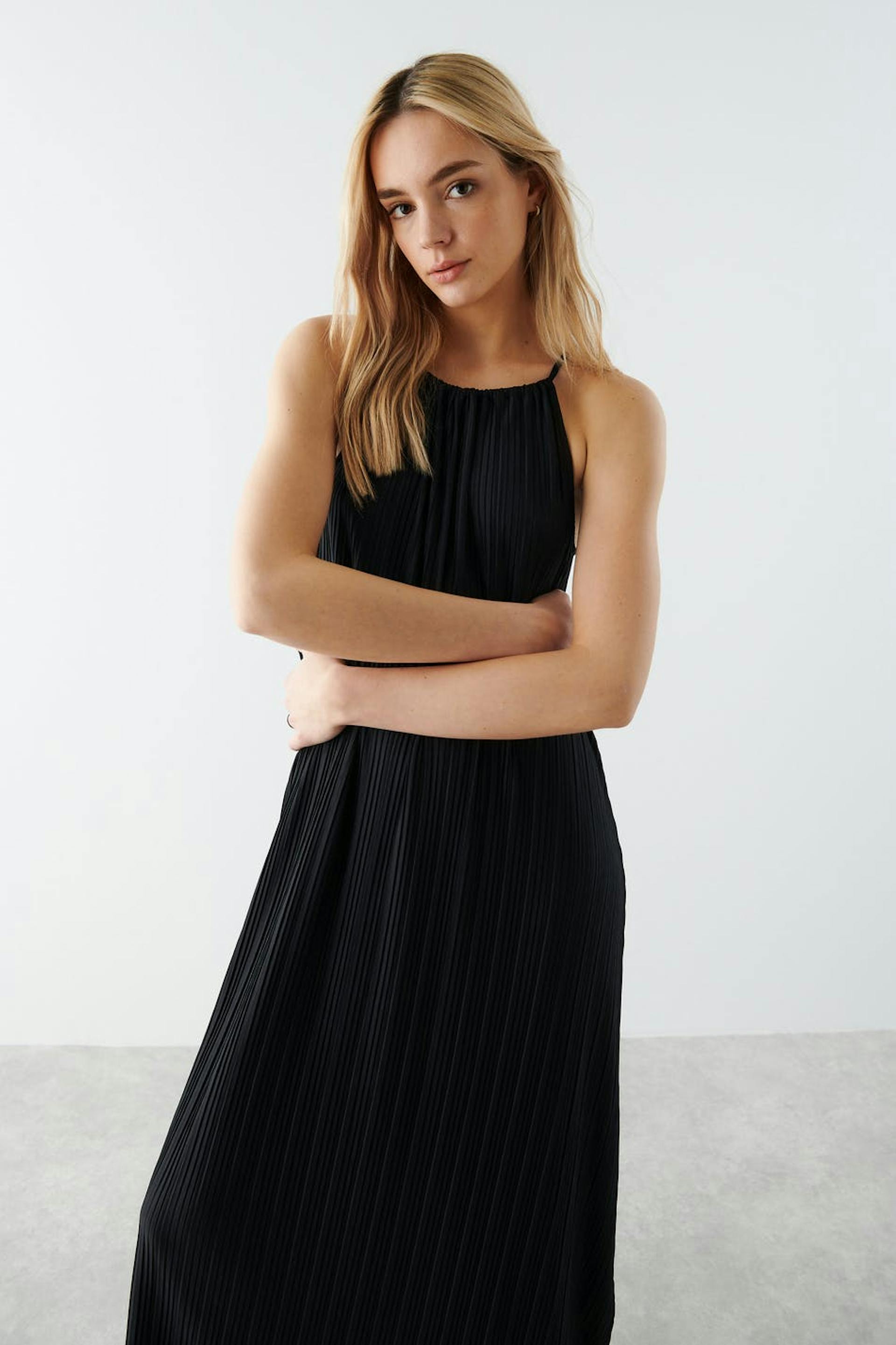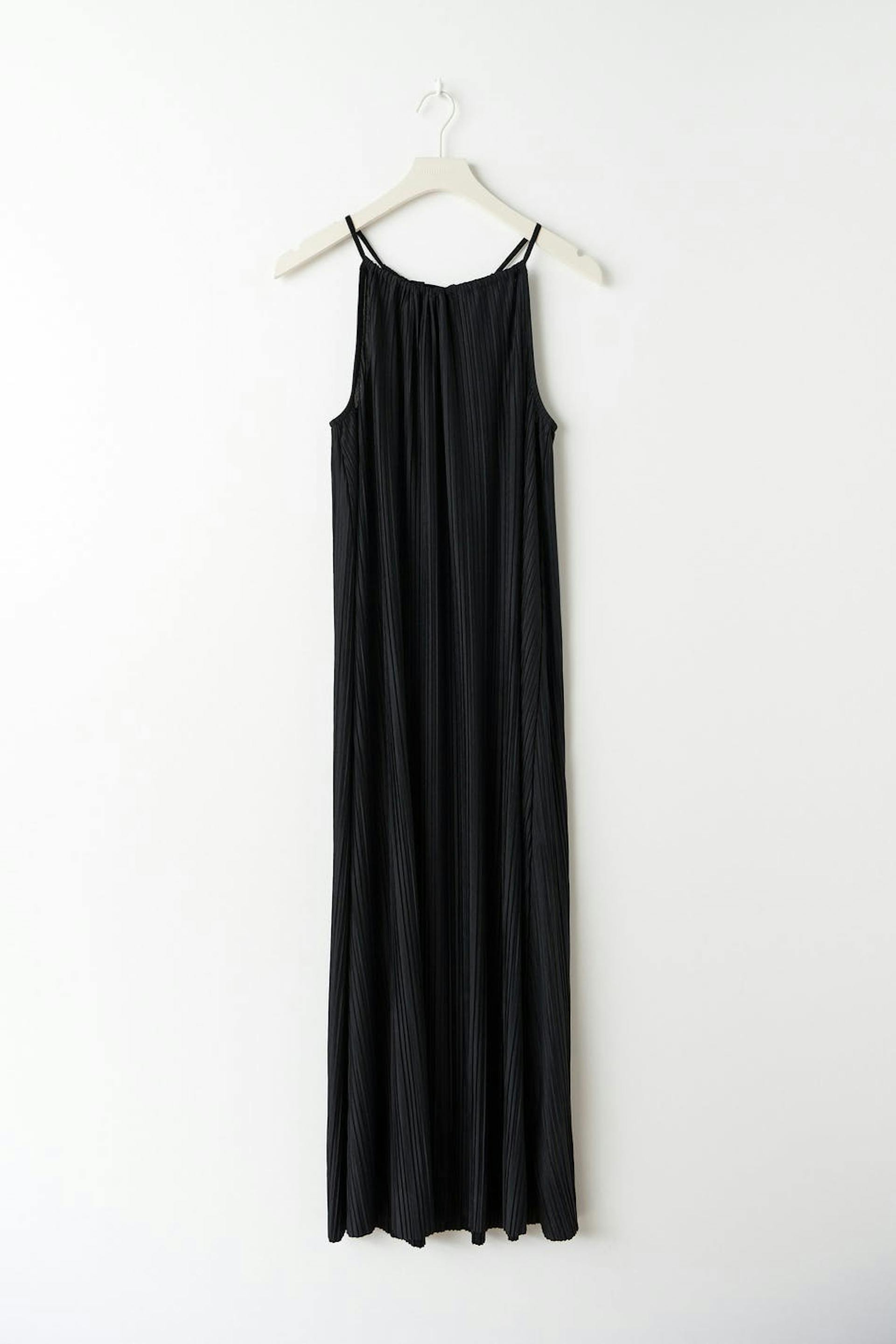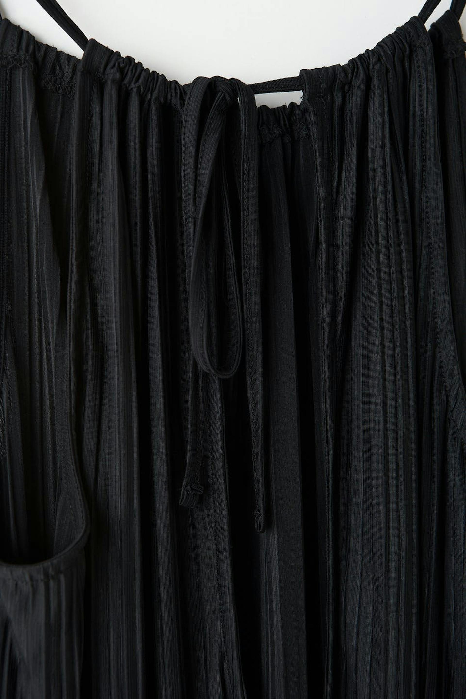 Klänning med en normal passform. Klänningen är svart och har en plissering. Den har en midilängd och en knytdetalj baktill.