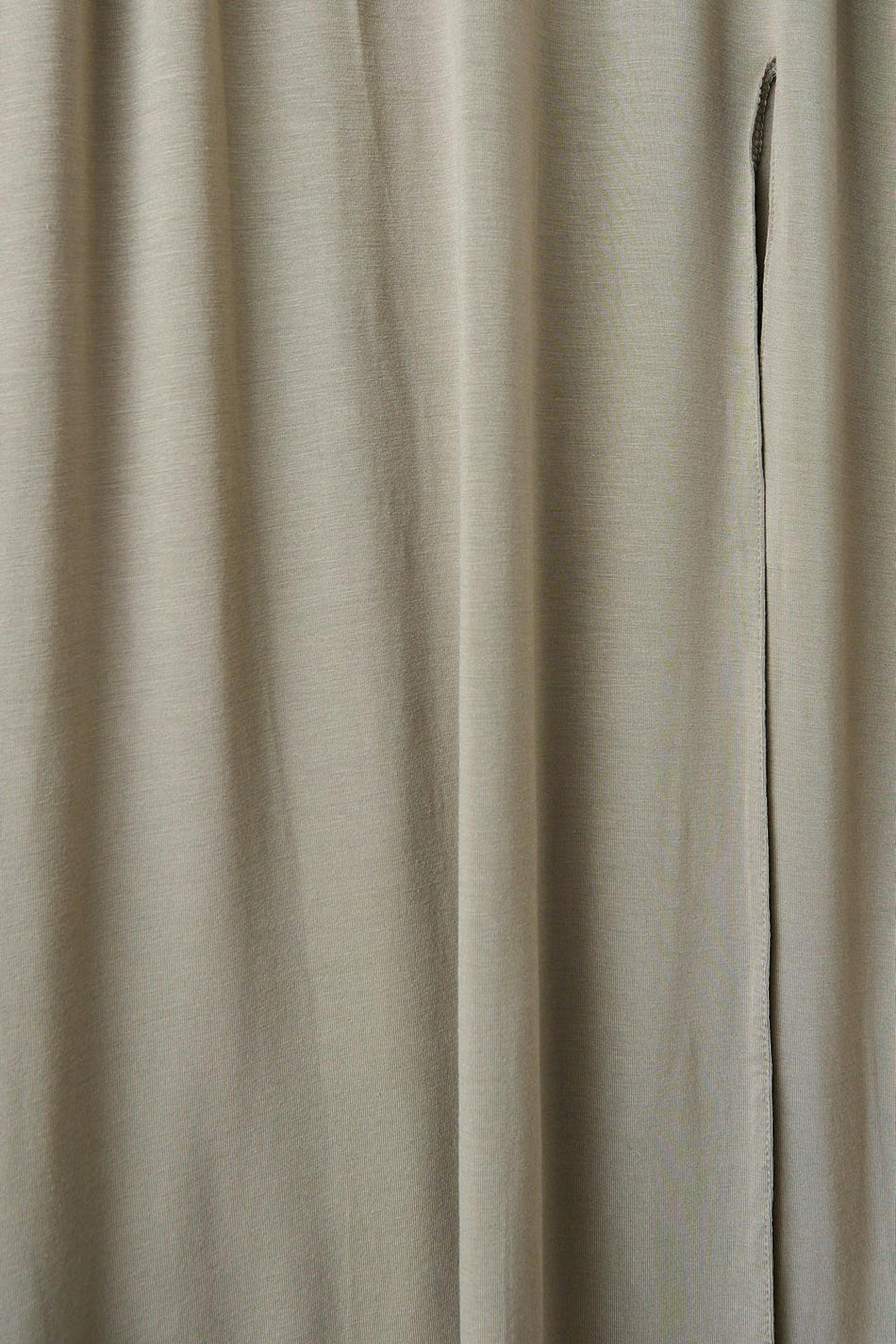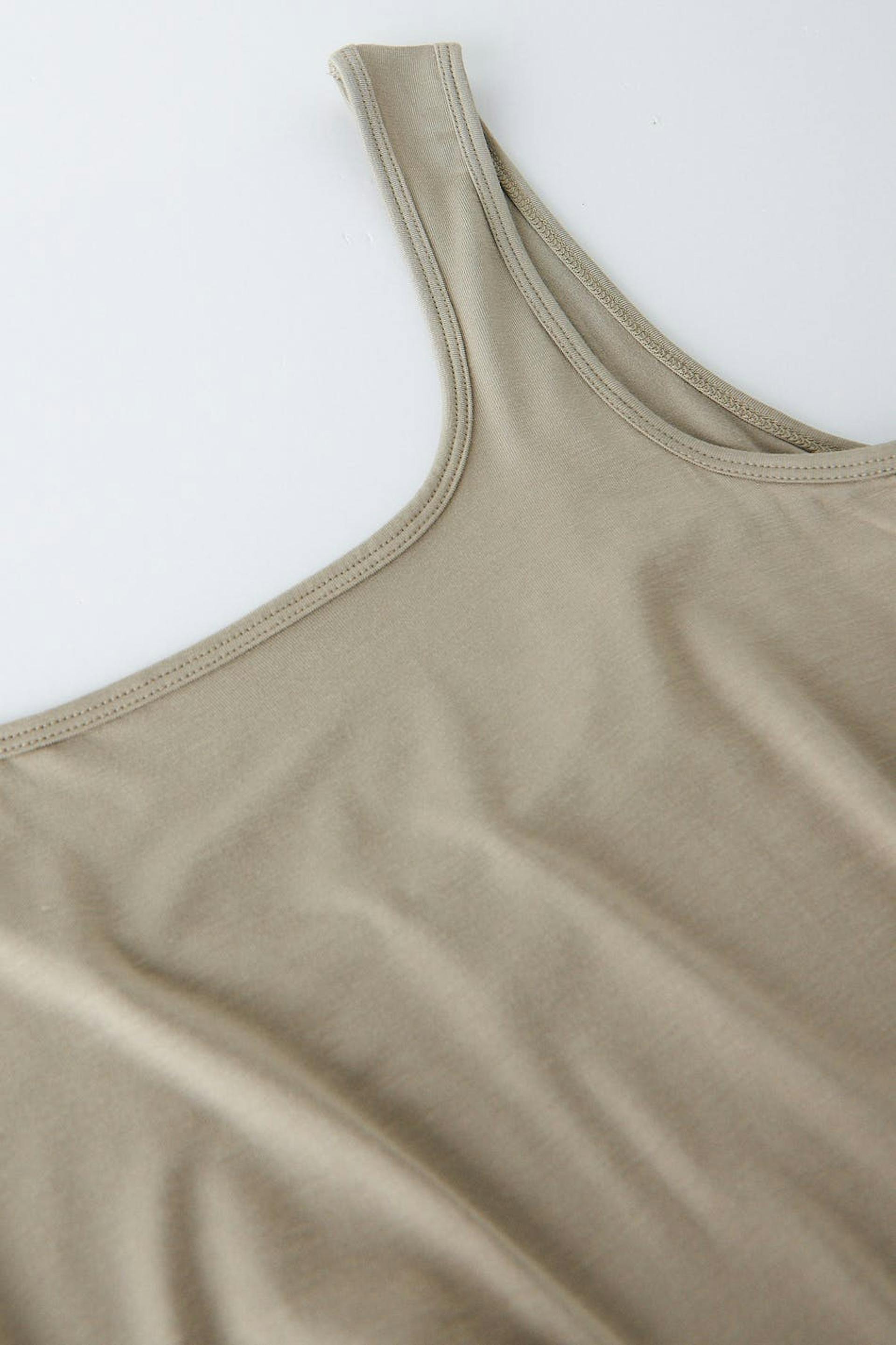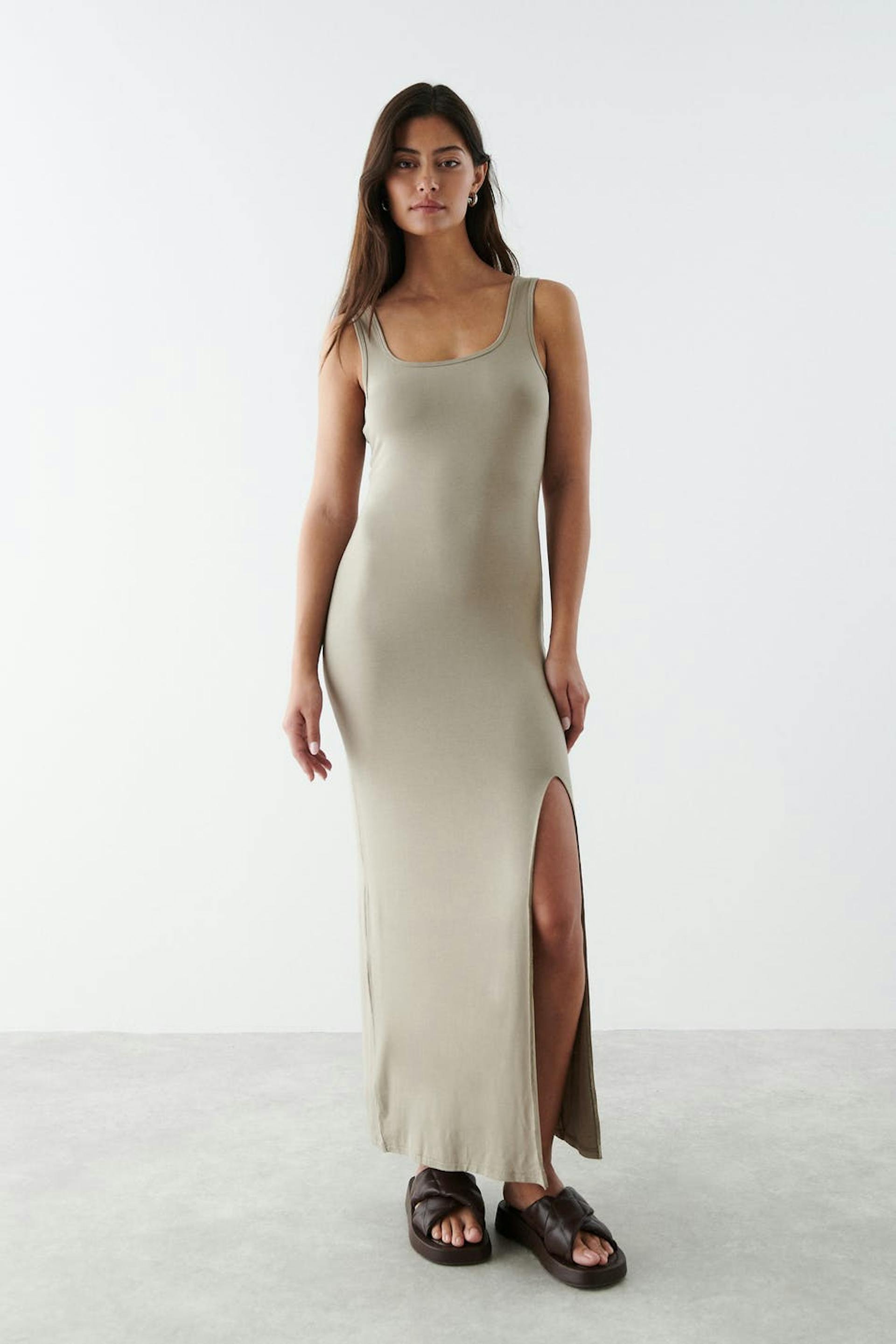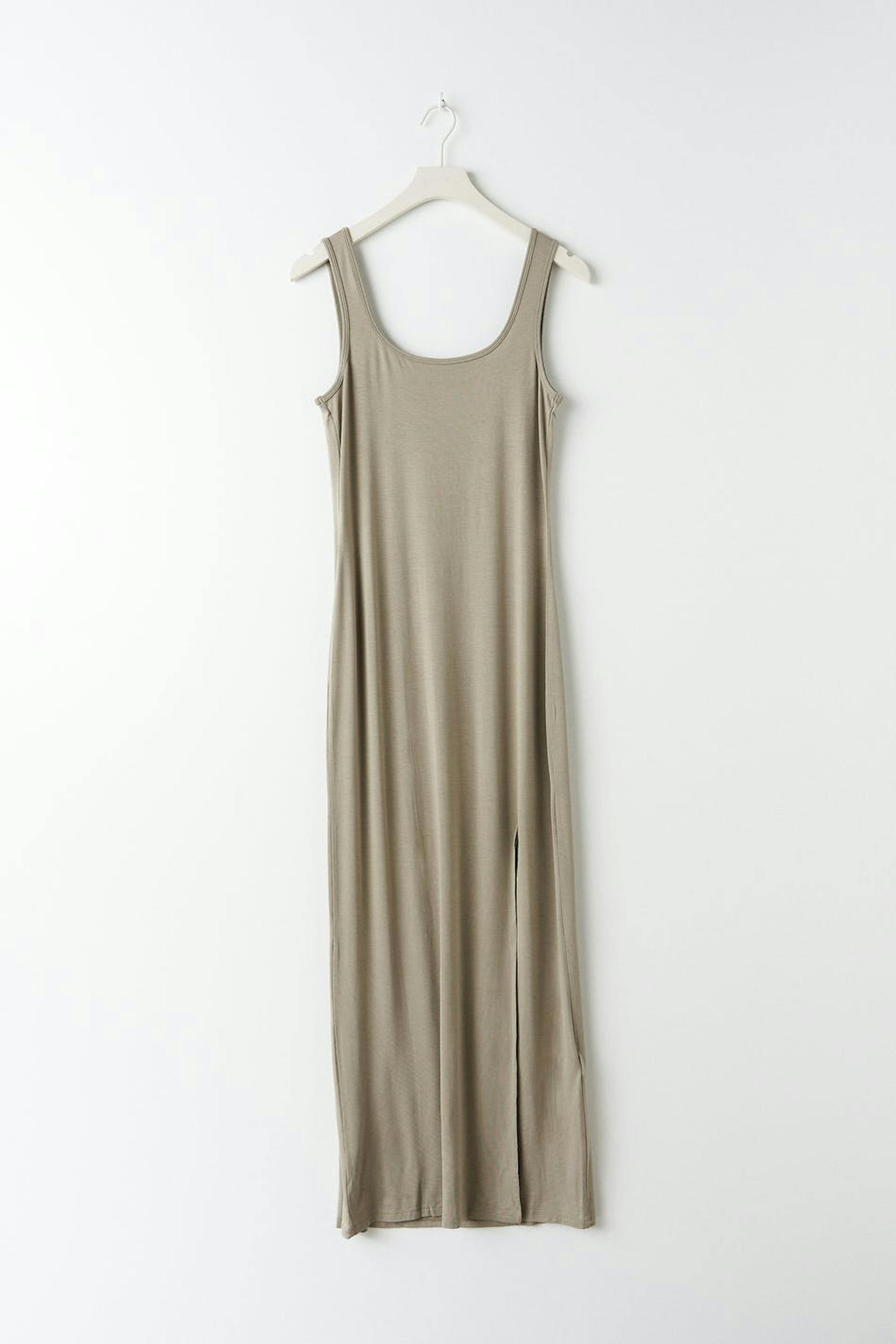 Maxiklänning i trikå med hög slits framtill. Klänningen är beige och har en figurnära passform. Den har en fyrkantig halsringning och breda axelband.
