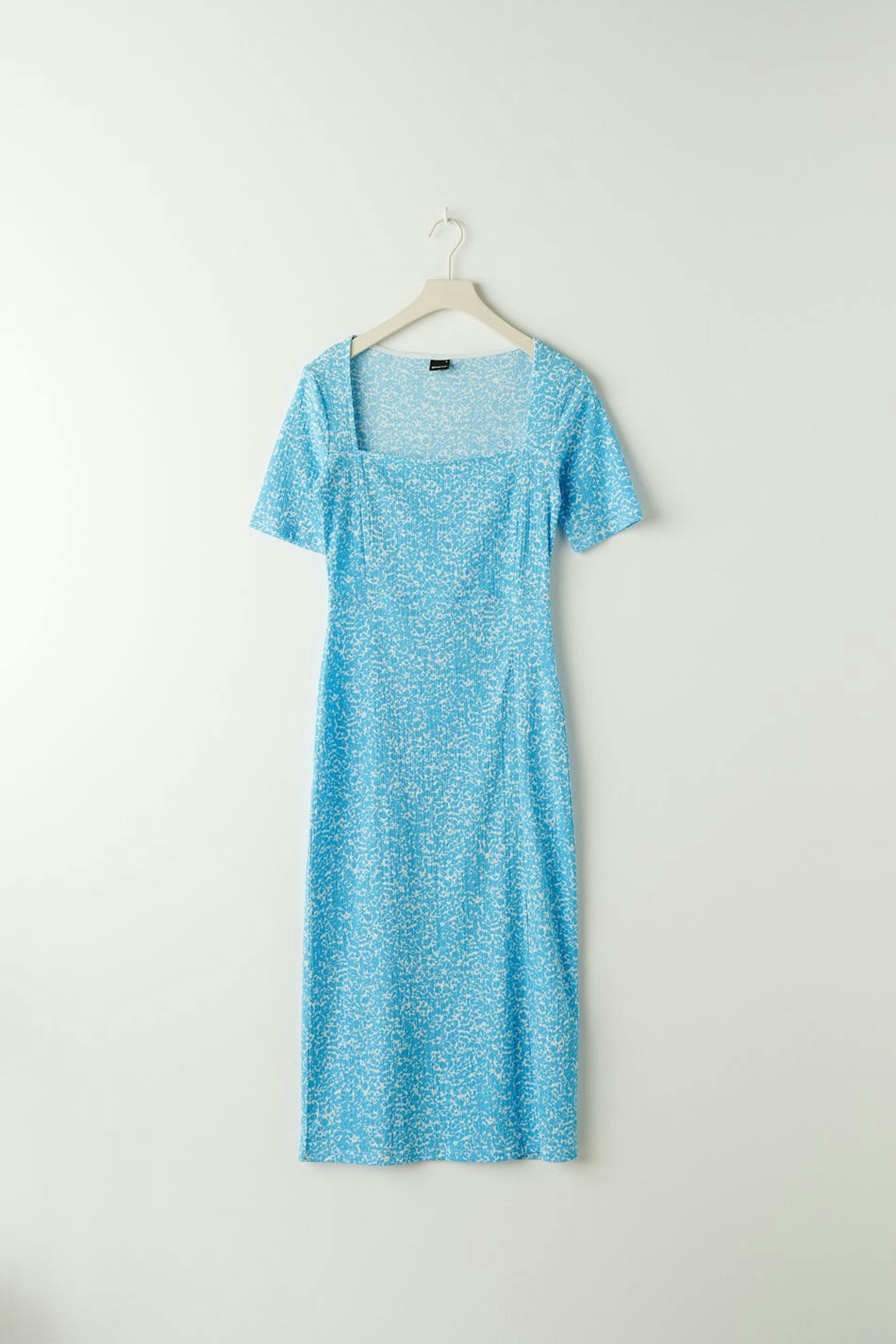 Midiklänning i trikå med fyrkantig halsringning. Klänningen är blå och har en slitsdetalj.