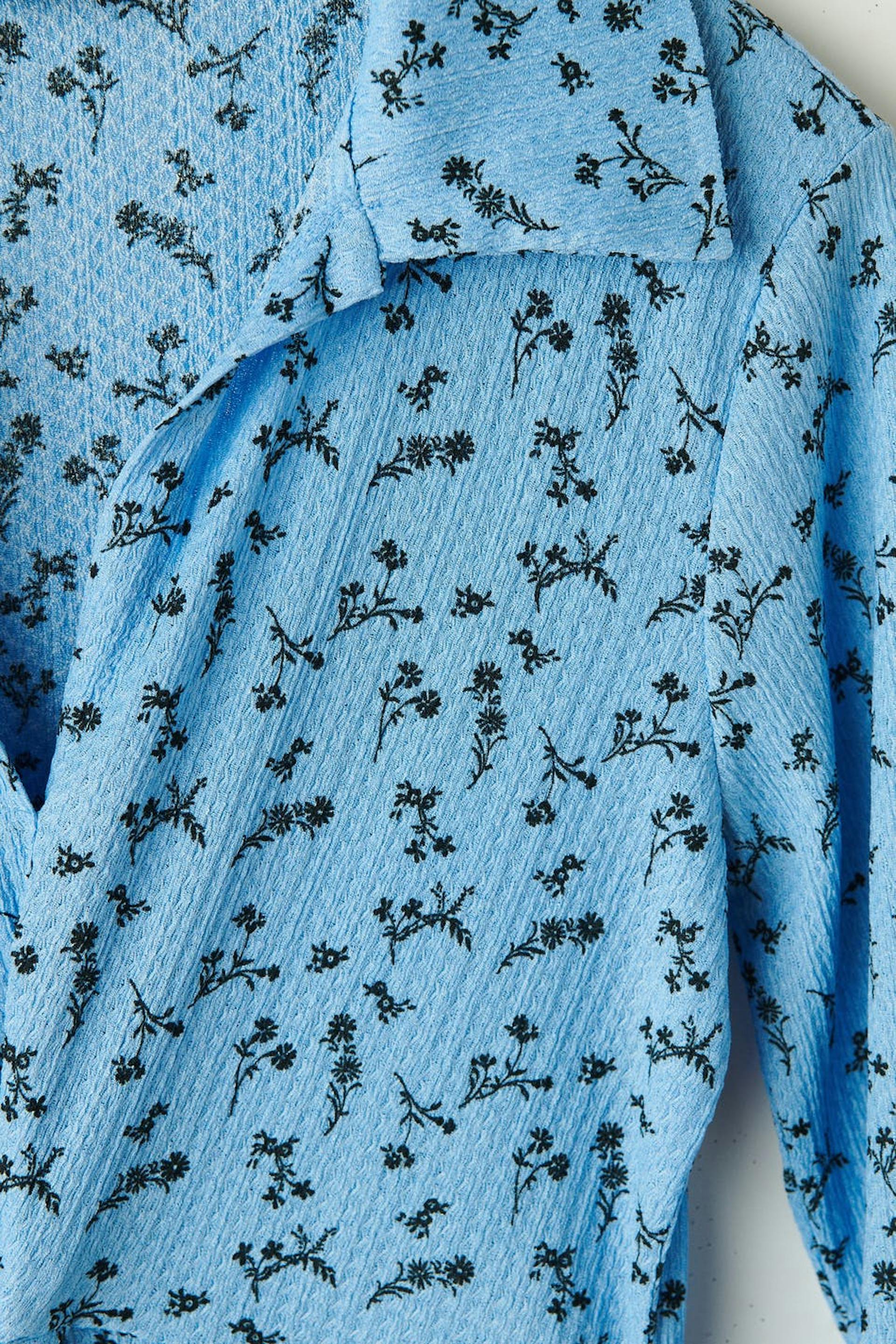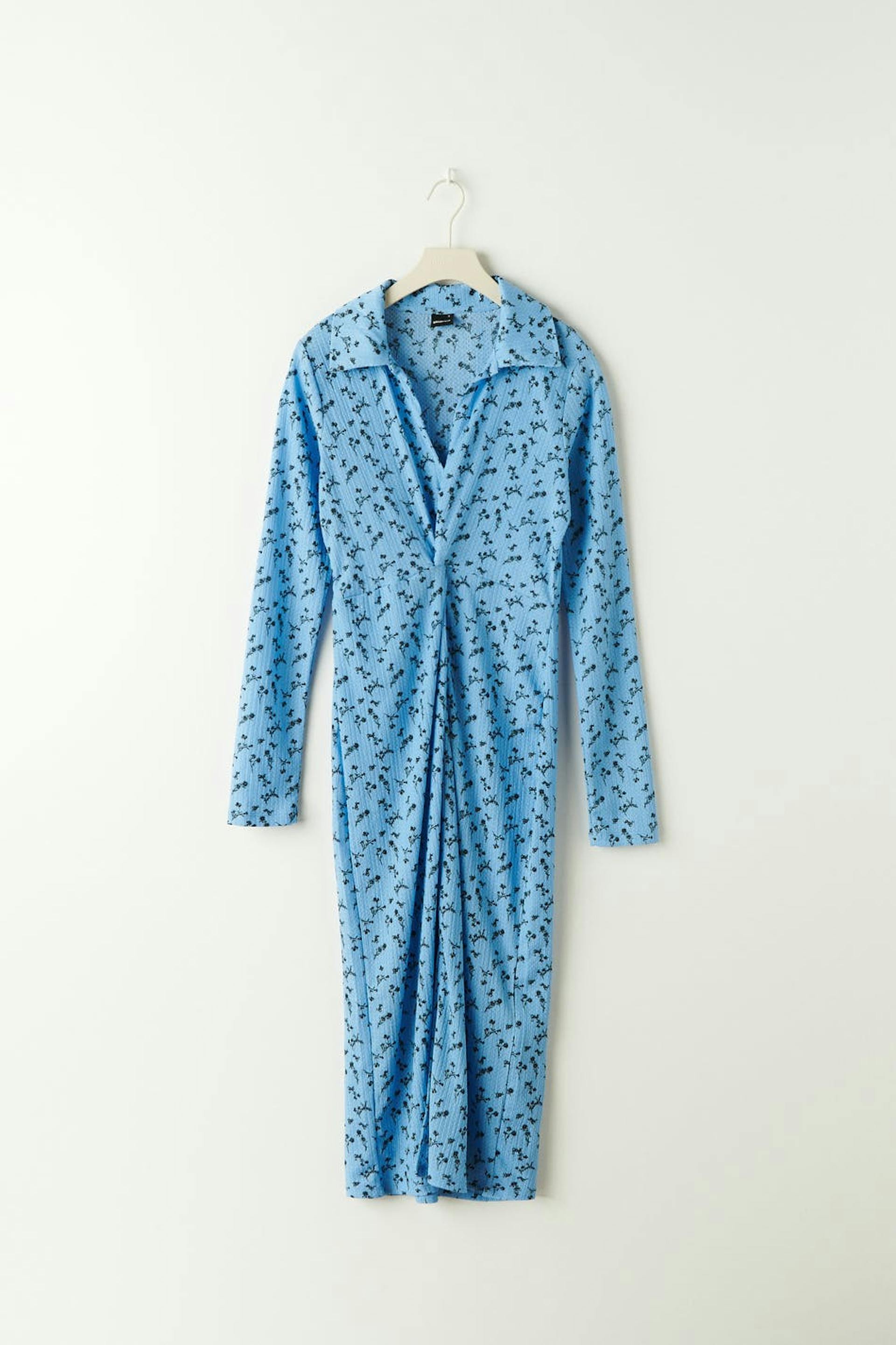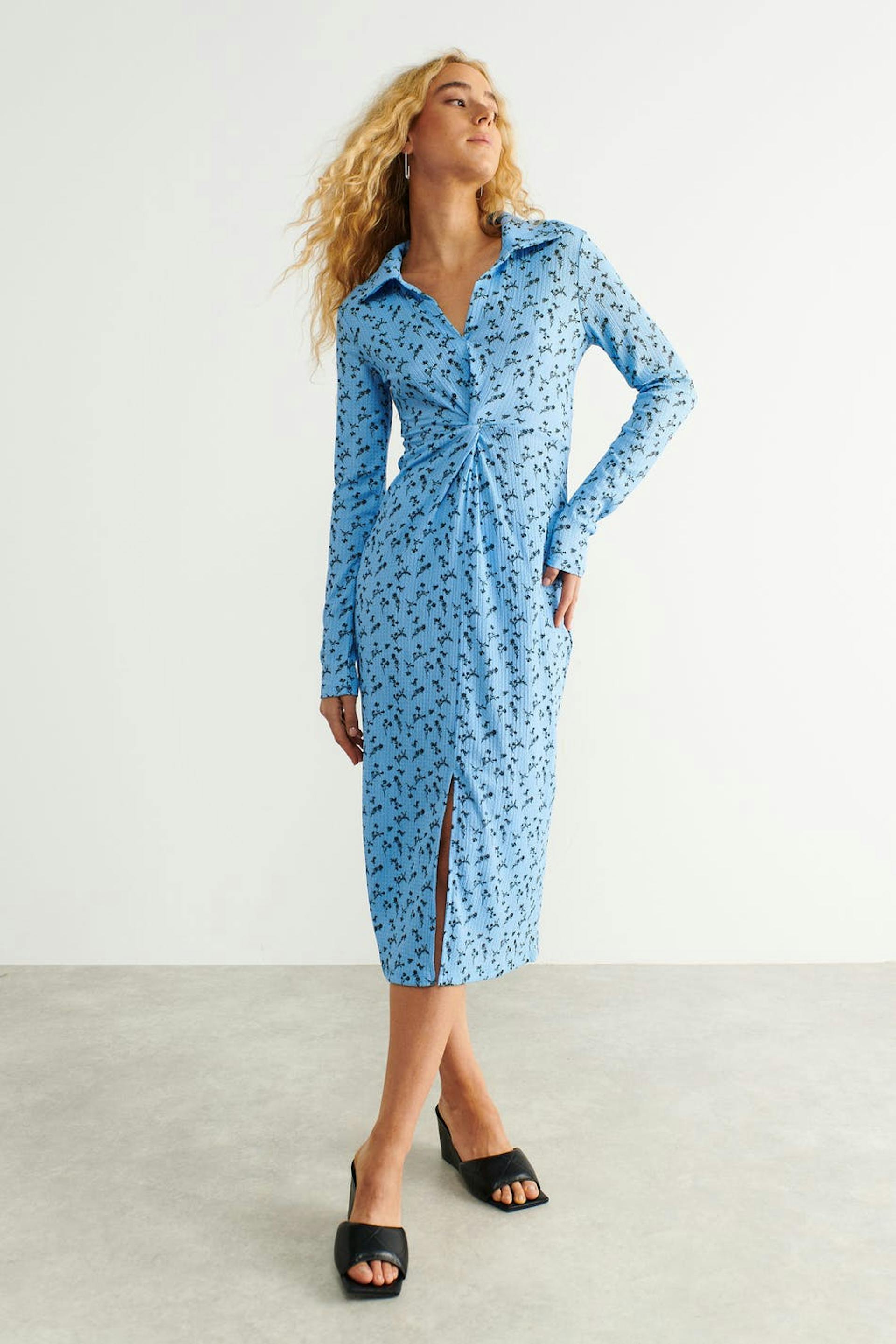 Långärmad midiklänning med en tvinnad detalj framtill. Klänningen är blå och har krage. Den har v-ringning och slits fram.