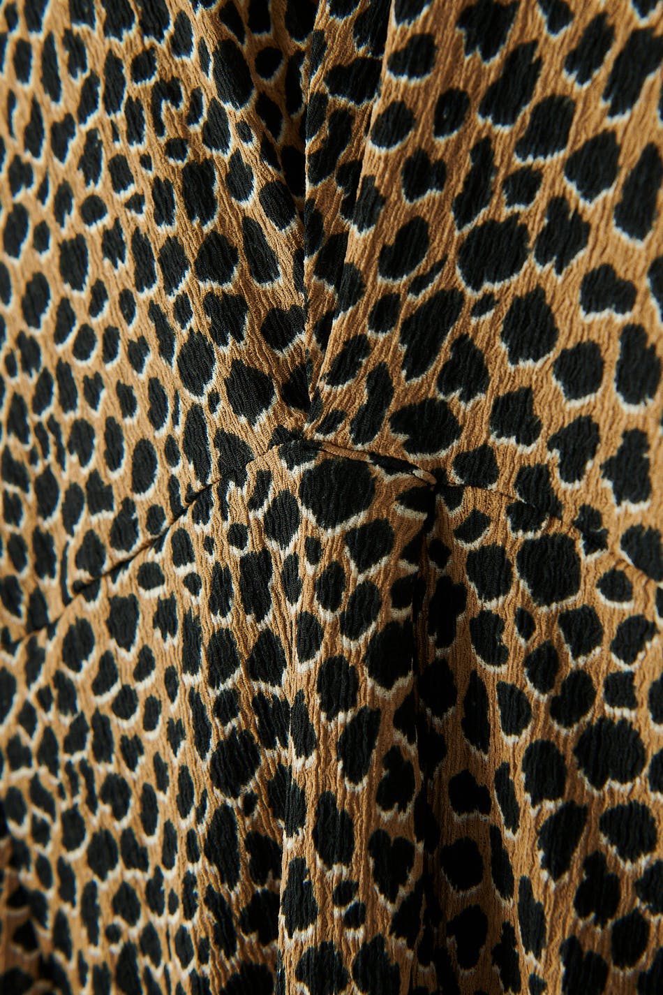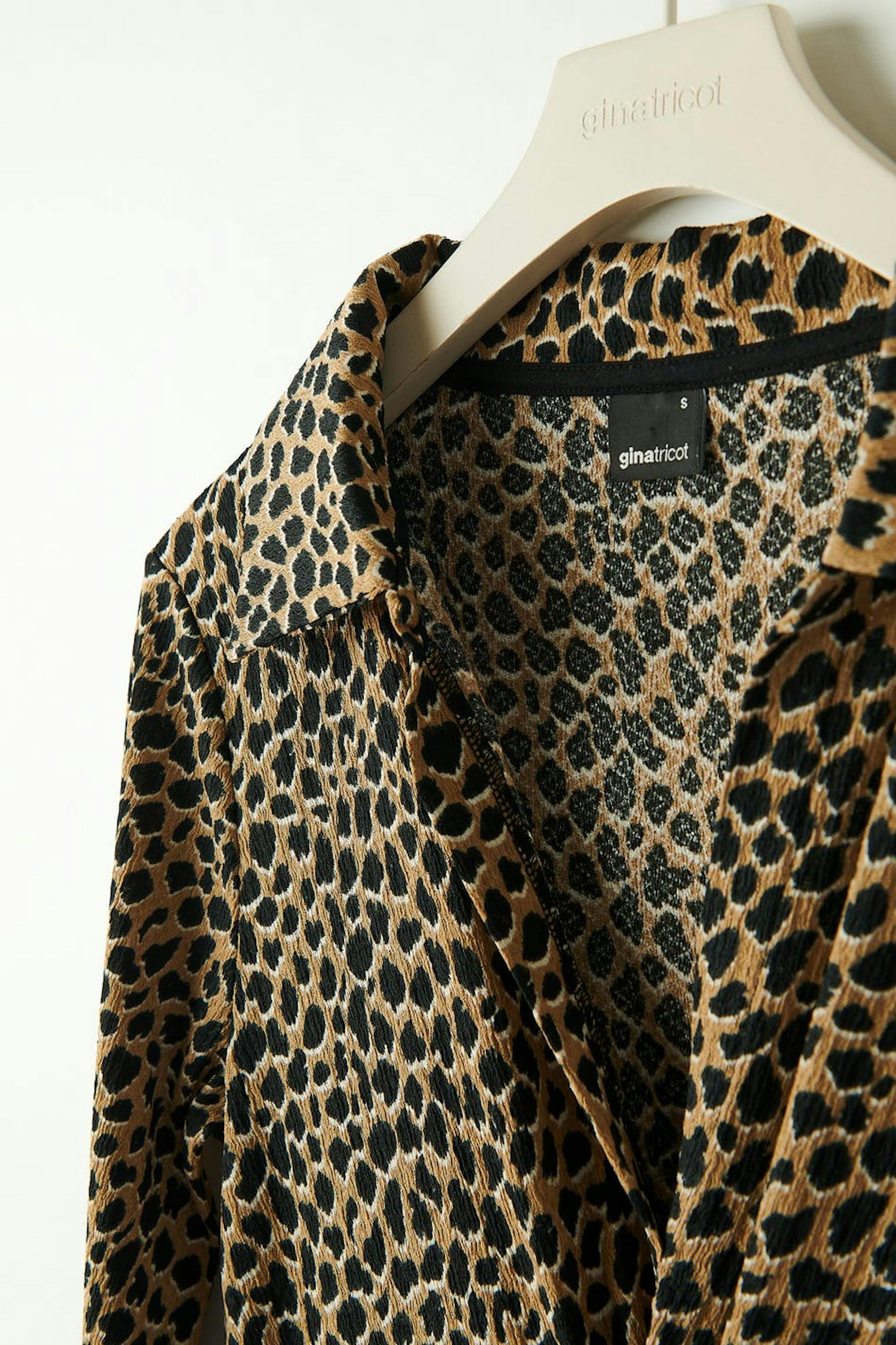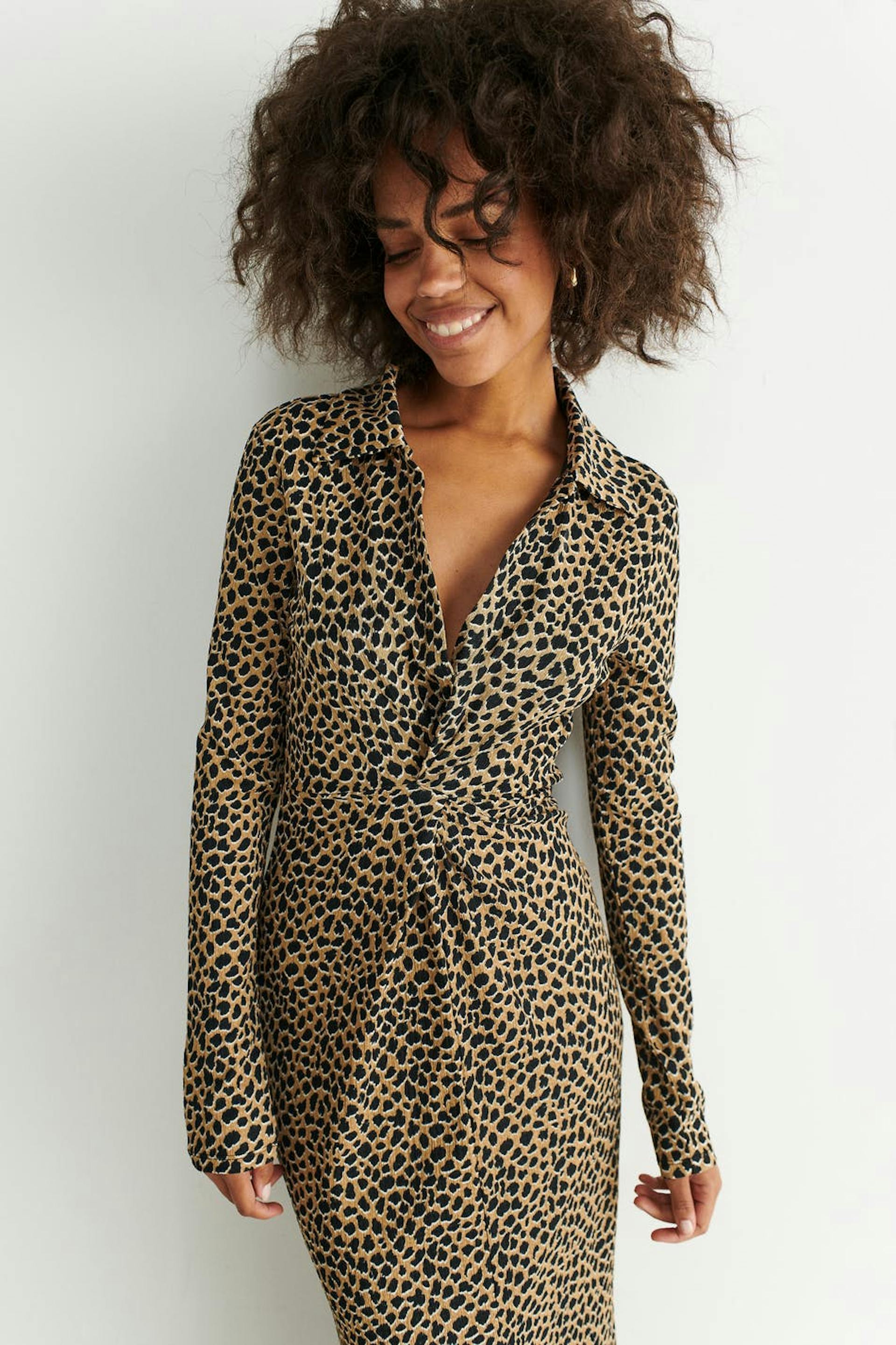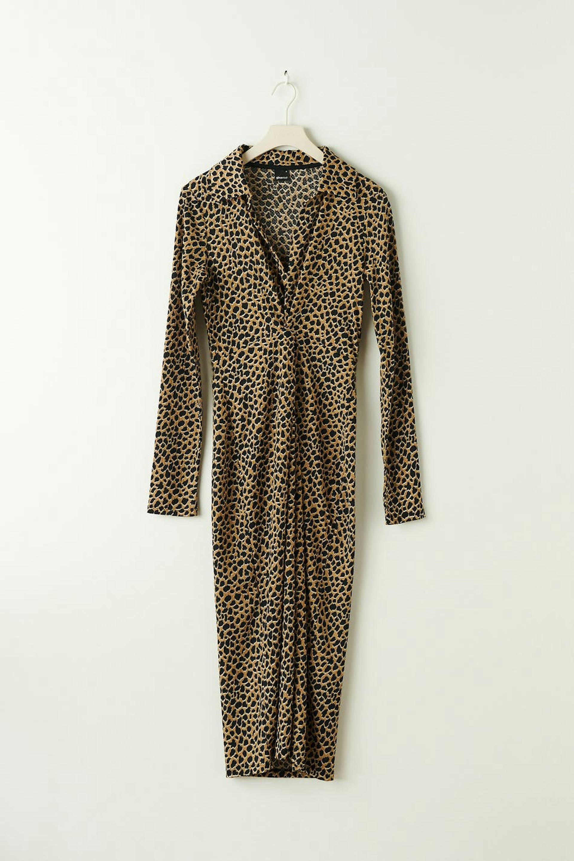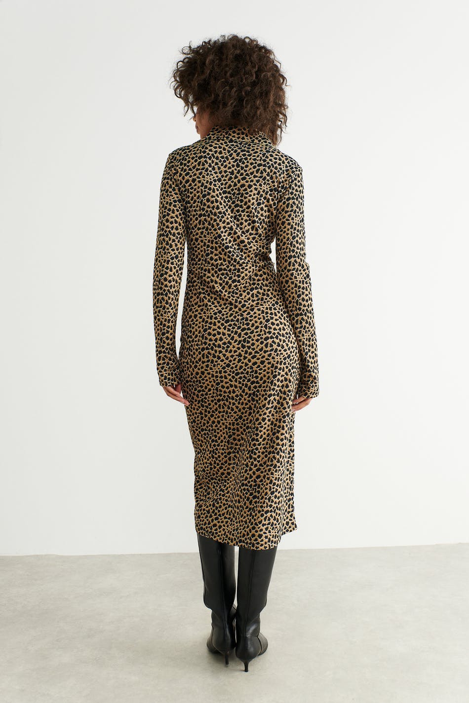 Leopardmönstrad klänning med en tvinnad detalj framtill. Klänningen är långärmad och har krage. Den har v-ringning och slits fram.