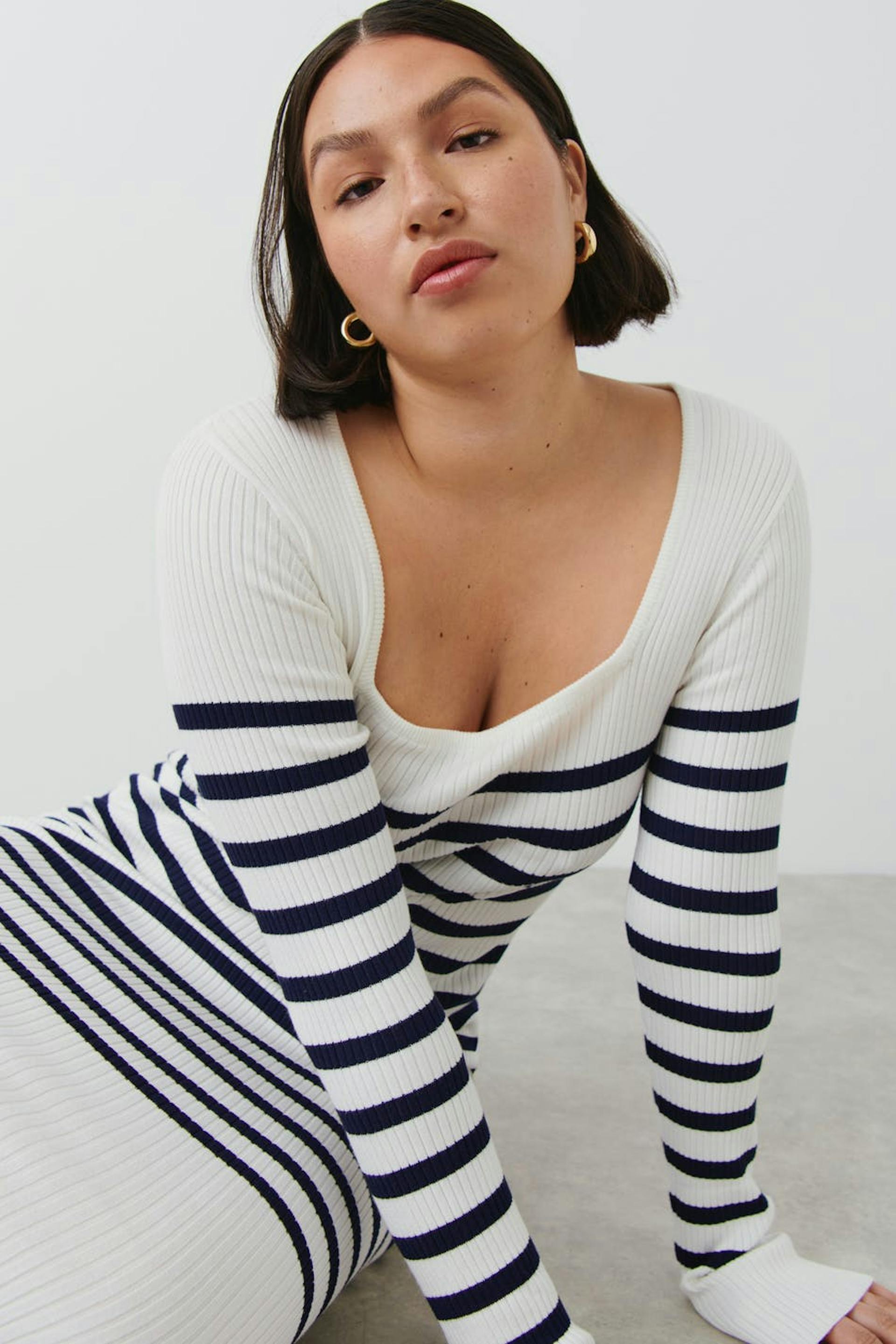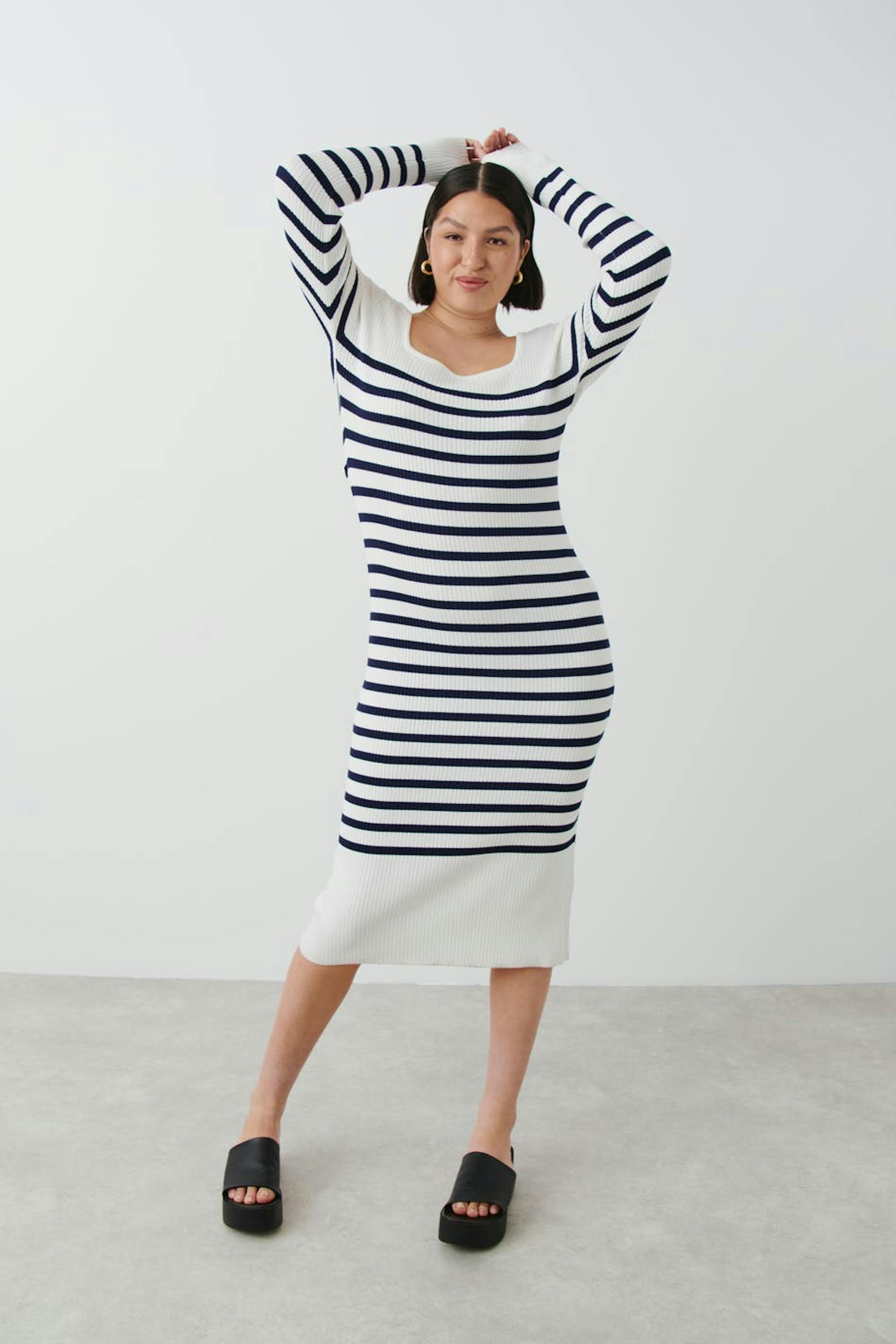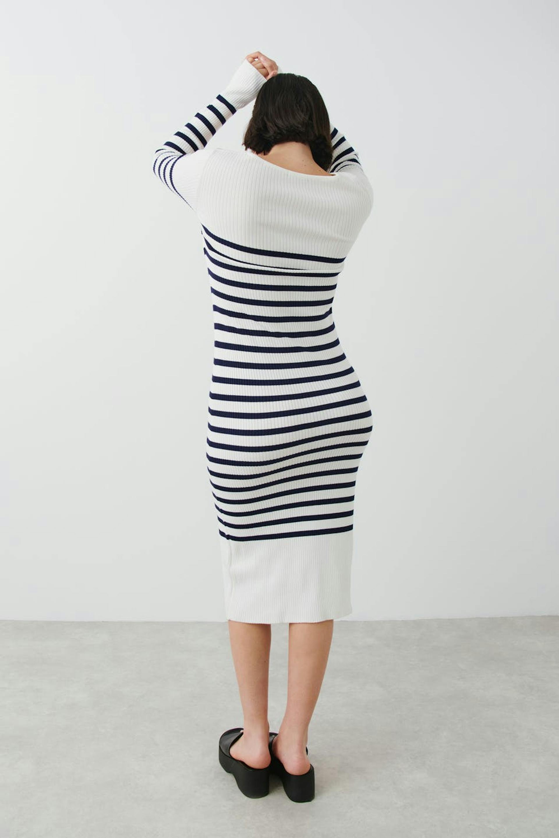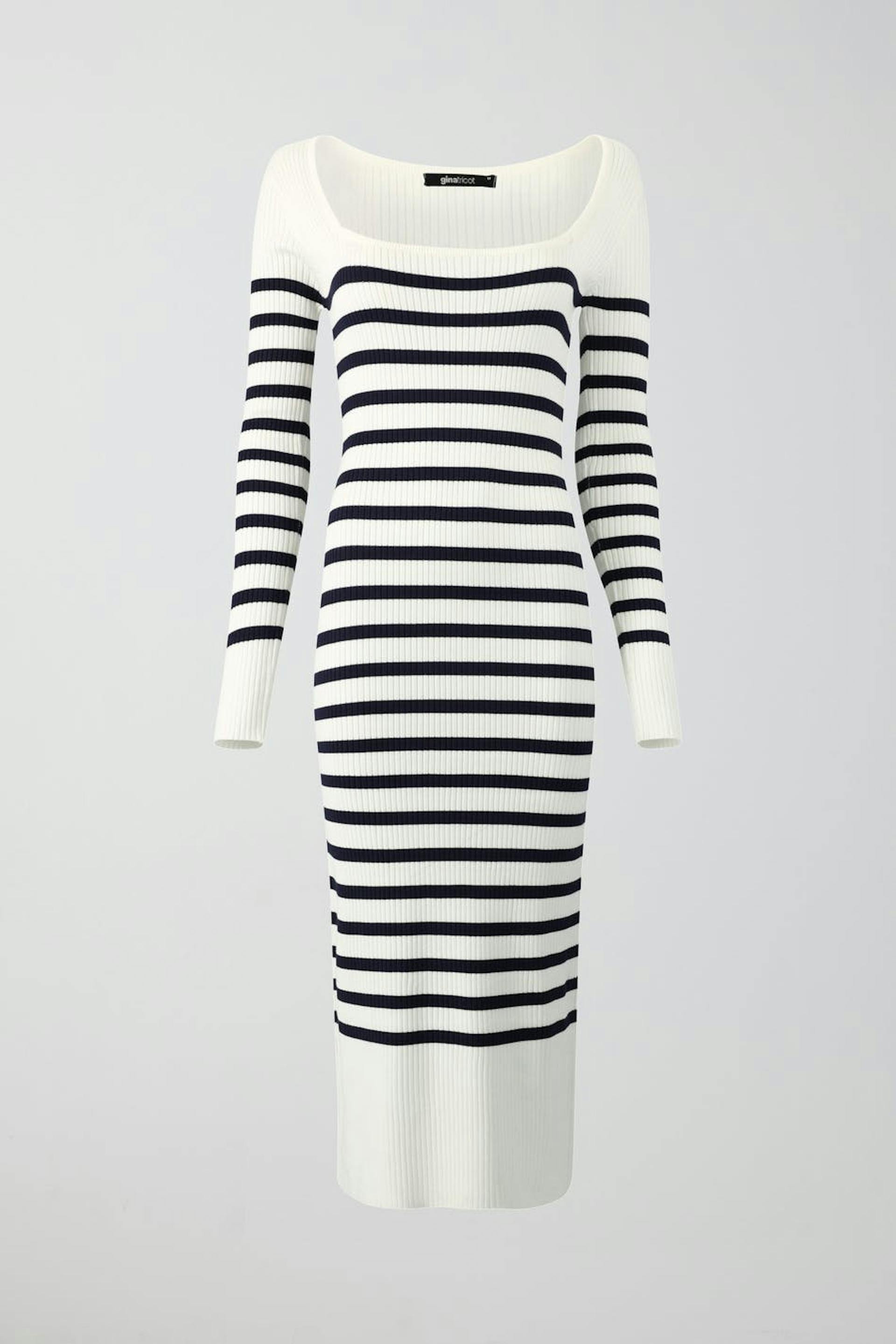 Randig klänning med fyrkantig halsringning. Klänningen är vit, stickad och långärmad. Den har ribbad kvalitet och en midilängd.