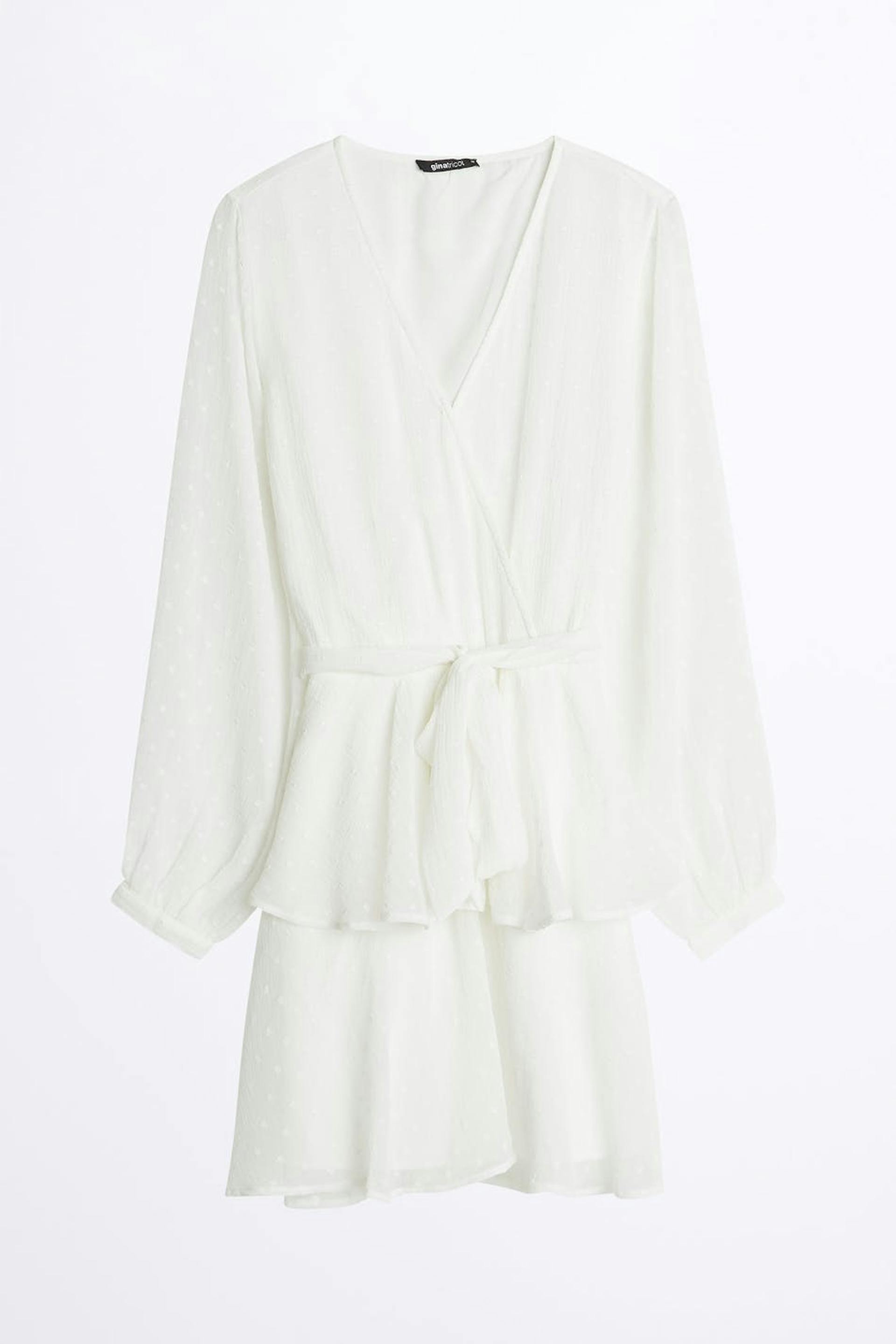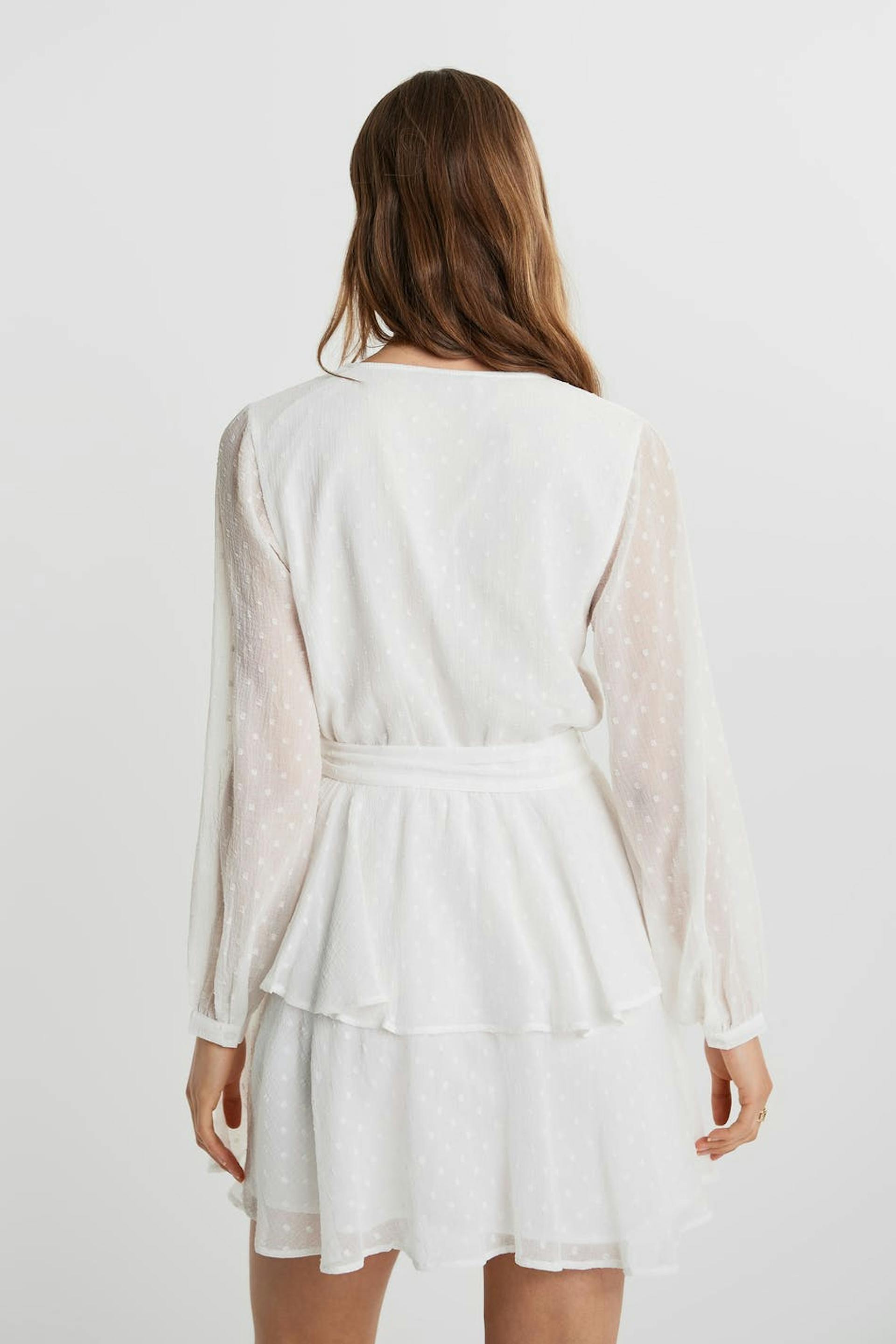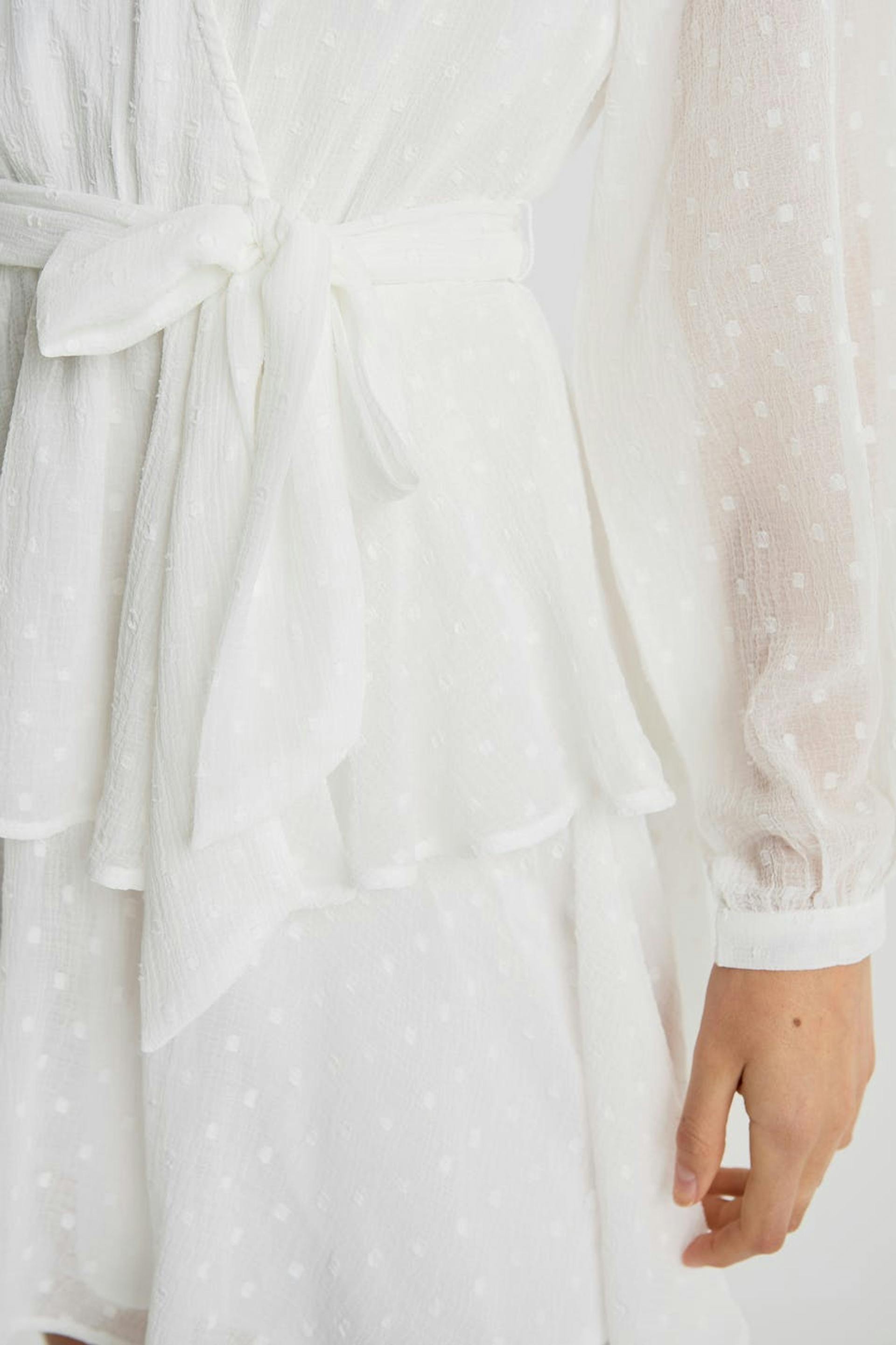 Klänning med volanger på kjolen. Klänningen är perfekt för festen och vit och har långa, transparenta ärmar. Den har en v-ringning och ett knytband i midjan.
