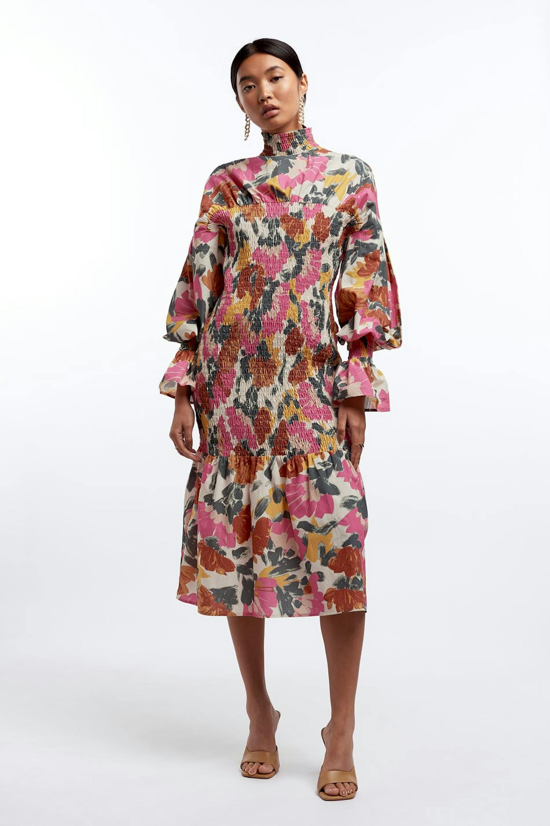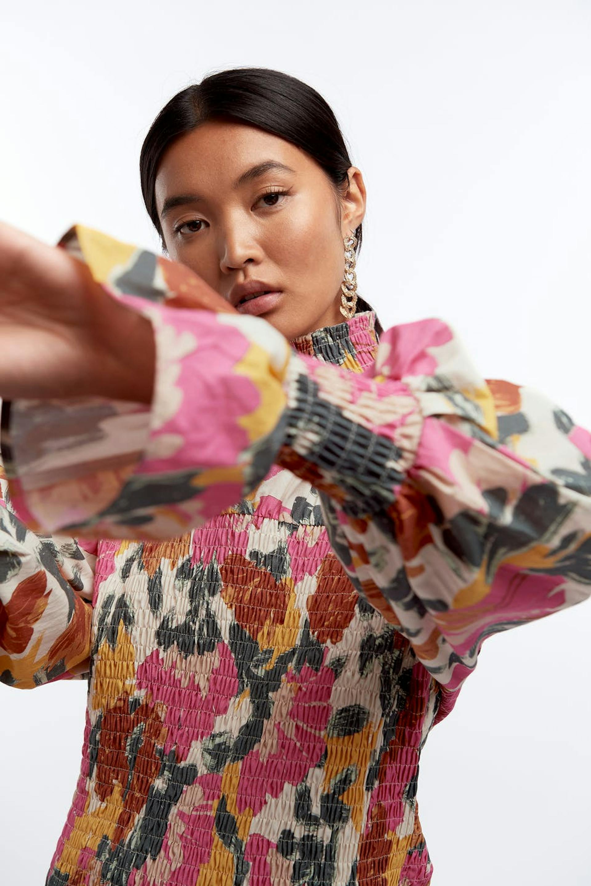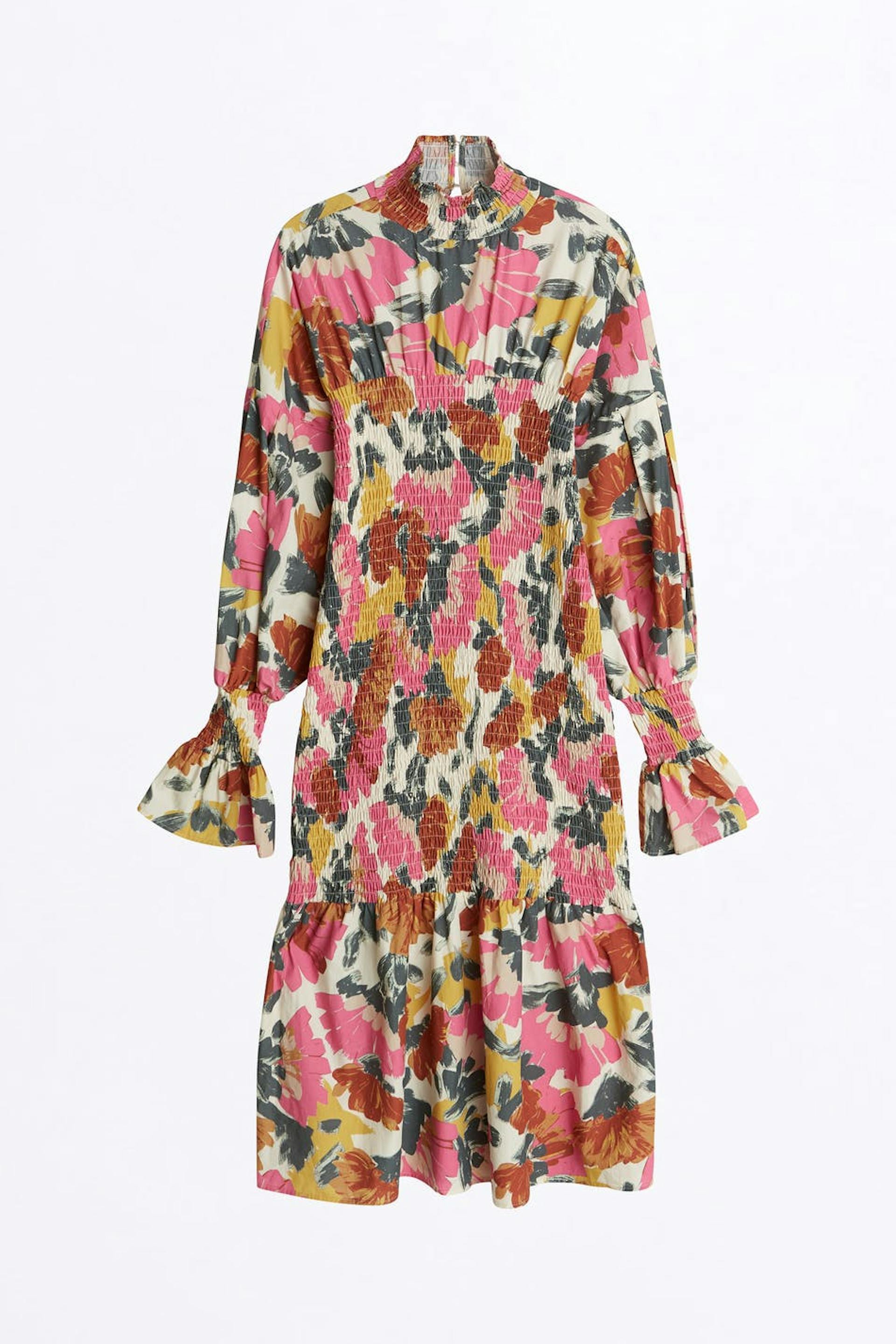 Blommig klänning med en normal passform. Klänningen är rosa och smockad och har långa puffärmar. Den har en midilängd och en hög halsringning.