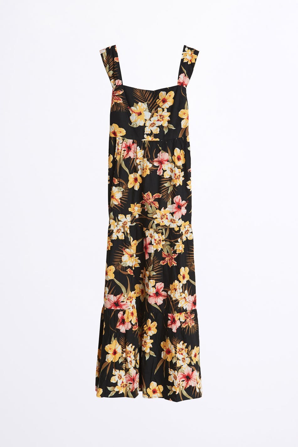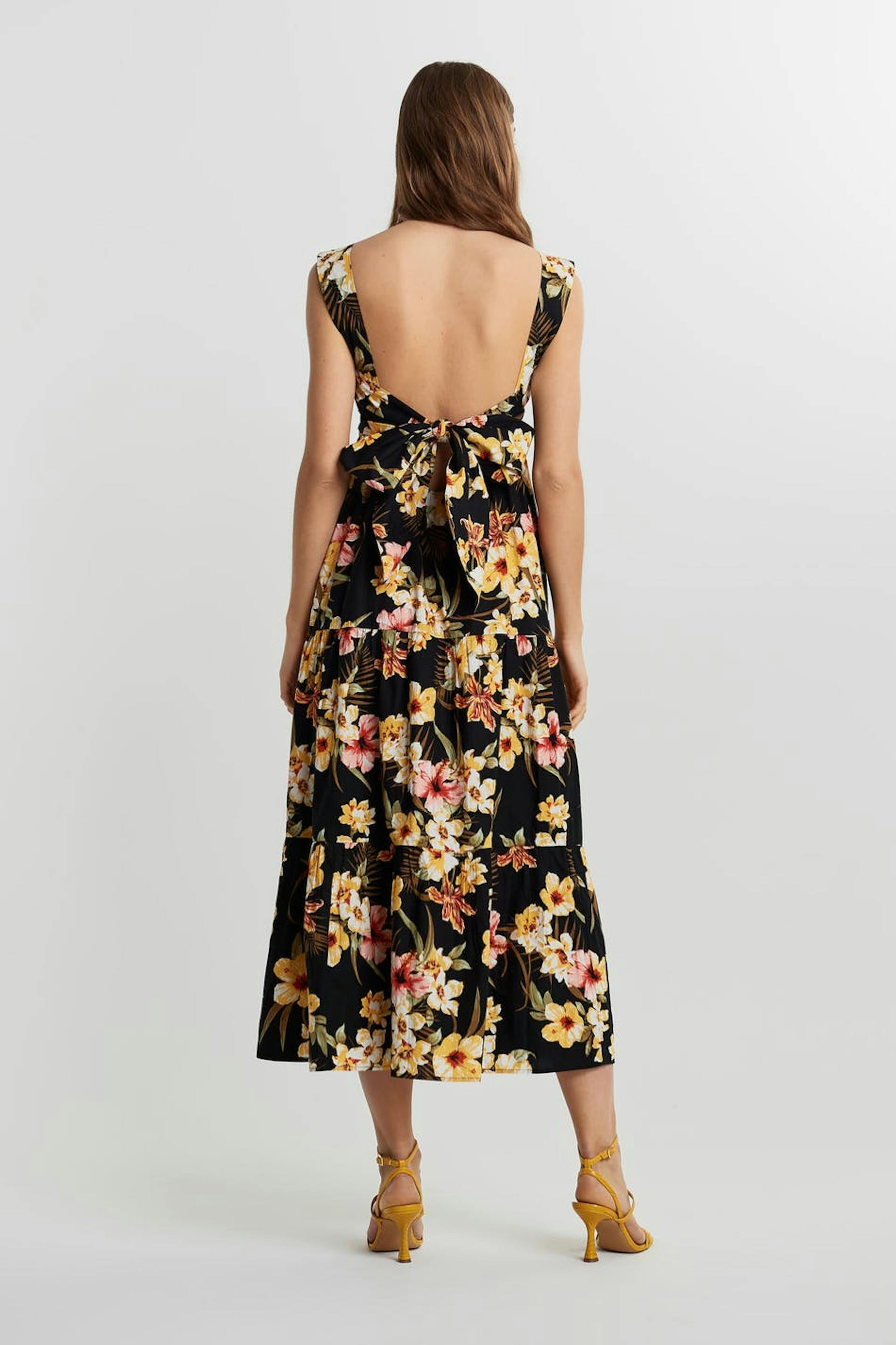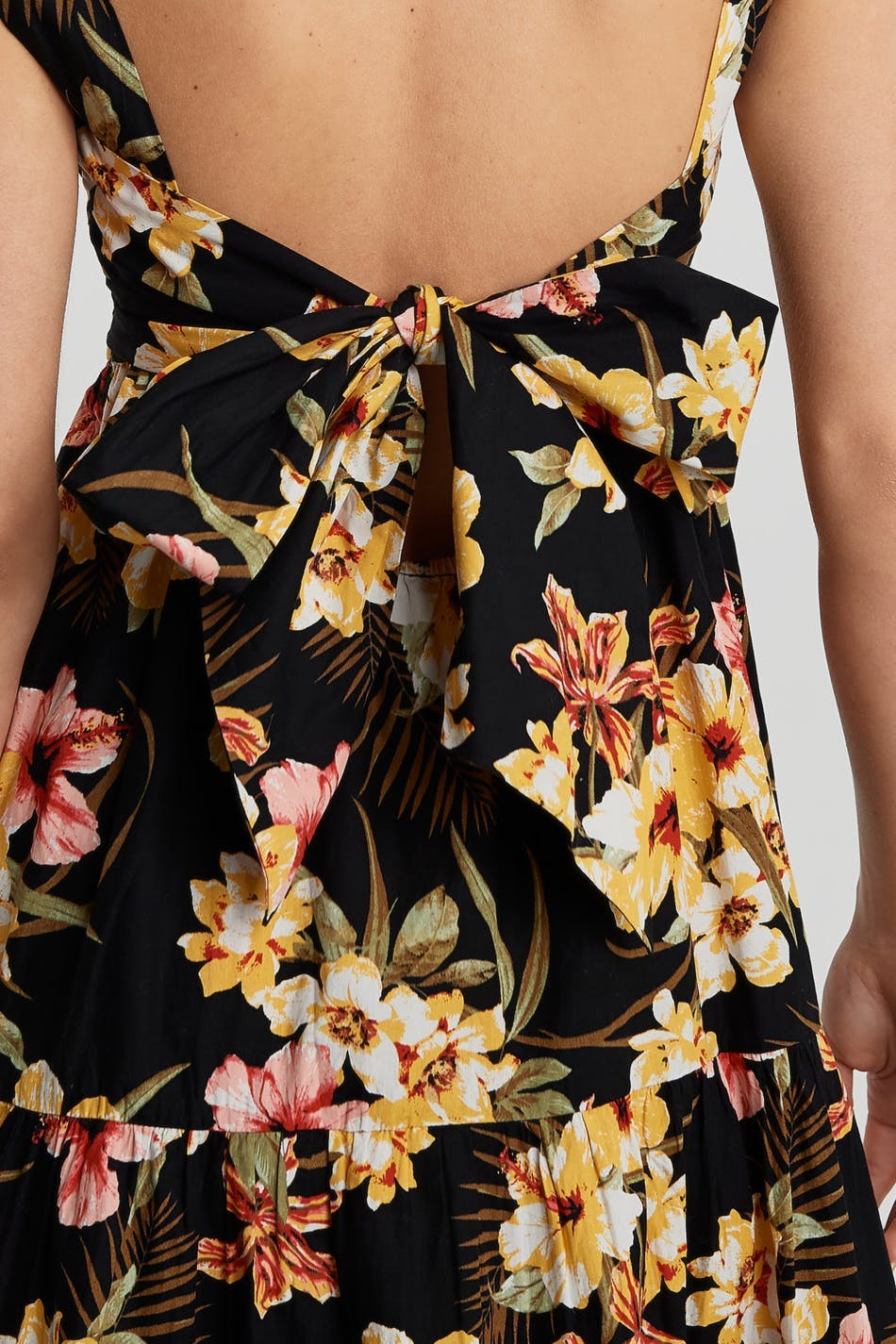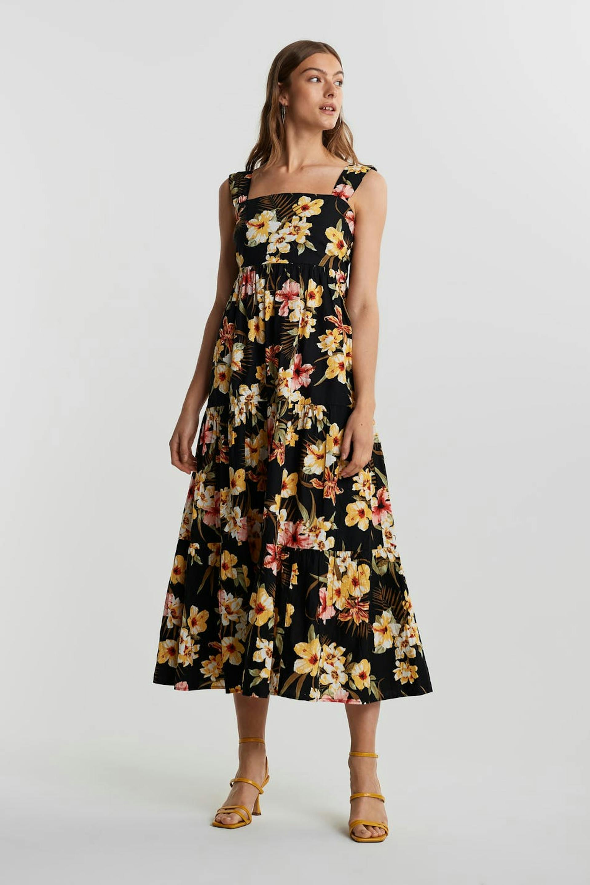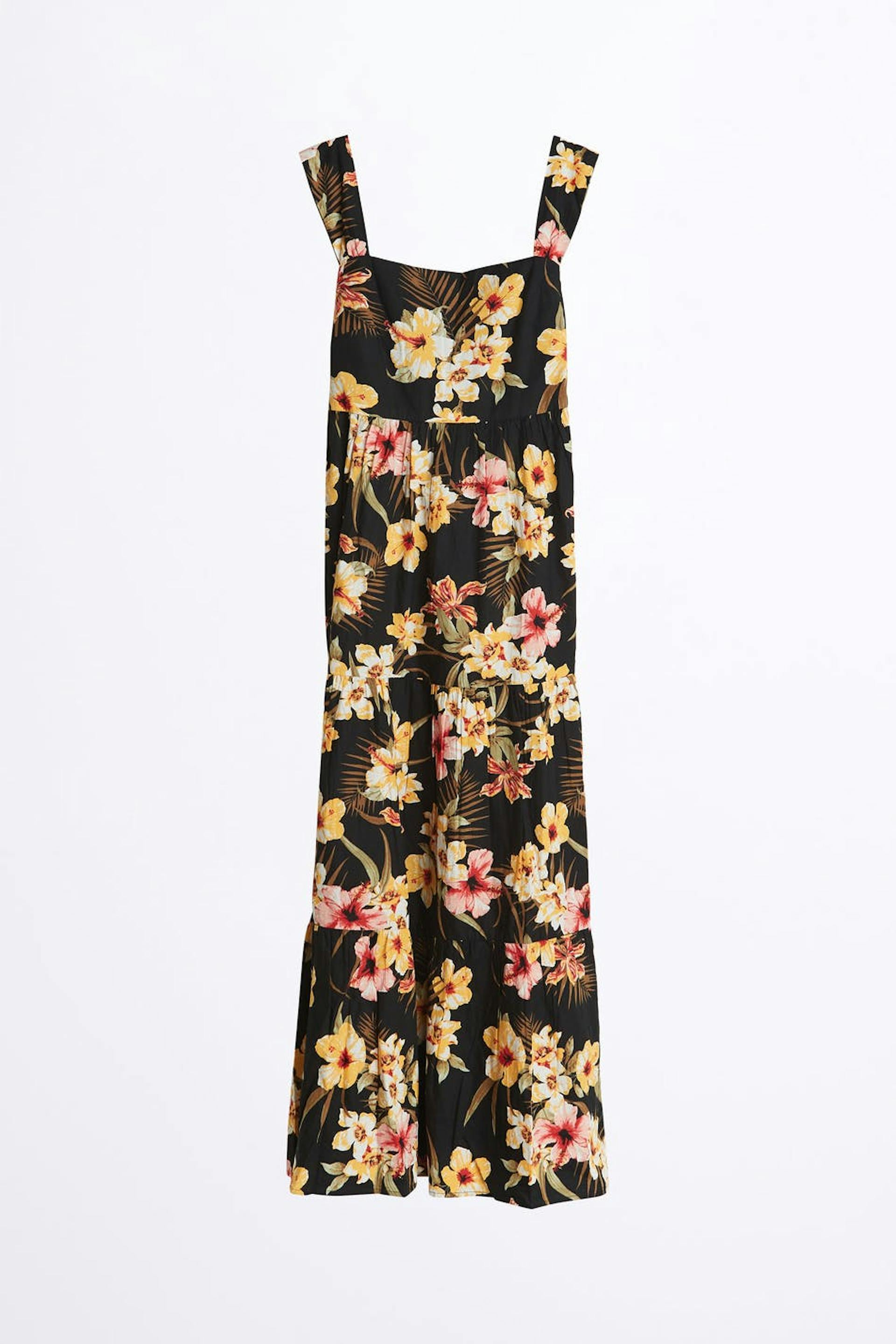 Klänning med gula, rosa blommor. Klänningen är svart och har rynkade paneler på kjolen. Den har axelband och en knytdetalj i ryggen.