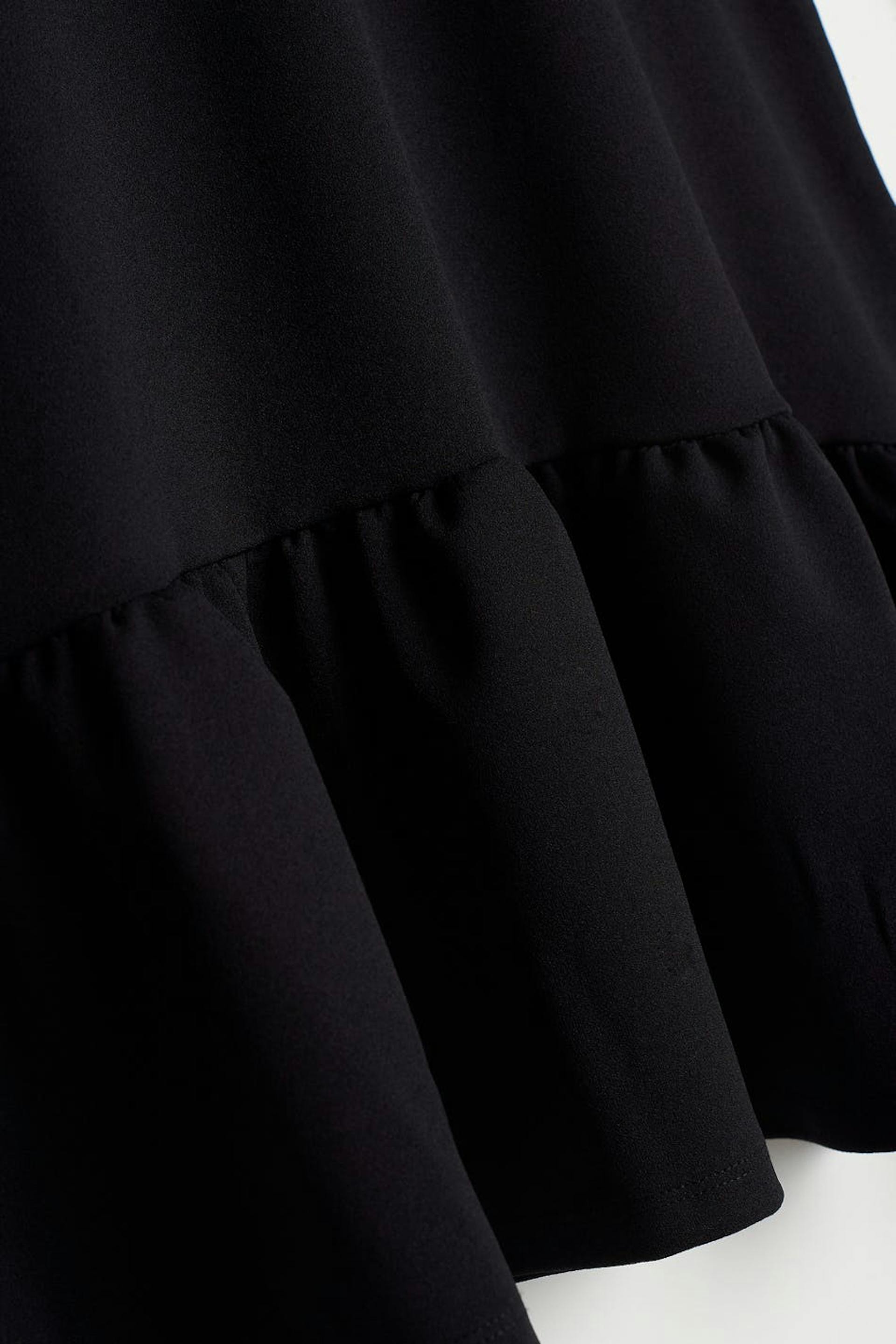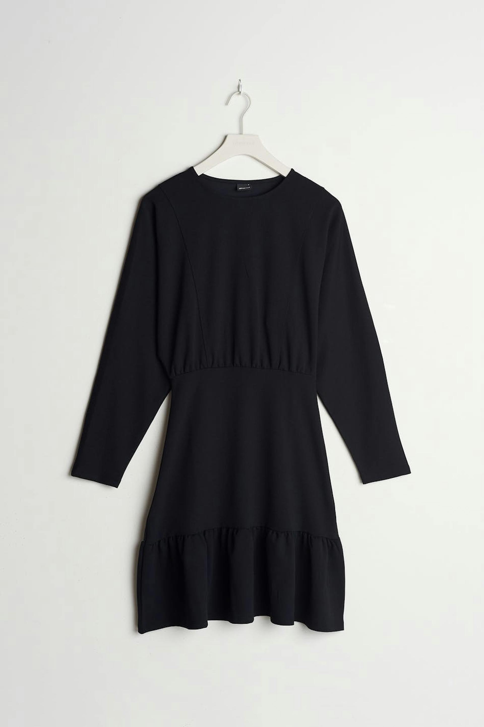 Långärmad klänning med en lätt figursydd midja. Klänningen är svart och har en volang på nederfållen. Den är gjord av trikå.