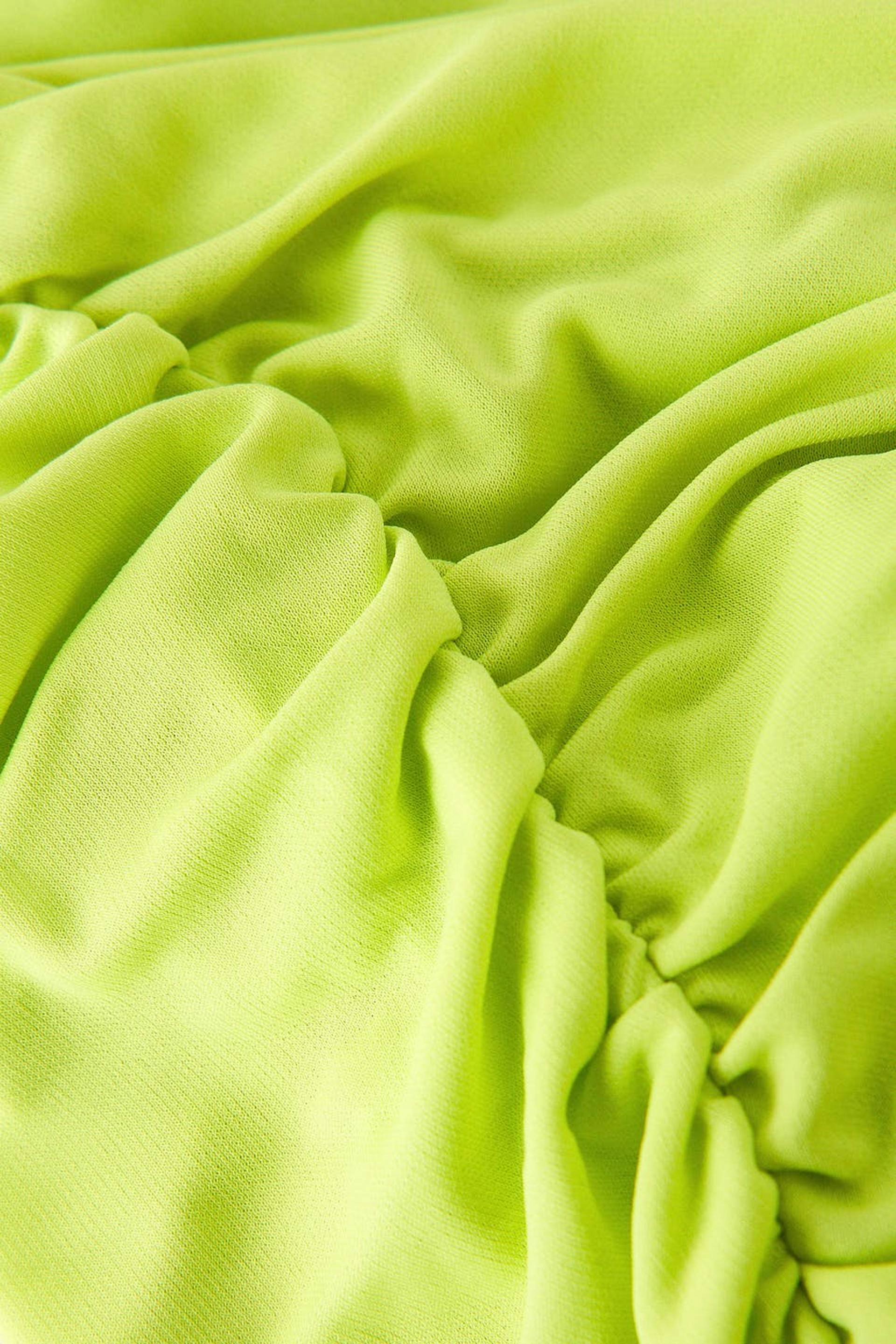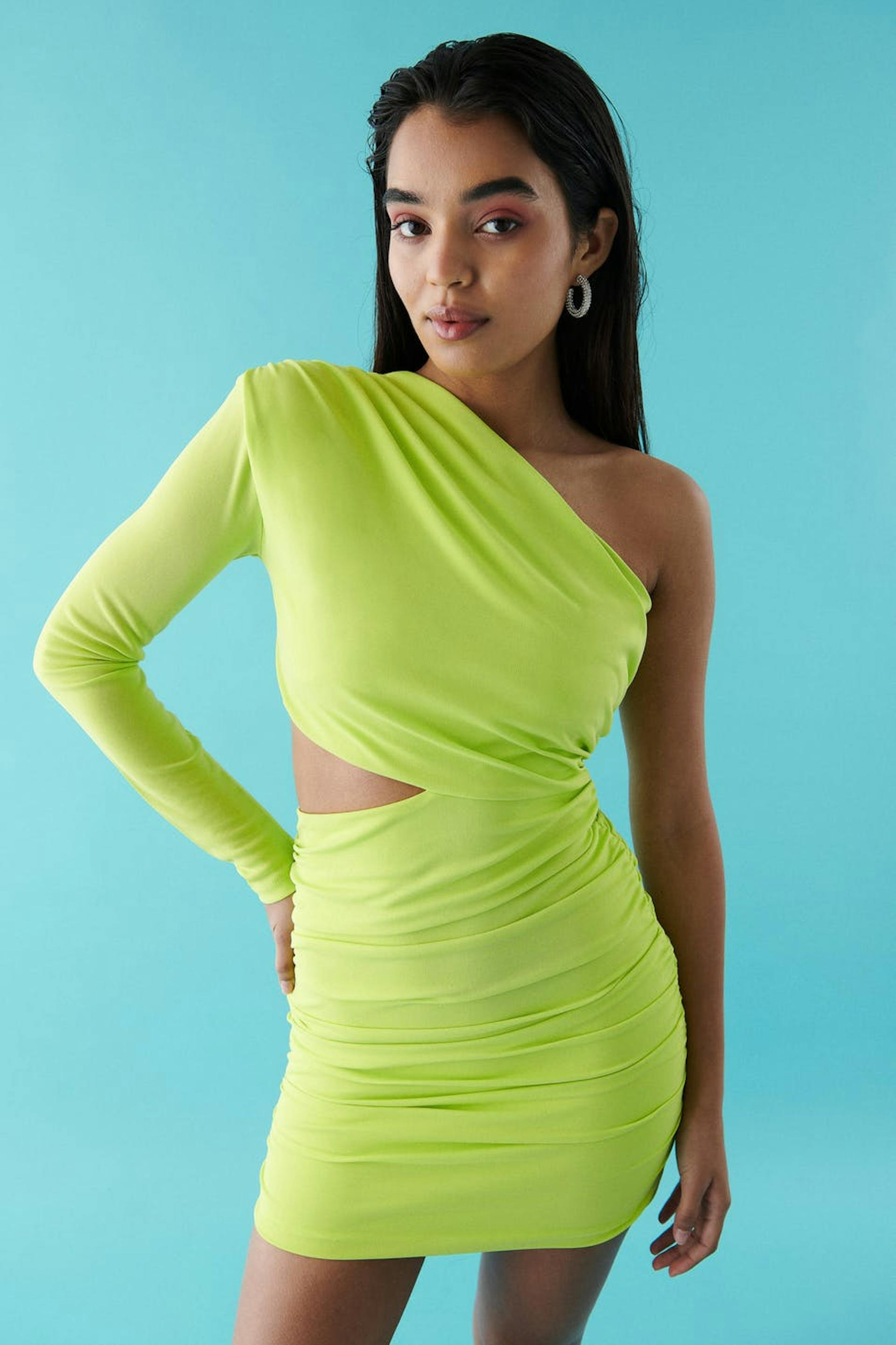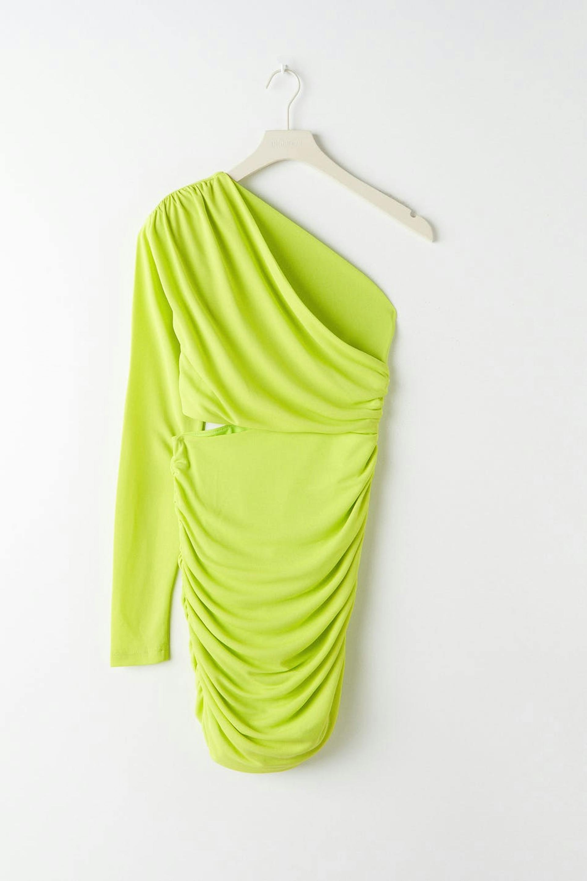 Figurnära one shoulder-klänning i trikå med en cut out-detalj i midjan. Klänningen är grön och har axelvaddar. Den har en dragkedja i sidosömmen och dekorativa rynkningar på axeln och på kjolen.